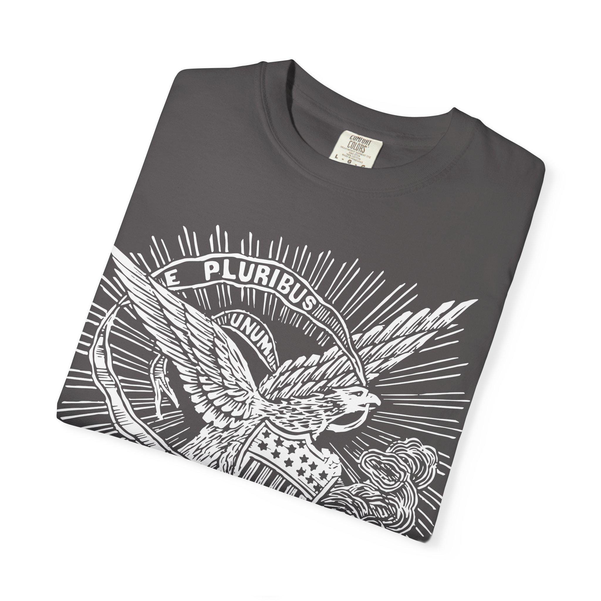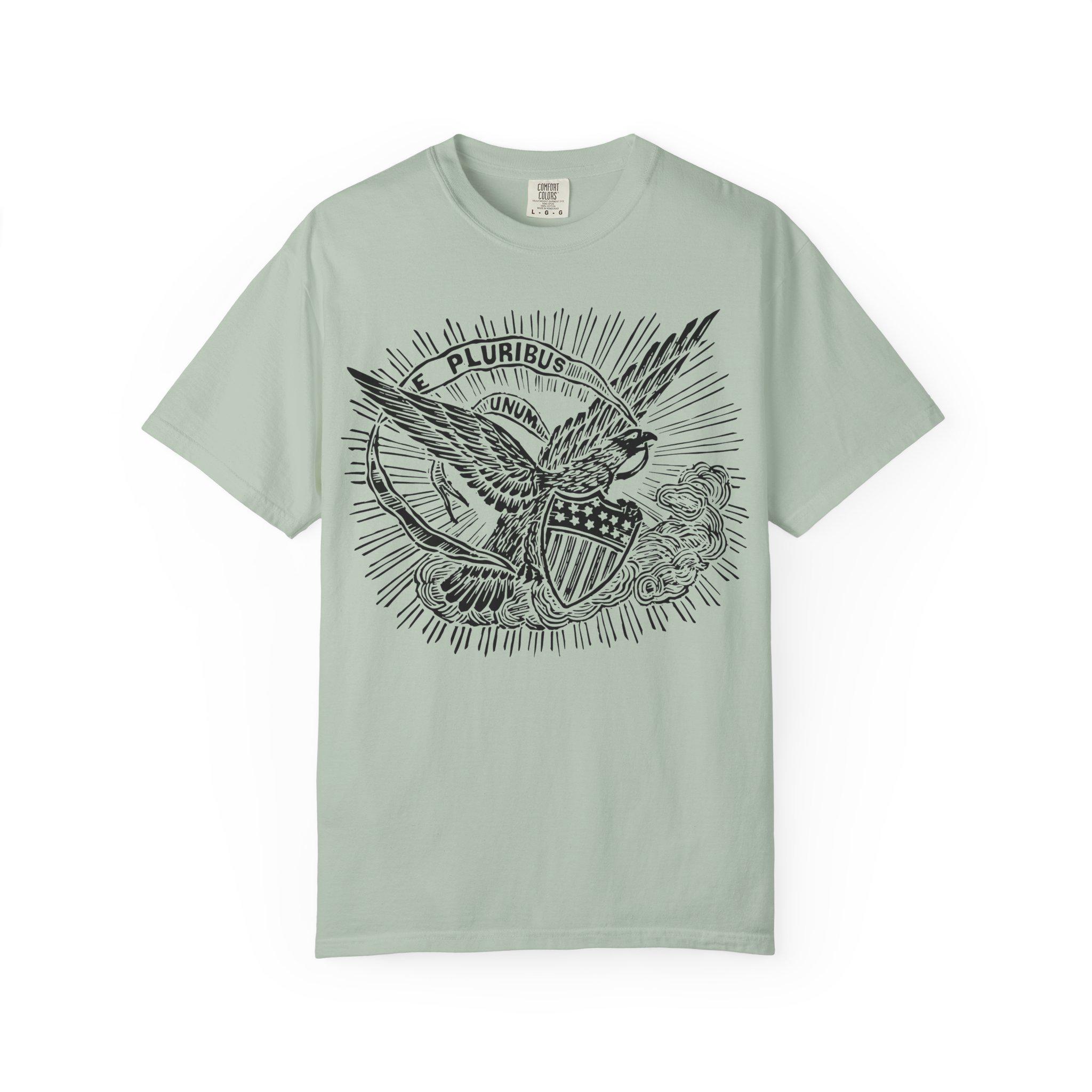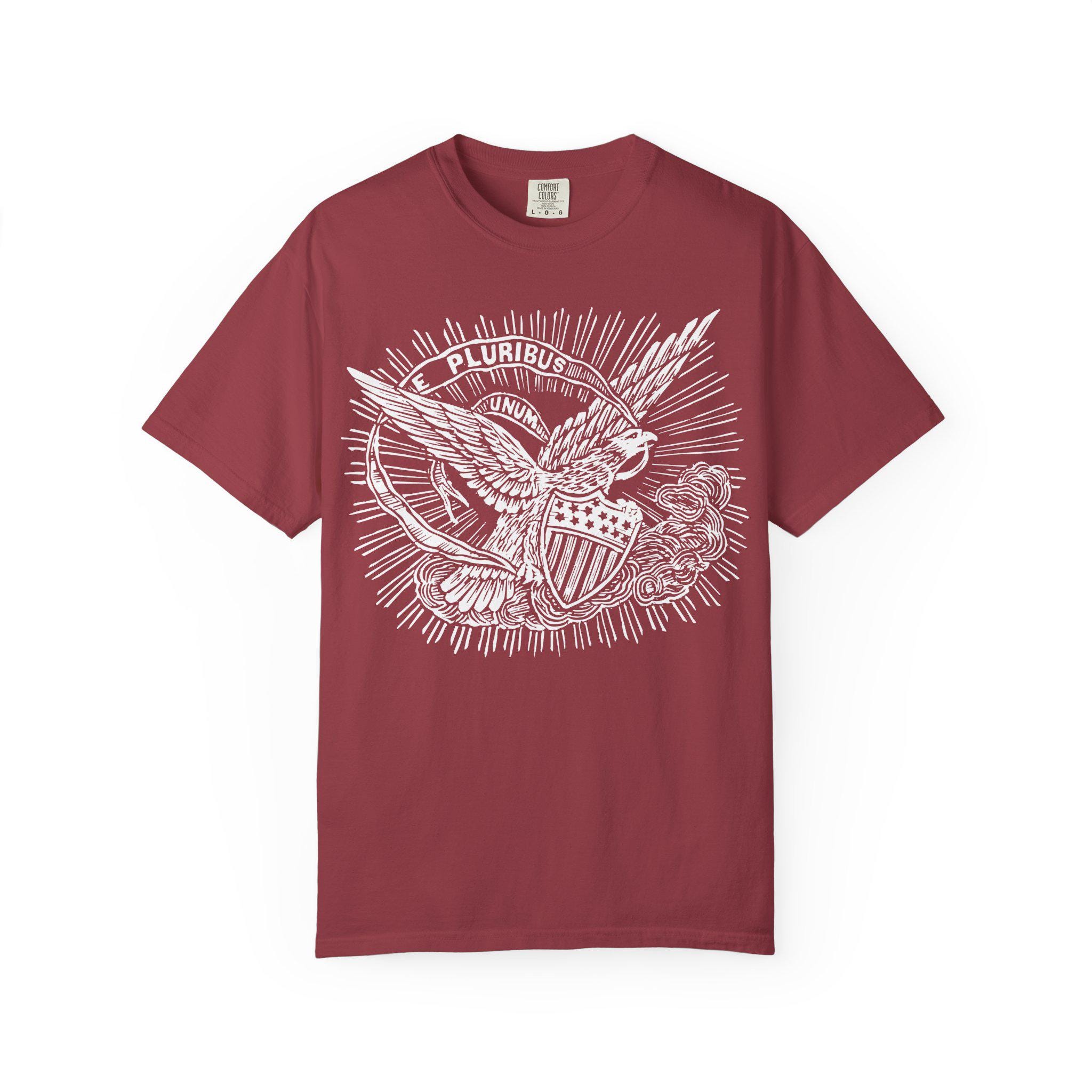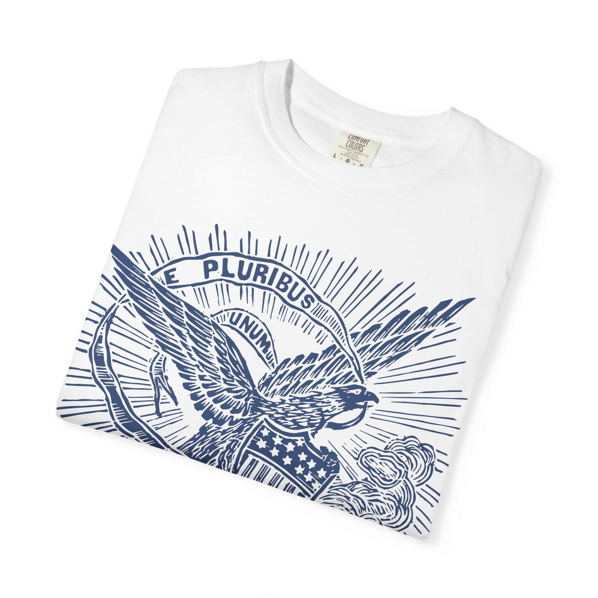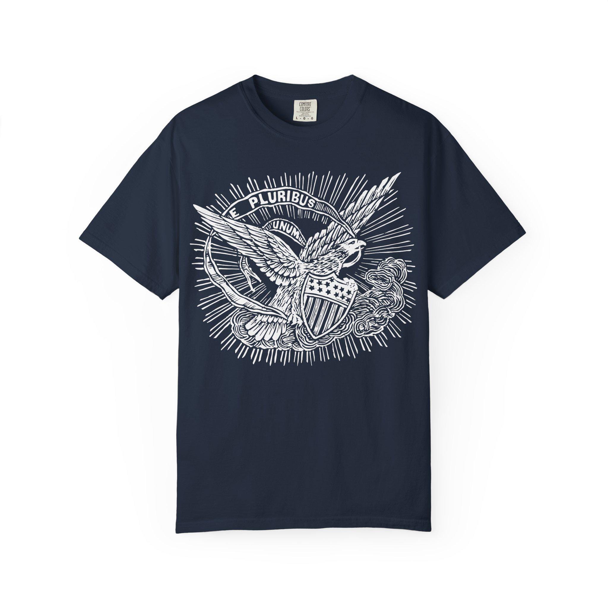 Clutched in the eagle's beak is a banner with the United States' traditional motto: "E PLURIBUS UNUM"—a Latin phrase meaning "Out of many, one." During the Civil War, this phrase took on a profound and urgent meaning, serving as a powerful reminder that the nation was a single, indivisible entity, forged from many states and people. The design is printed in a rich, dark blue that approximates the original stamp color, or in a high-contrast white or black on select shirt colors to ensure the artwork always stands out