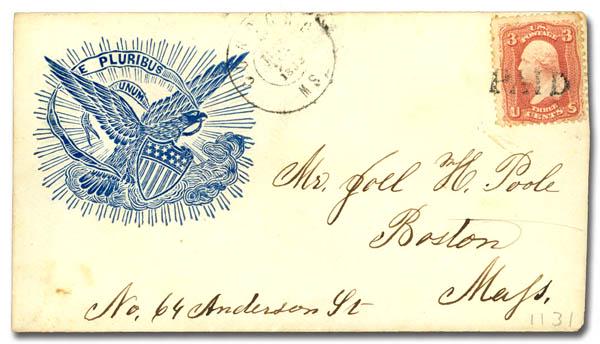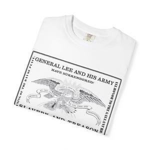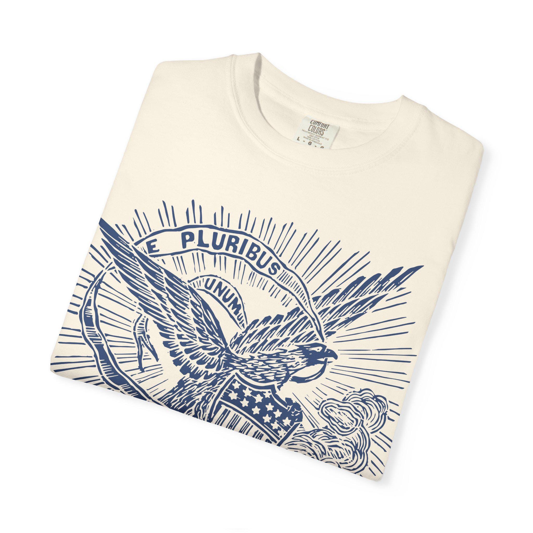 This t-shirt features a beautifully restored design from a pro-Union envelope stamp, a popular form of everyday patriotism during the Civil War. The artwork is a classic piece of 19th-century Americana, featuring a majestic American eagle flying above the clouds as radiant beams of light emanate from behind.