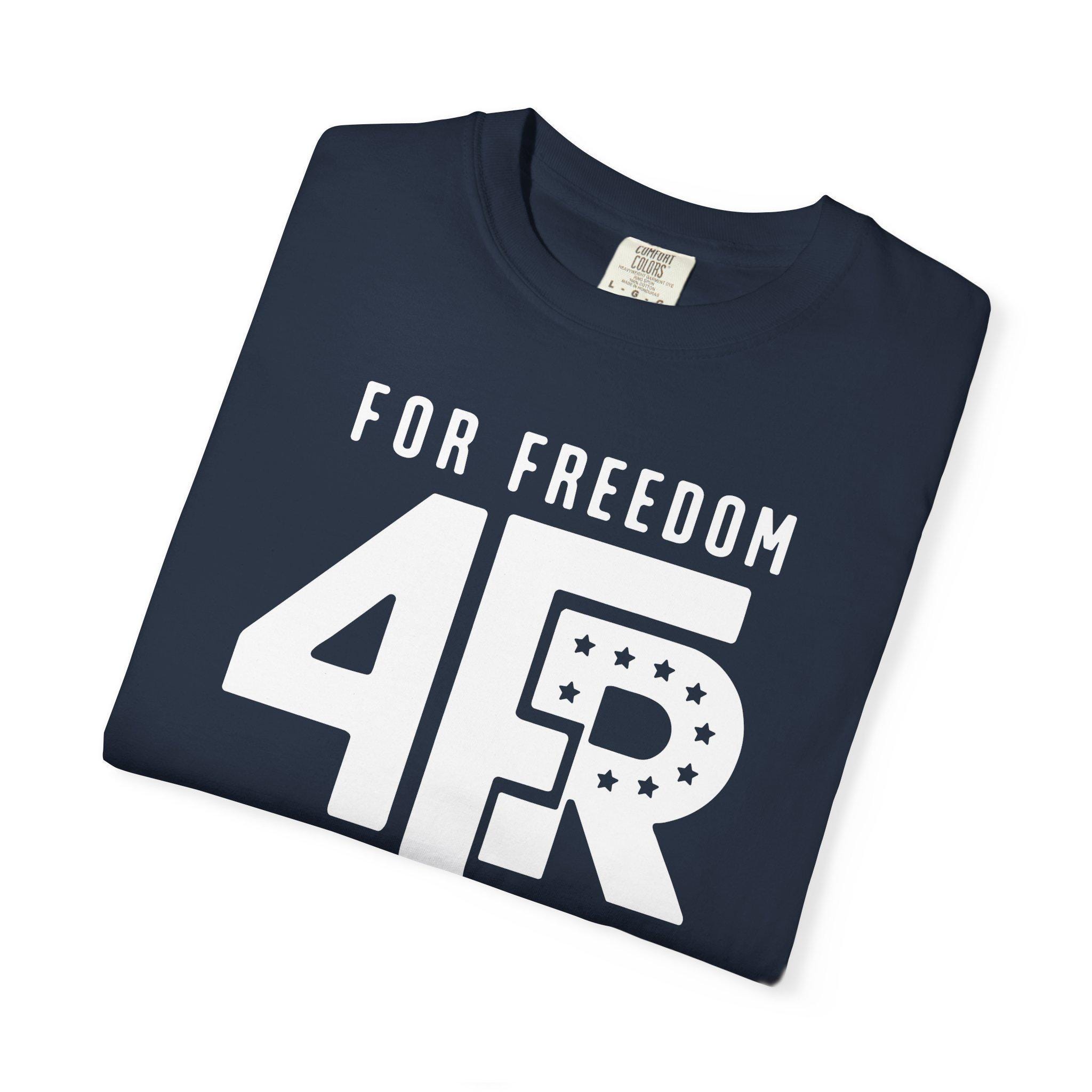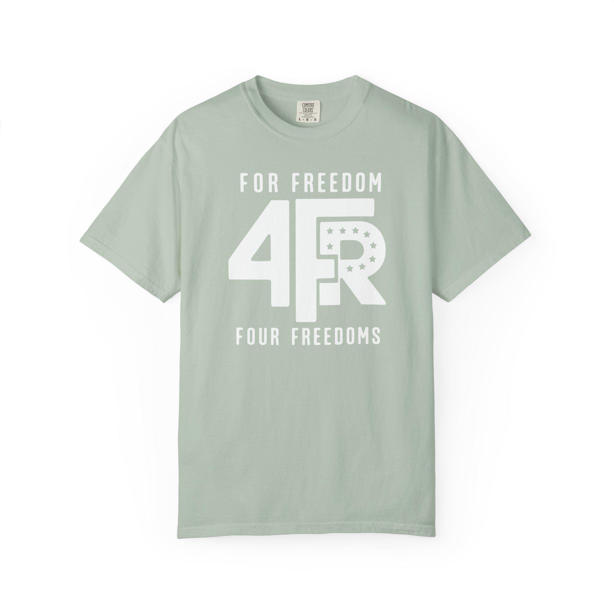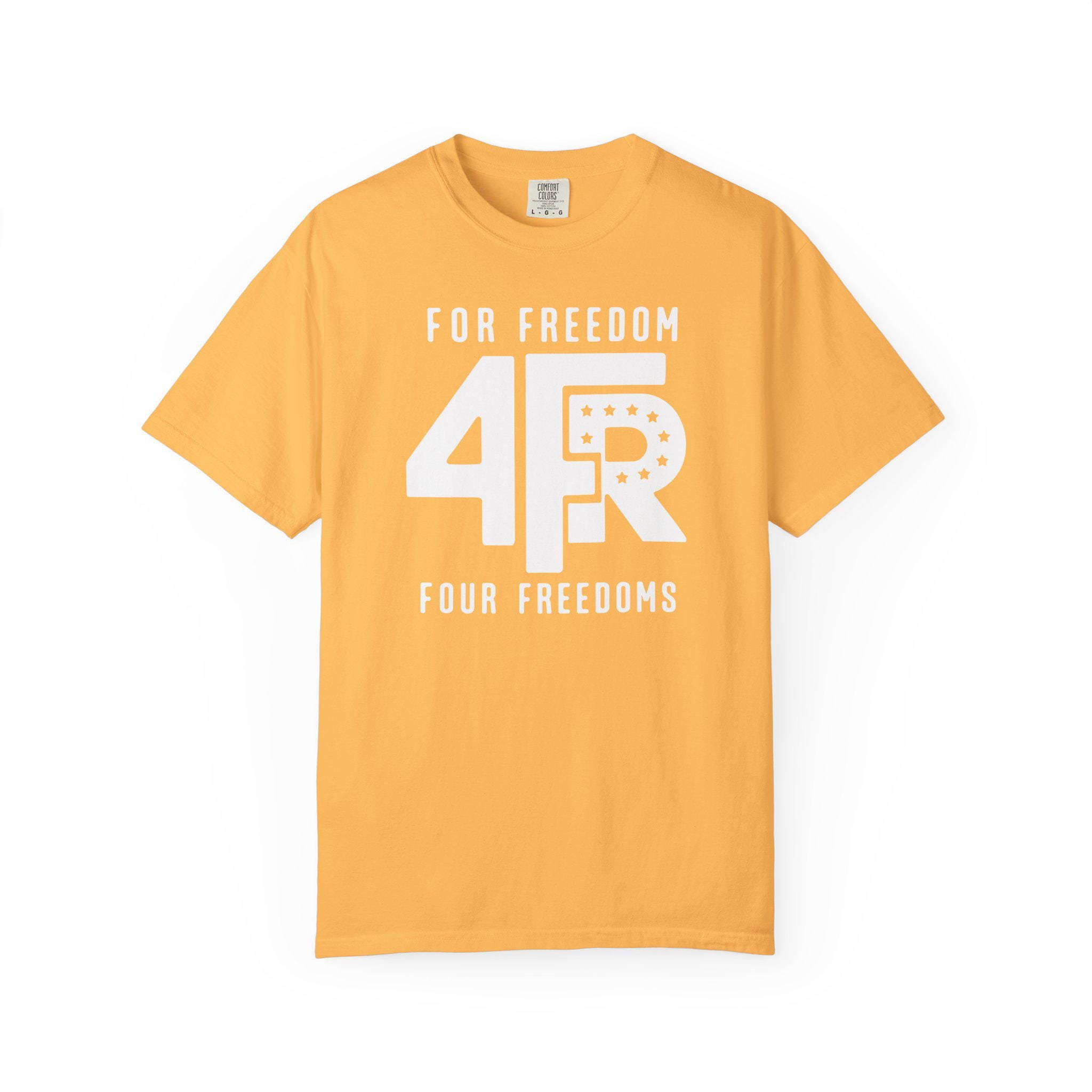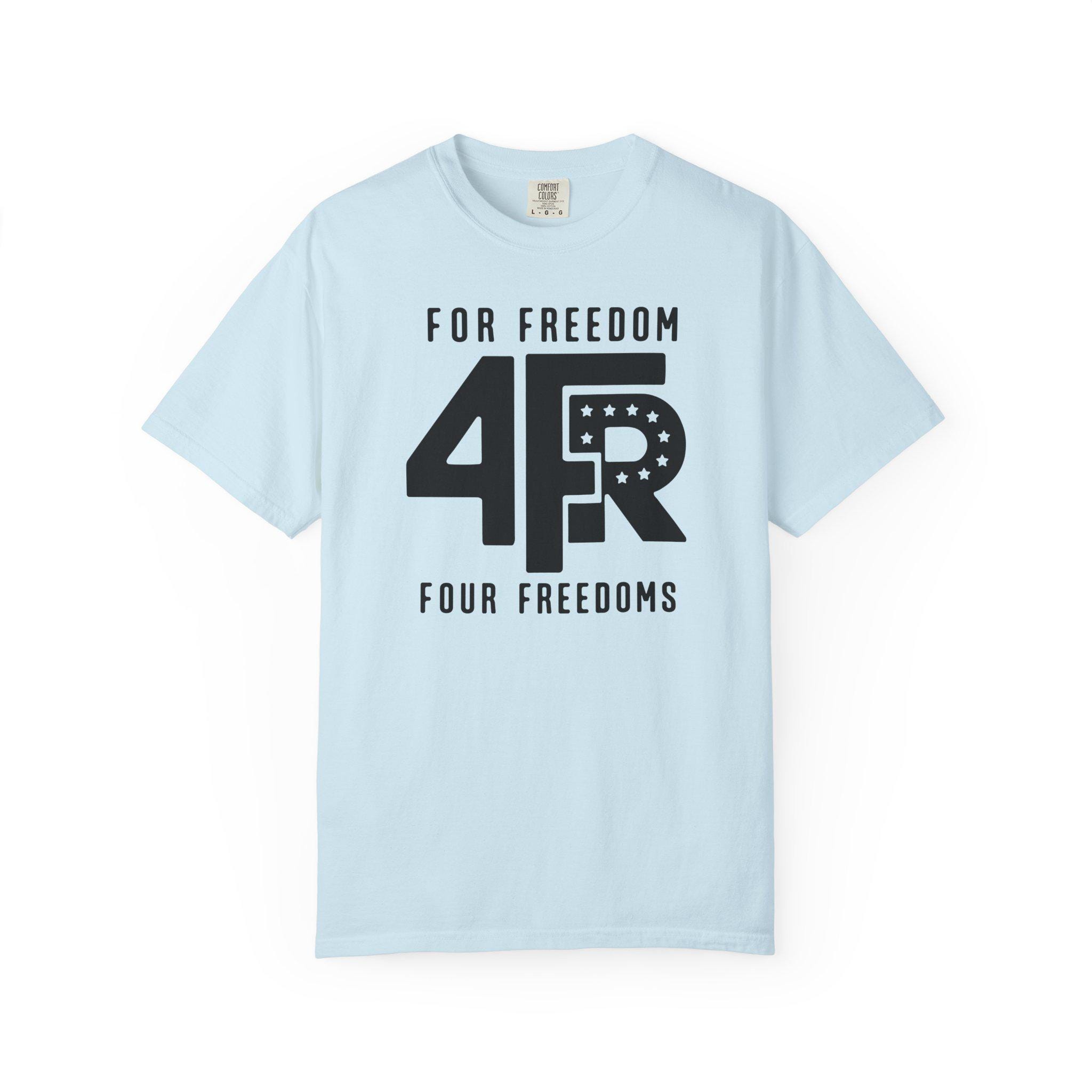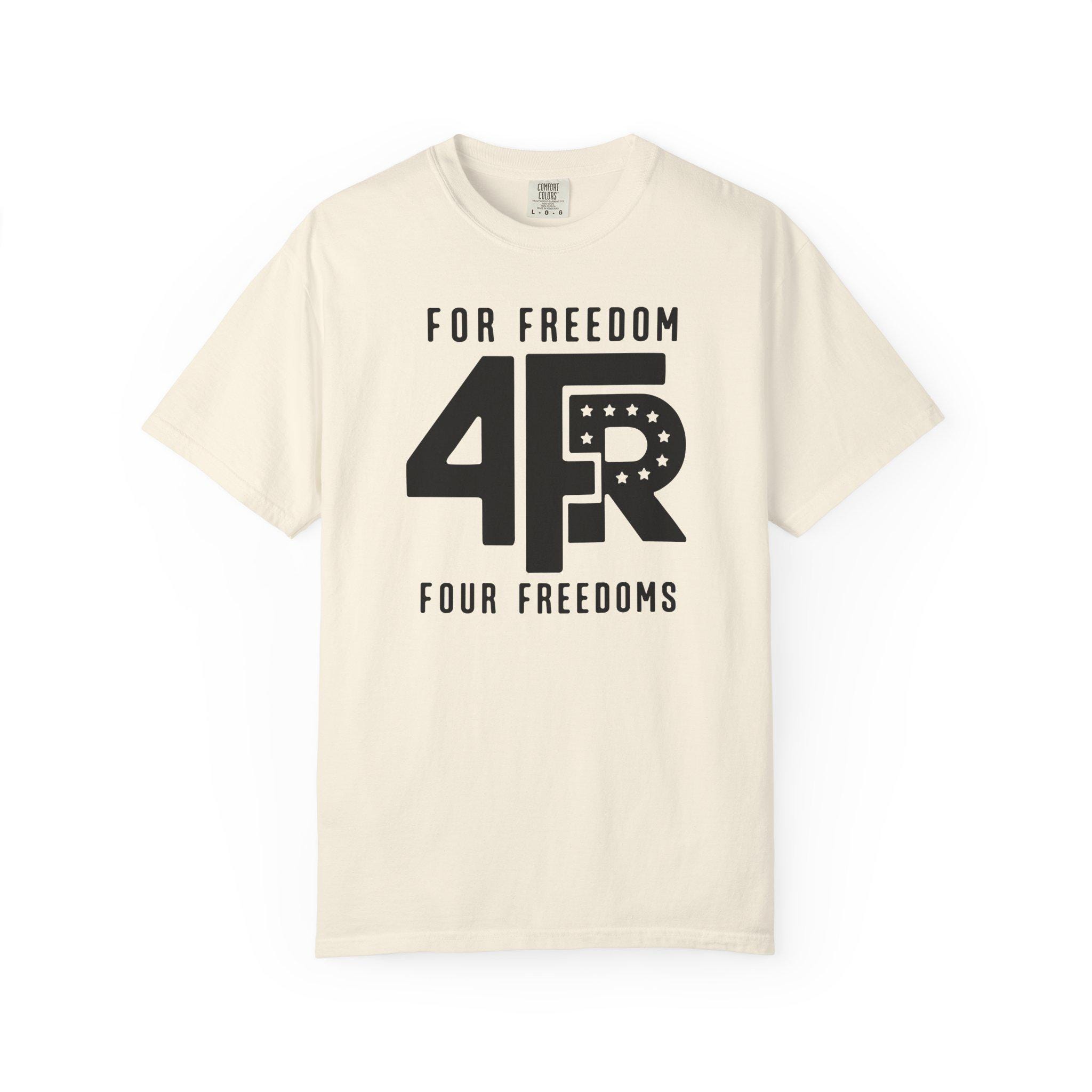 This t-shirt features a design inspired by a World War II-era campaign sticker for Franklin D. Roosevelt. The "4FR" logo was a clever piece of graphic design representing his fourth term and, more importantly, his vision of the "Four Freedoms" as a universal human right that America should champion.