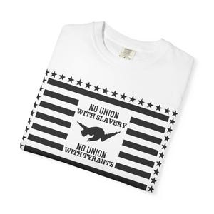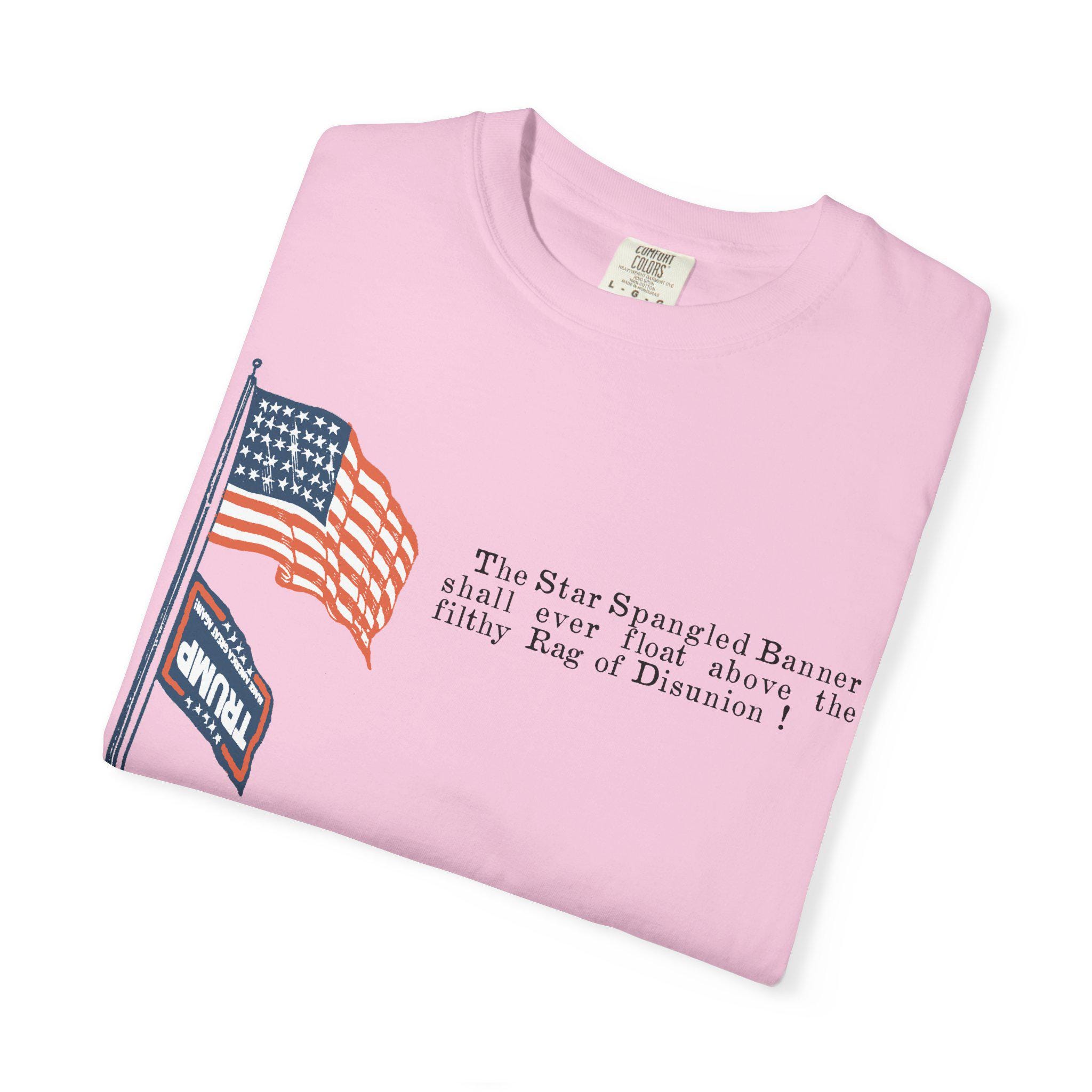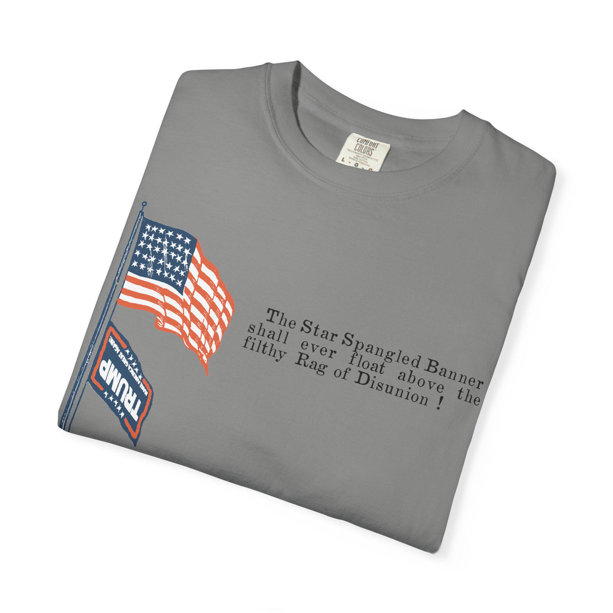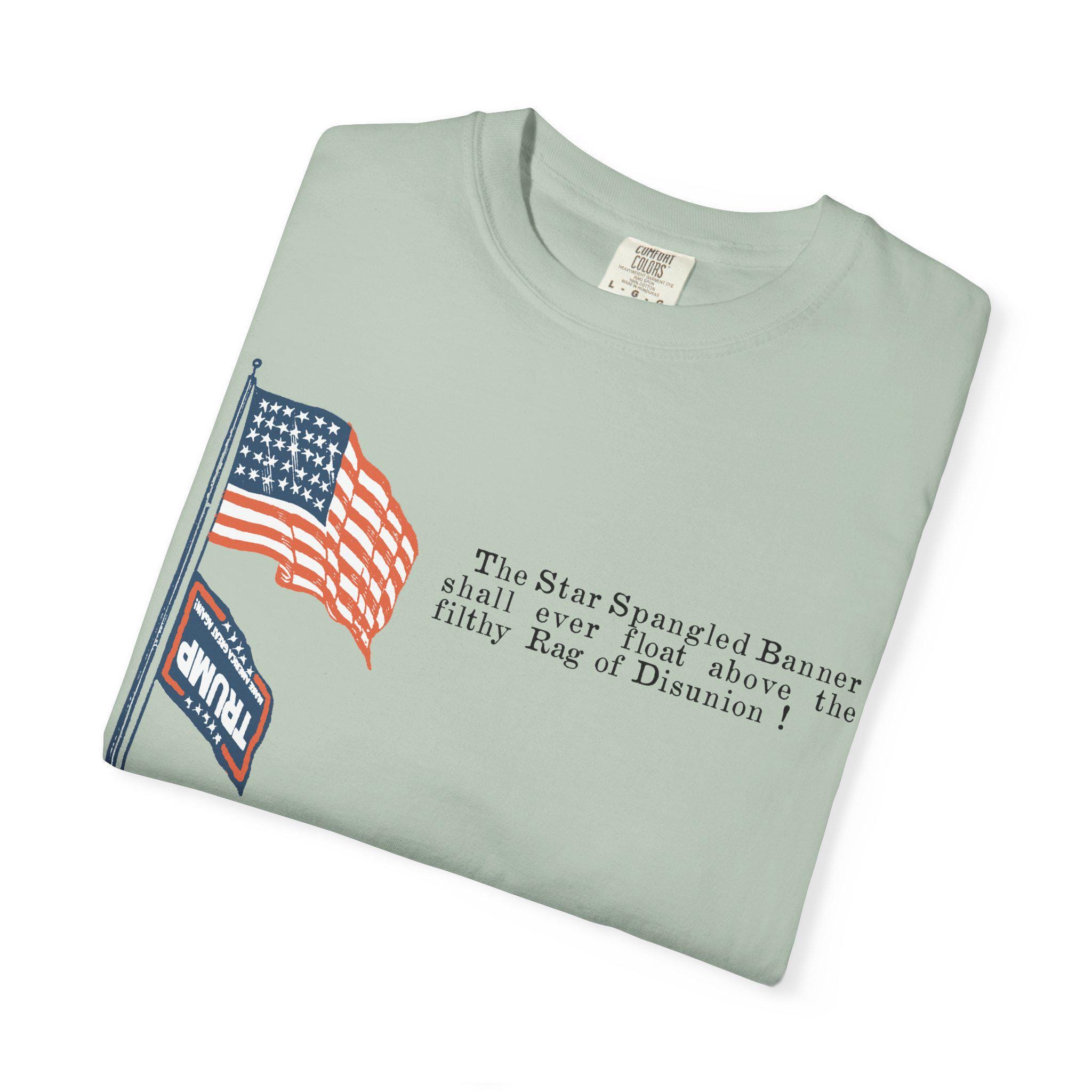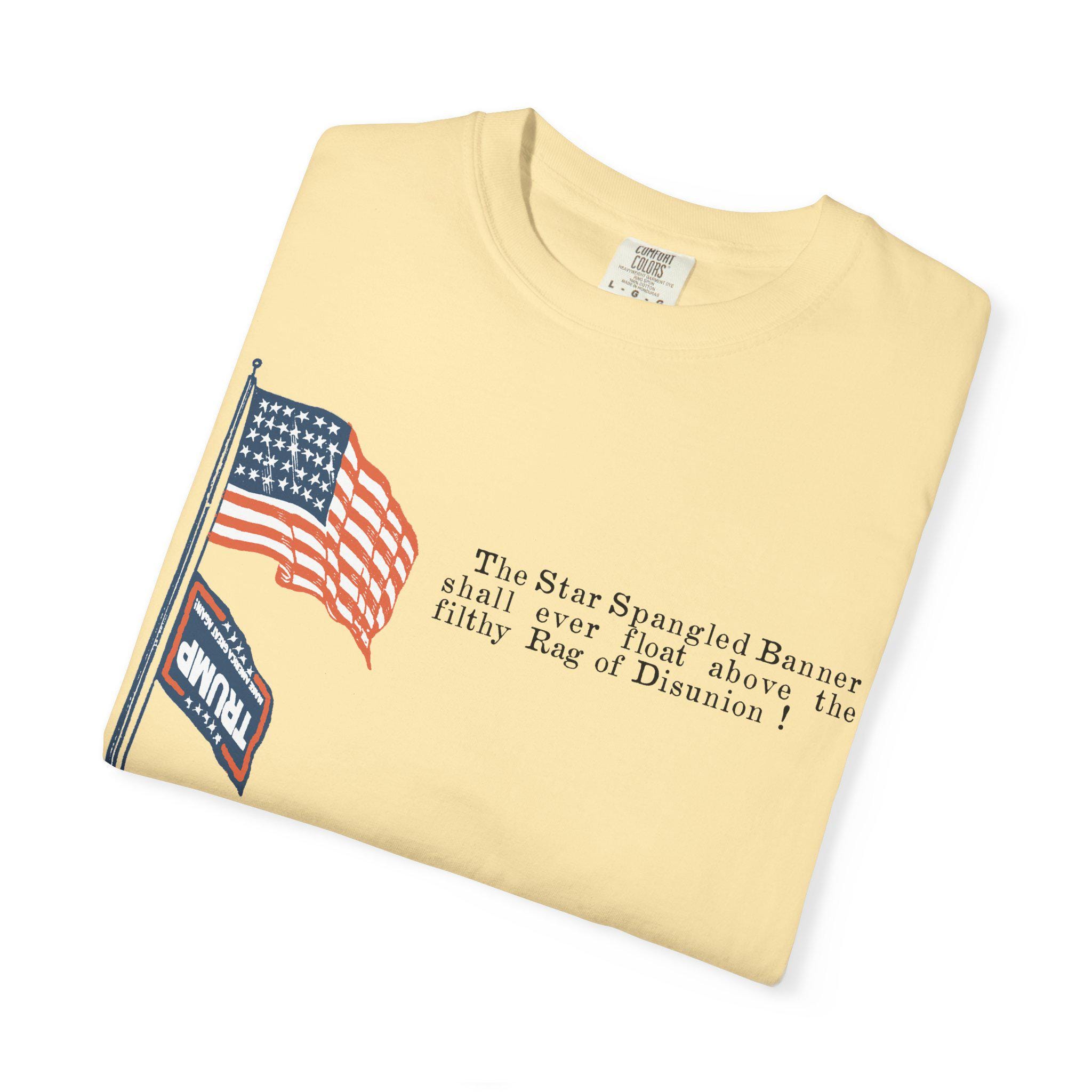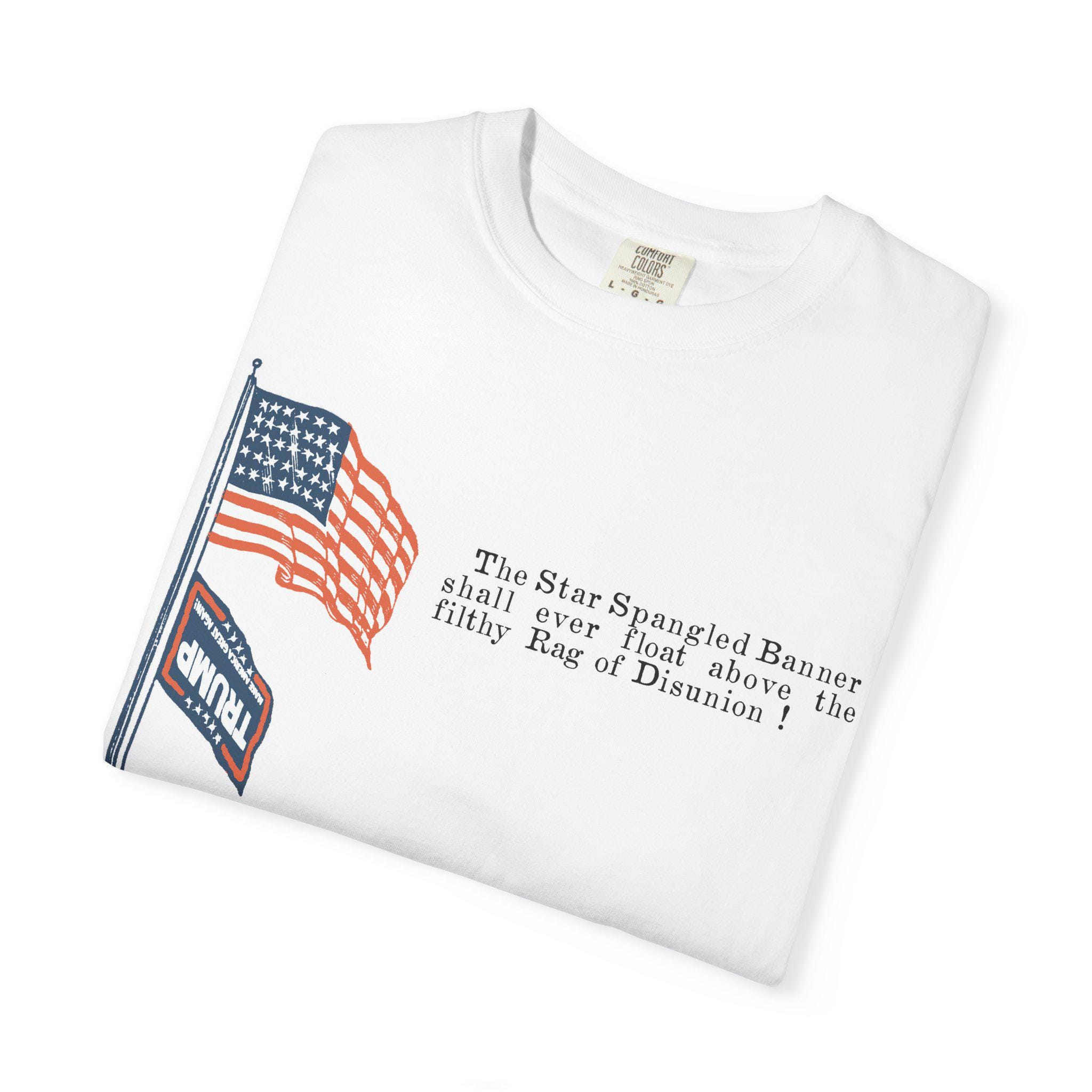 The original artifact showed the Stars and Stripes flying proudly above a small, upside-down Confederate flag—a clear symbol of dominance and dishonor. This shirt takes that exact historical composition and makes a direct political parallel, replacing the Confederate flag with its modern-day equivalent: the MAGA flag. The fiery text, "The Star Spangled Banner shall ever float above the filthy Rag of Disunion !" is preserved from the original 1860s design. It's a direct application of historical sentiment to a current political struggle, arguing that the two symbols represent the same anti-democratic impulse.
