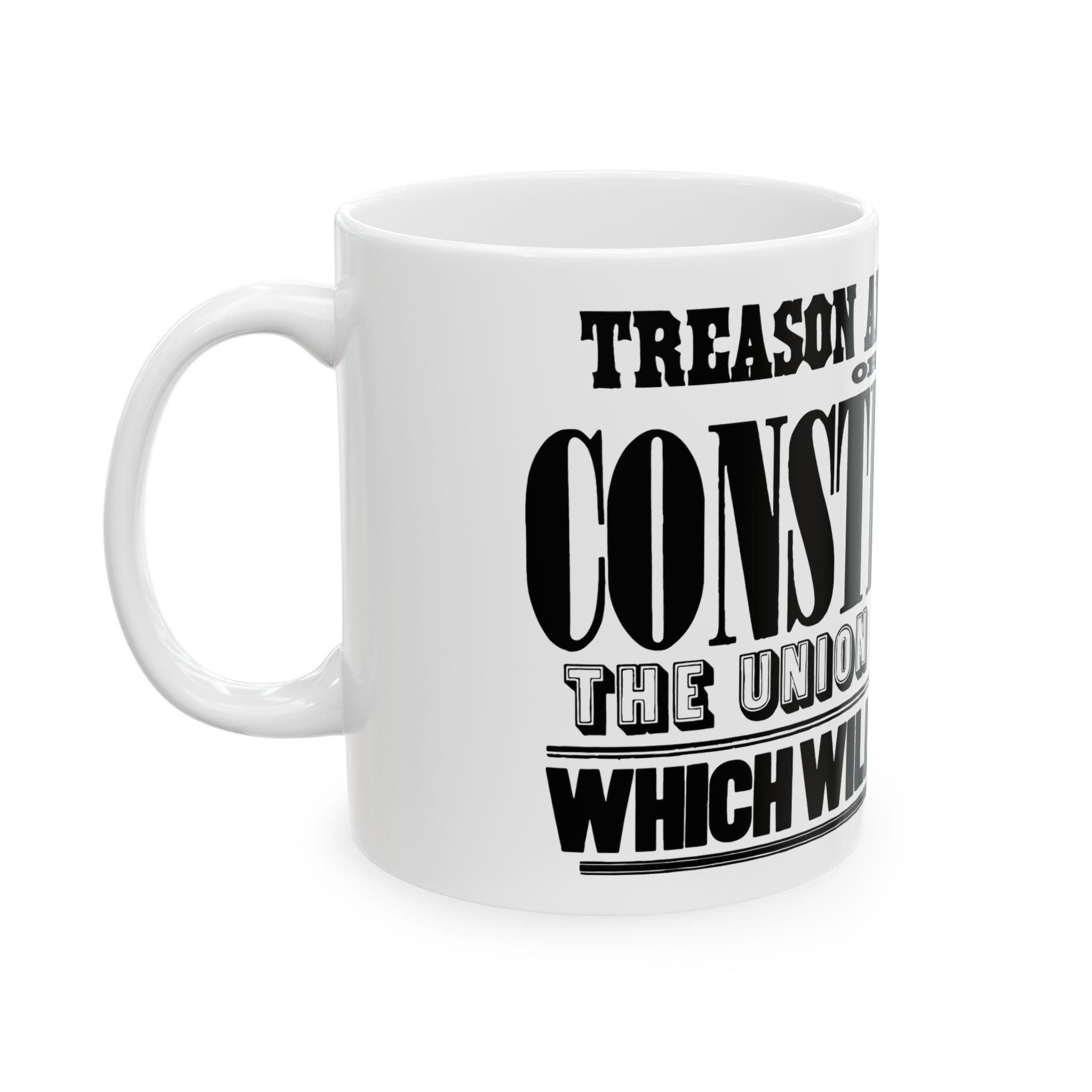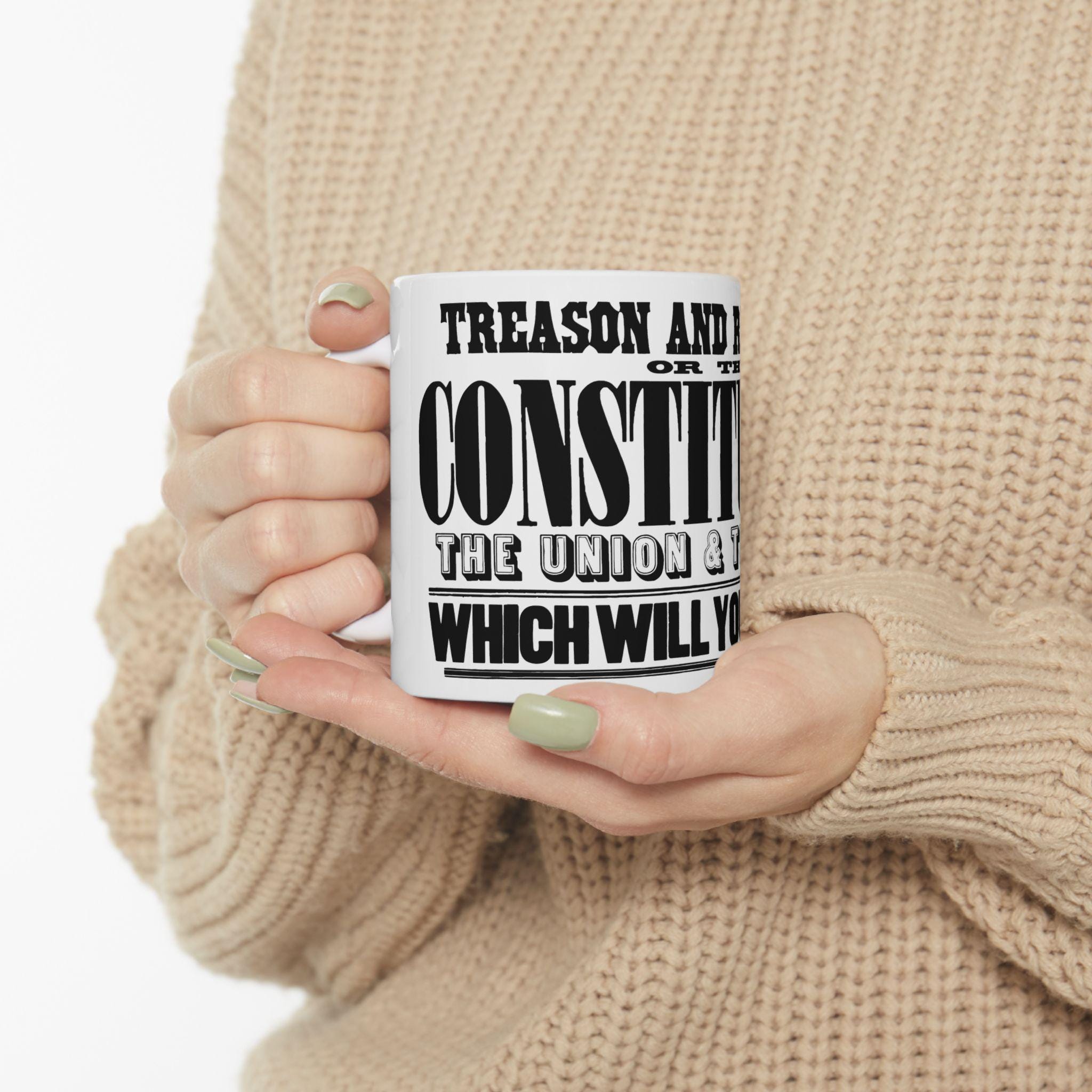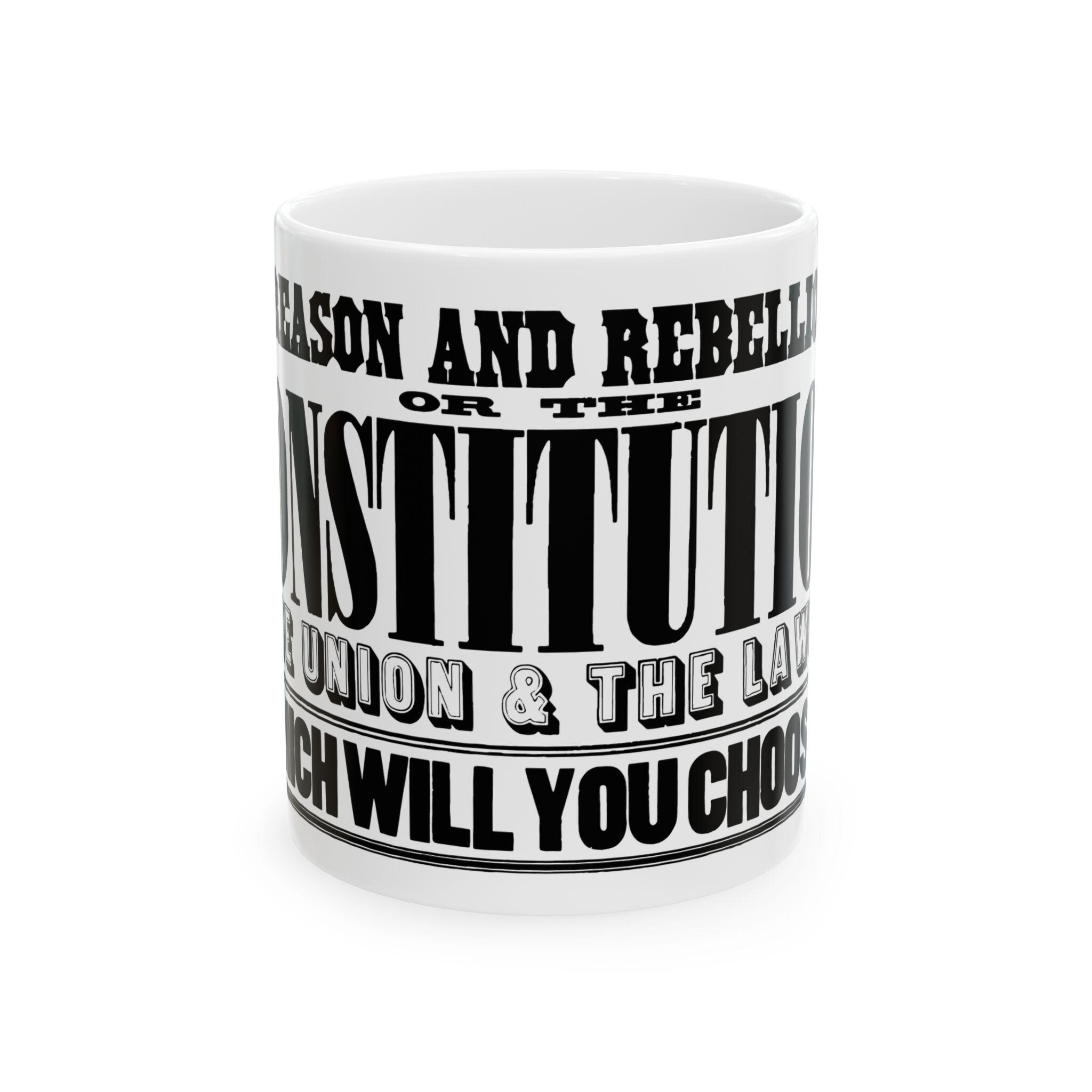 A high-quality ceramic mug featuring restored text from a genuine 1861 Civil War rally poster, rendered in a beautiful 19th-century wood type style.
