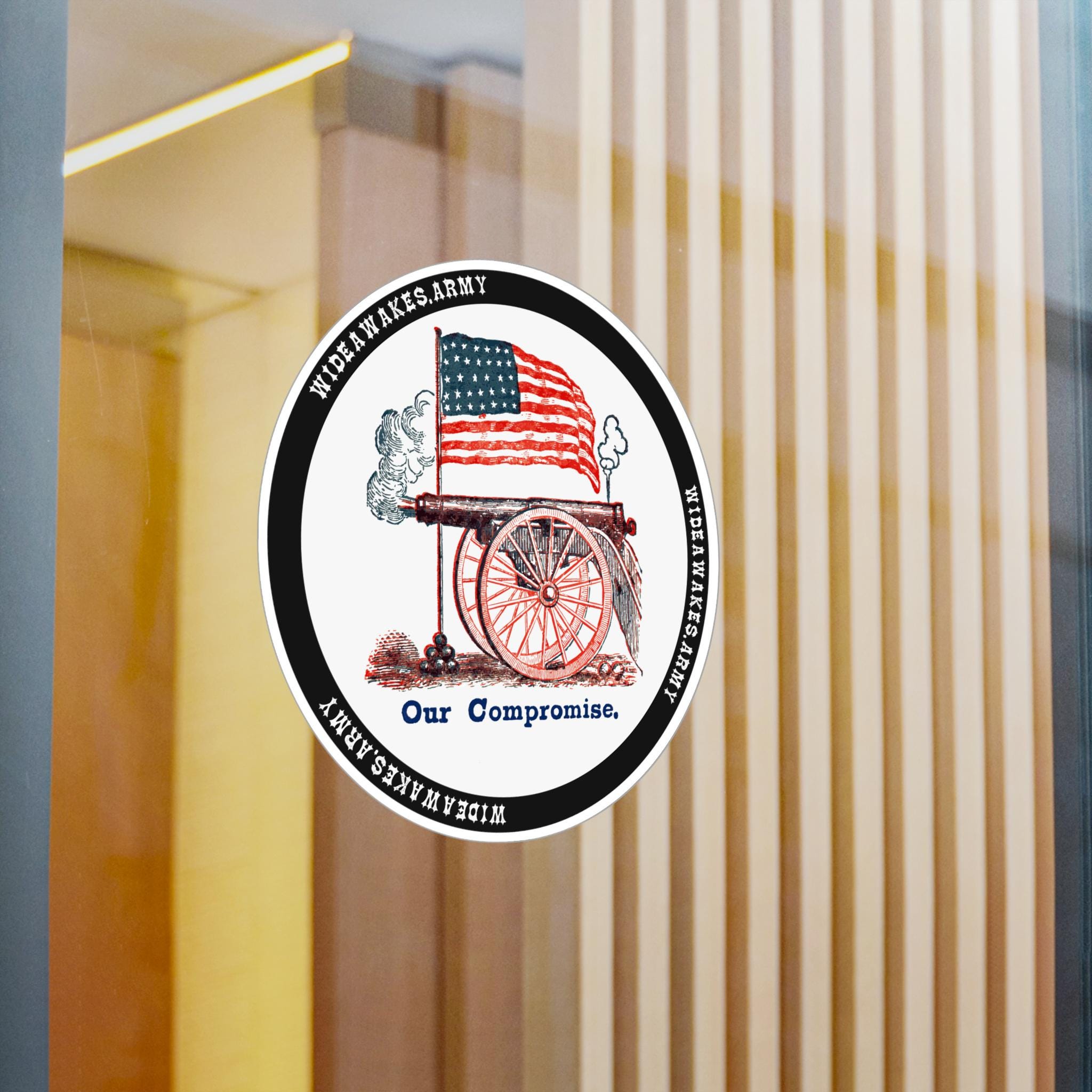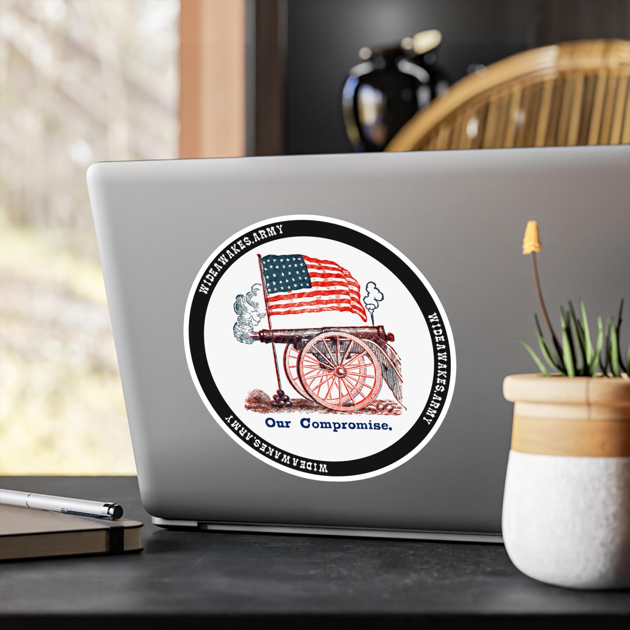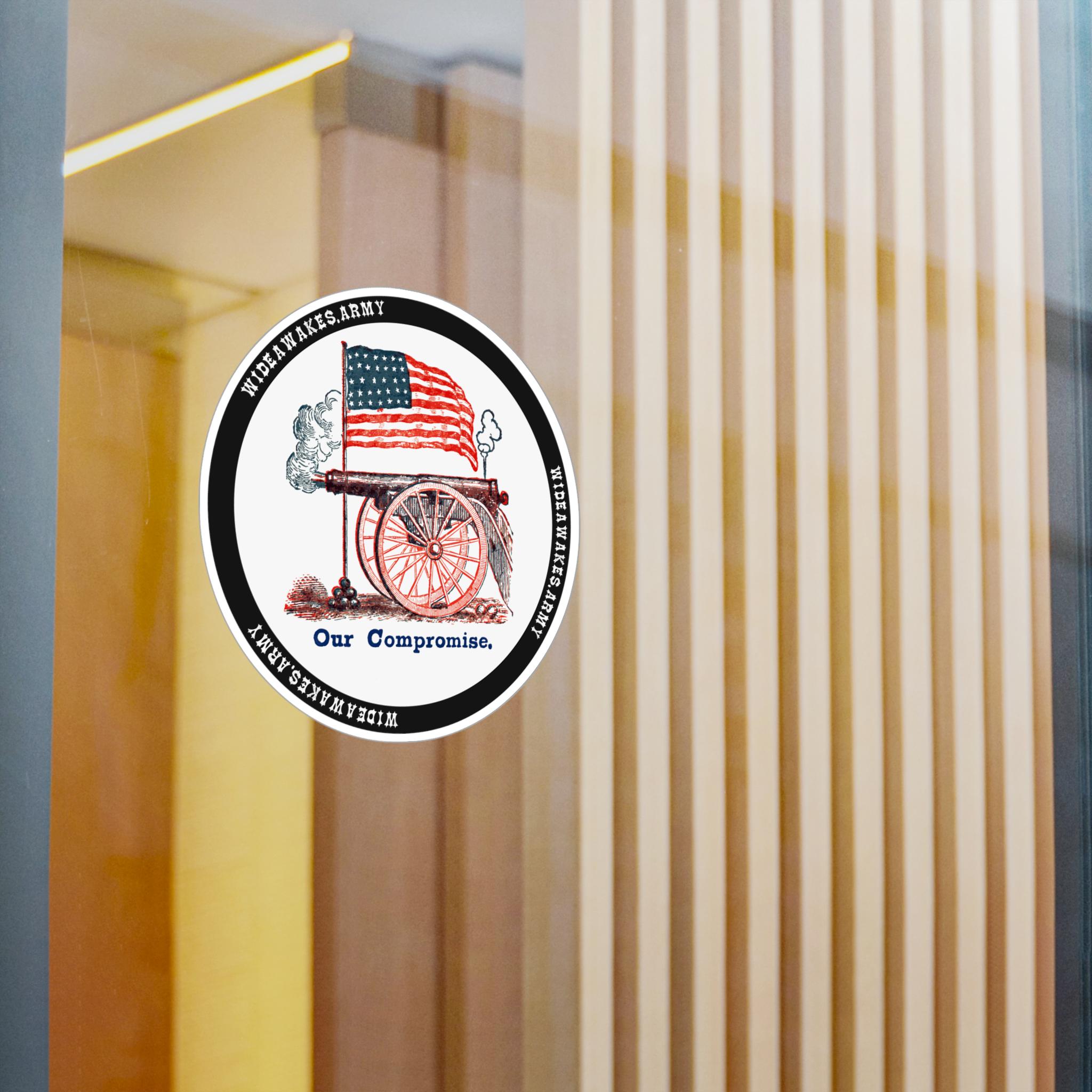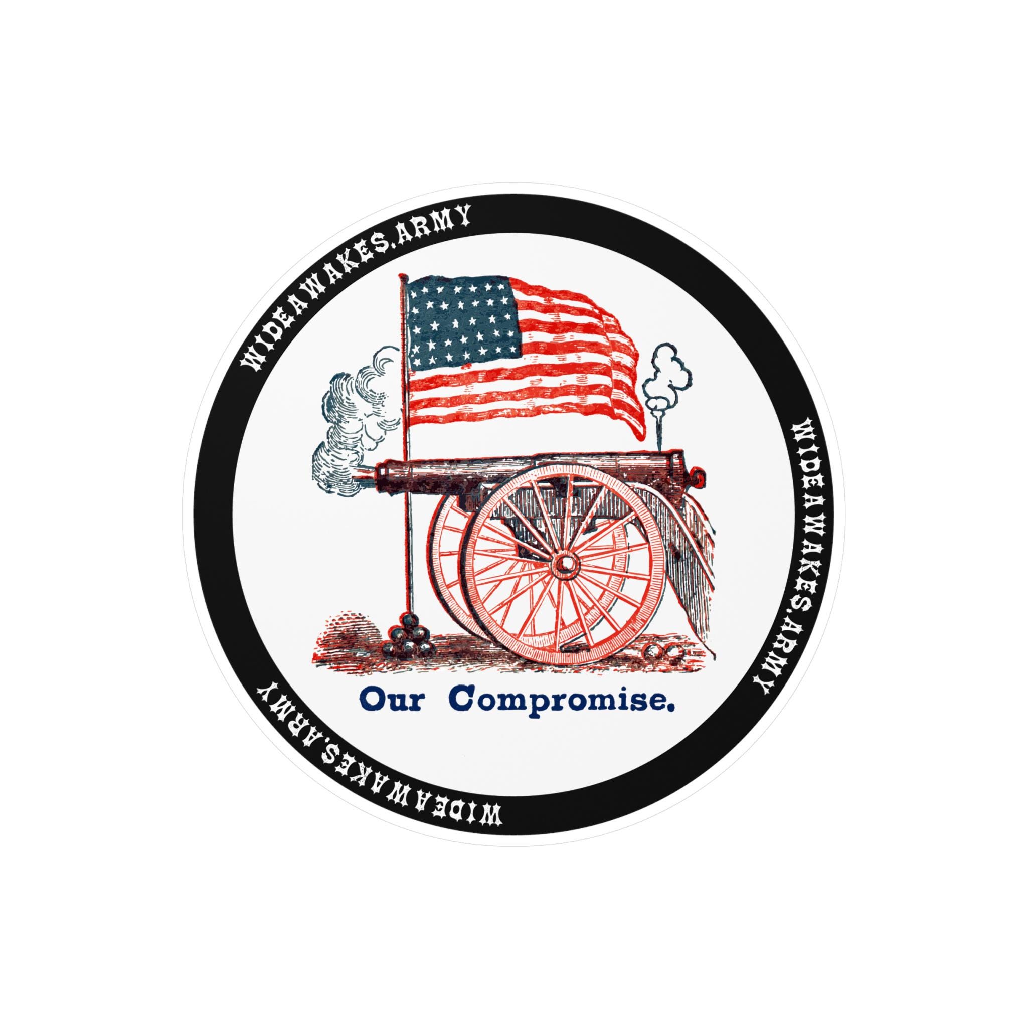 The design depicts a wheeled field artillery piece that has just fired, symbolizing the military might of the Union. The motto below, "Our Compromise," is a masterful piece of political messaging—a dark, sarcastic, and resolute statement that the only negotiation left was on the battlefield. It’s a fascinating glimpse into the mindset of the most fervent Union supporters who believed that the rebellion had to be crushed by force. Product features - Removable adhesive for easy application and residue-free removal. - Water, scratch, and UV resistant for lasting vibrancy outdoors. - Satin finish for a polished, sophisticated look. - Vibrant, bright colors printed with advanced techniques. - Available in four sizes for versatile usage.