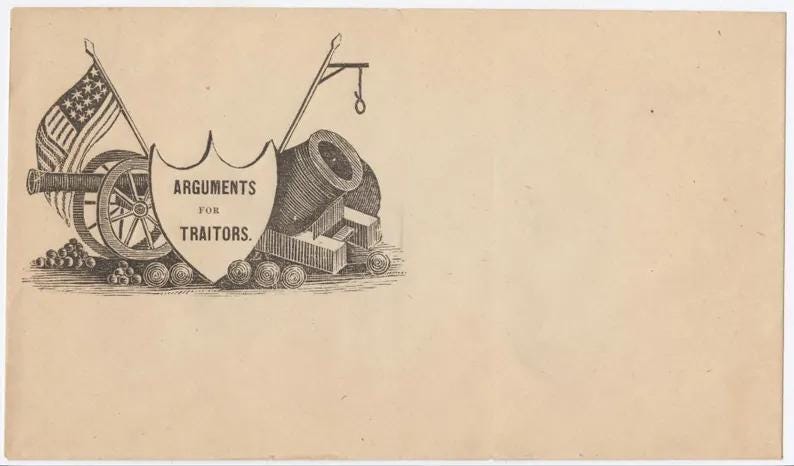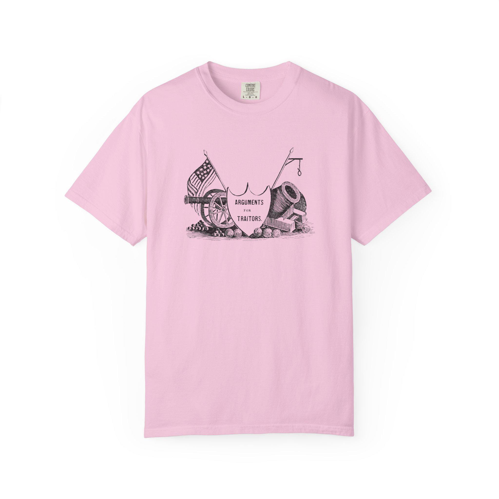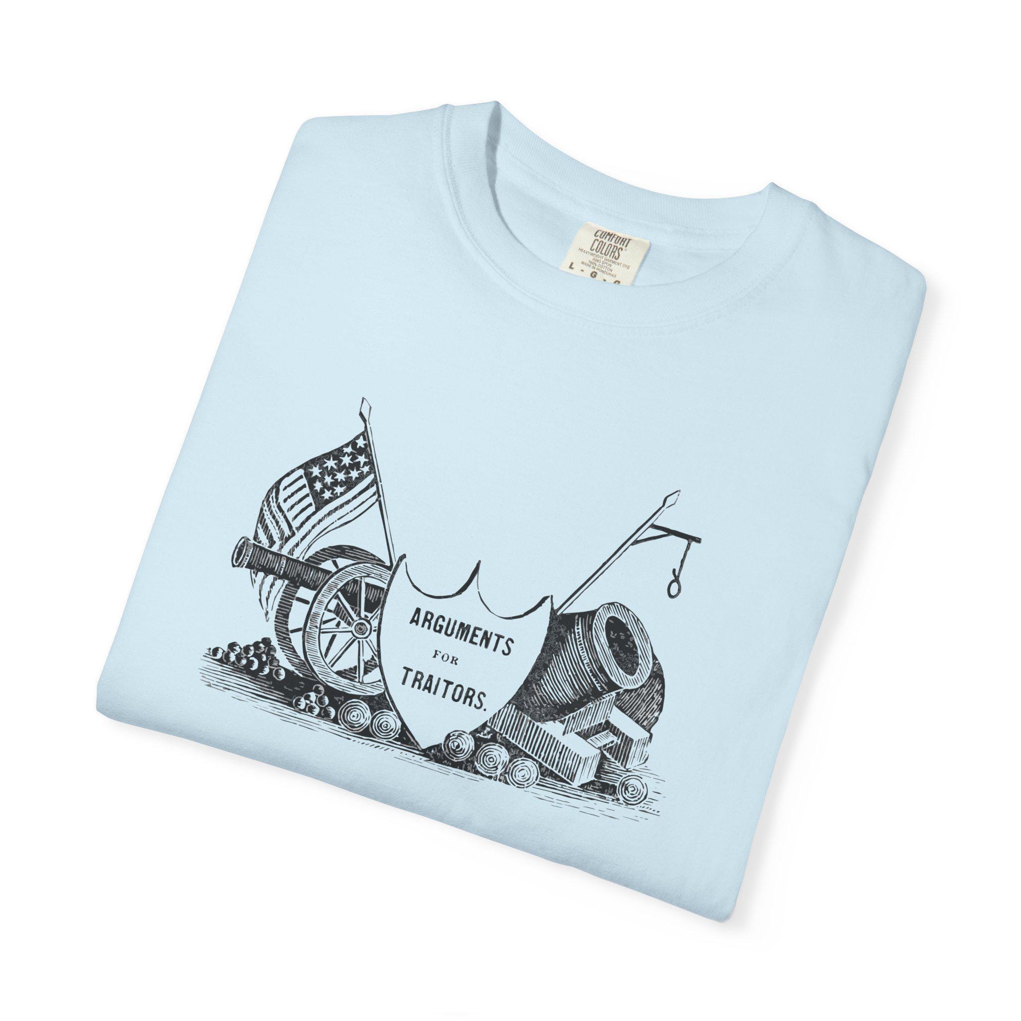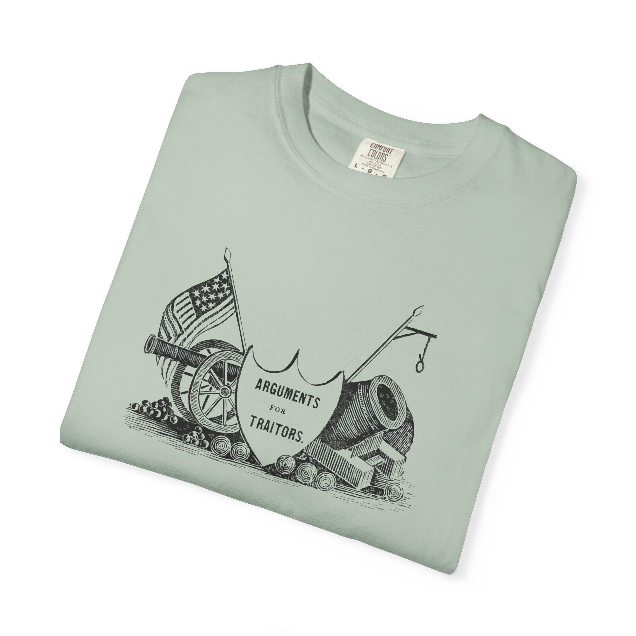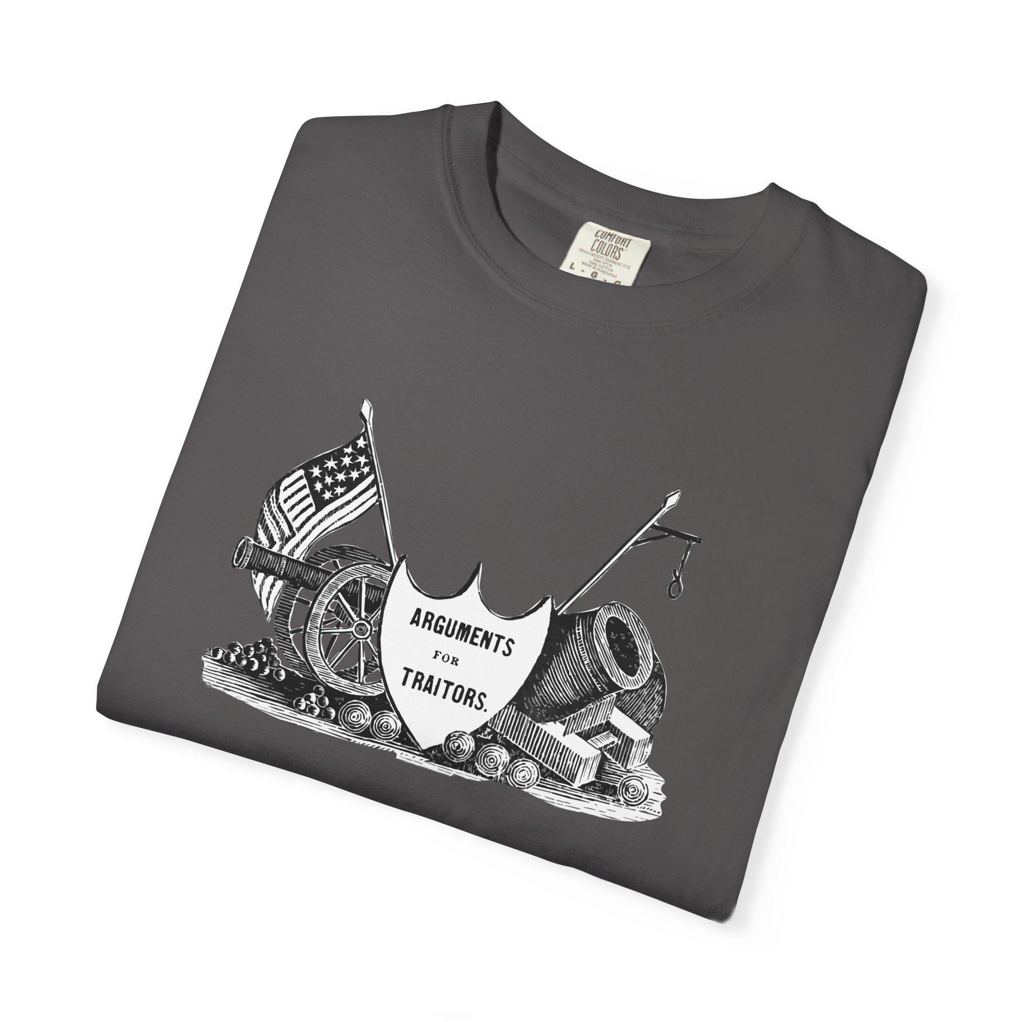 The Design: A shield declares these are "Arguments For Traitors," surrounded by illustrations of Union cannons and mortars under the American flag.