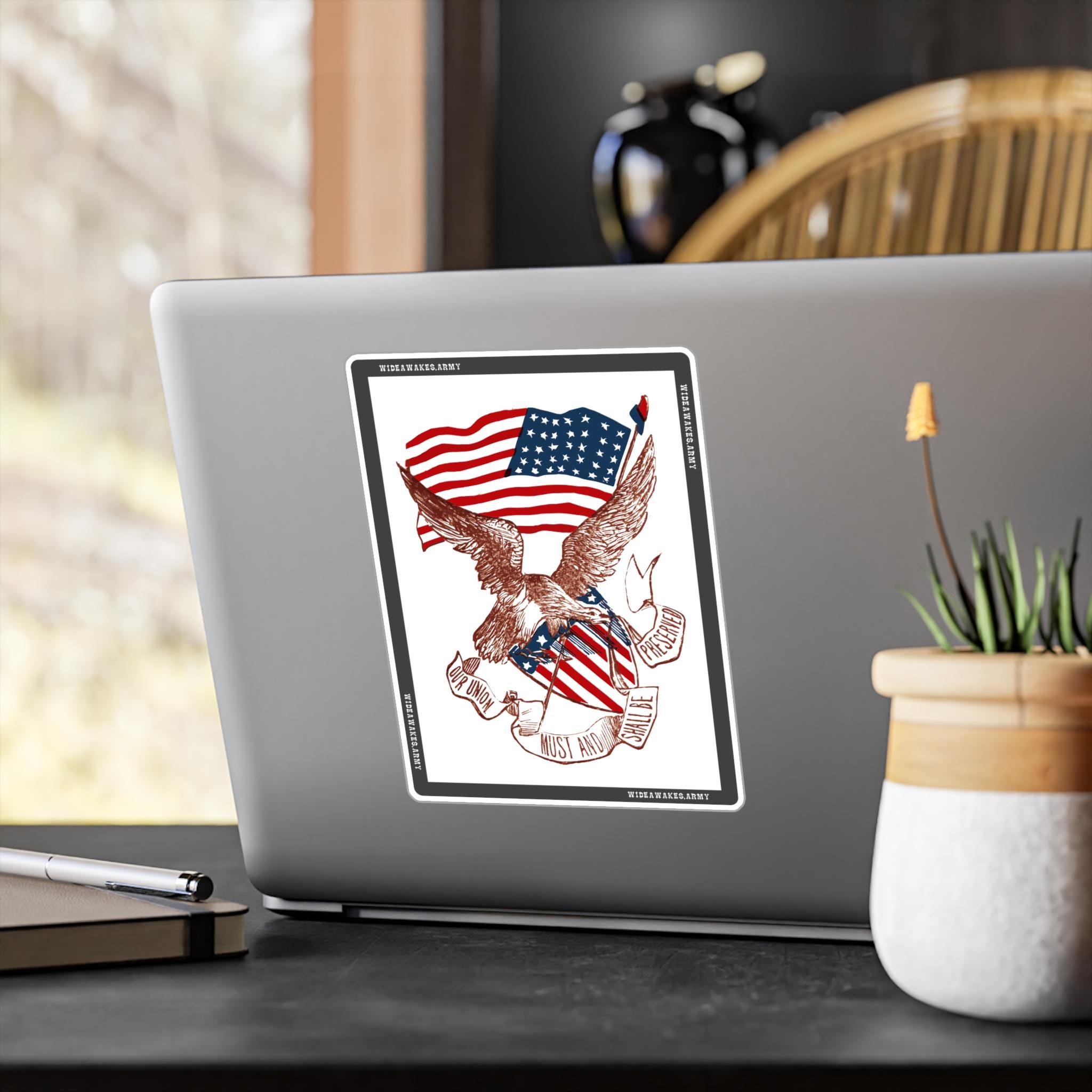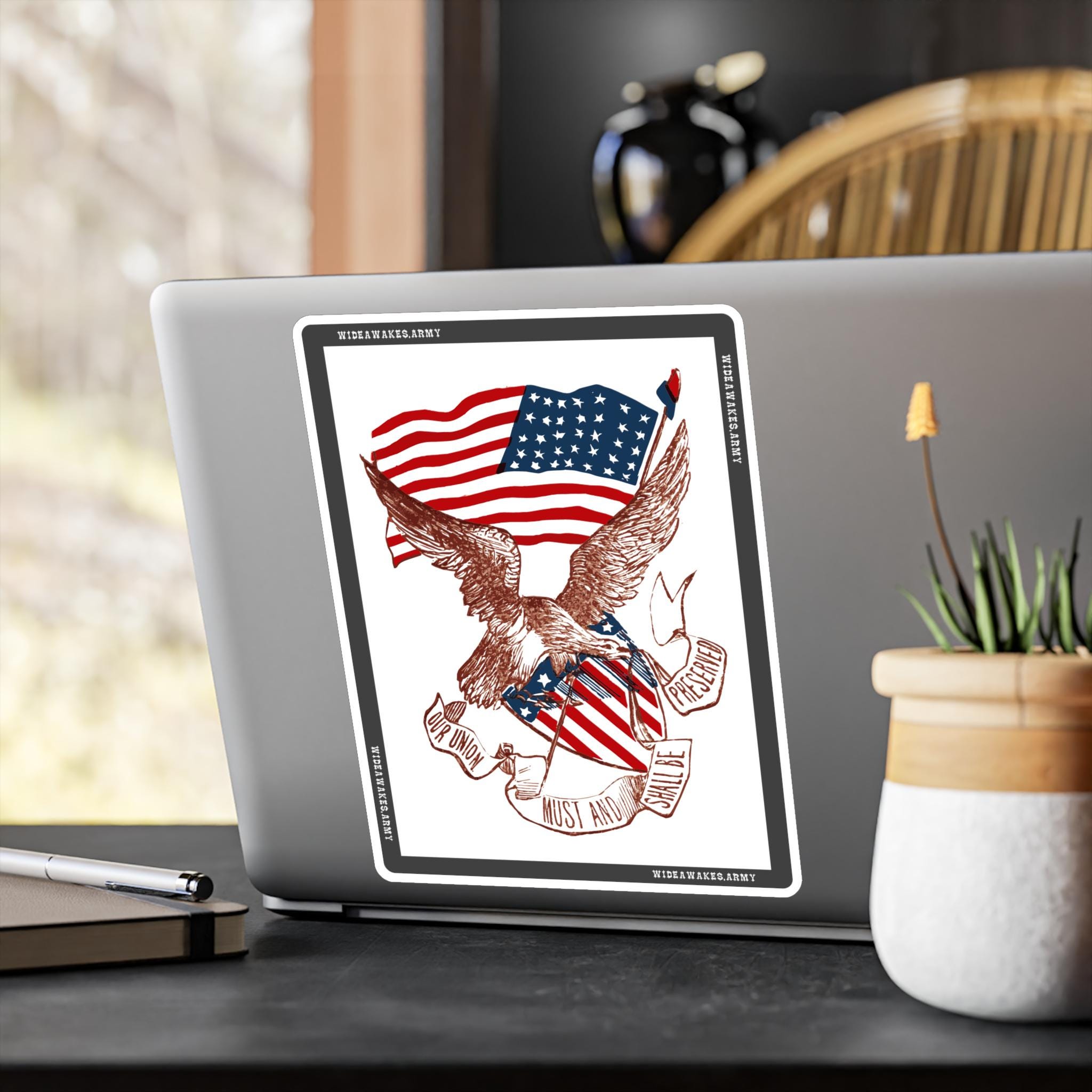 This durable vinyl decal features a meticulously restored design from a pro-Union envelope stamp from the Civil War. The artwork is dense with powerful symbolism: a fierce American eagle, carrying arrows of war, soars before the flag and shield of the nation. On its lance is a Phrygian cap—the "Liberty Cap"—a potent symbol representing freedom from tyranny. The banner unfurling below delivers the uncompromising motto: "OUR UNION MUST AND SHALL BE PRESERVED." It's a complete statement of American resolve, perfect for your car, laptop, or notebook. Product features - Removable adhesive allows for easy application and removal without residue. - Water, scratch, and UV resistant for vibrant colors lasting up to 3 years outdoors. - Satin finish gives a high-quality look and feel to each sticker. - Available in four sizes to suit different projects and preferences. - Made in the USA from globally sourced materials for eco-conscious consumers.