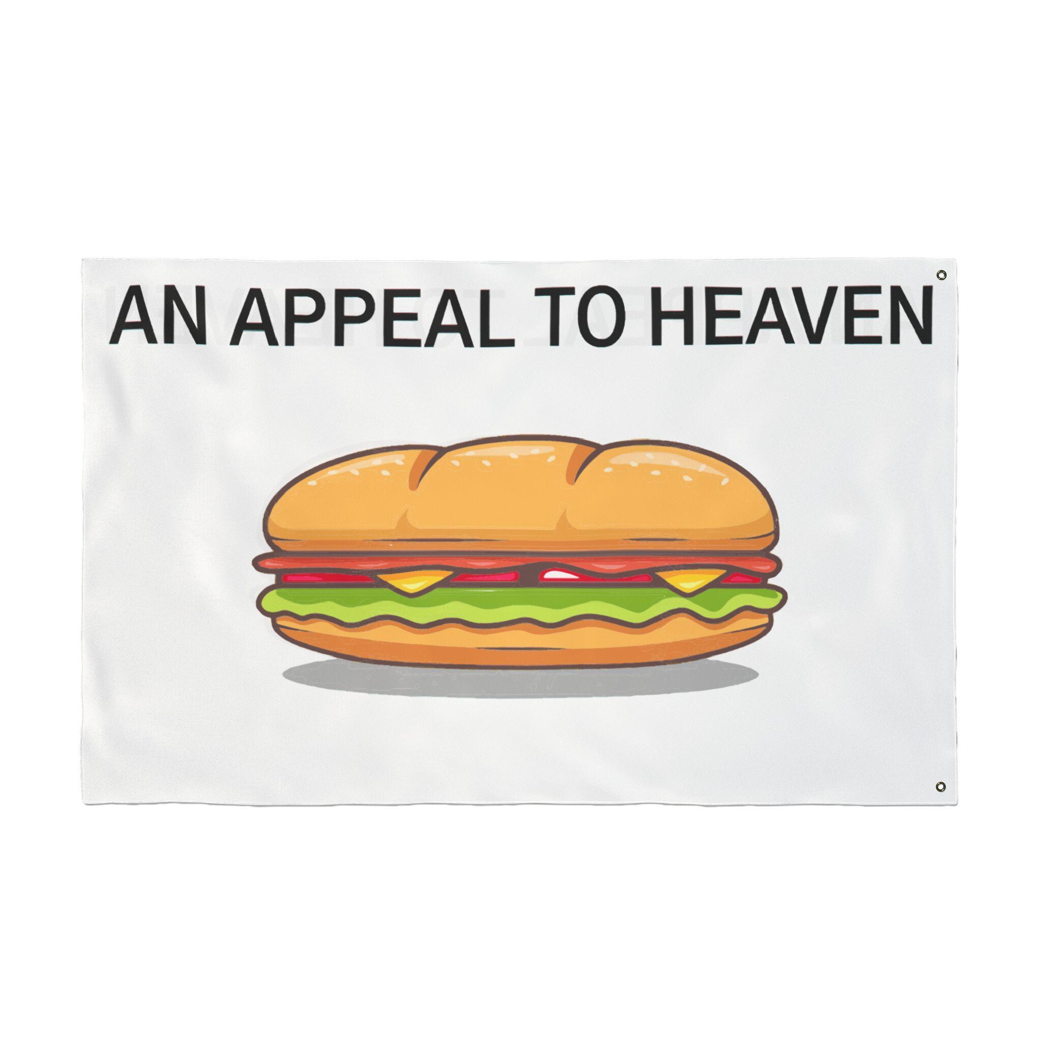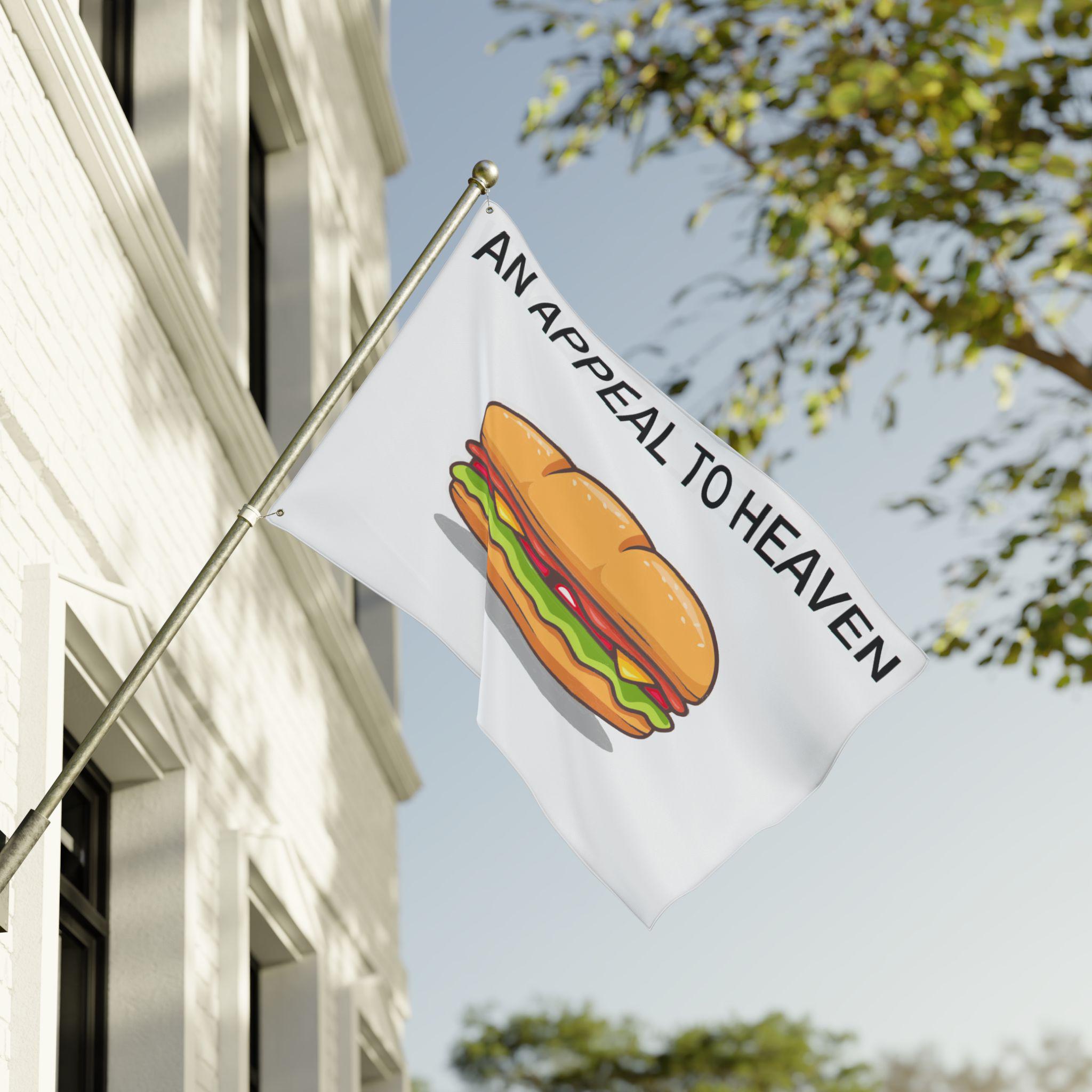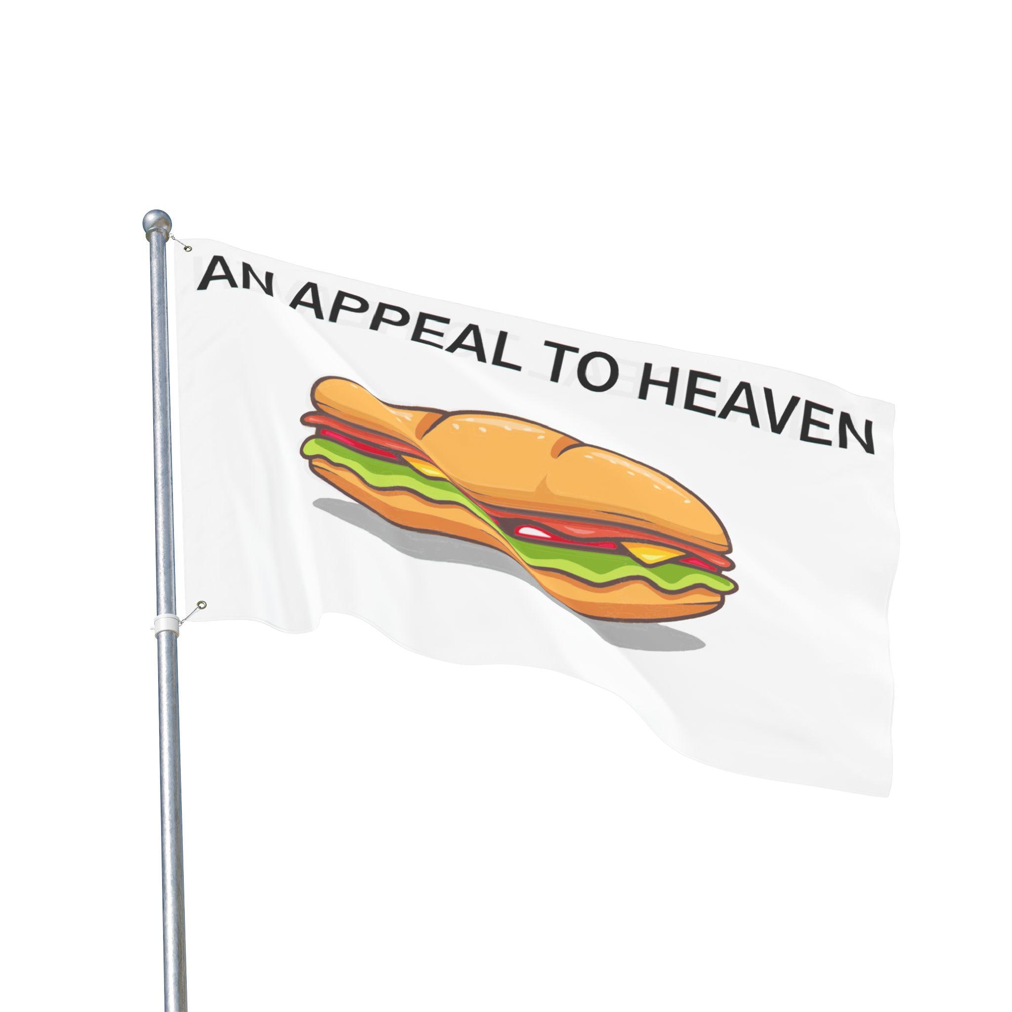 In the grand tradition of American protest, sometimes you have to use what's on hand. This flag is a tribute to a recent, legendary moment of culinary civil disobedience. It's a modern twist on the classic Pine Tree Flag, a symbol of defiance from the American Revolution. The stately pine tree has been replaced with a more immediate symbol of the people's sentiment: a heroically thrown sandwich. The motto remains the same: "AN APPEAL TO HEAVEN." It's a statement that when all other options have been exhausted, you're left with two things: divine justice and a deli lunch. This high-quality, double-sided flag with sturdy metal grommets is ready to be flown as a symbol of our delicious new resistance.