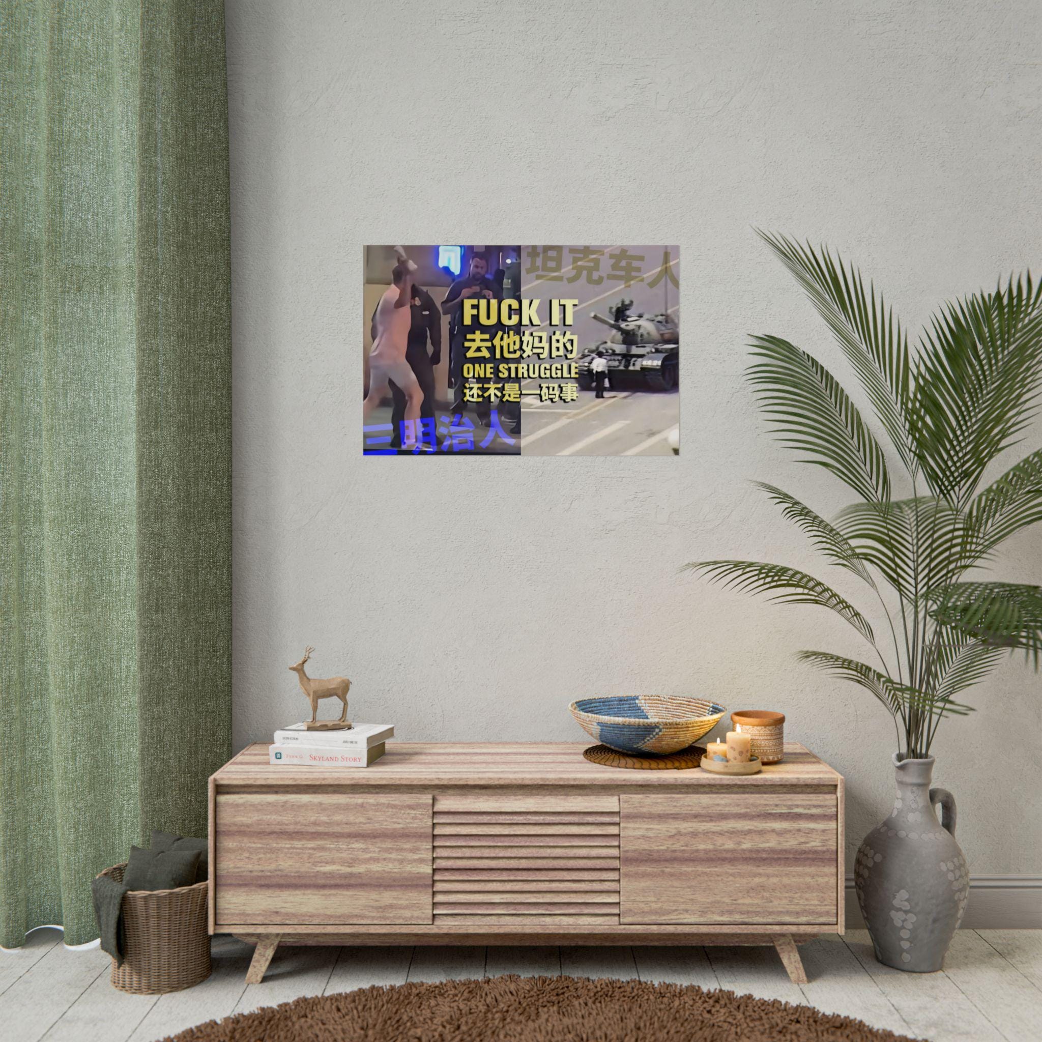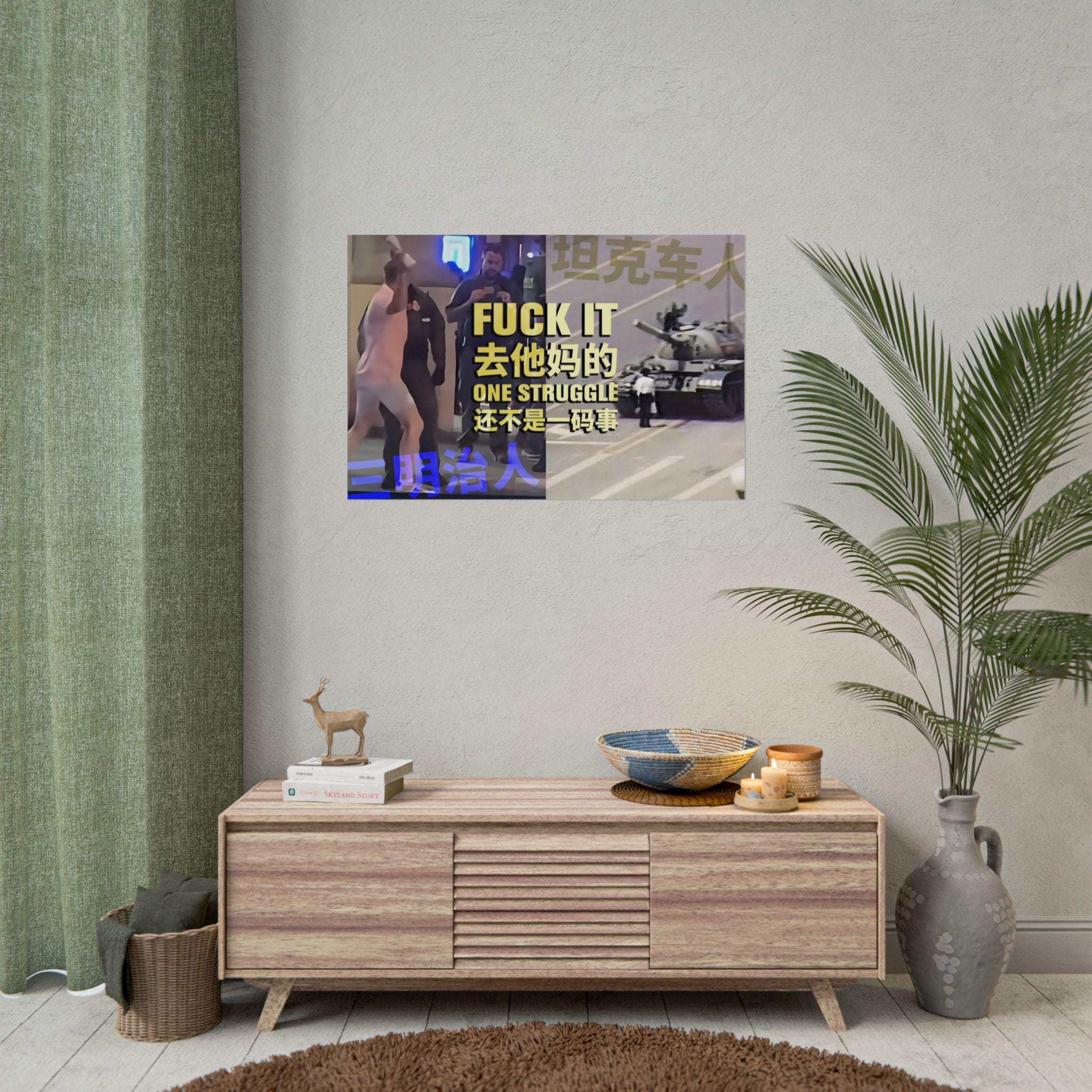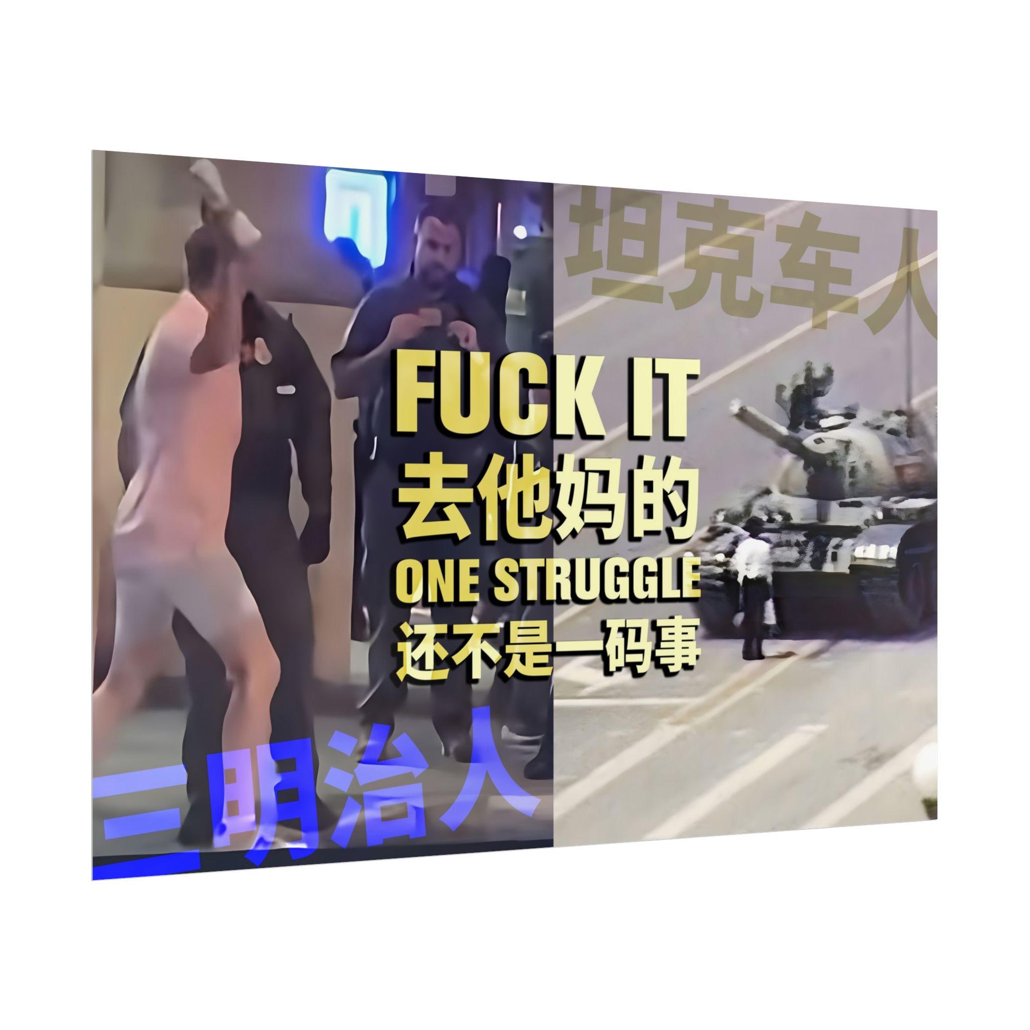 The Message: With raw, bilingual text including "FUCK IT" and "ONE STRUGGLE," this piece makes a bold and uncompromising argument that the spirit of defiance against state overreach is a universal human trait, regardless of the scale or the stakes.