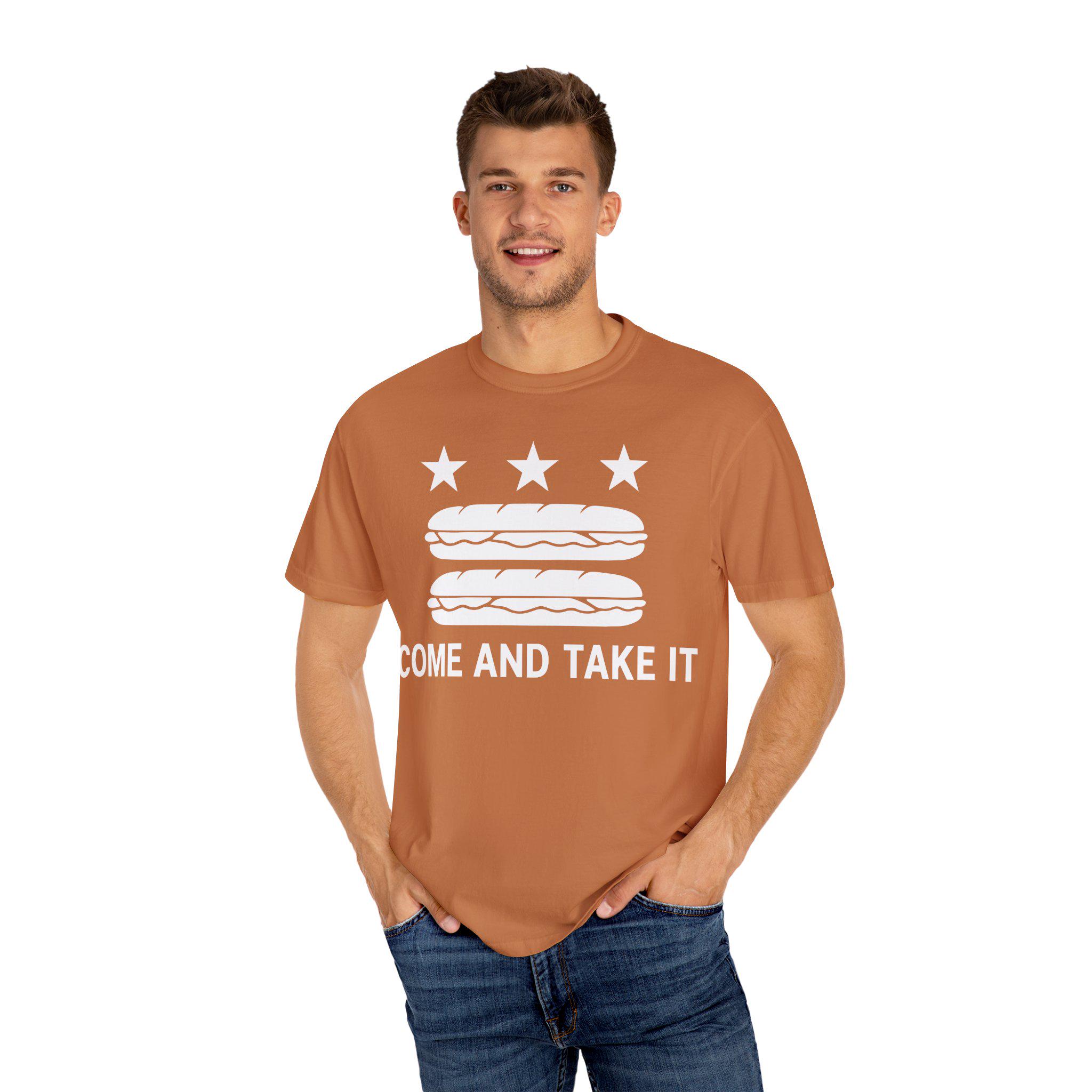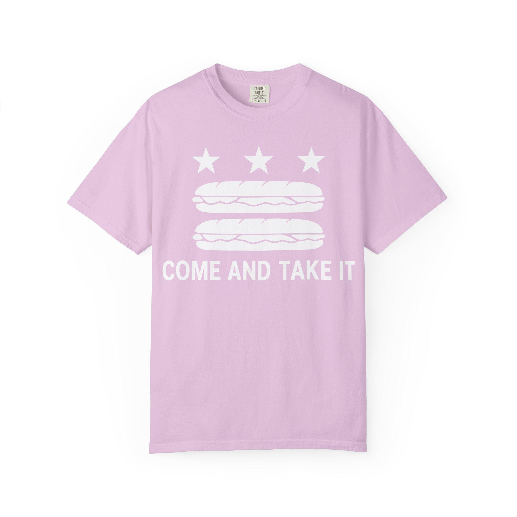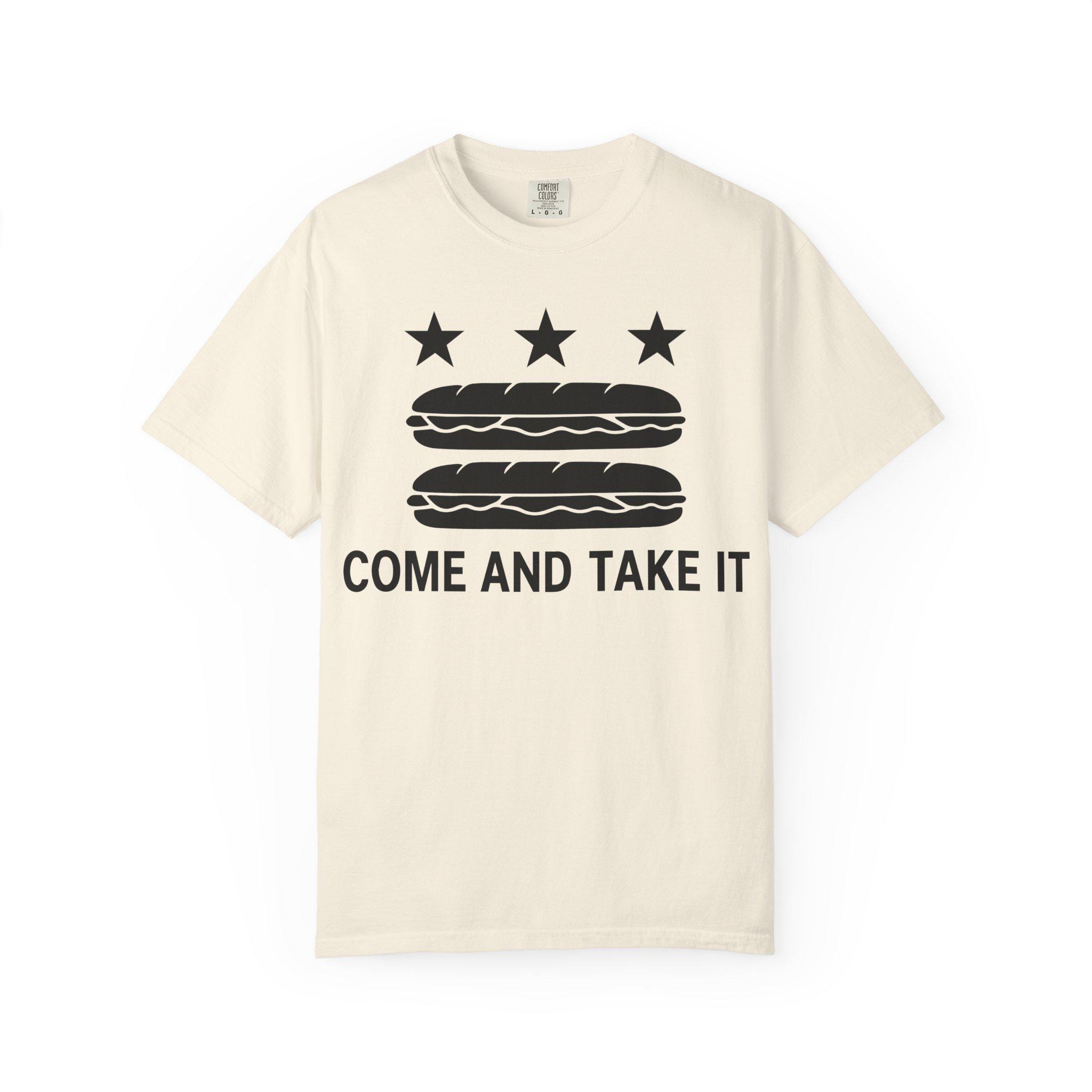 This t-shirt mashes up three distinct pieces of American history: the D.C. flag, the "Come and Take It" slogan of the Texas Revolution, and a viral moment of modern protest. The design visually parodies the flag of Washington D.C., but with a crucial update: the bars have become sandwiches. The slogan, "COME AND TAKE IT," connects this absurd act to a legacy of American defiance.