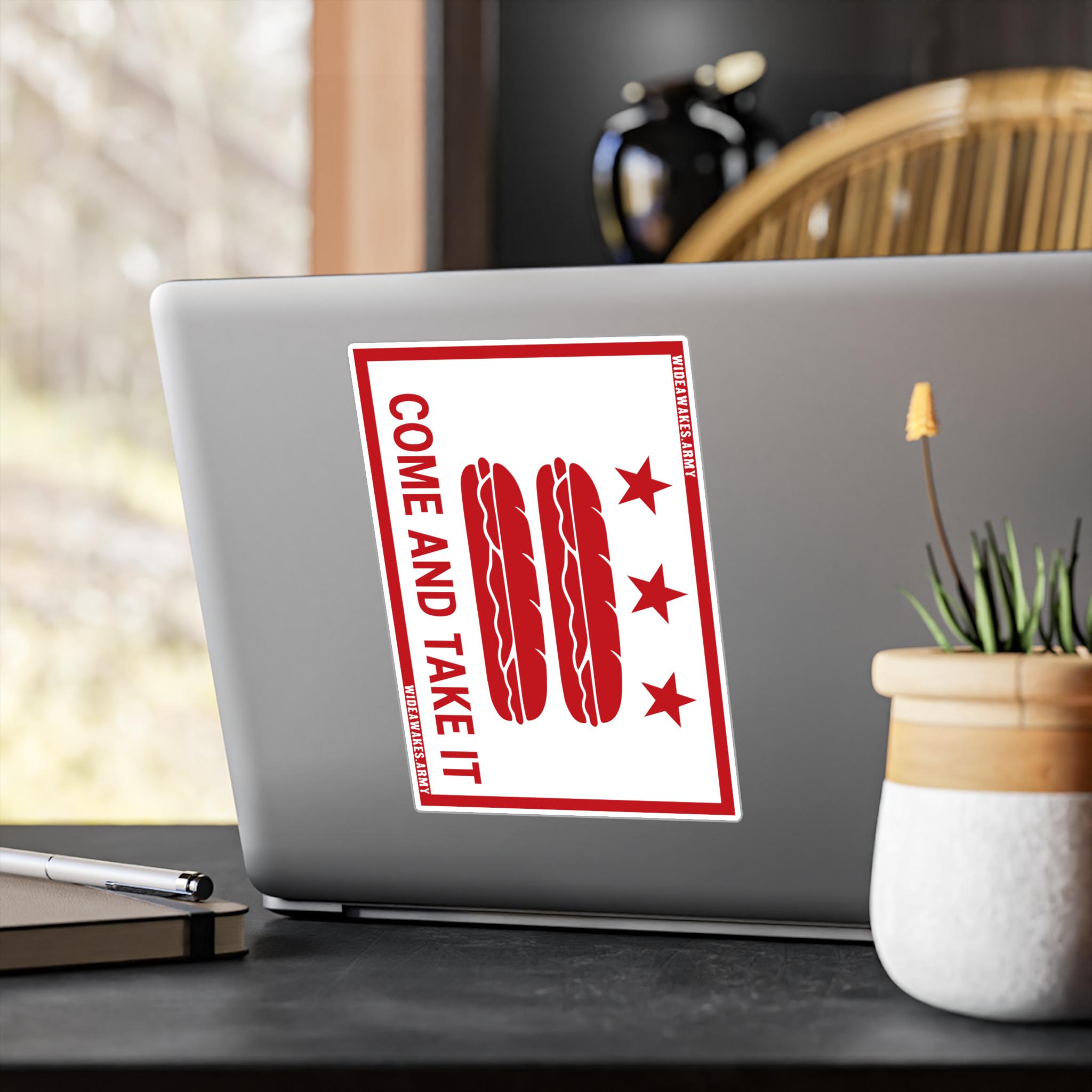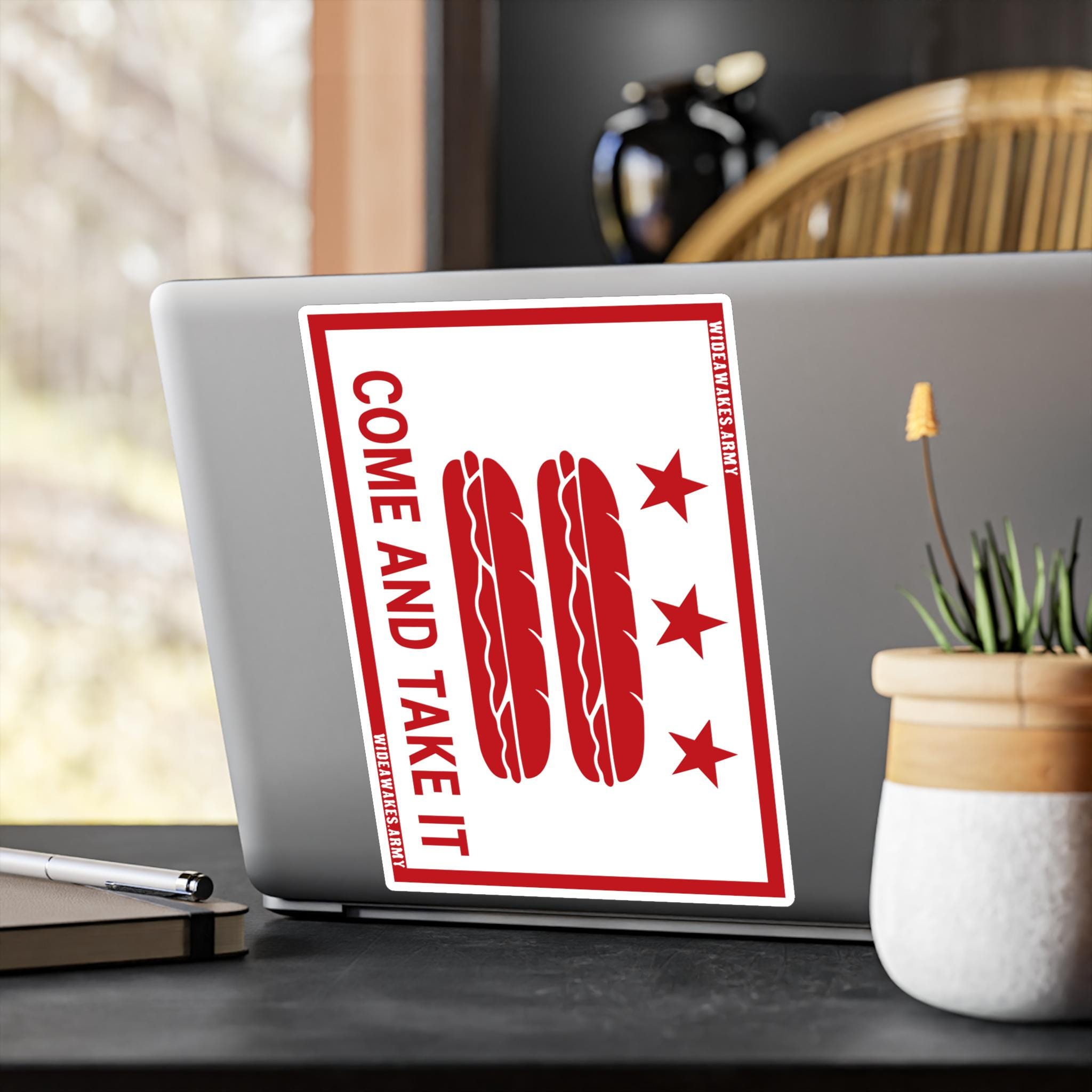 This vinyl decal mashes up three distinct pieces of American history: the D.C. flag, the "Come and Take It" slogan of the Texas Revolution, and a viral moment of modern protest. The design visually parodies the flag of Washington D.C., but with a crucial update: the bars have become sandwiches. The slogan, "COME AND TAKE IT," connects this absurd act to a legacy of American defiance. It was the motto of Texan colonists at the Battle of Gonzales, who dared the Mexican army to try and take their cannon. By placing this phrase on the sandwich decal, we're making a humorous but pointed statement that the spirit of defending what's yours is alive and well. Product features - Removable adhesive for easy application - Water, scratch, and UV resistant for outdoor durability - Satin finish for a sleek look - Vibrant colors for lively designs - Available in four sizes to fit your needs