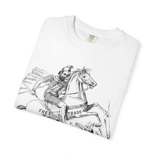 This t-shirt is a piece of rapid-response art for a critical moment. It takes the recent, powerful words of Illinois Governor J. B. Pritzker—"Be Loud for America"—and sets them within a piece of classic Americana. The quote, a rallying cry against the illegal occupation of our streets by the military, is rendered in a period-appropriate wood type sans serif, to complement the historical character of the design.