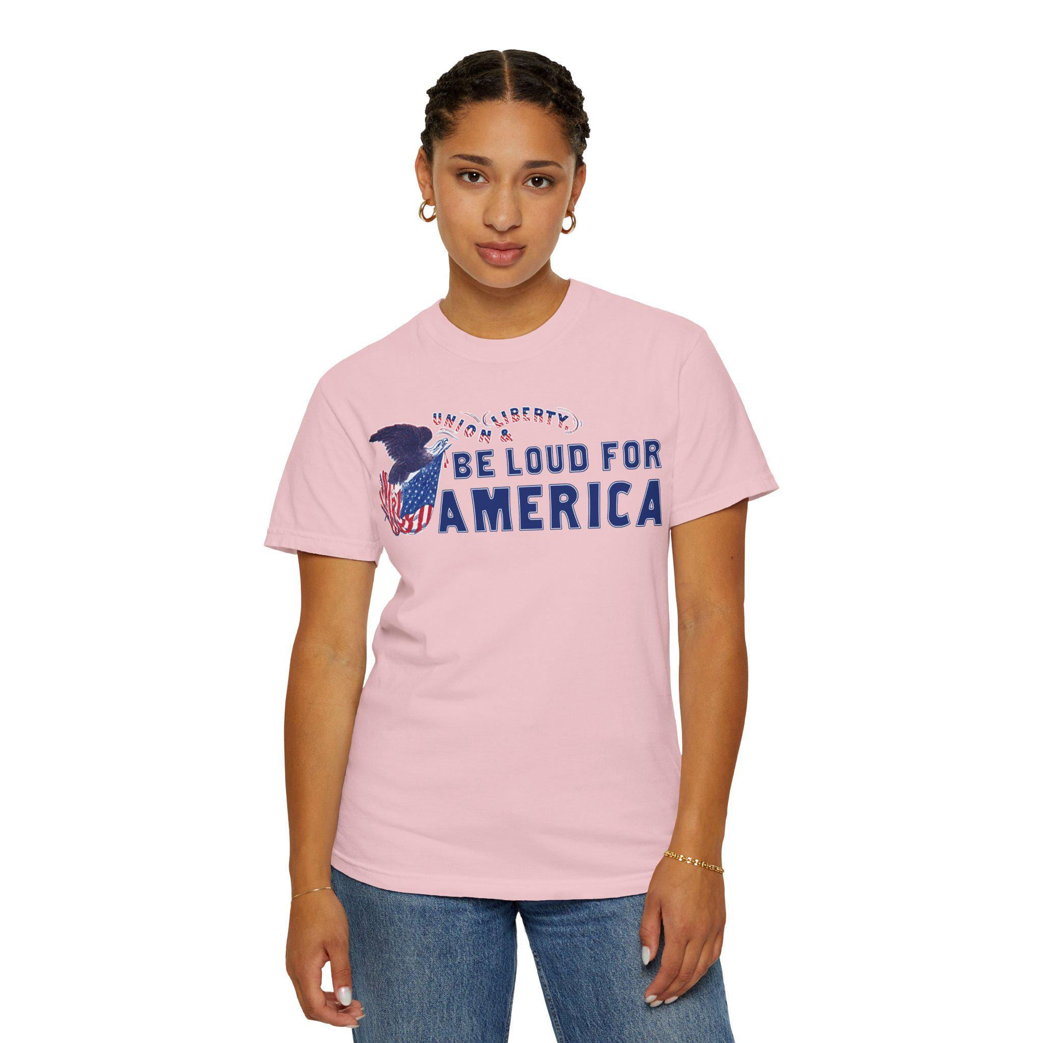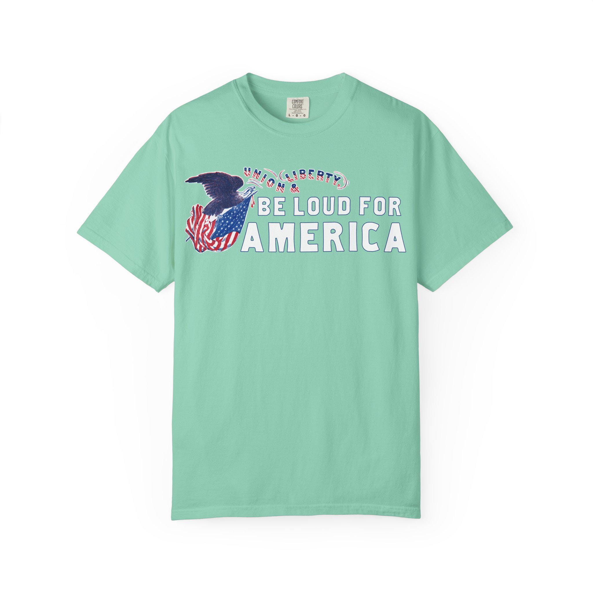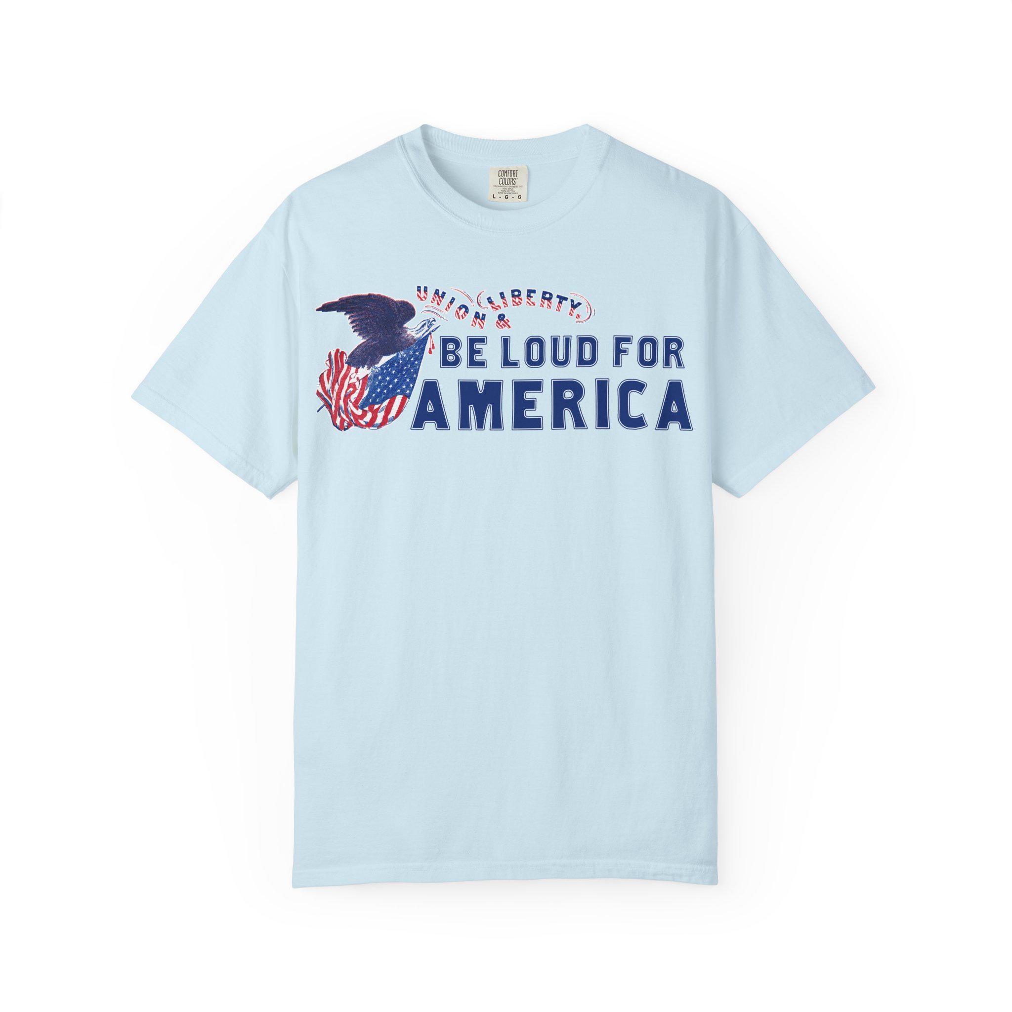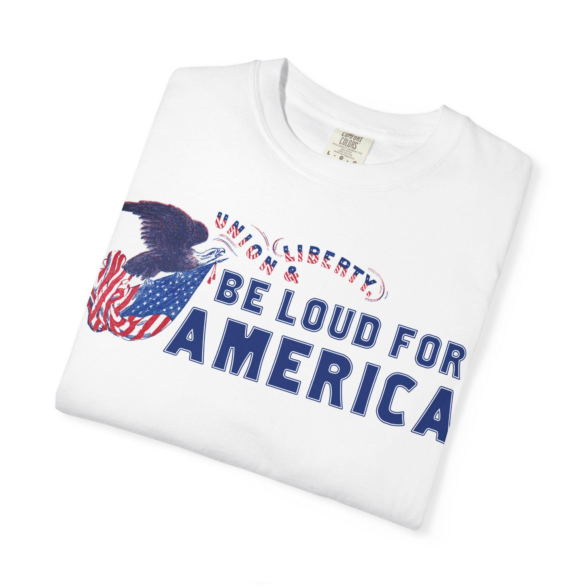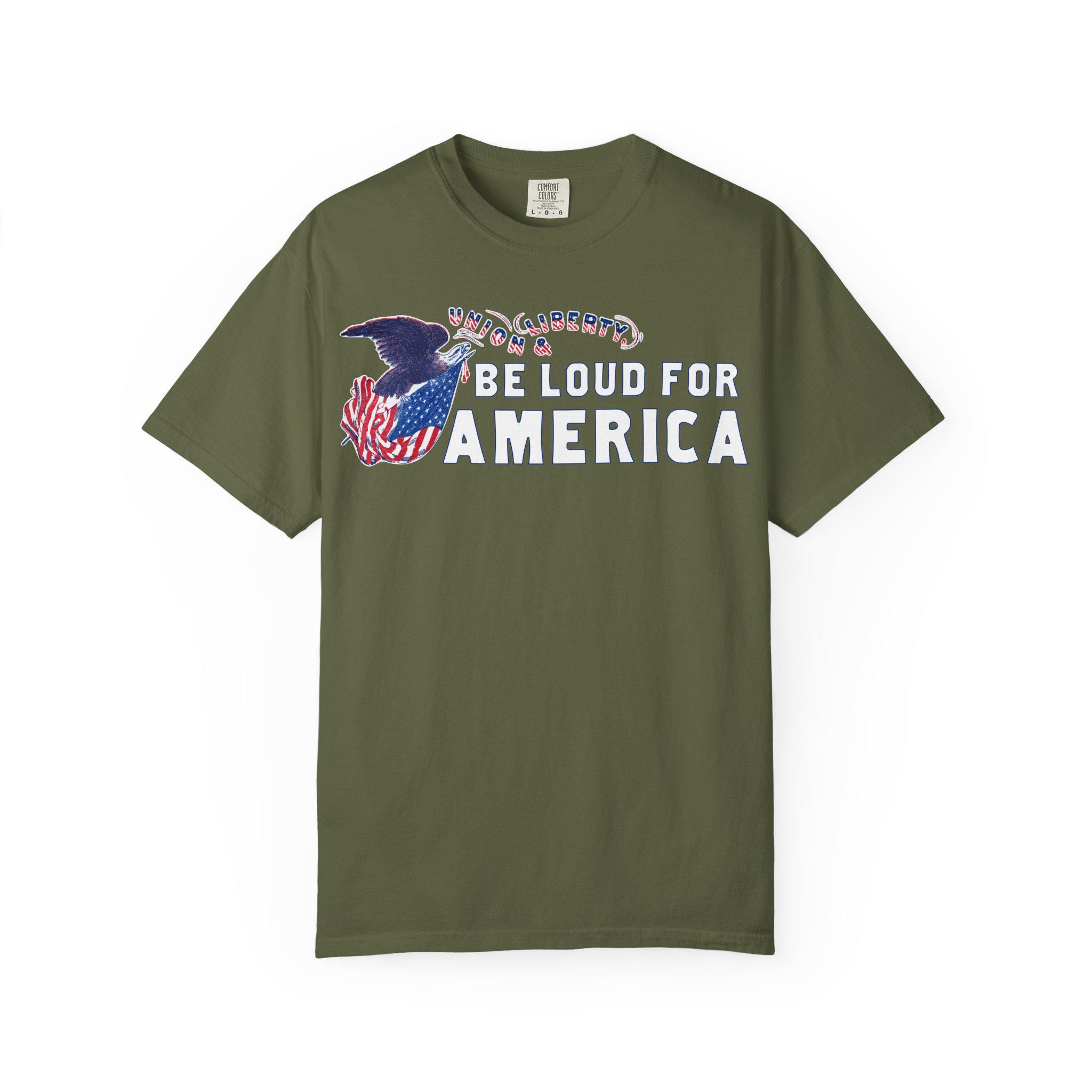 This modern call to action is integrated into a restored Civil War-era letterhead stamp, featuring a Union eagle and the original motto, "Union & Liberty." The pairing is intentional: it argues that being "loud for America" today is a direct continuation of the 19th-century fight to preserve the nation's core principles of freedom and unity.