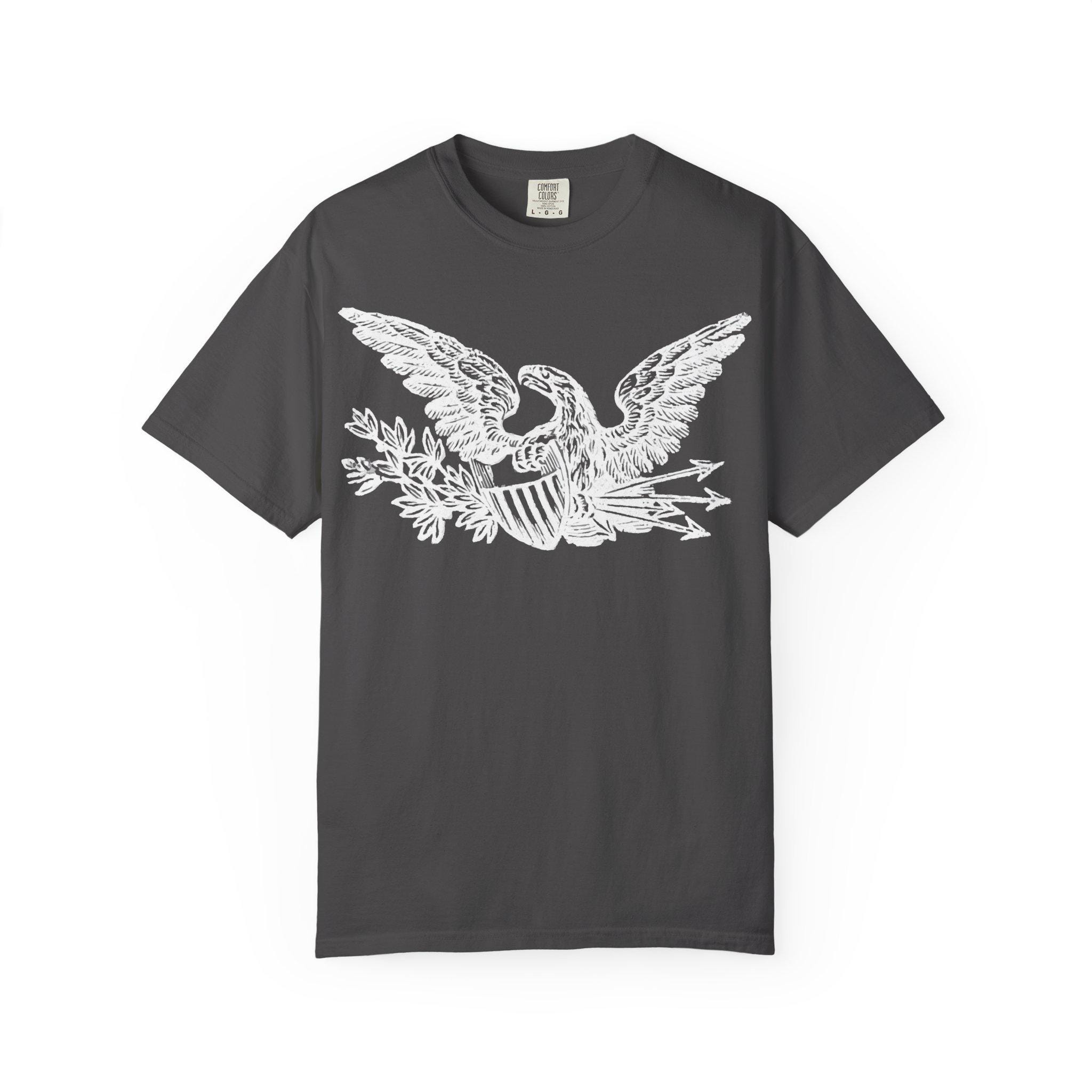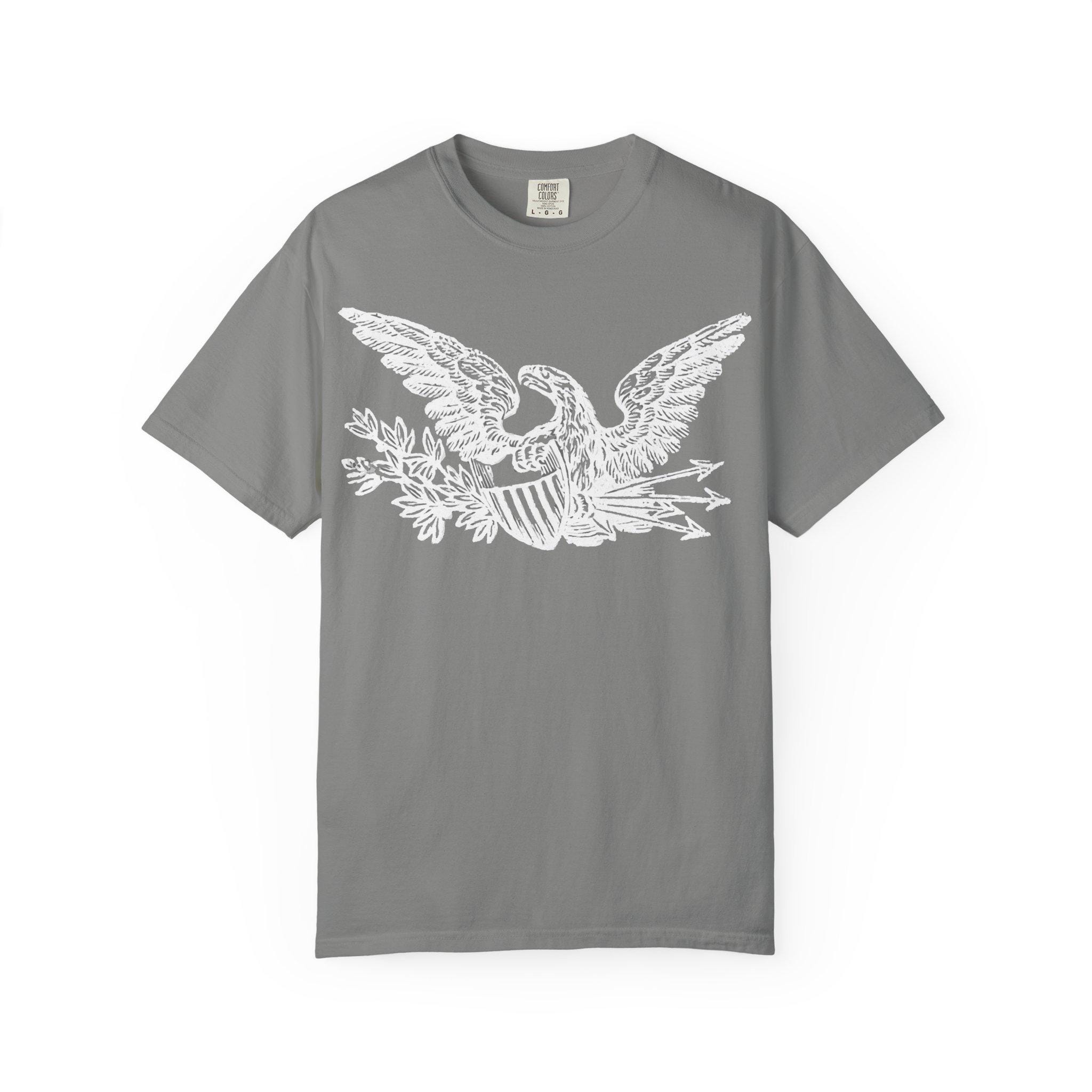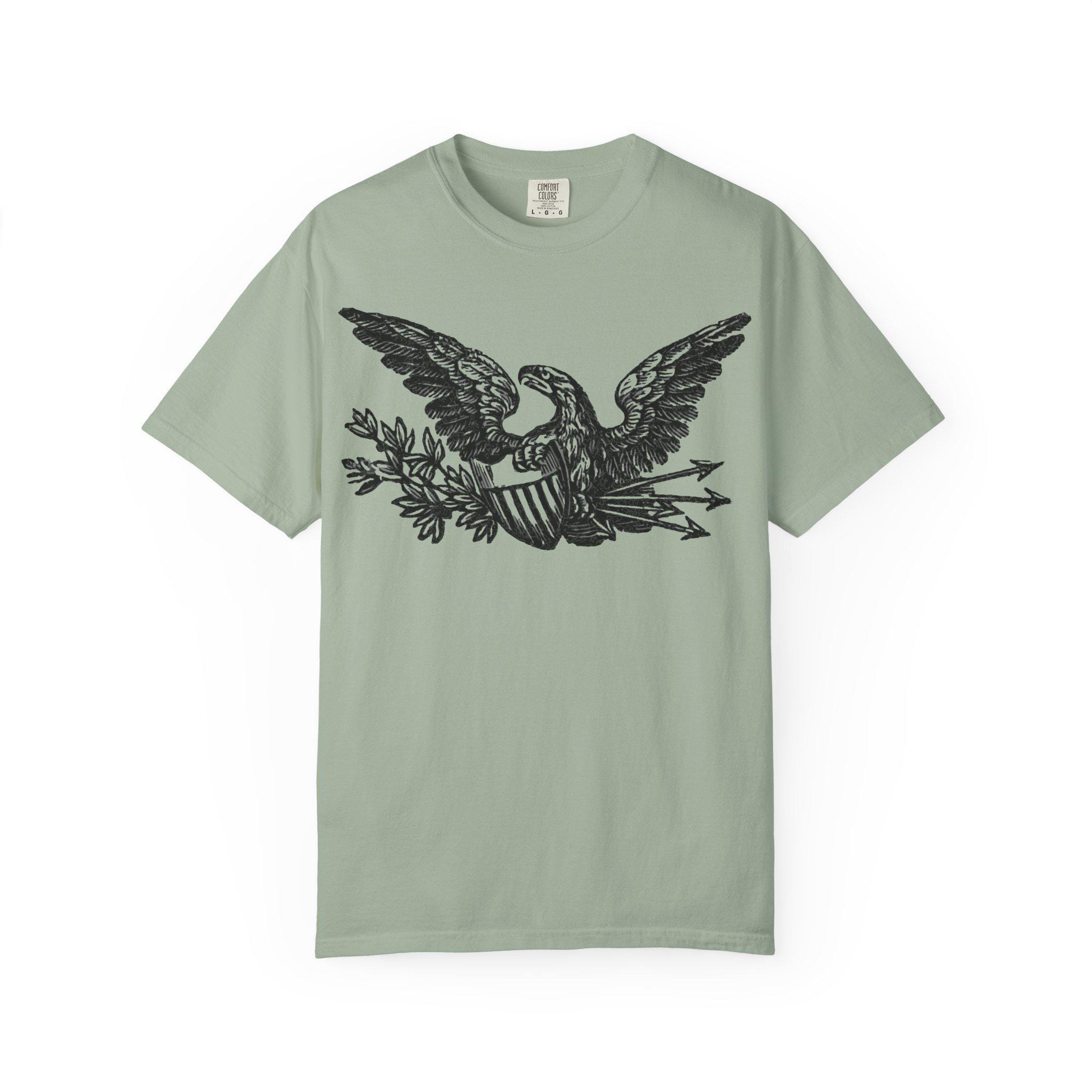 A high-quality t-shirt featuring a beautifully restored patriotic eagle from a Civil War-era envelope stamp.