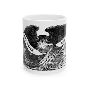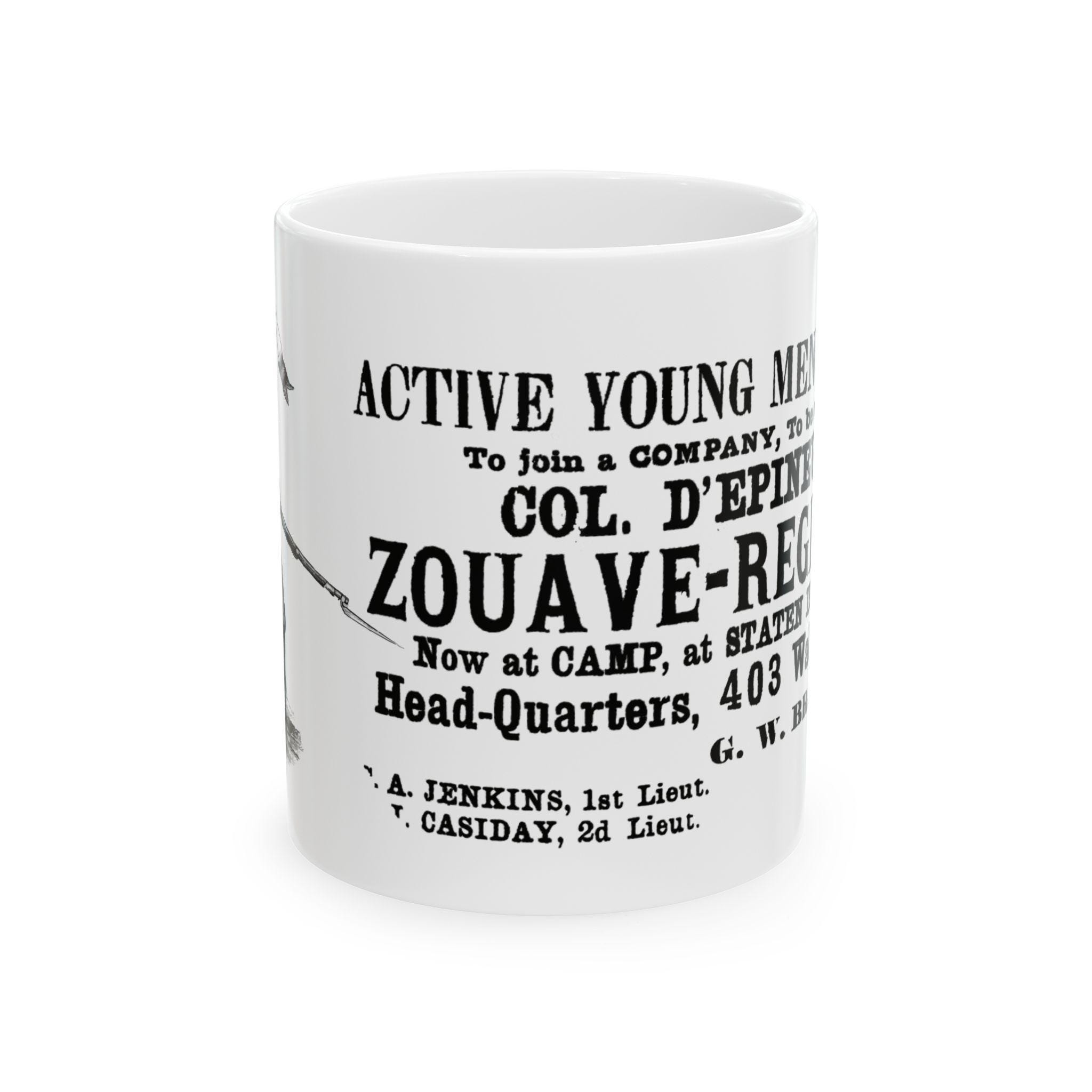 This durable ceramic mug features a complete historical narrative wrapped around its surface. On one side, a classic, restored stamp design of a bold "N.Y. ZOUAVE" on guard. Next to him is the source of his enlistment: a complete, text-rich recruitment advertisement calling for "ACTIVE YOUNG MEN WANTED" to join Colonel D'Epineuil's Zouave Regiment, then camped on Staten Island. It's a fascinating historical document you can study over your morning coffee, right down to the officers' names. Available in a standard 11oz or a generous 15oz size, this mug is perfect for any Civil War historian or New York history enthusiast