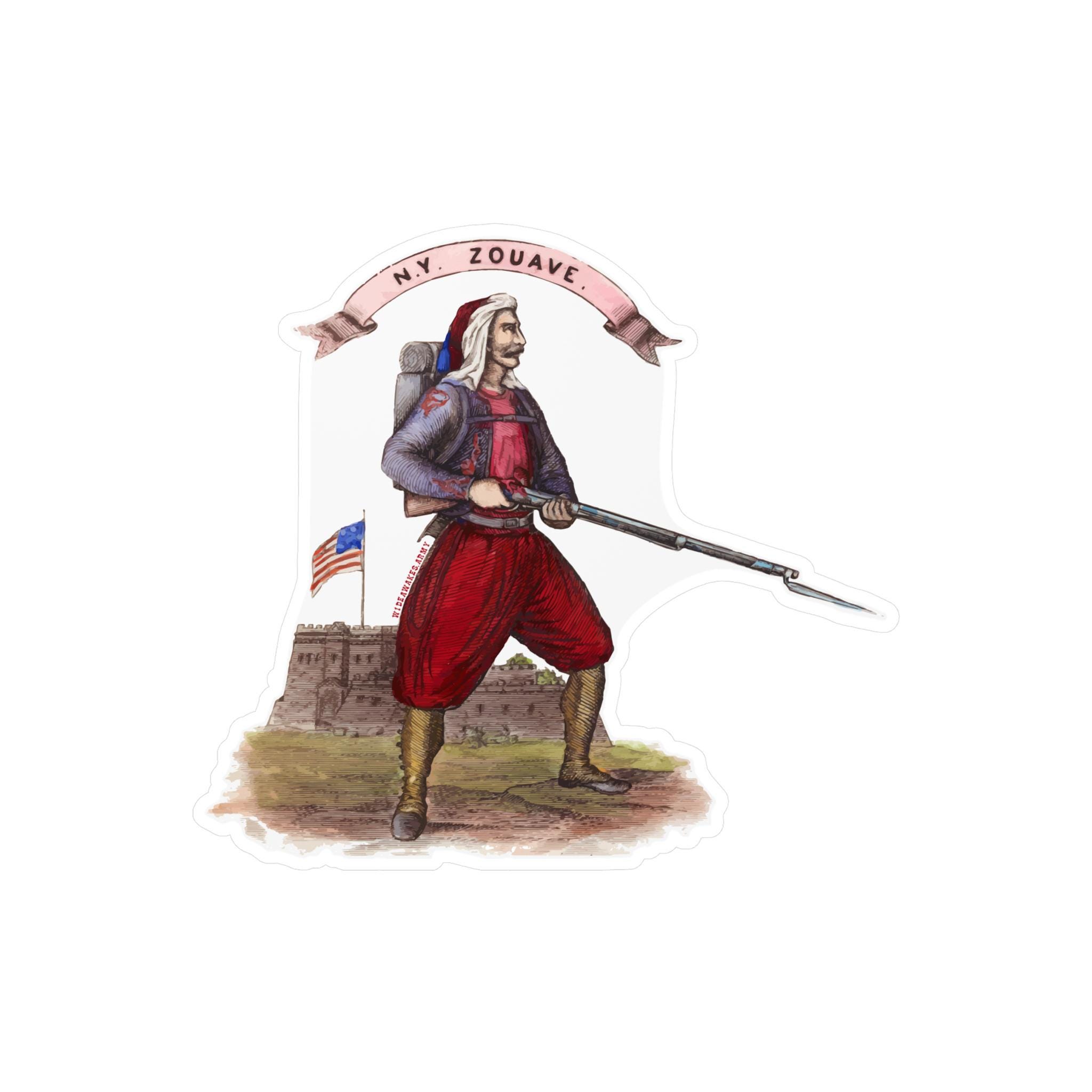 The Art: A resolute mustachioed Zouave soldier stands with a fixed-bayonet rifle, with a fort and American flag in the background.
