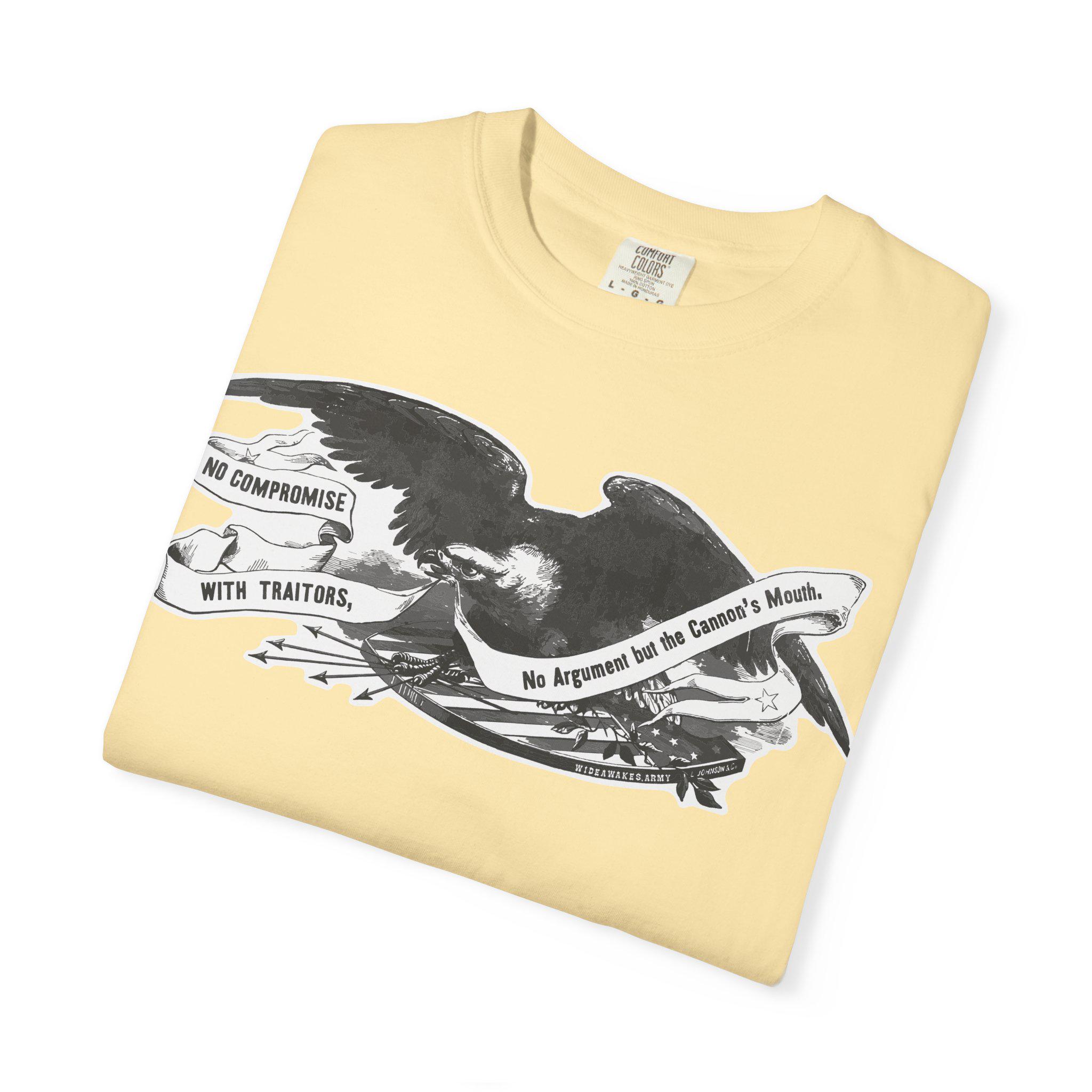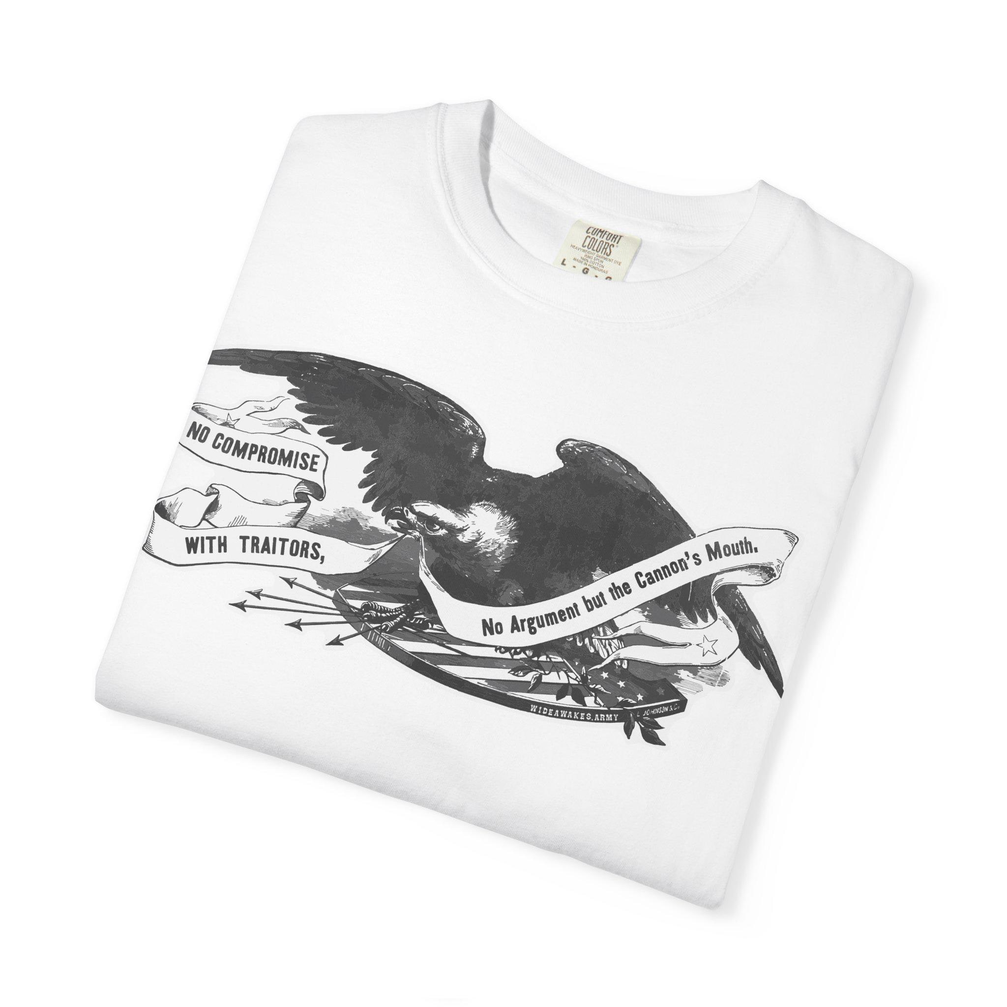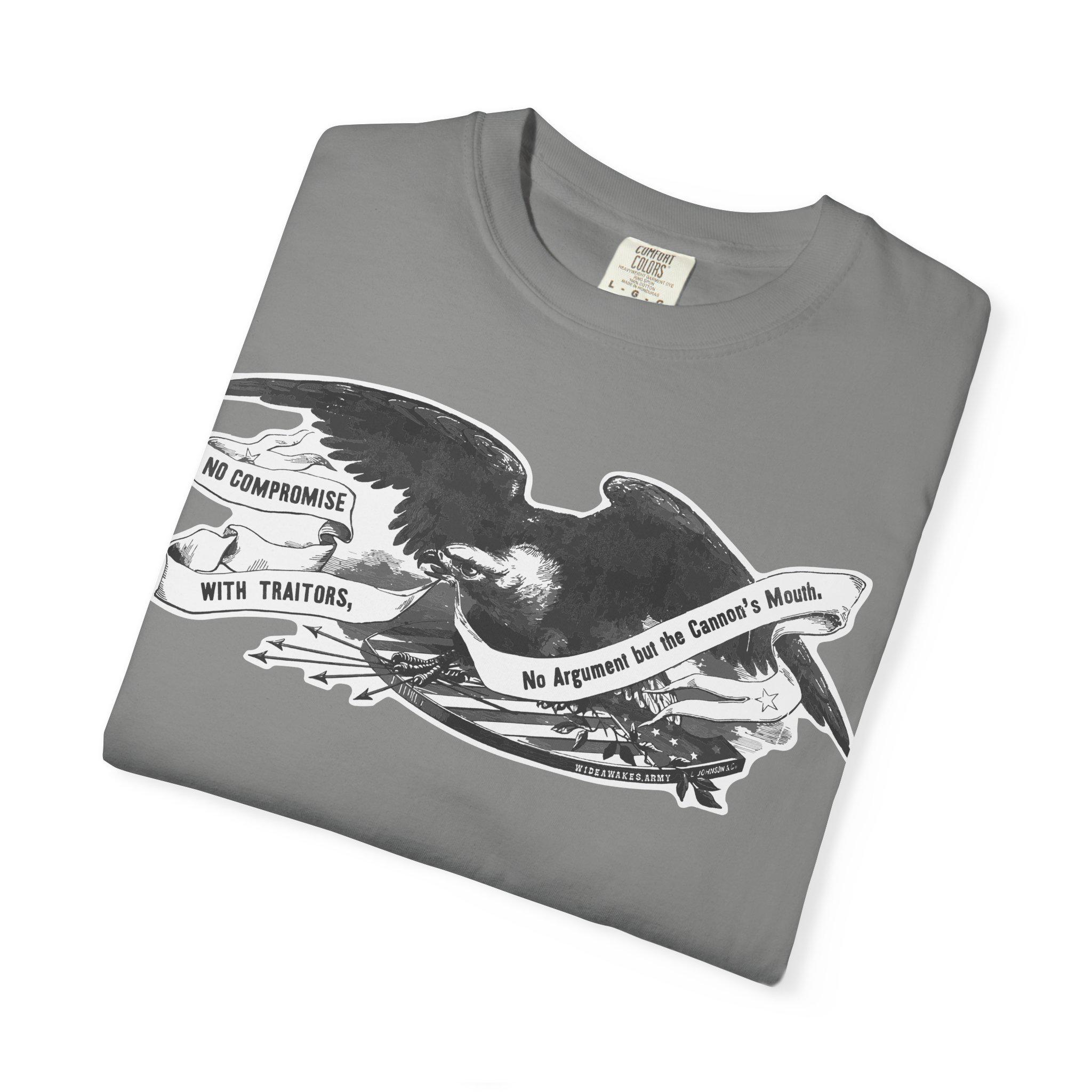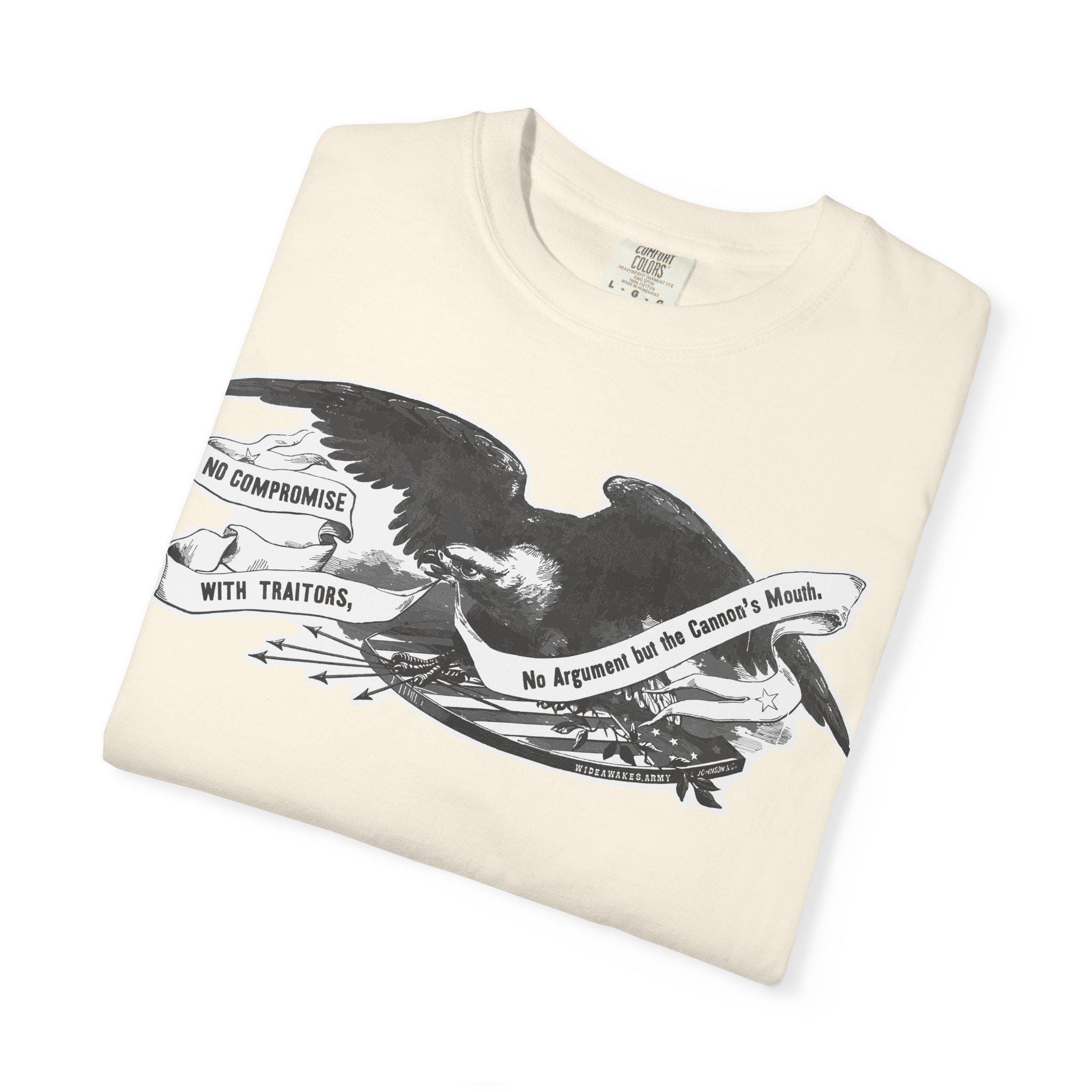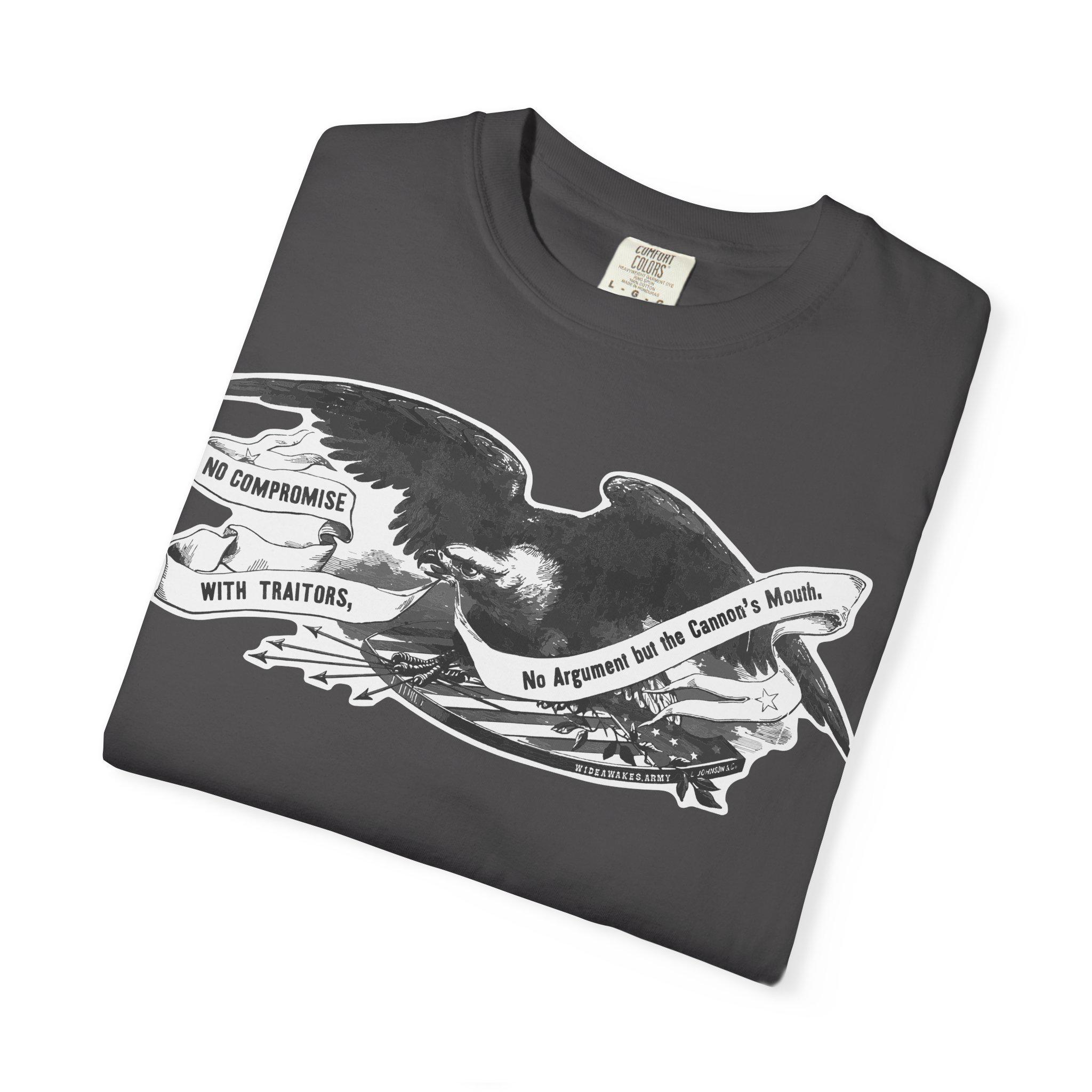 This comfortable t-shirt features the powerful central illustration from a Civil War recruitment poster printed by the famed King & Baird of Philadelphia. The design isolates the most important element: a classic Union eagle, carrying a banner with one of the most uncompromising mottos of the entire war: "NO COMPROMISE WITH TRAITORS, No Argument but the Cannon's Mouth." This was a statement of total war, a rejection of any negotiation with secessionist forces. It's a testament to the iron will of those who fought to preserve the Union and a stark piece of wearable history.