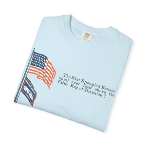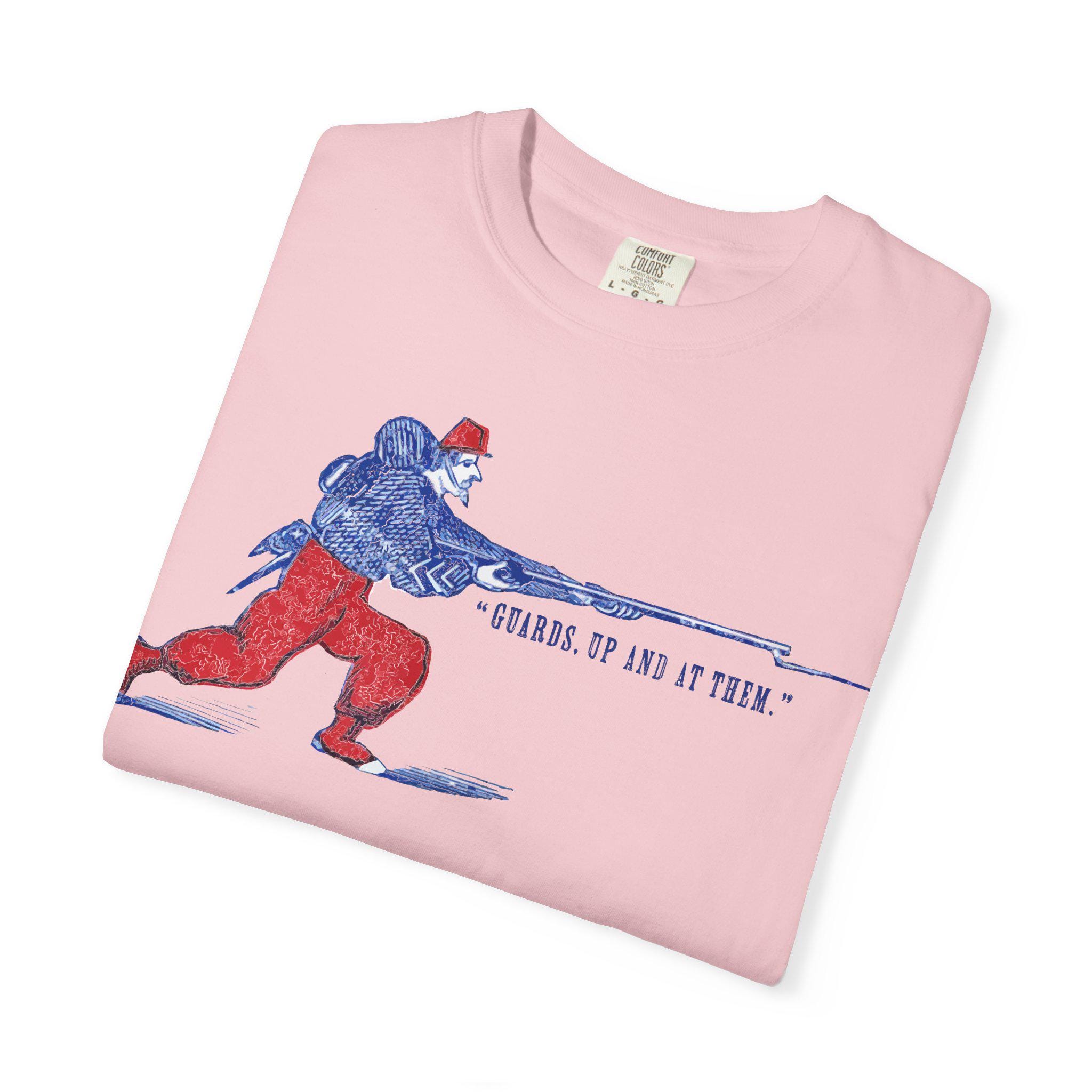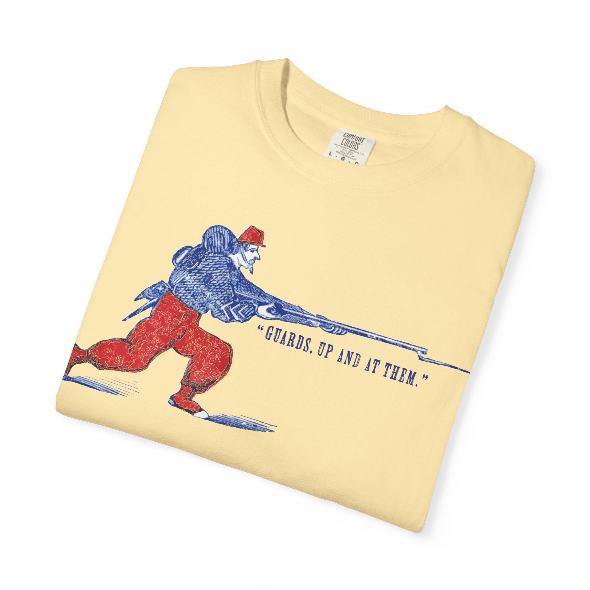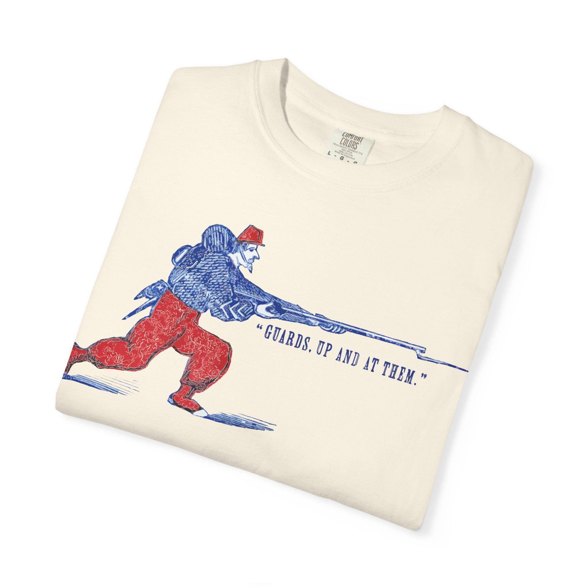 Capture the legendary fighting spirit of the Civil War's most colorful soldiers with this dynamic t-shirt. Restored from an authentic 1860s envelope stamp, this design features a stylized Union Zouave, resplendent in his red and blue uniform, charging forward with a fixed bayonet. The motto, "GUARDS, UP AND AT THEM!," is a classic battlefield cry, a call to immediate and courageous action. It perfectly encapsulates the élan and aggressive spirit for which the Zouave regiments were famous. Printed on a comfortable, high-quality shirt, this is a perfect piece for any history buff or military enthusiast.