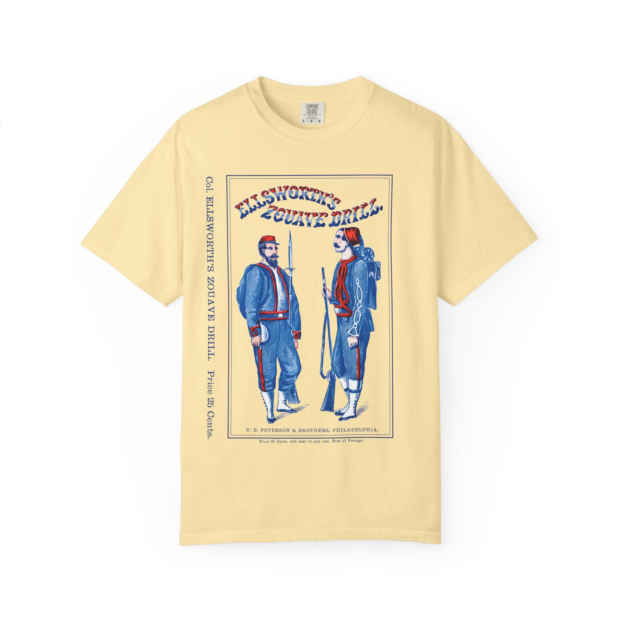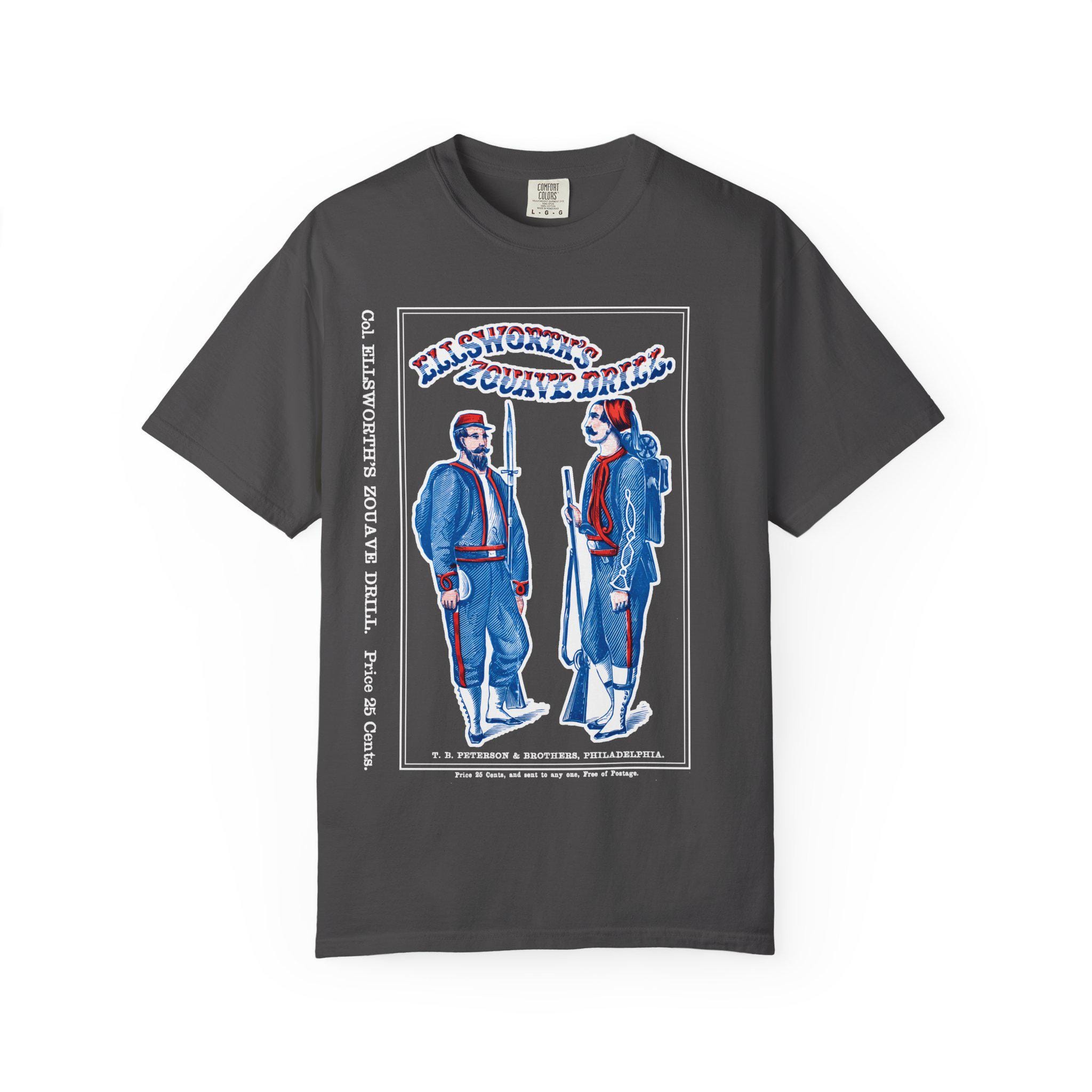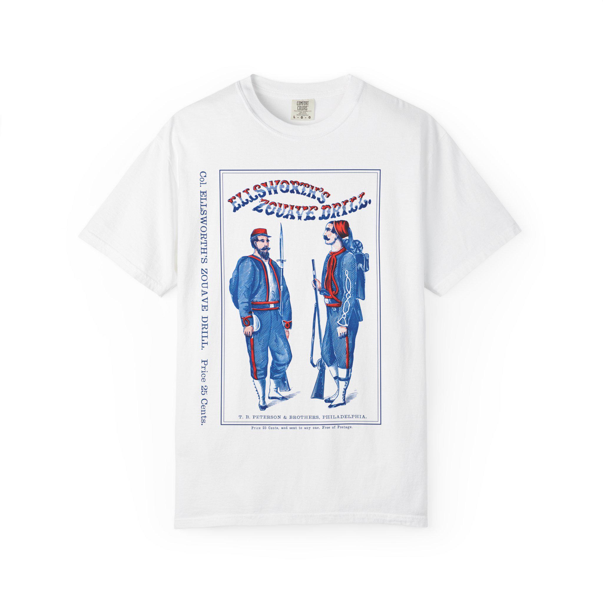 Immerse yourself in the disciplined world of Civil War Zouaves with this unique t-shirt. It reproduces the striking cover of "Ellsworth's Zouave Drill," a manual that helped shape the distinctive look of these elite regiments. The design is a fantastic example of 19th-century cover art, with its bold, patriotic red, white, and blue typography and the stoic figures of two Zouave soldiers at attention. This shirt is not just a historical document; it's a piece of art that speaks to the precision and theatricality of Zouave units, perfect for any military history buff or lover of vintage design. Product features - Available in sizes S to 4XL for a perfect fit. Consult the Comfort Colors 1717 size chart. - Durable double-needle stitching on all seams ensures longevity. - Constructed without side seams, minimizing fabric waste and enhancing comfort. - Garment-dyed for a soft texture and rich color. - Made from 100% ring-spun US cotton, offering ultimate comfort.