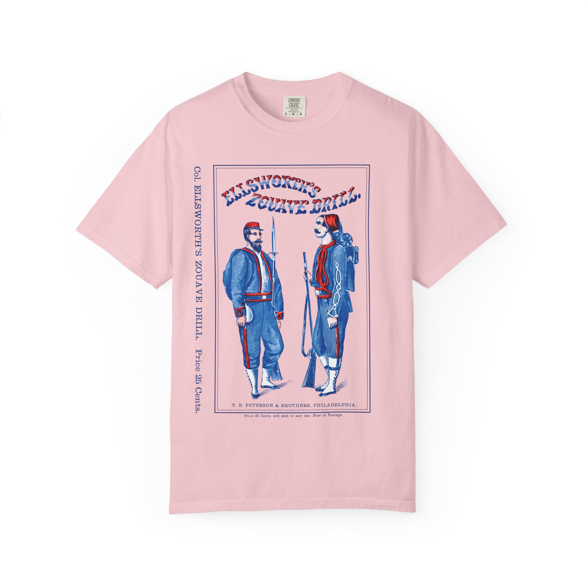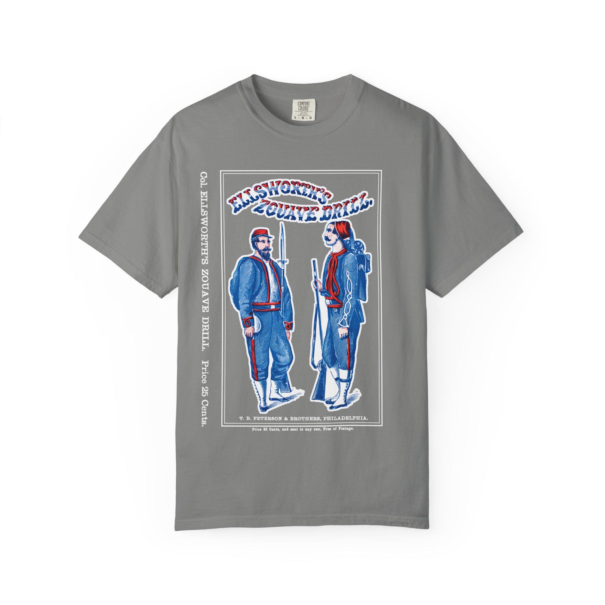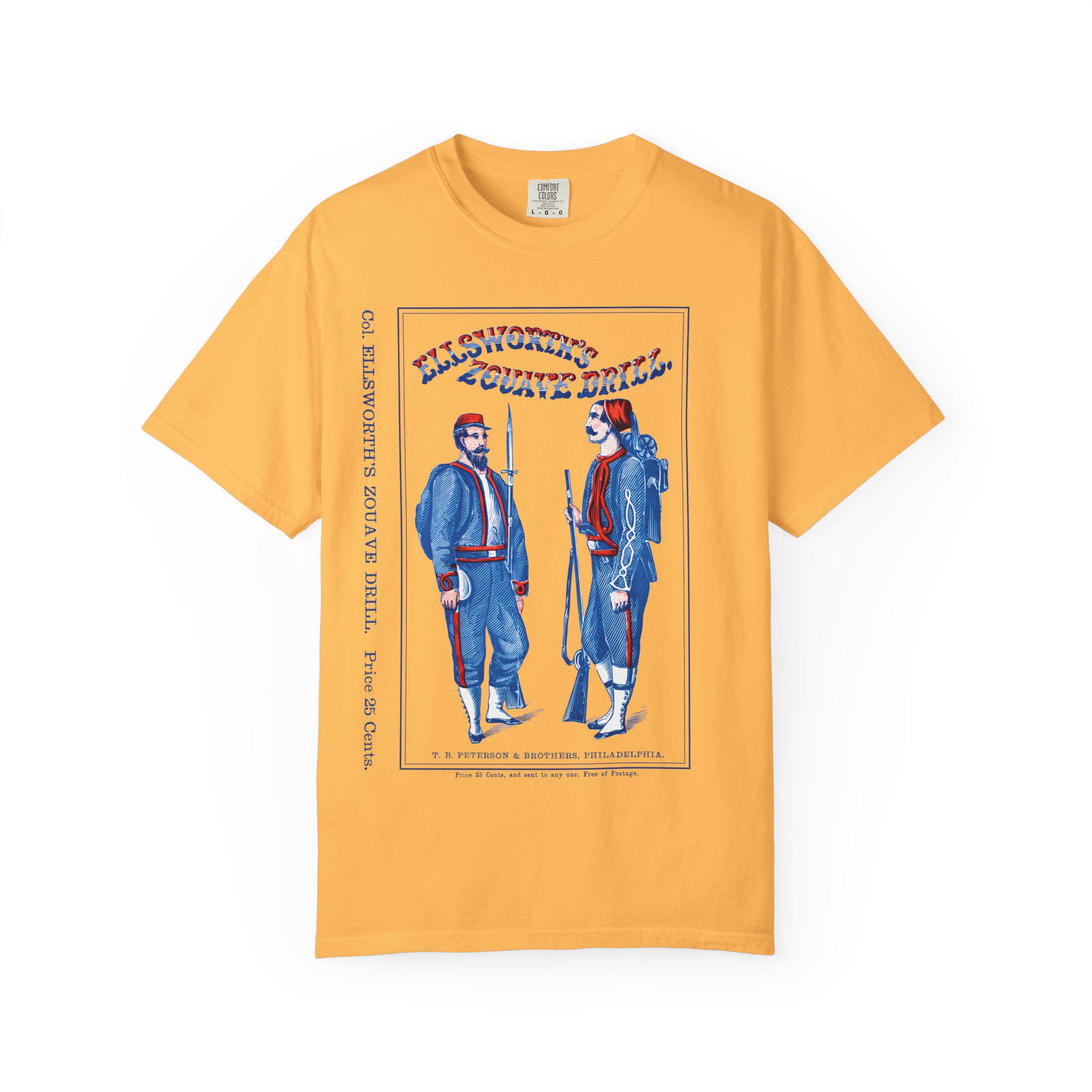Immerse yourself in the disciplined world of Civil War Zouaves with this unique t-shirt. It reproduces the striking cover of "Ellsworth's Zouave Drill," a manual that helped shape the distinctive look of these elite regiments. The design is a fantastic example of 19th-century cover art, with its bold, patriotic red, white, and blue typography and the stoic figures of two Zouave soldiers at attention. This shirt is not just a historical document; it's a piece of art that speaks to the precision and theatricality of Zouave units, perfect for any military history buff or lover of vintage design. Product features - Available in sizes S to 4XL for a perfect fit. Consult the Comfort Colors 1717 size chart. - Durable double-needle stitching on all seams ensures longevity. - Constructed without side seams, minimizing fabric waste and enhancing comfort. - Garment-dyed for a soft texture and rich color. - Made from 100% ring-spun US cotton, offering ultimate comfort.