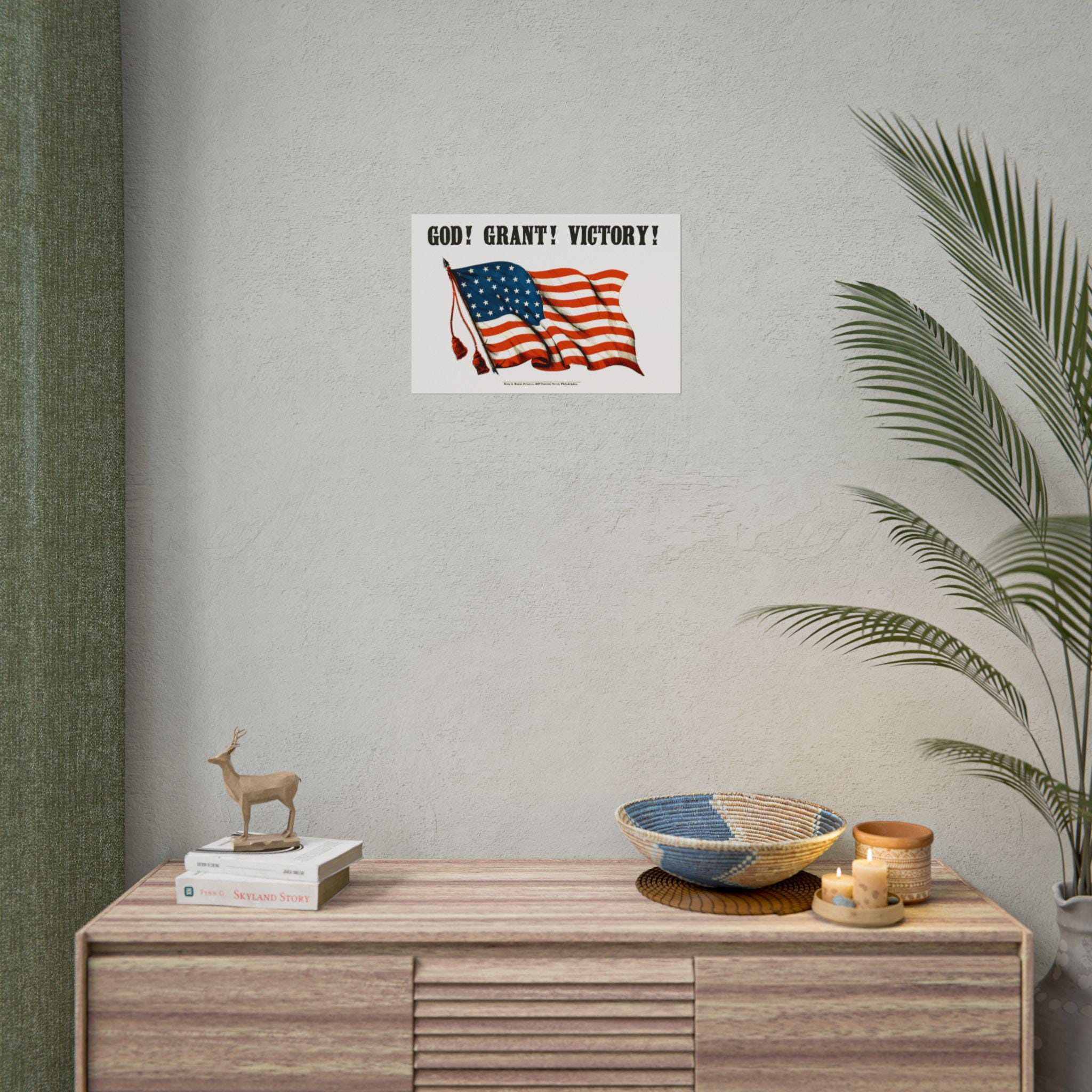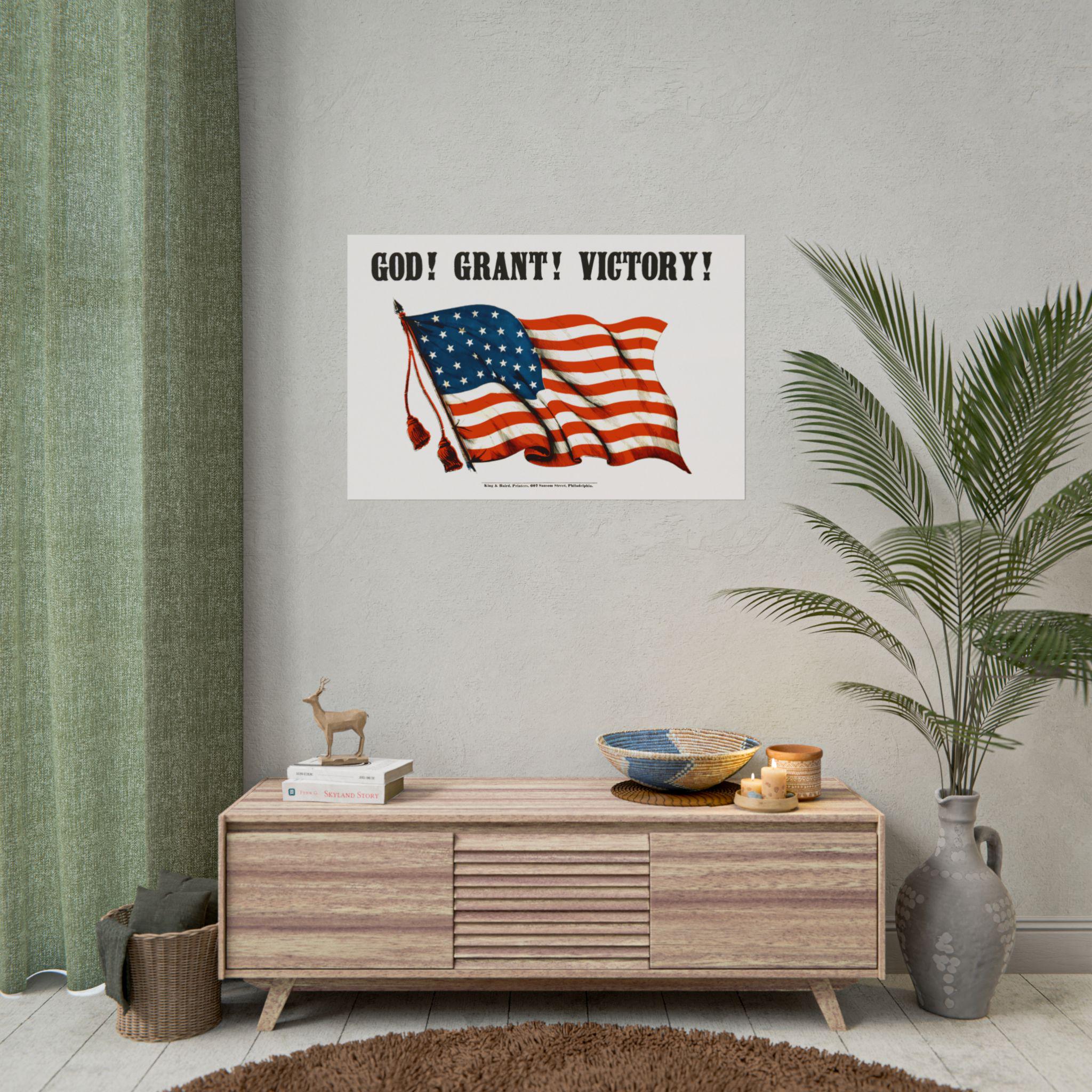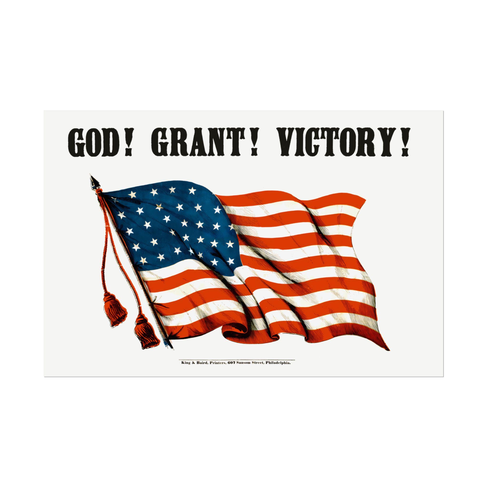 This high-quality poster features a digitally restored design from a rare Civil War print, originally published by the esteemed King & Baird of Philadelphia. The design is simple yet profound: a proud American flag waves beneath the bold, stylishly rendered text, "GOD! GRANT! VICTORY!"