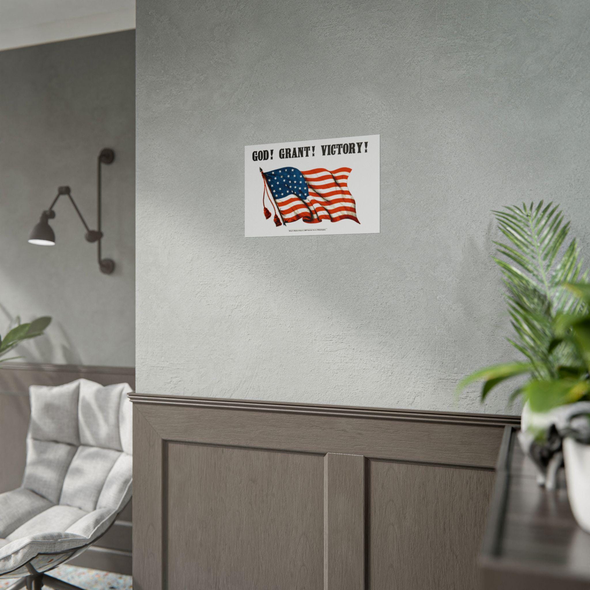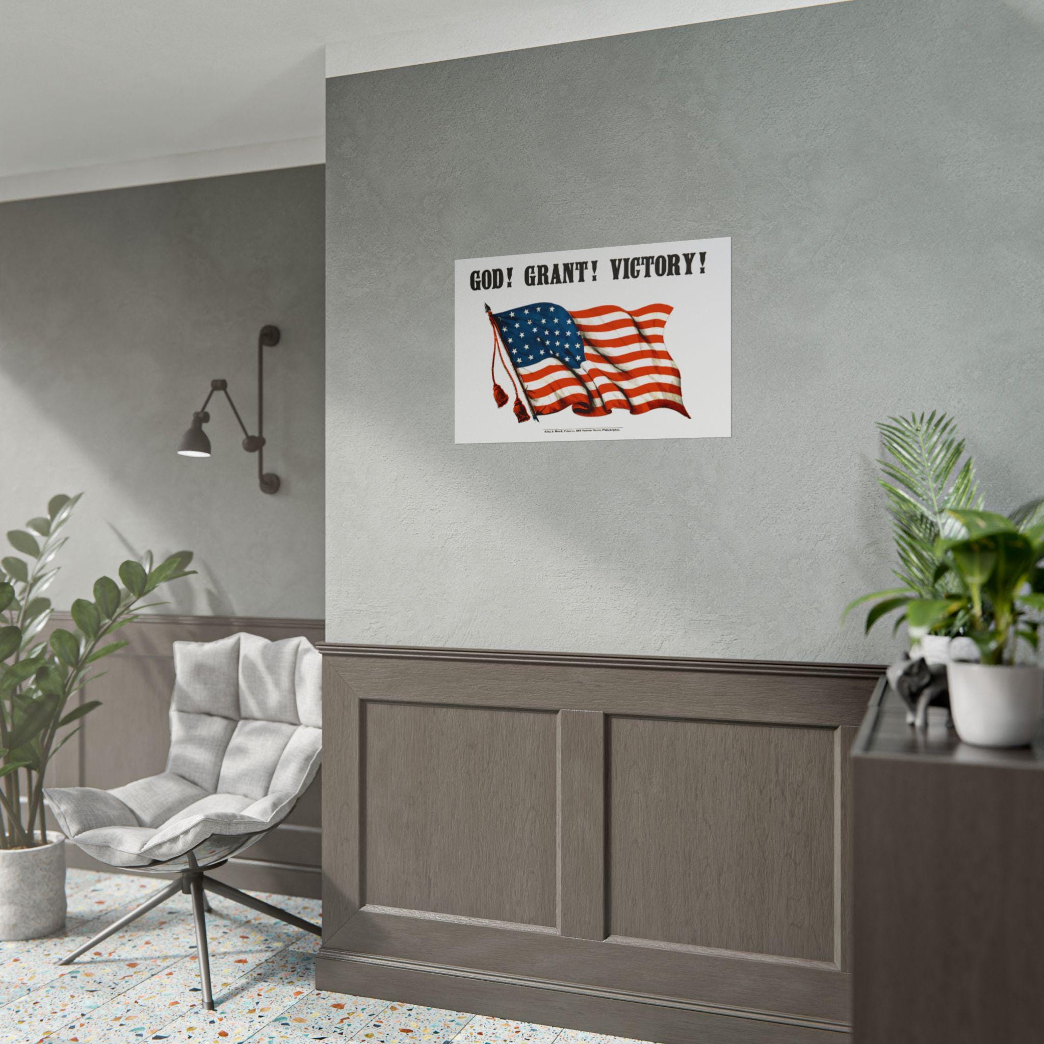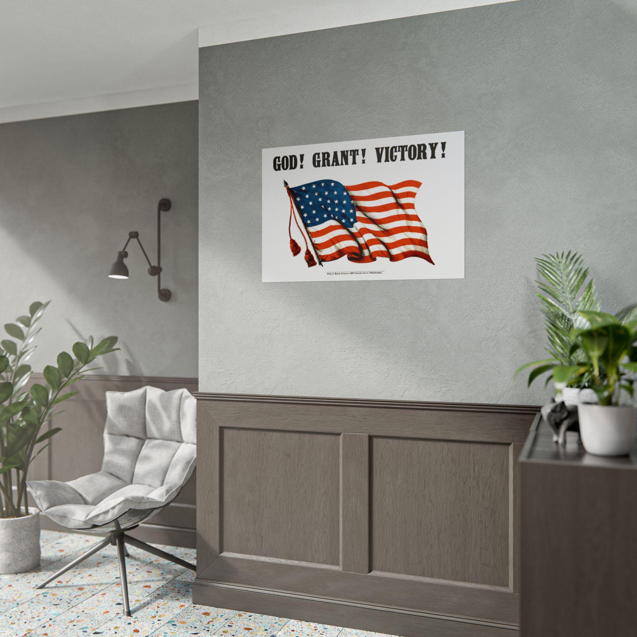 This high-quality poster features a digitally restored design from a rare Civil War print, originally published by the esteemed King & Baird of Philadelphia. The design is simple yet profound: a proud American flag waves beneath the bold, stylishly rendered text, "GOD! GRANT! VICTORY!"