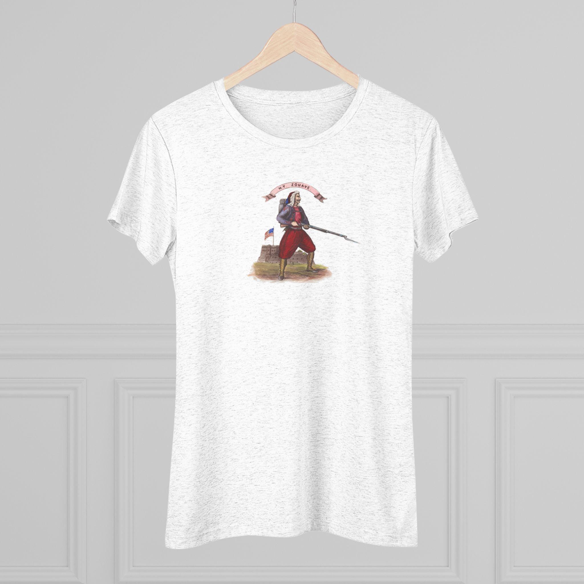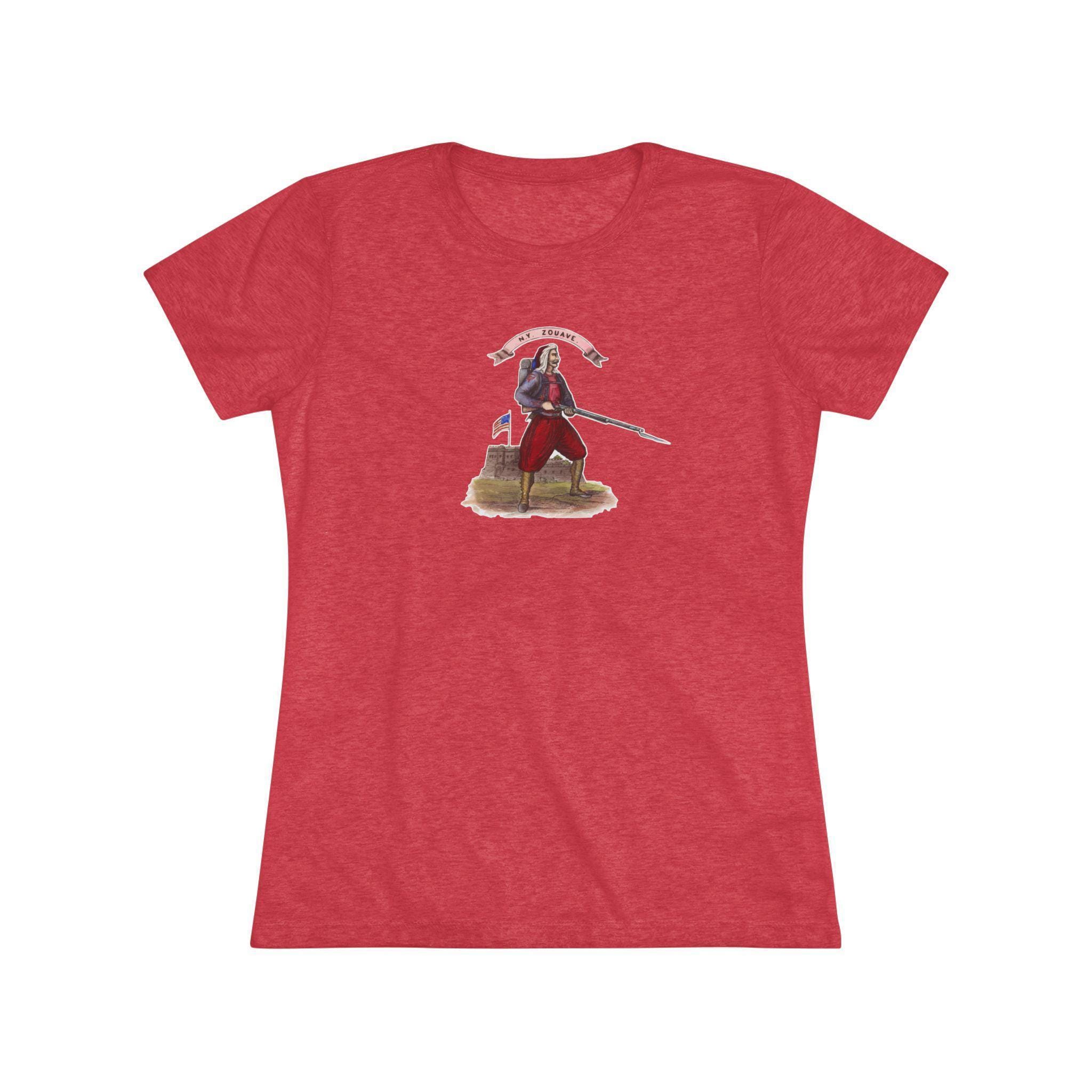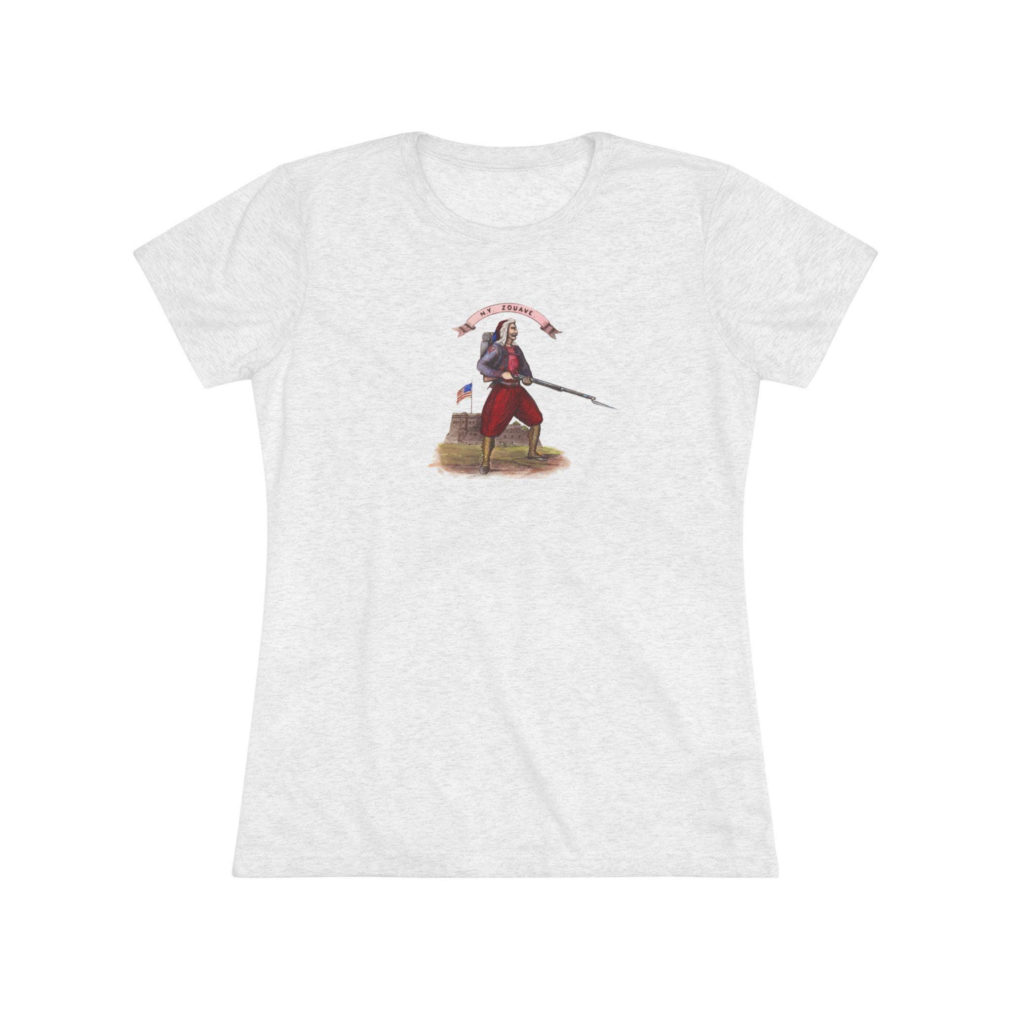 This women's t-shirt combines a unique piece of American history with a comfortable and stylish fit. The design is a restored envelope stamp from the Civil War era that was originally hand-painted, giving it a beautiful folk-art quality. It depicts a proud "N.Y. ZOUAVE," one of the Union's most famously uniformed soldiers, ready to defend the nation. This soft, contoured tee is a perfect way to wear a piece of profound history that celebrates both military service and 19th-century artistry.