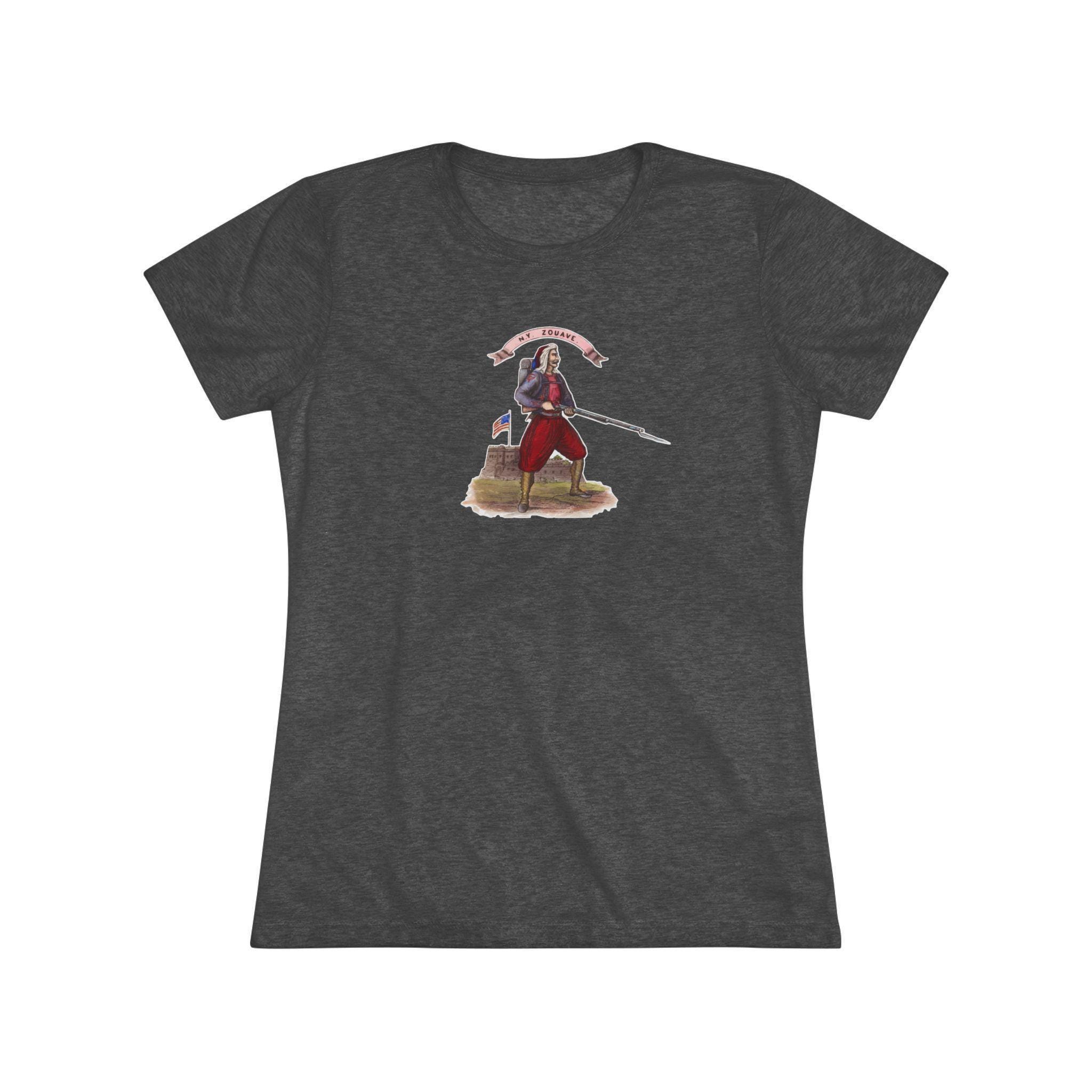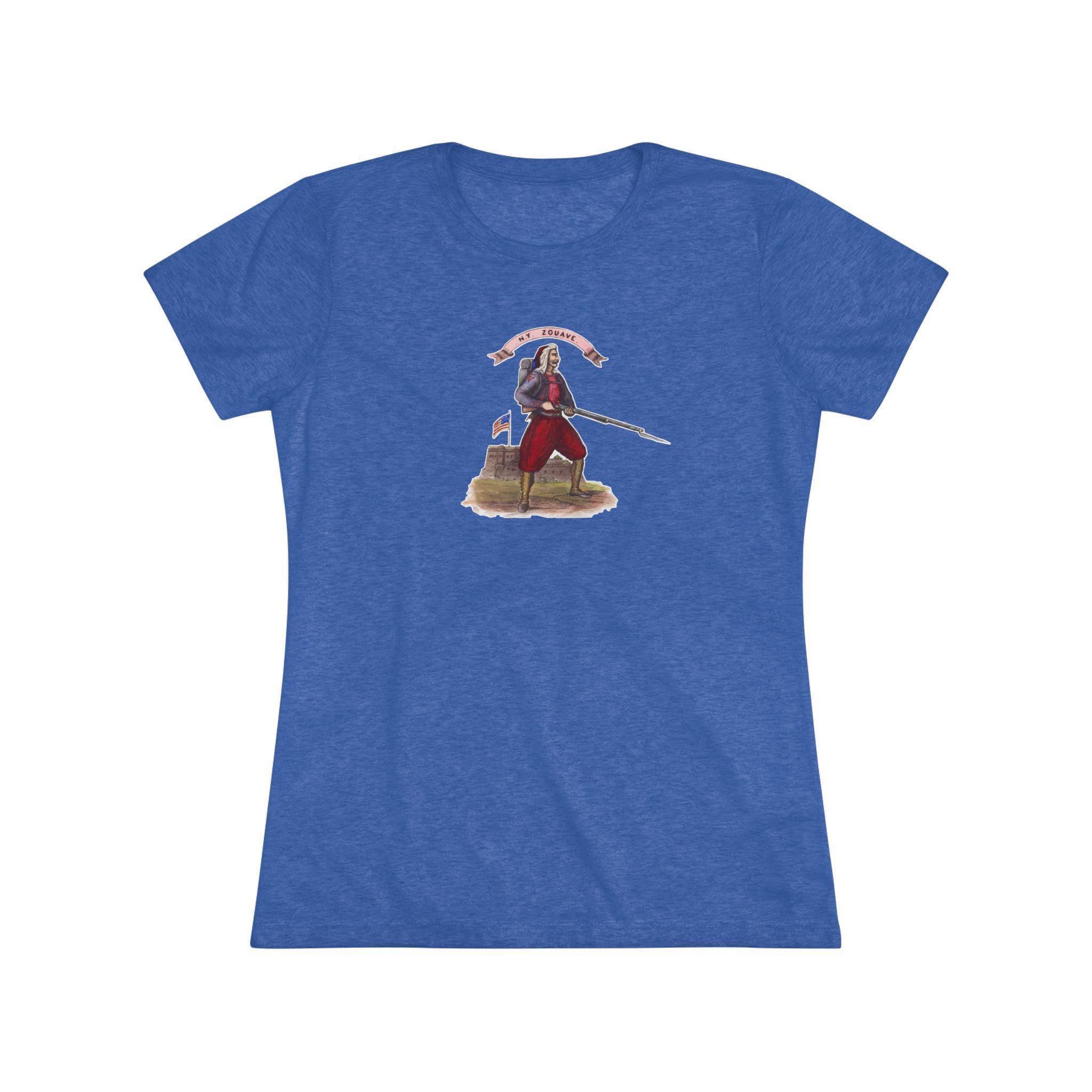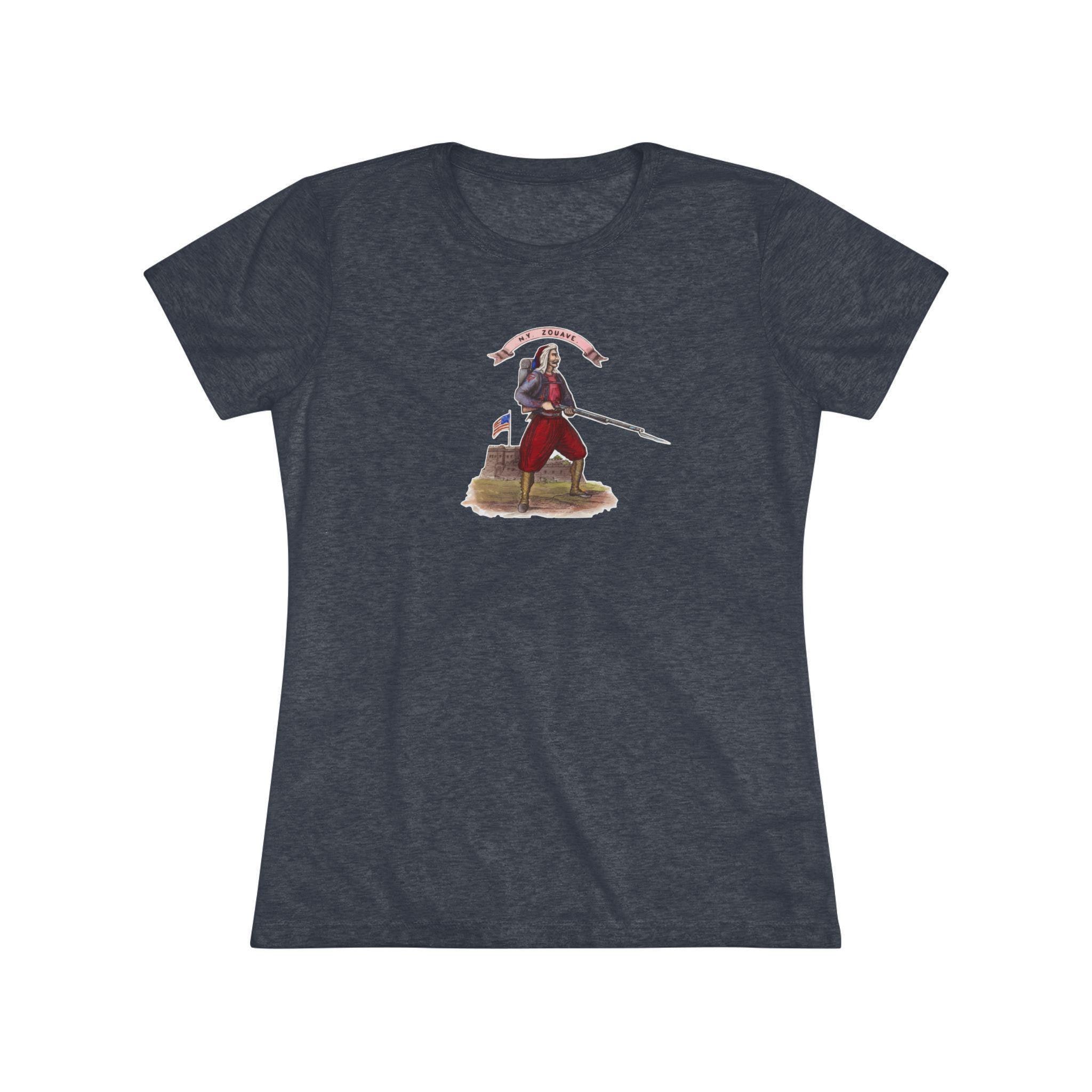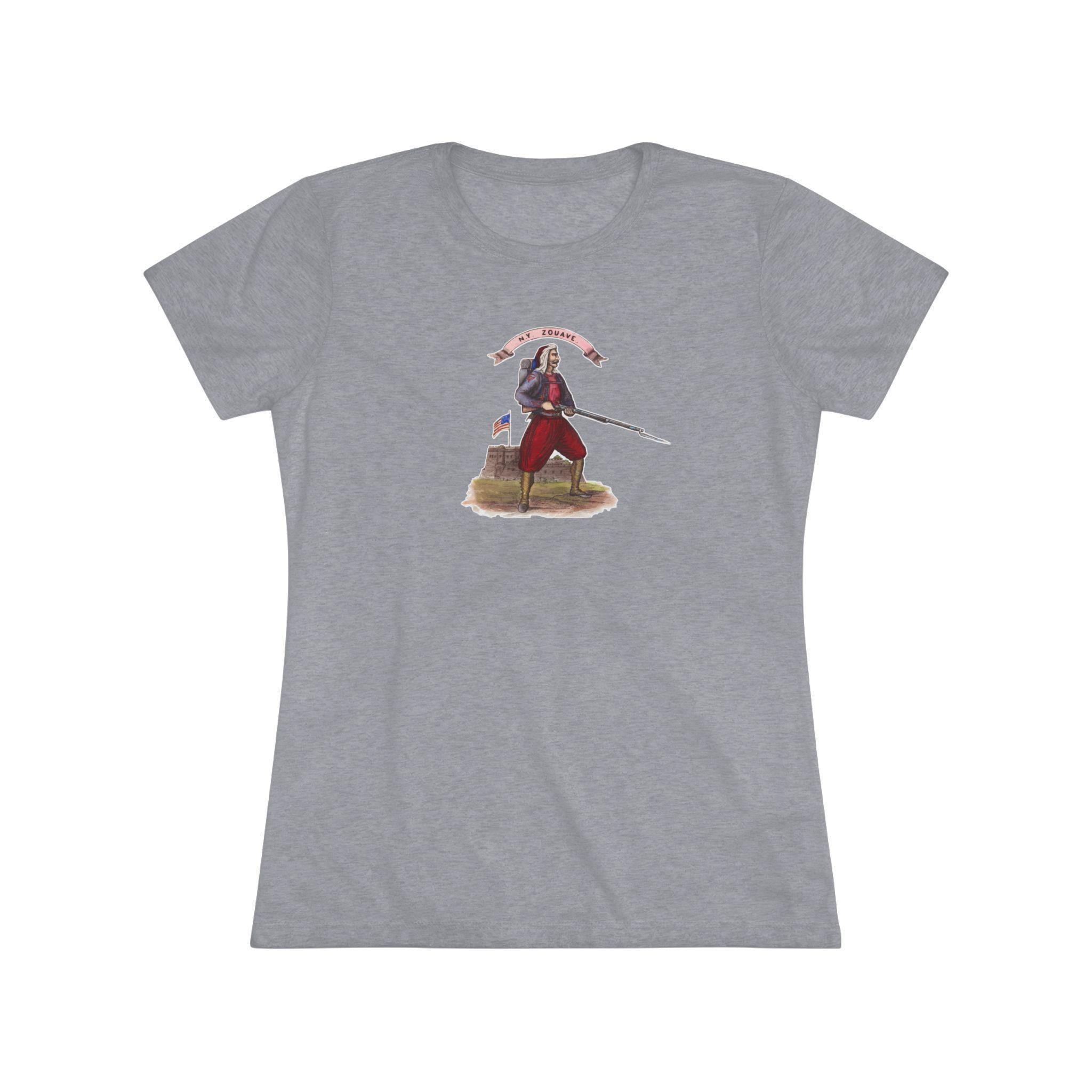 This women's t-shirt combines a unique piece of American history with a comfortable and stylish fit. The design is a restored envelope stamp from the Civil War era that was originally hand-painted, giving it a beautiful folk-art quality. It depicts a proud "N.Y. ZOUAVE," one of the Union's most famously uniformed soldiers, ready to defend the nation. This soft, contoured tee is a perfect way to wear a piece of profound history that celebrates both military service and 19th-century artistry.