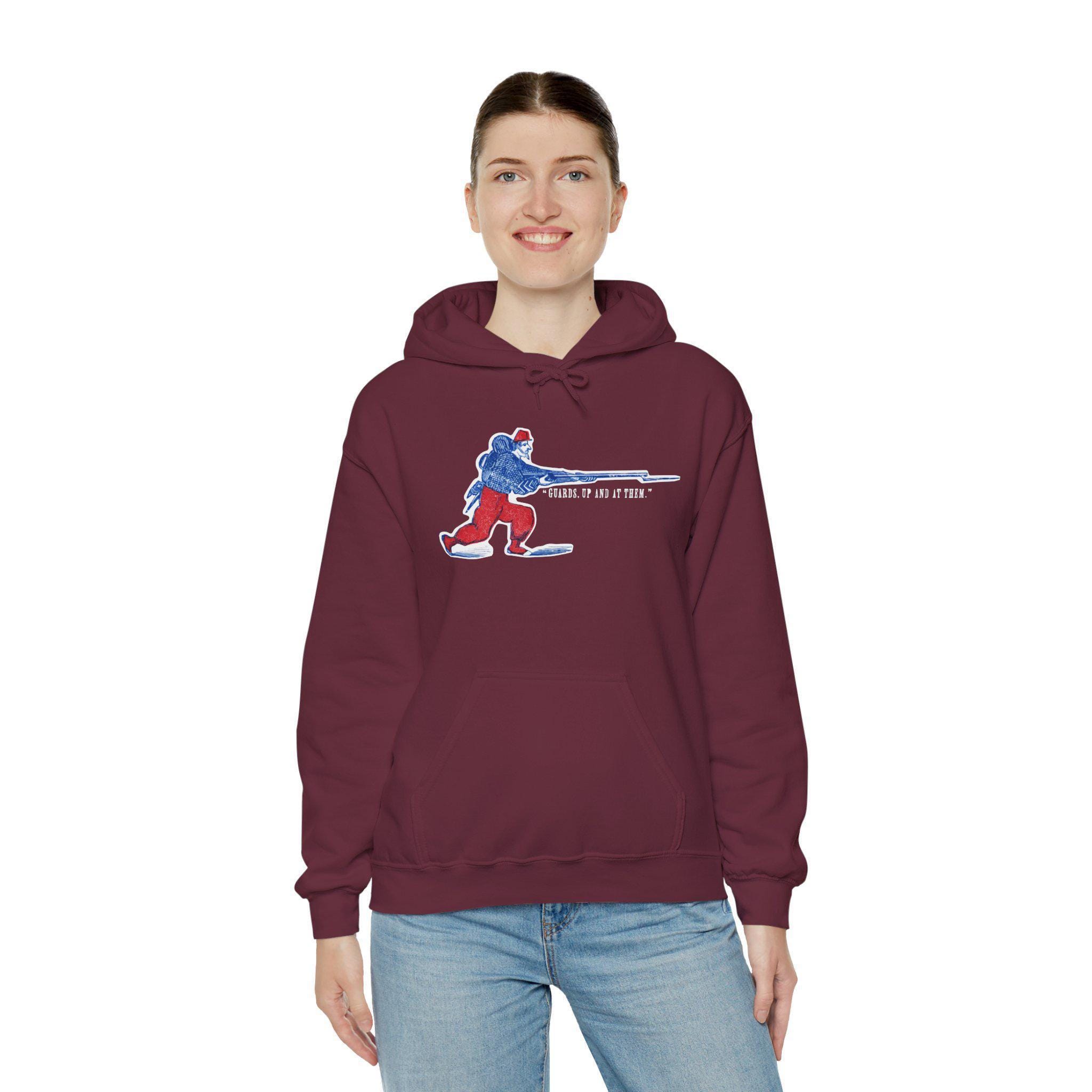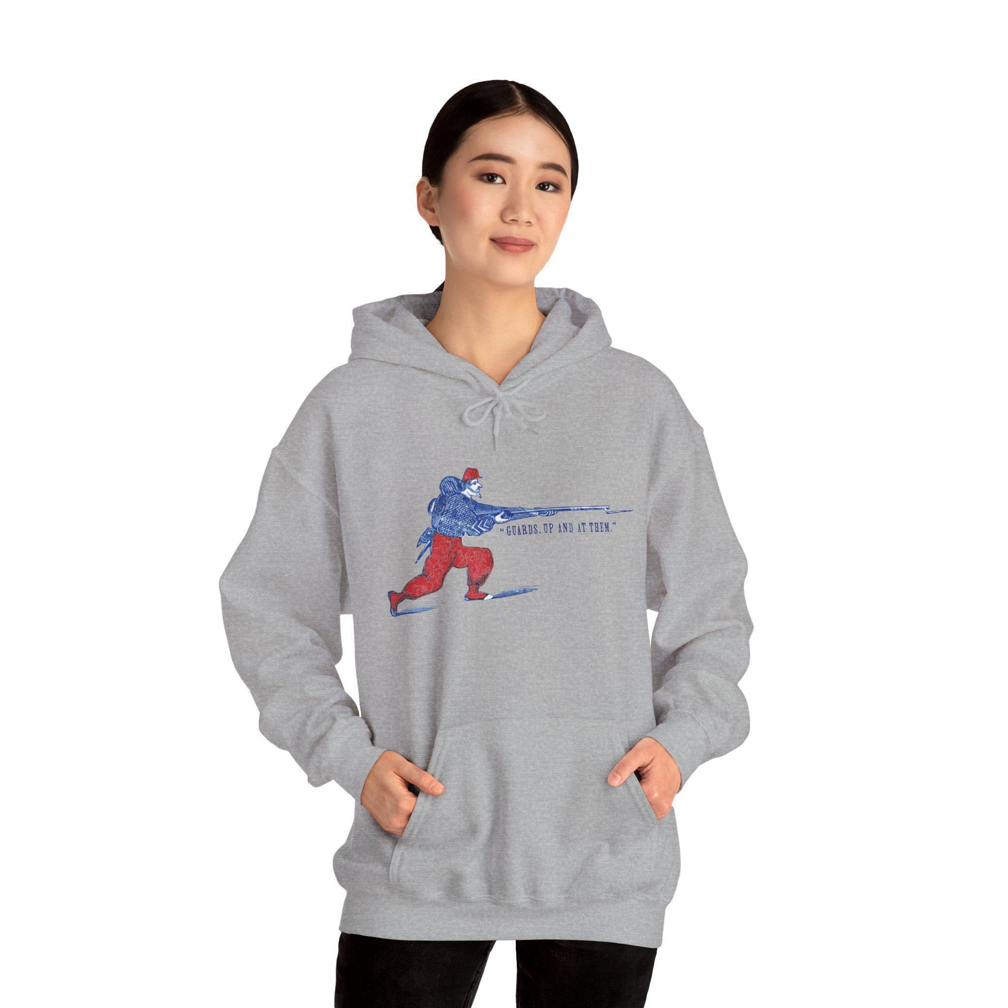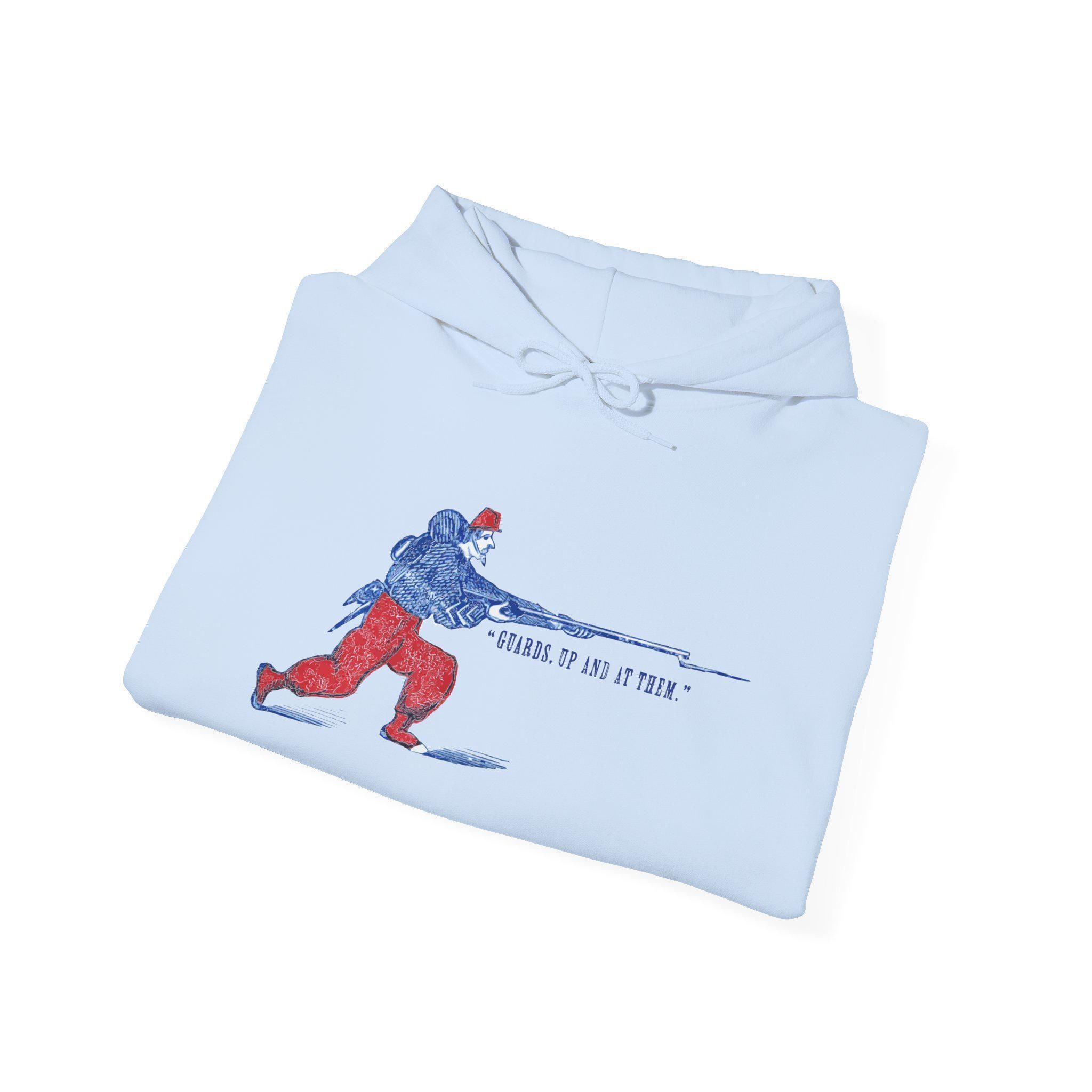 This comfortable and warm hoodie features a dynamic and colorful piece of military history. The design, restored from a Civil War-era envelope stamp, celebrates the famed fighting spirit of the Zouaves. The illustration depicts a stylized Union Zouave in his iconic red and blue uniform, charging with a fixed bayonet under the classic battle cry "GUARDS, UP AND AT THEM!" With a soft fleece interior and a spacious front pocket, this is a perfect piece of wearable history for any military enthusiast.