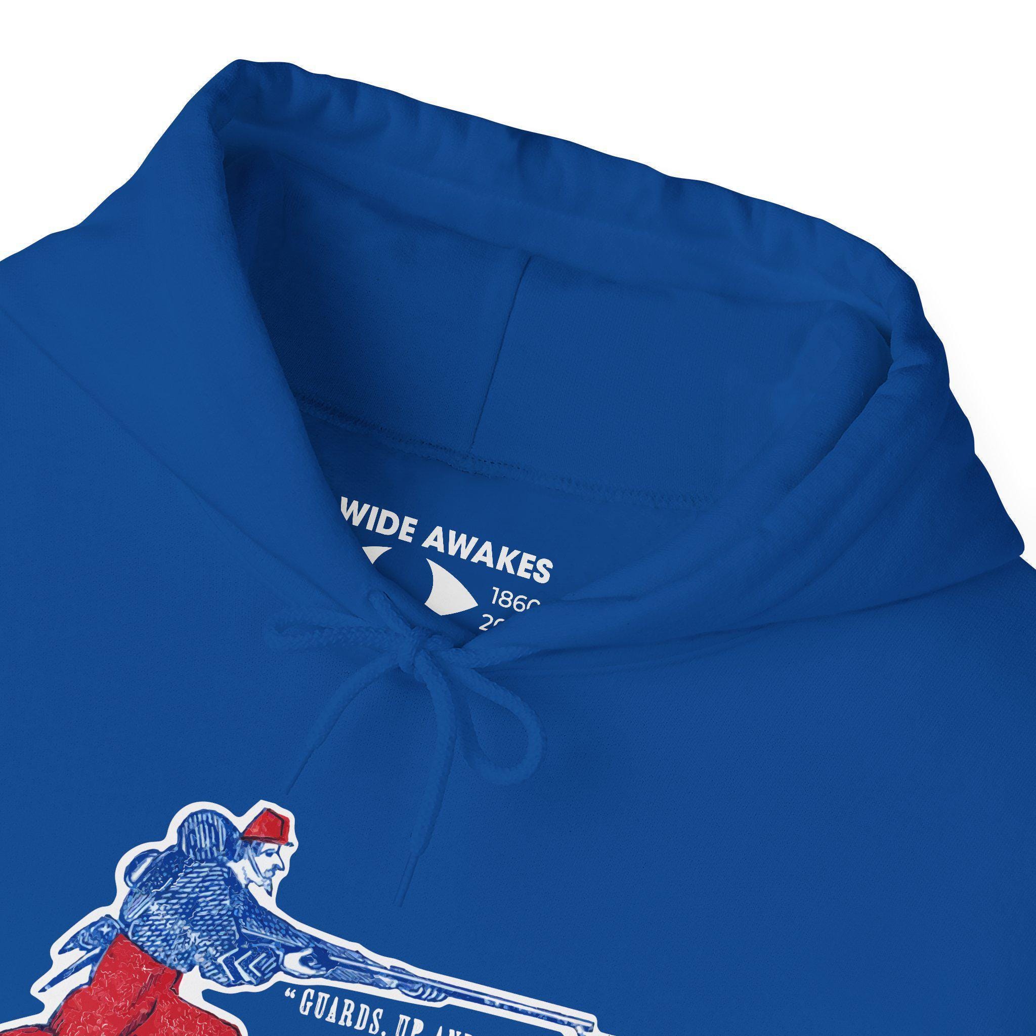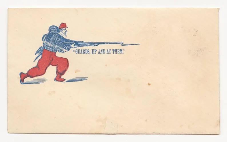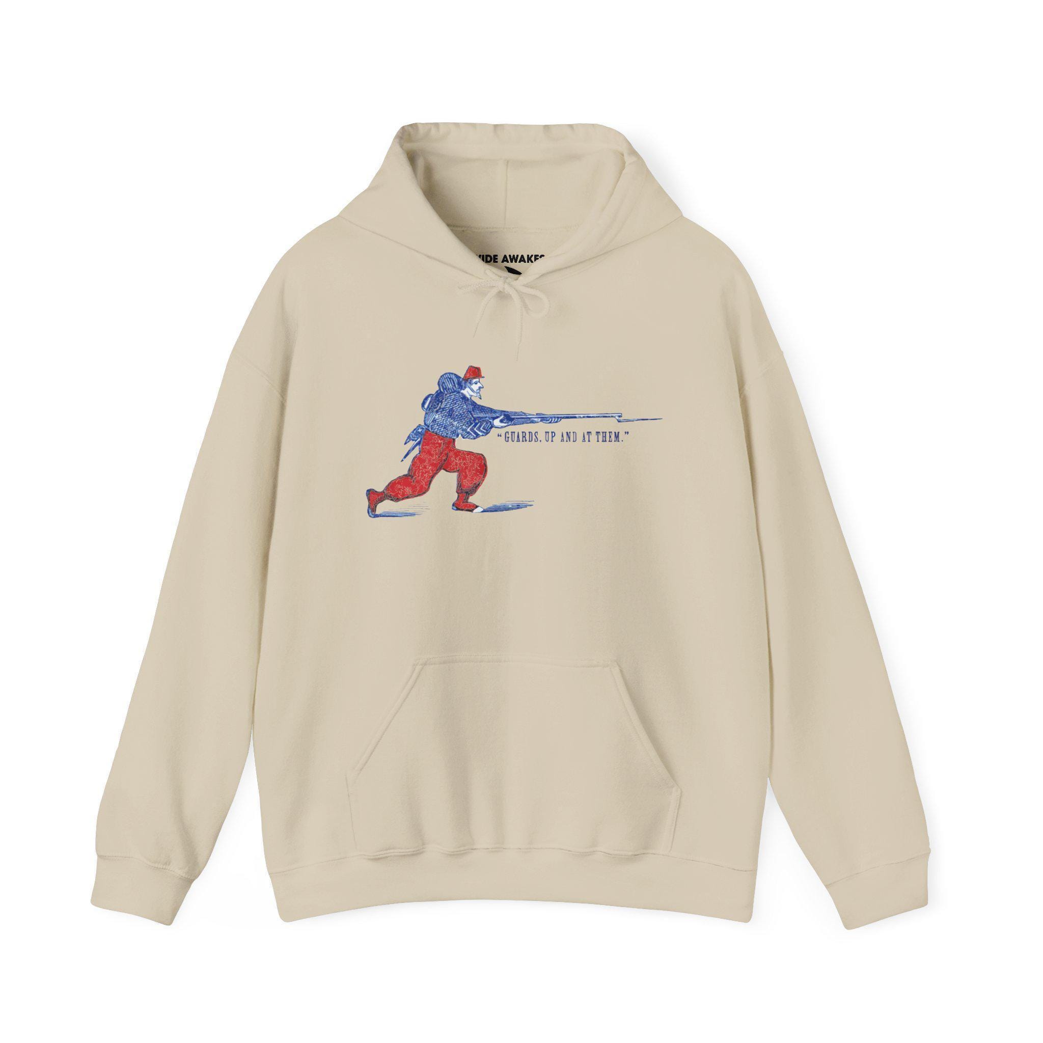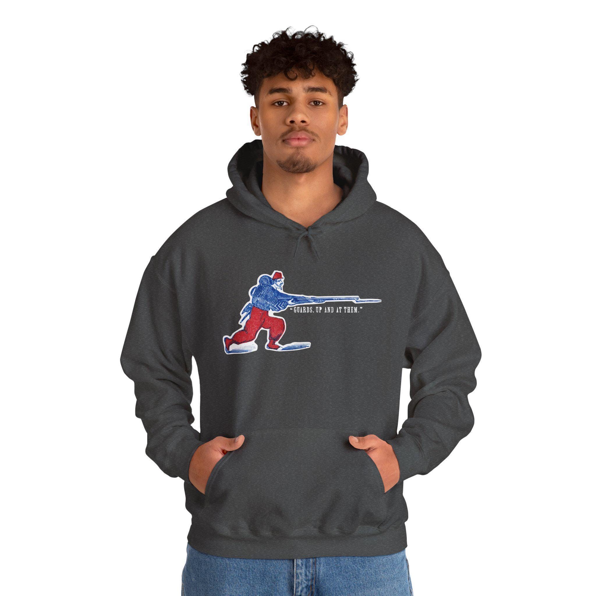 This comfortable and warm hoodie features a dynamic and colorful piece of military history. The design, restored from a Civil War-era envelope stamp, celebrates the famed fighting spirit of the Zouaves. The illustration depicts a stylized Union Zouave in his iconic red and blue uniform, charging with a fixed bayonet under the classic battle cry "GUARDS, UP AND AT THEM!" With a soft fleece interior and a spacious front pocket, this is a perfect piece of wearable history for any military enthusiast.
