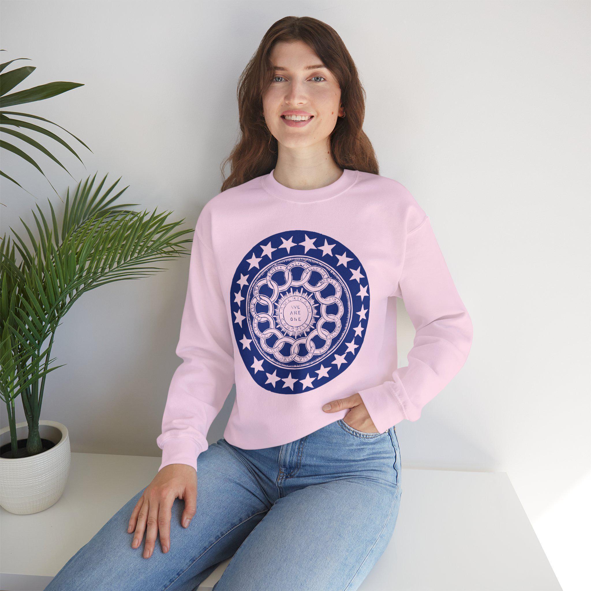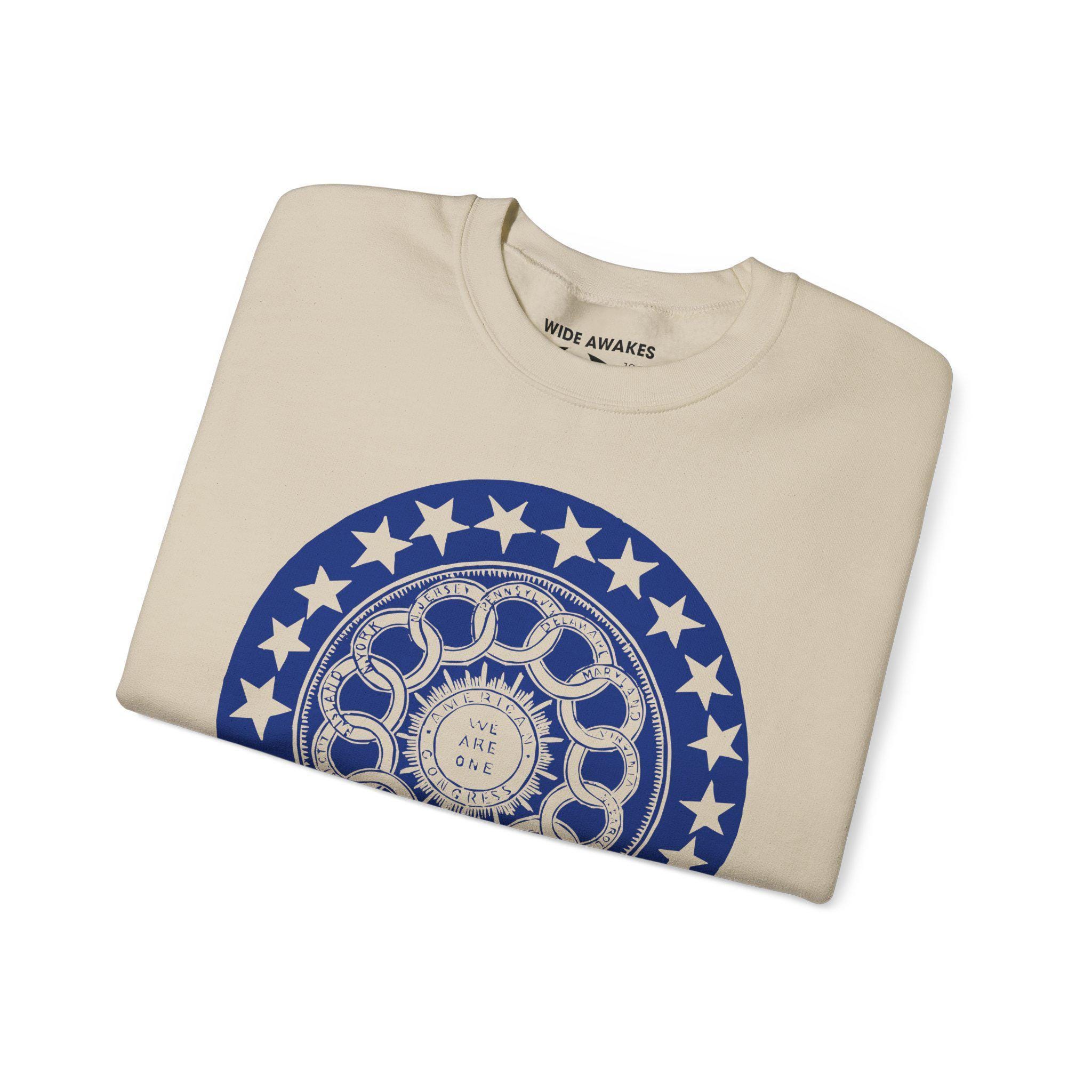 Stay warm this fall with a cozy crewneck sweatshirt that is also a fascinating piece of political philosophy. The design, restored from a complex 19th-century pro-Union stamp, is a visual argument for American federalism. It depicts the states as interlocked rings, all revolving around a central "American Congress," with the powerful motto "We Are One." It's a beautiful and historically rich design that served as a reminder of the nation's founding principles during its moment of greatest crisis.