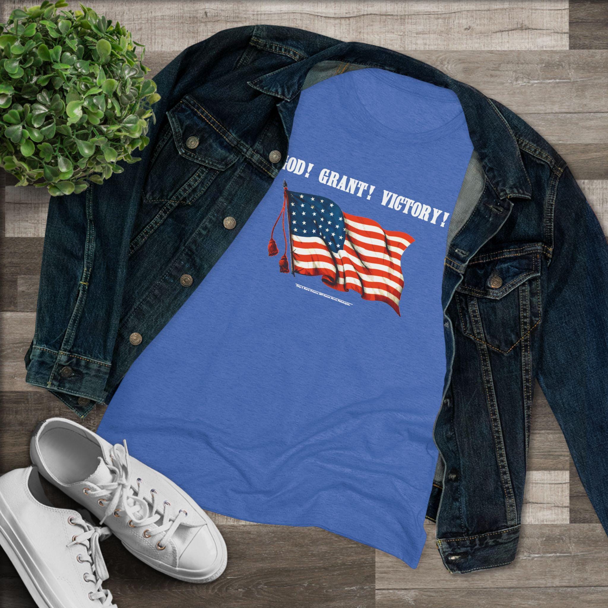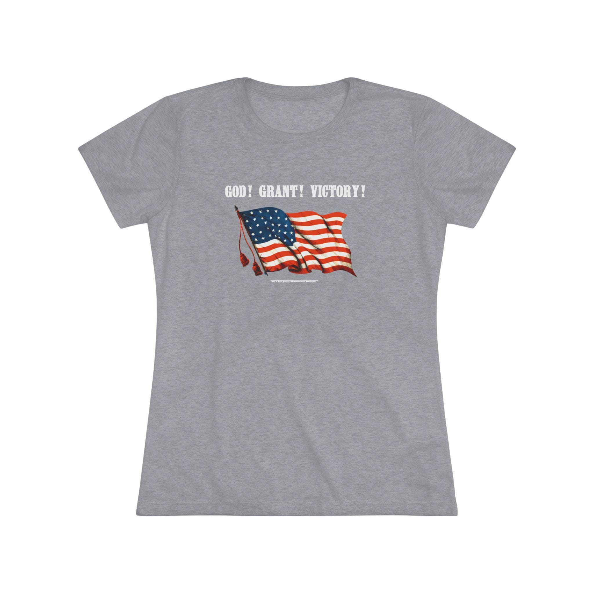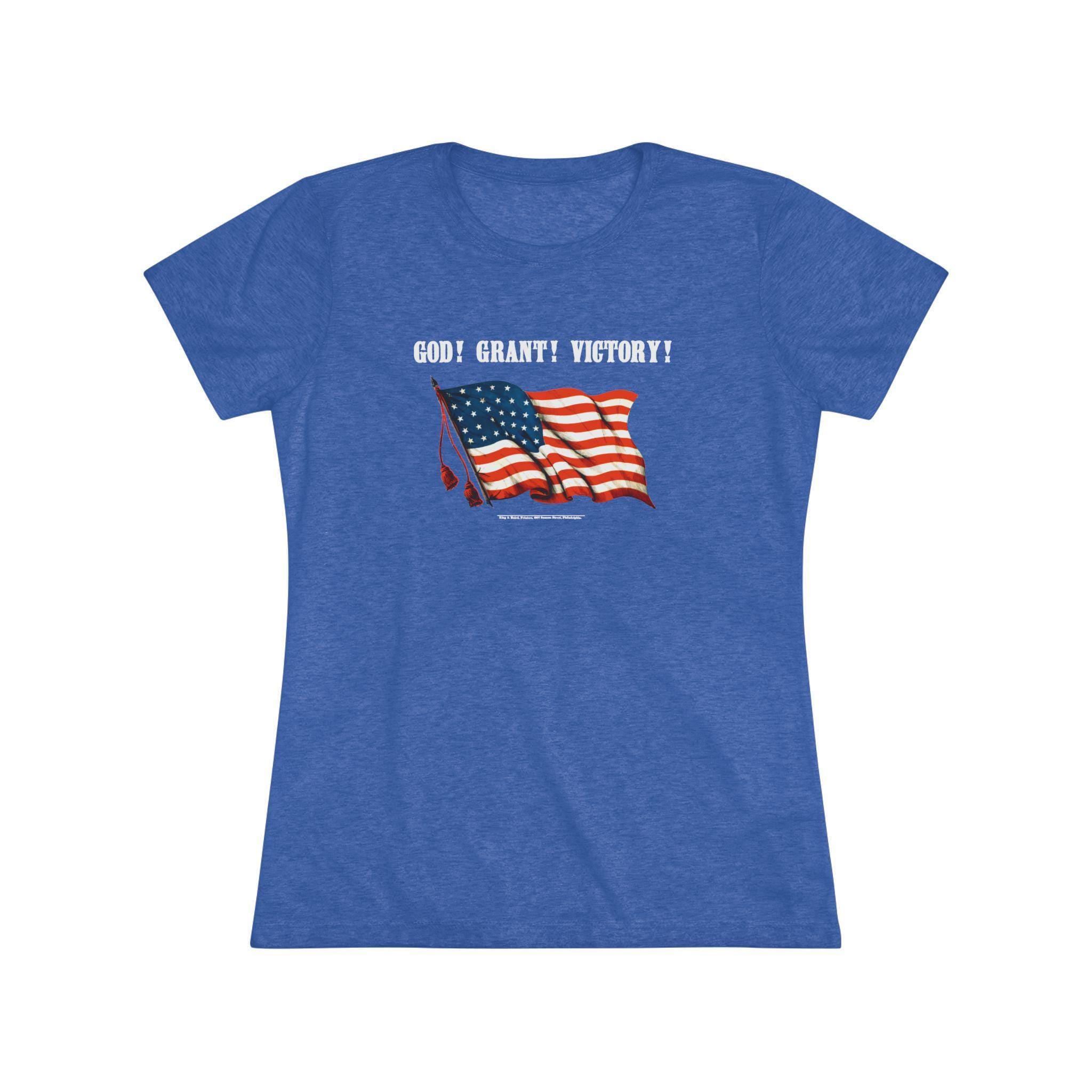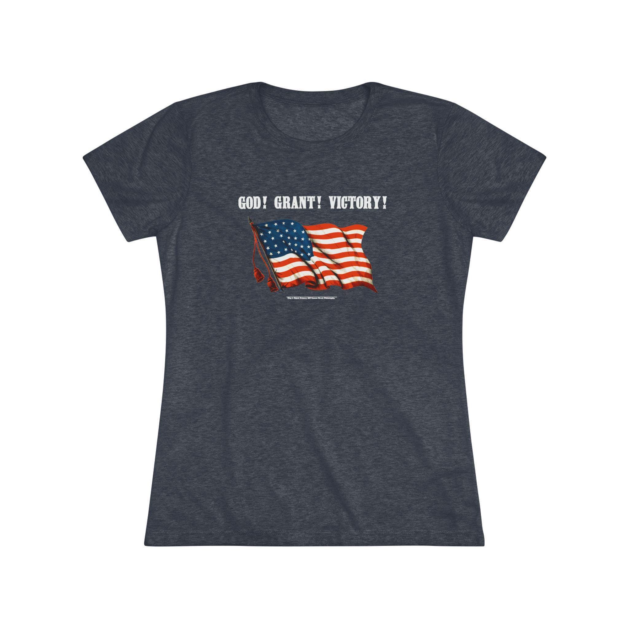 This women's t-shirt combines a sharp, witty piece of American history with a comfortable and stylish fit. The design is a restored Civil War poster featuring the brilliant double entendre, "GOD! GRANT! VICTORY!"—a phrase that served as both a patriotic prayer and a clever nod to General Ulysses S. Grant. This soft, contoured tee is a perfect way to wear a unique and intelligent piece of historical propaganda.