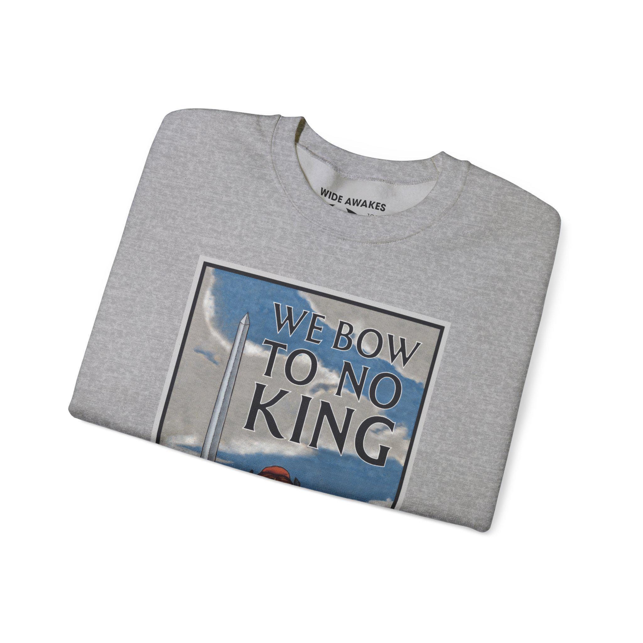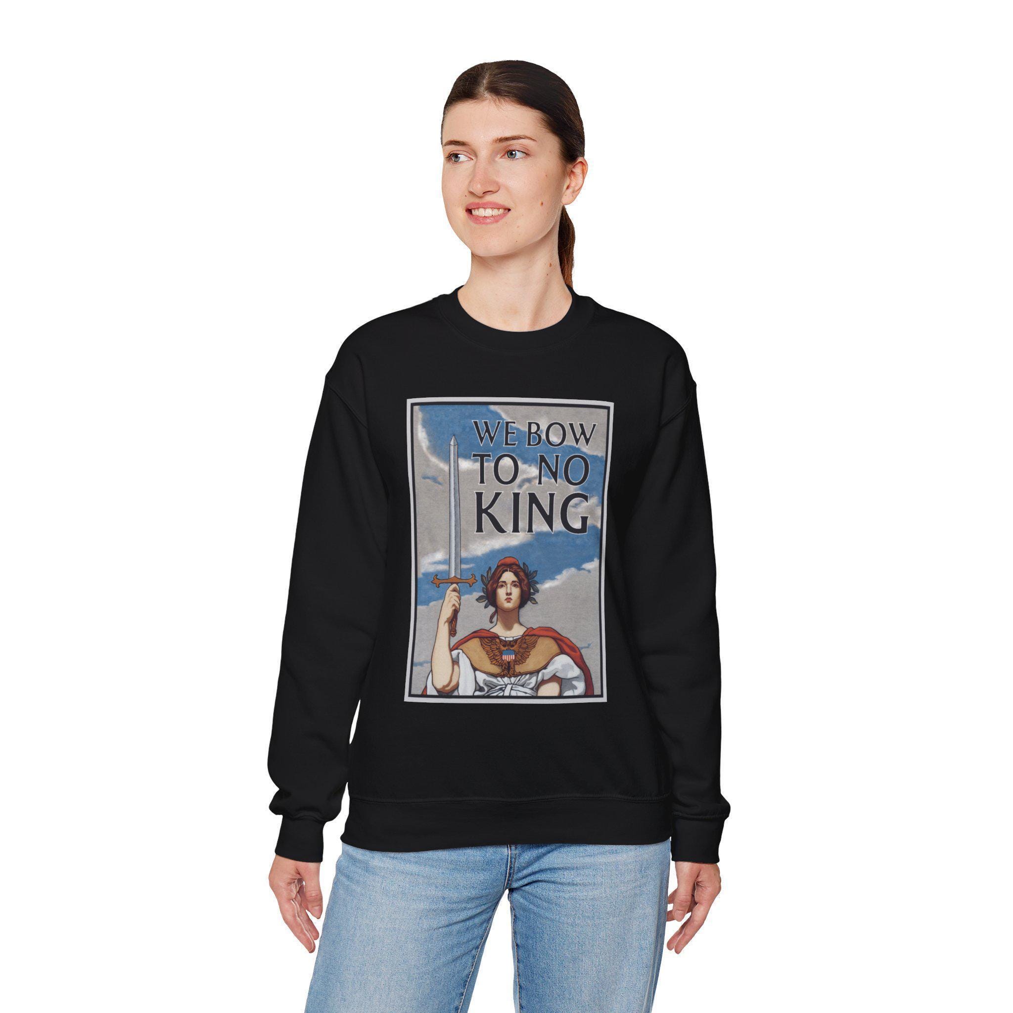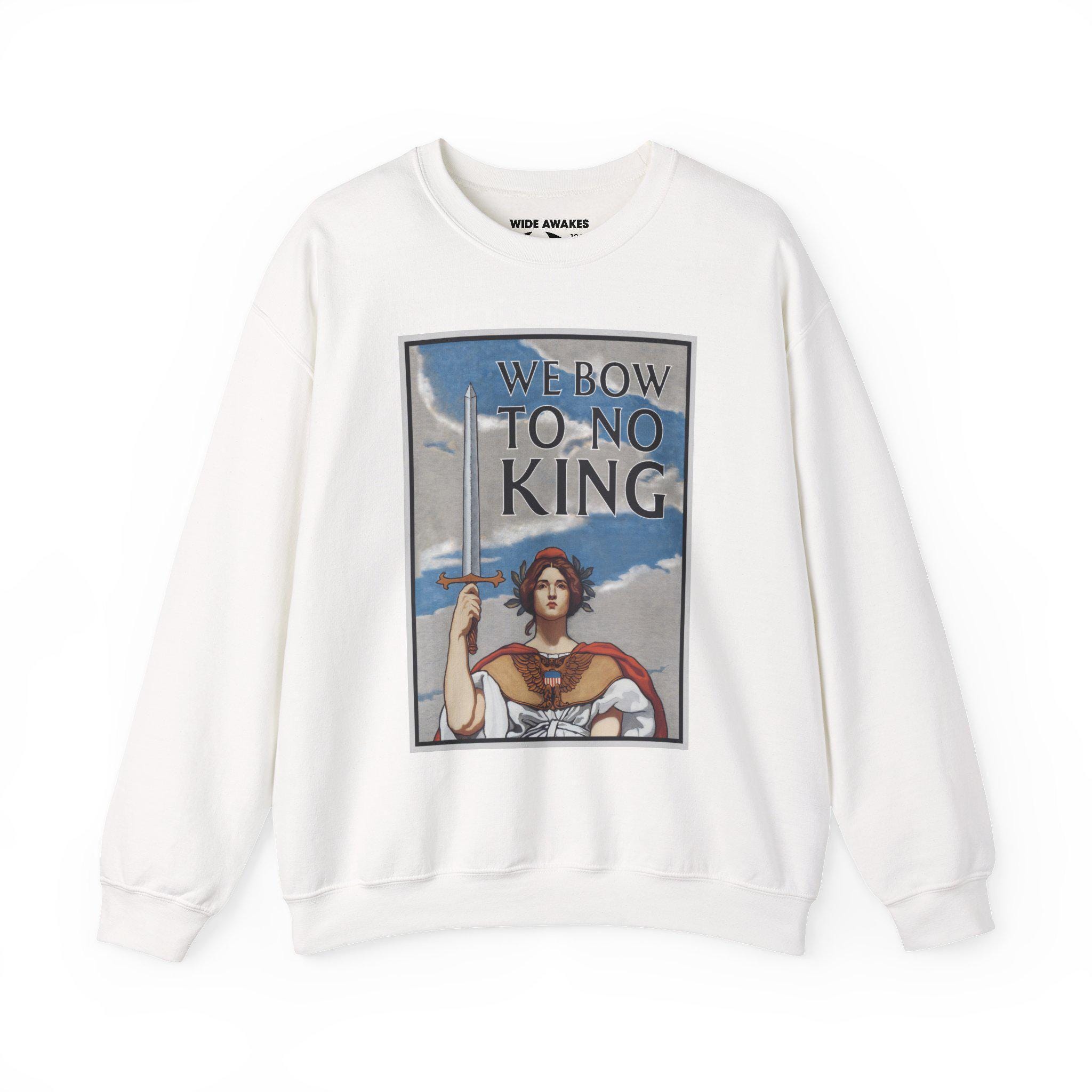 In the space above her head, we've added the foundational promise of the American republic in a classic Winsel font: "WE BOW TO NO KING." This addition explicitly connects the historical image of a defiant America to the modern "No Kings" protests against the Trump regime. It's a statement that the spirit of Columbia—the very spirit of America—will not bend to any tyrant.