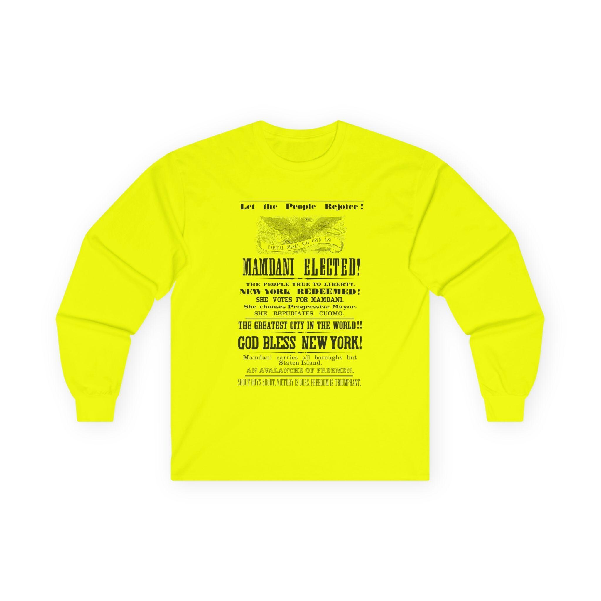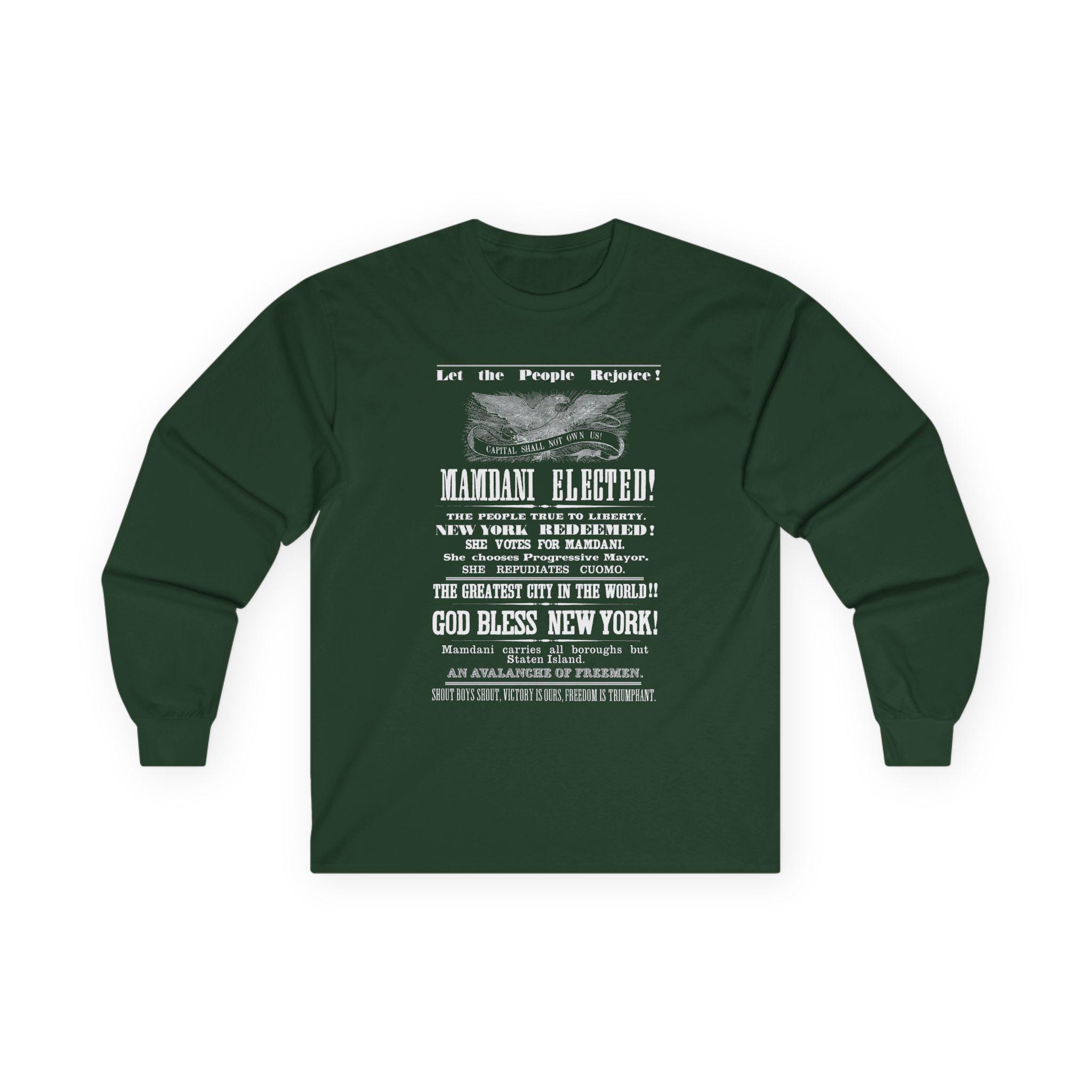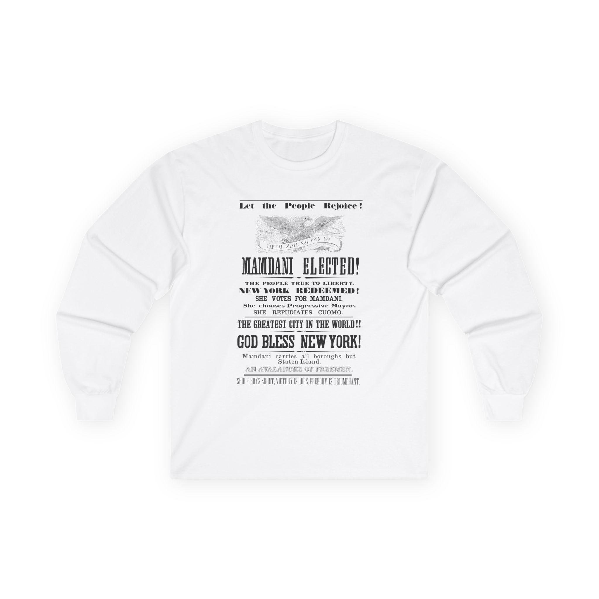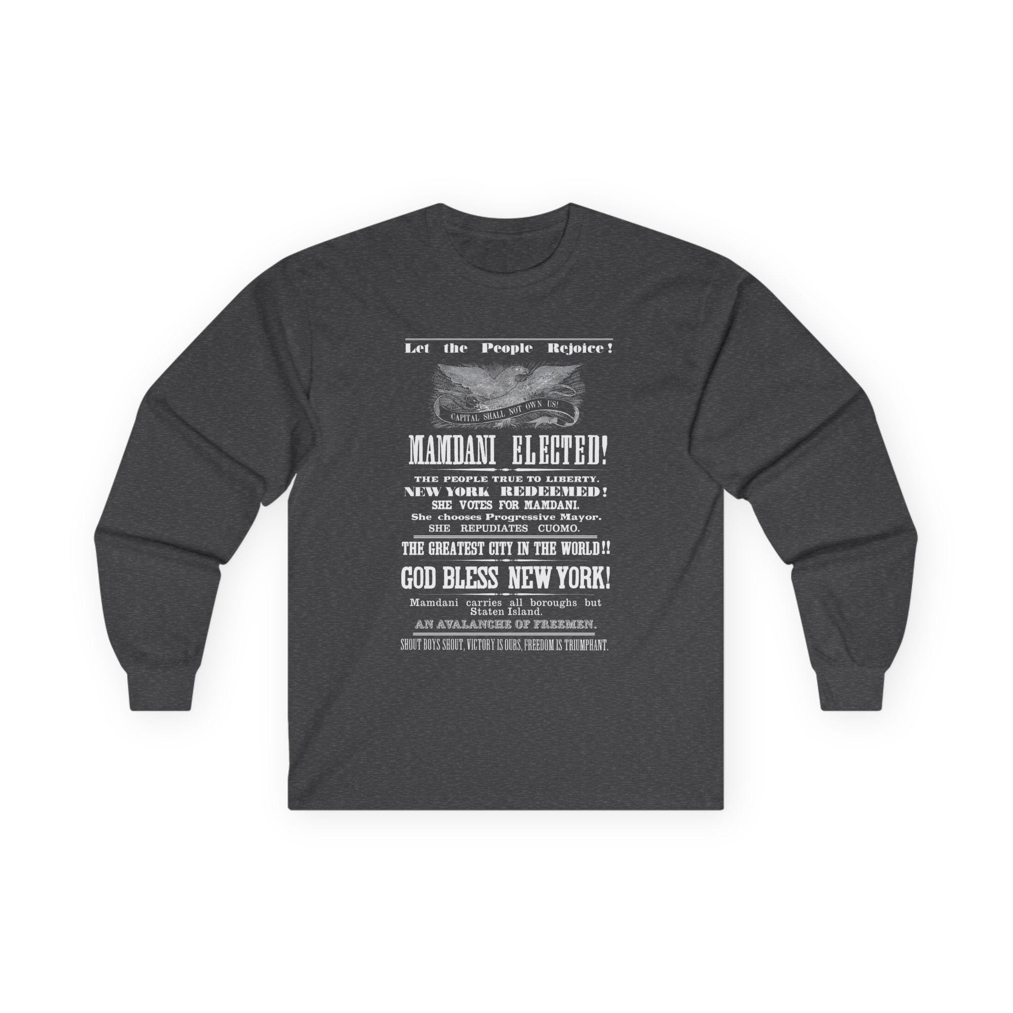 This hoodie is a triumphant and anachronistic celebration of Zohran Mamdani's historic victory in the 2025 New York City Democratic primary for mayor. The design is a direct tribute to a full-page victory announcement from the November 17, 1860 edition of The Freeport Wide-Awake that celebrated Abraham Lincoln's election. We've taken that historic template—from the classic "Capital Shall Not Own Us!" eagle to the exuberant, stacked slogans—and updated it for today's progressive triumph. The text joyfully proclaims "MAMDANI ELECTED!," "NEW YORK REDEEMED!," and "SHE REPUDIATES CUOMO." It is a jubilant, unapologetic celebration of a hard-won victory for the people of New York.