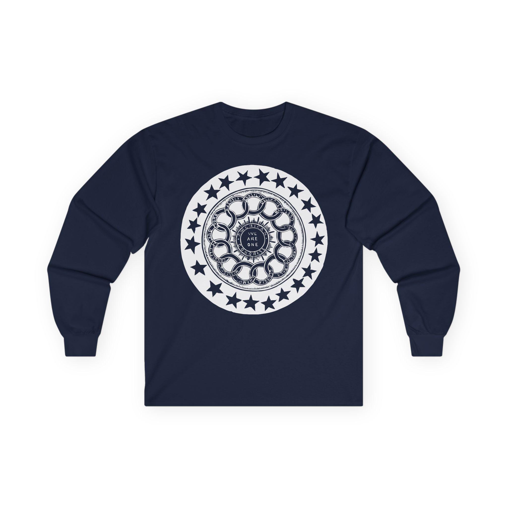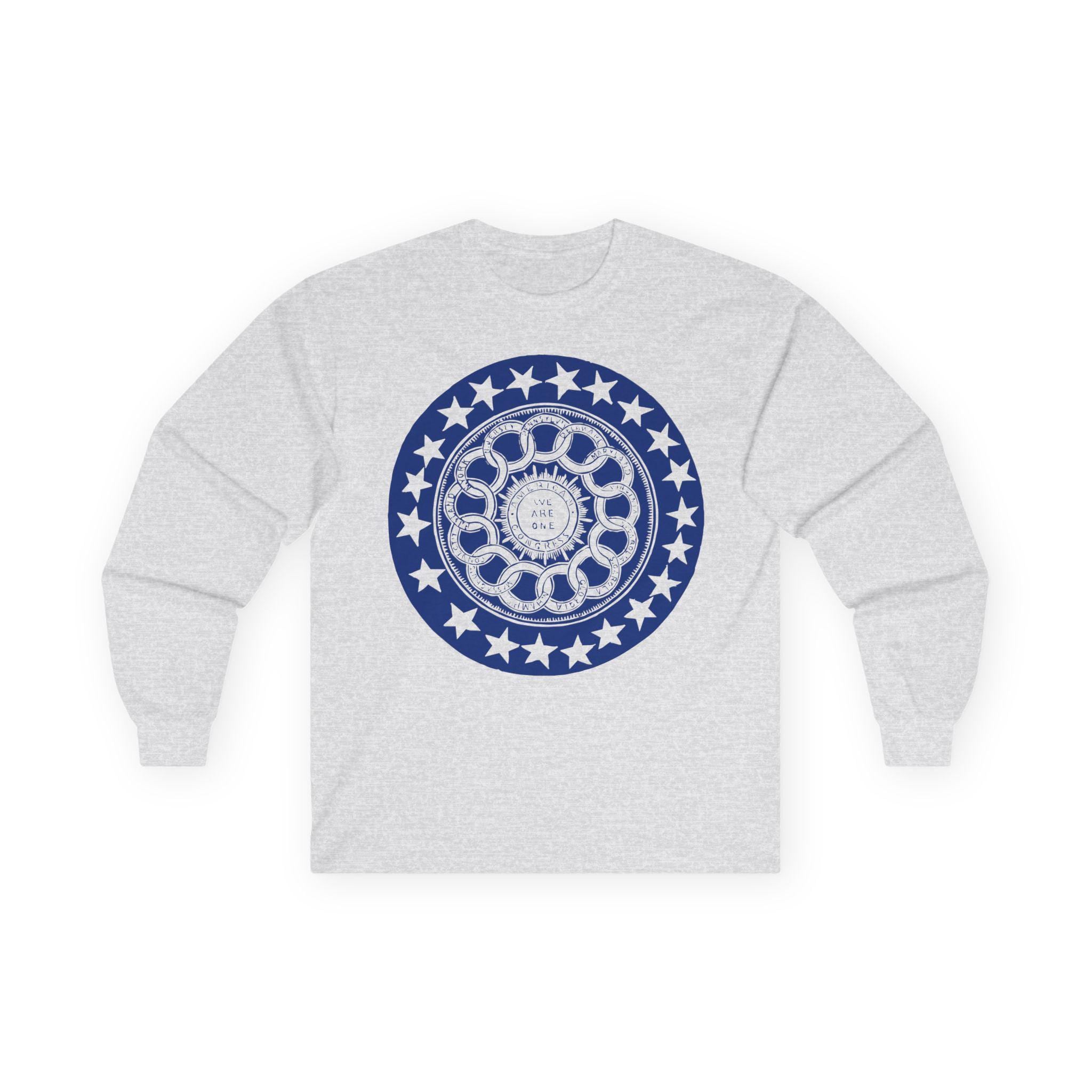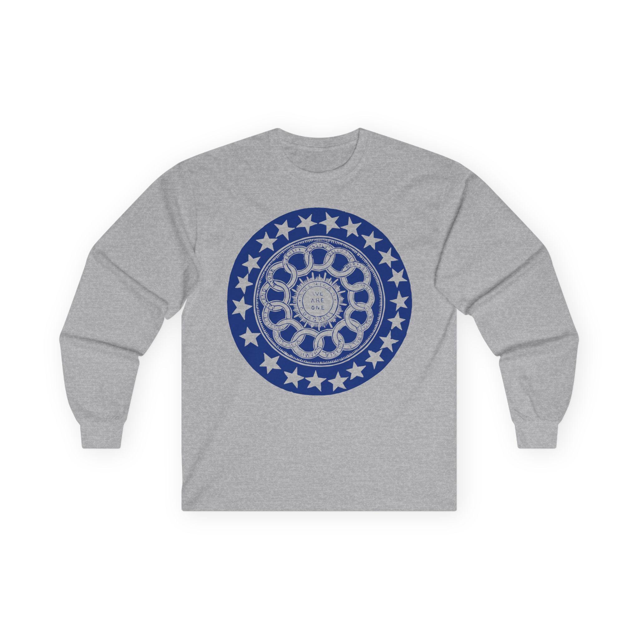 This comfortable longsleeve tee is the perfect layer for fall and a fantastic conversation starter. The design is a restored and unusually complex pro-Union stamp from the 1860s. It's a brilliant visual allegory for American federalism, showing the states interlocked in a circle around the central "American Congress," with the motto "We Are One." It’s a stylish and intelligent piece of apparel that speaks to the core principles of the nation's structure.