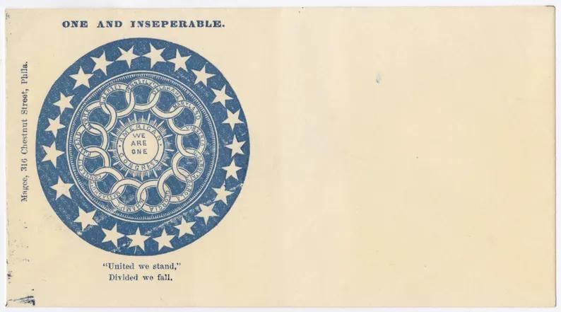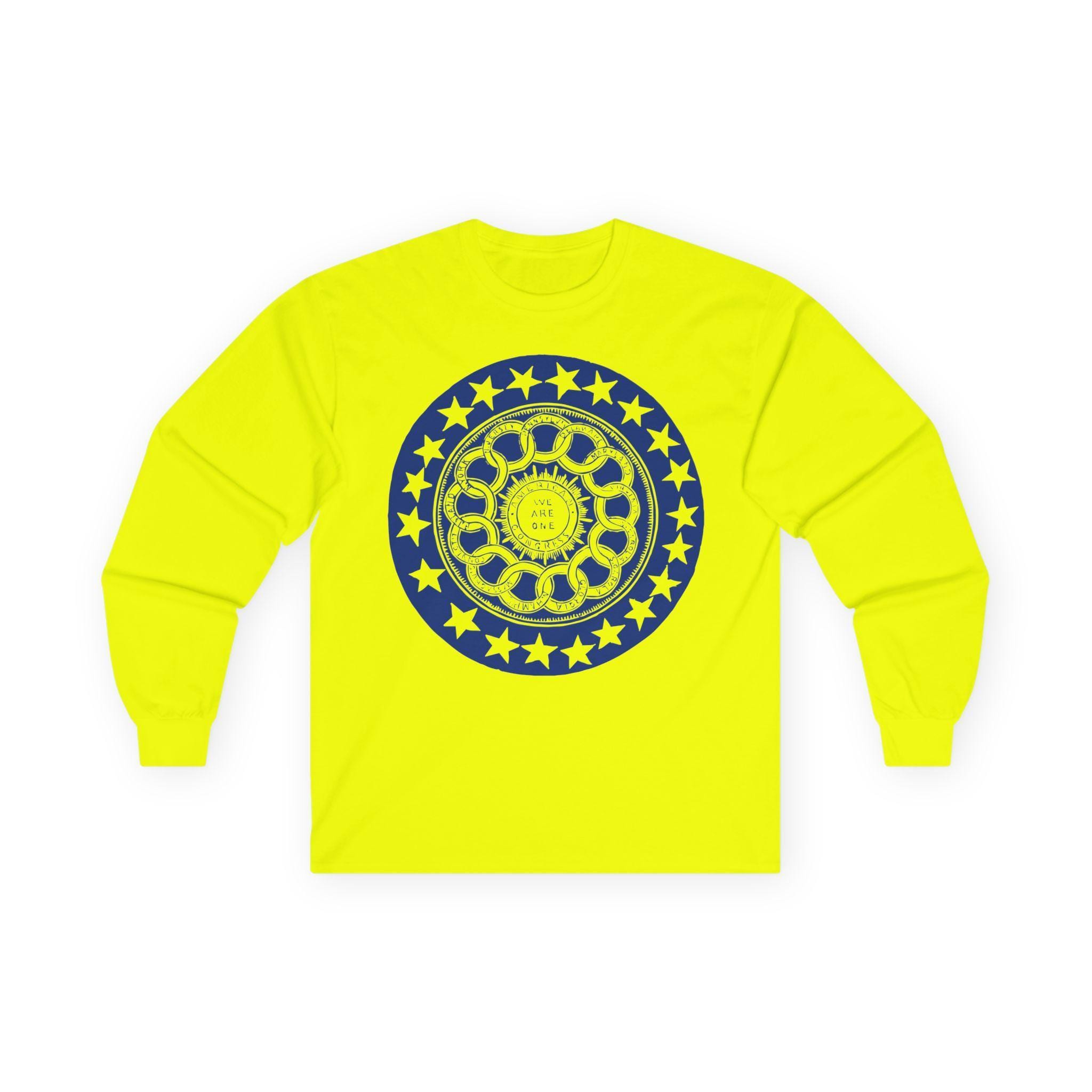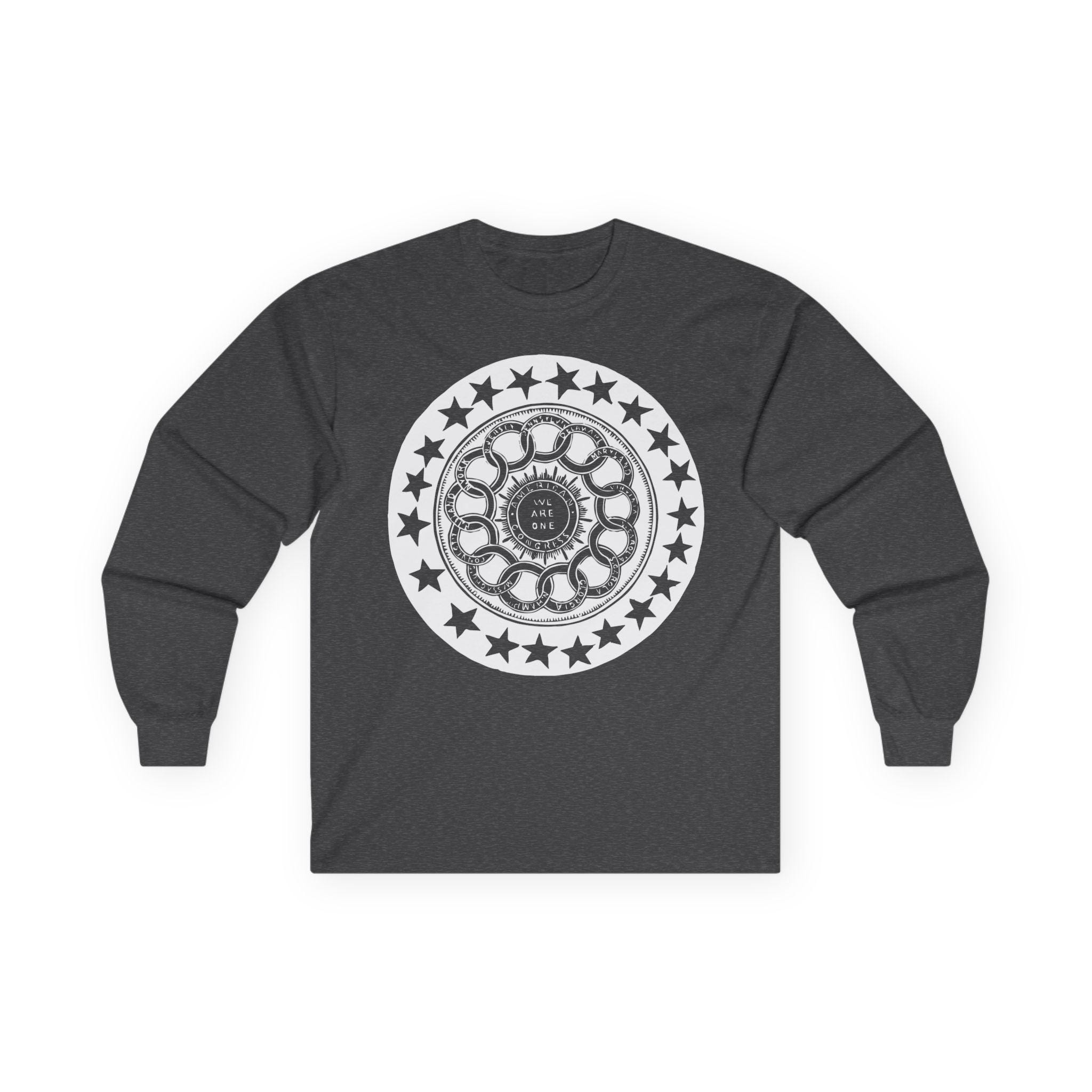 This comfortable longsleeve tee is the perfect layer for fall and a fantastic conversation starter. The design is a restored and unusually complex pro-Union stamp from the 1860s. It's a brilliant visual allegory for American federalism, showing the states interlocked in a circle around the central "American Congress," with the motto "We Are One." It’s a stylish and intelligent piece of apparel that speaks to the core principles of the nation's structure.