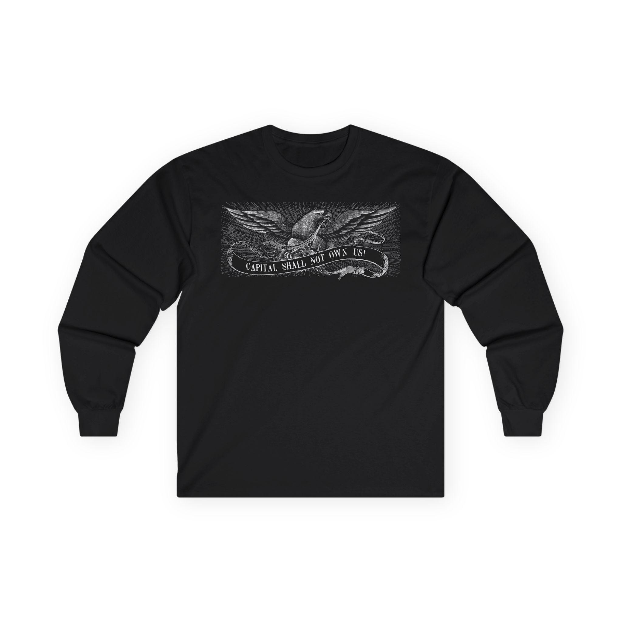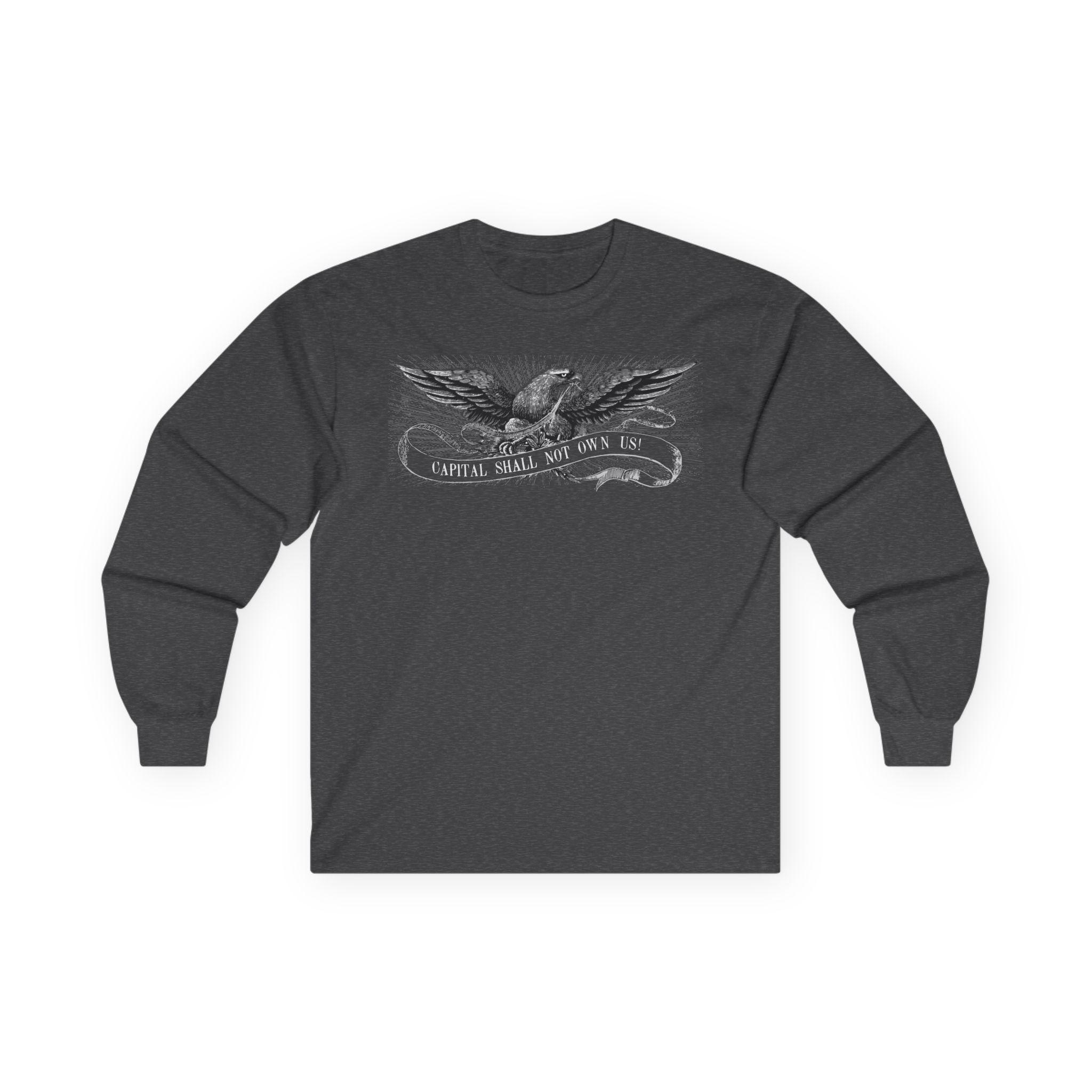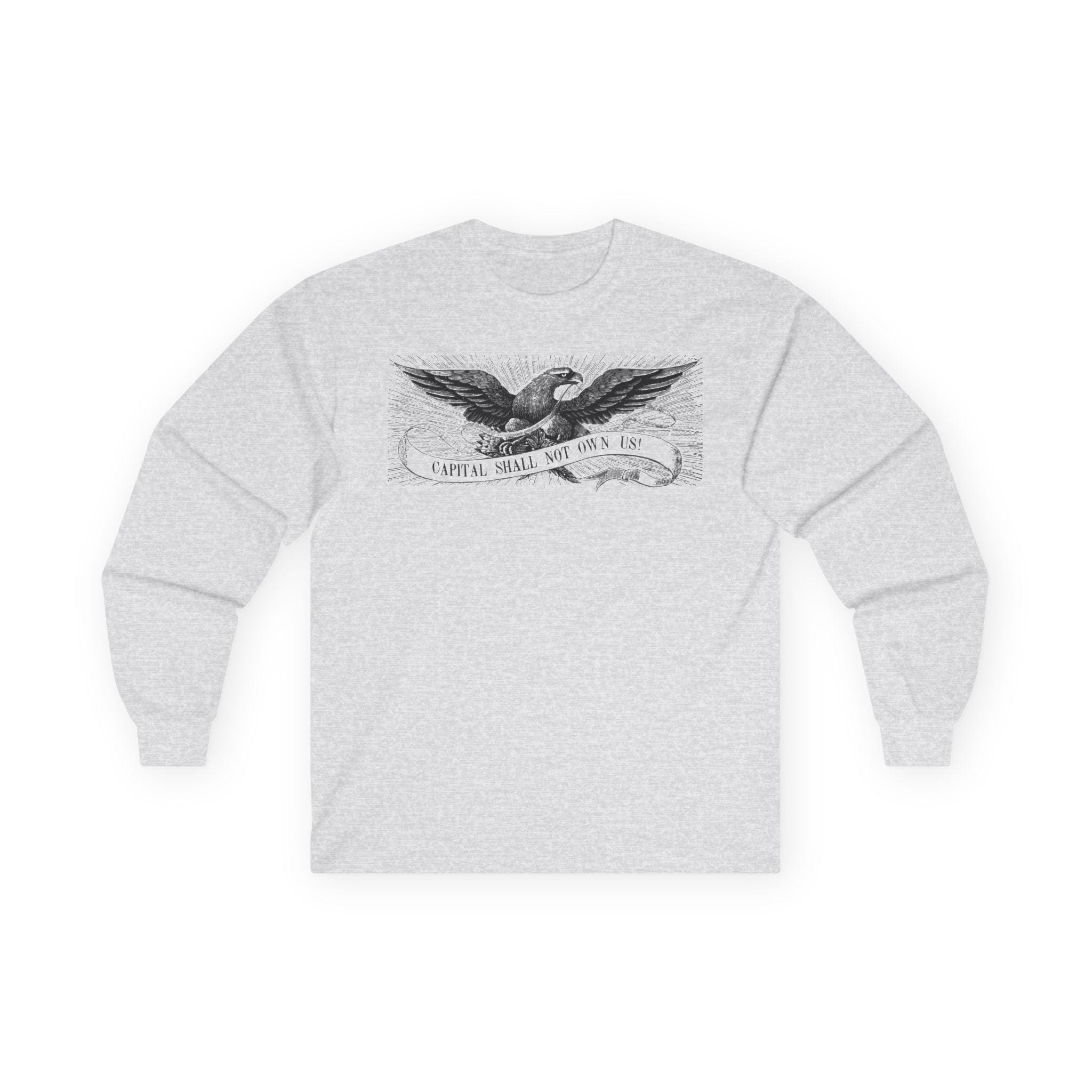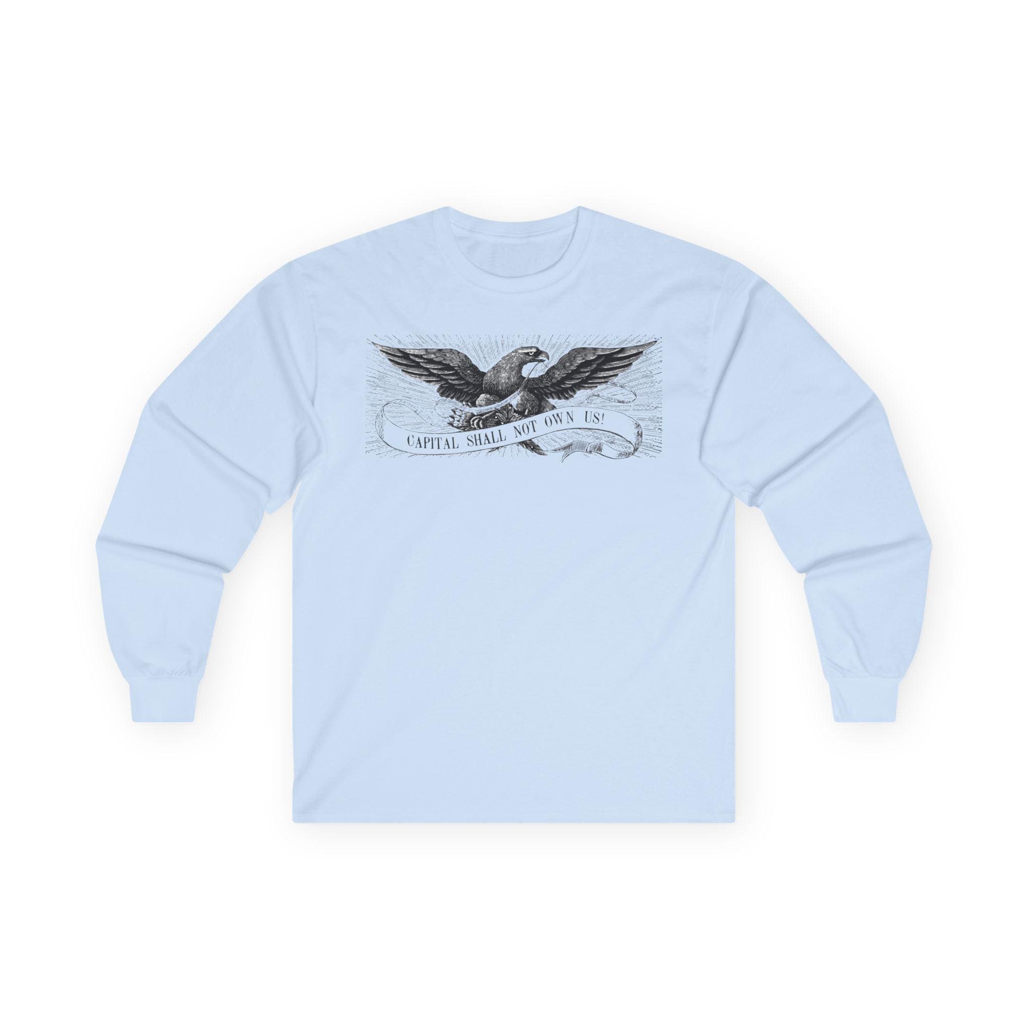 This comfortable longsleeve tee is the perfect layer for fall and a fantastic conversation starter. The design is a restored illustration from The Freeport Wide-Awake, an 1860 newspaper that supported Lincoln. It features a patriotic eagle with a shockingly modern and radical message: "CAPITAL SHALL NOT OWN US!" It’s a stylish and intelligent piece of apparel that connects the progressive spirit of the past with the political questions of today.