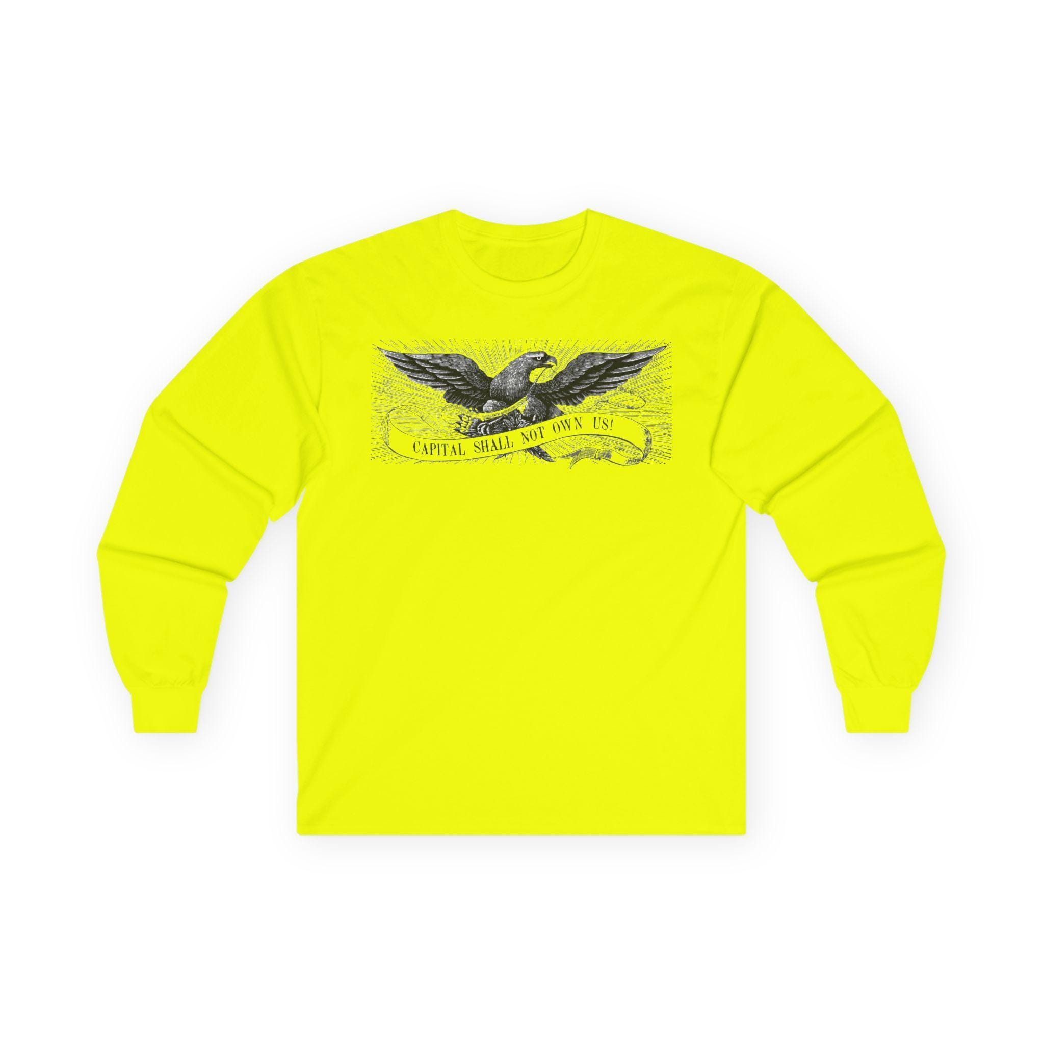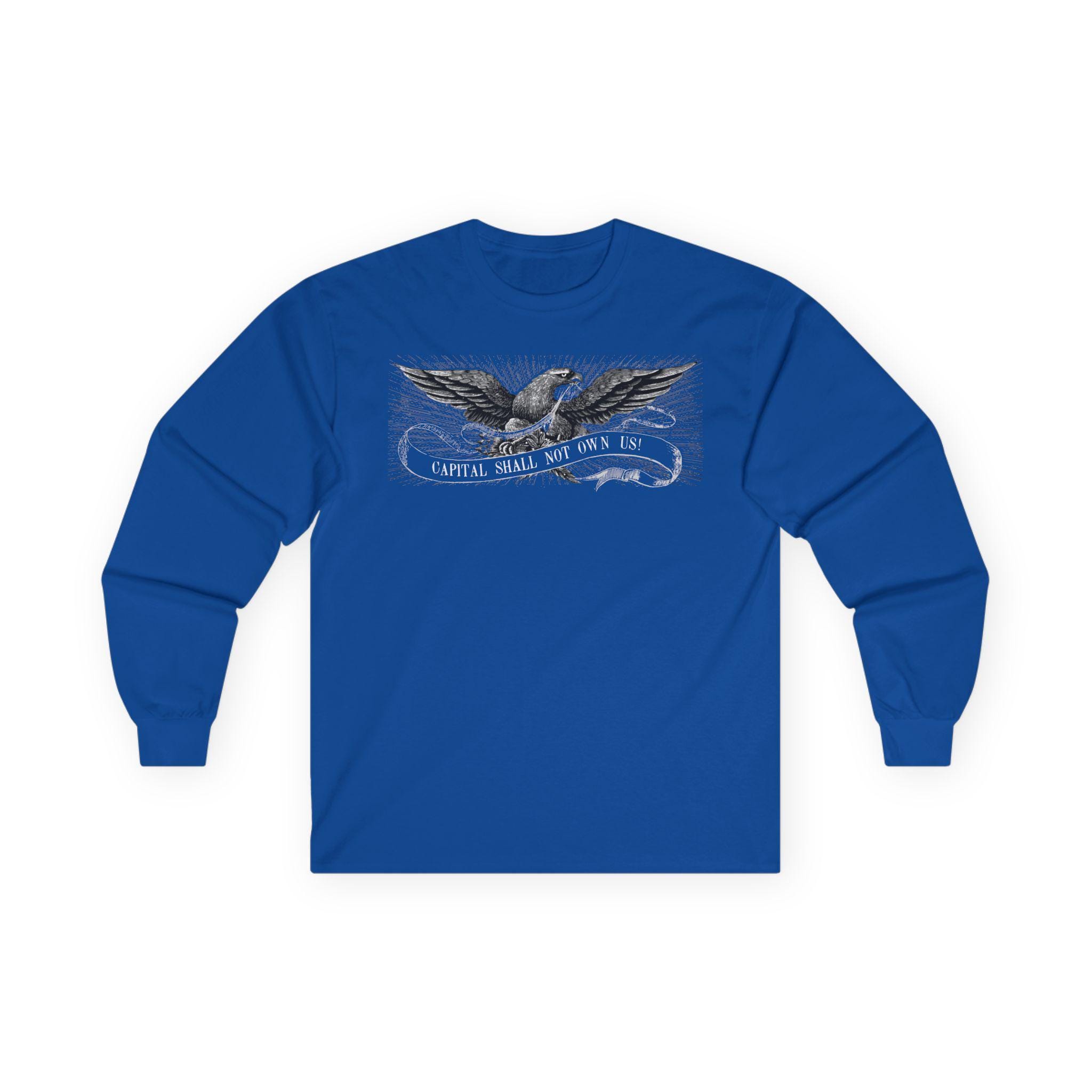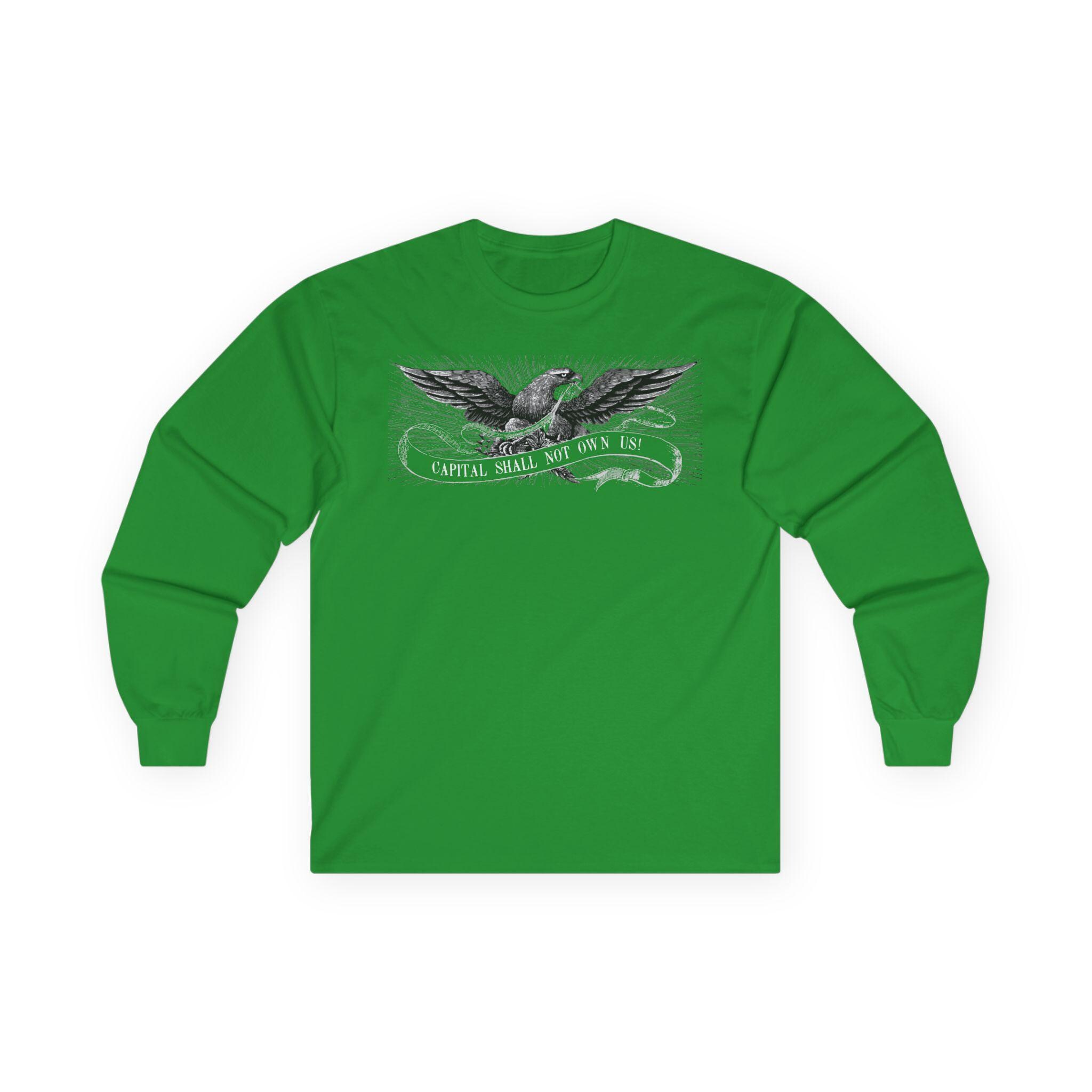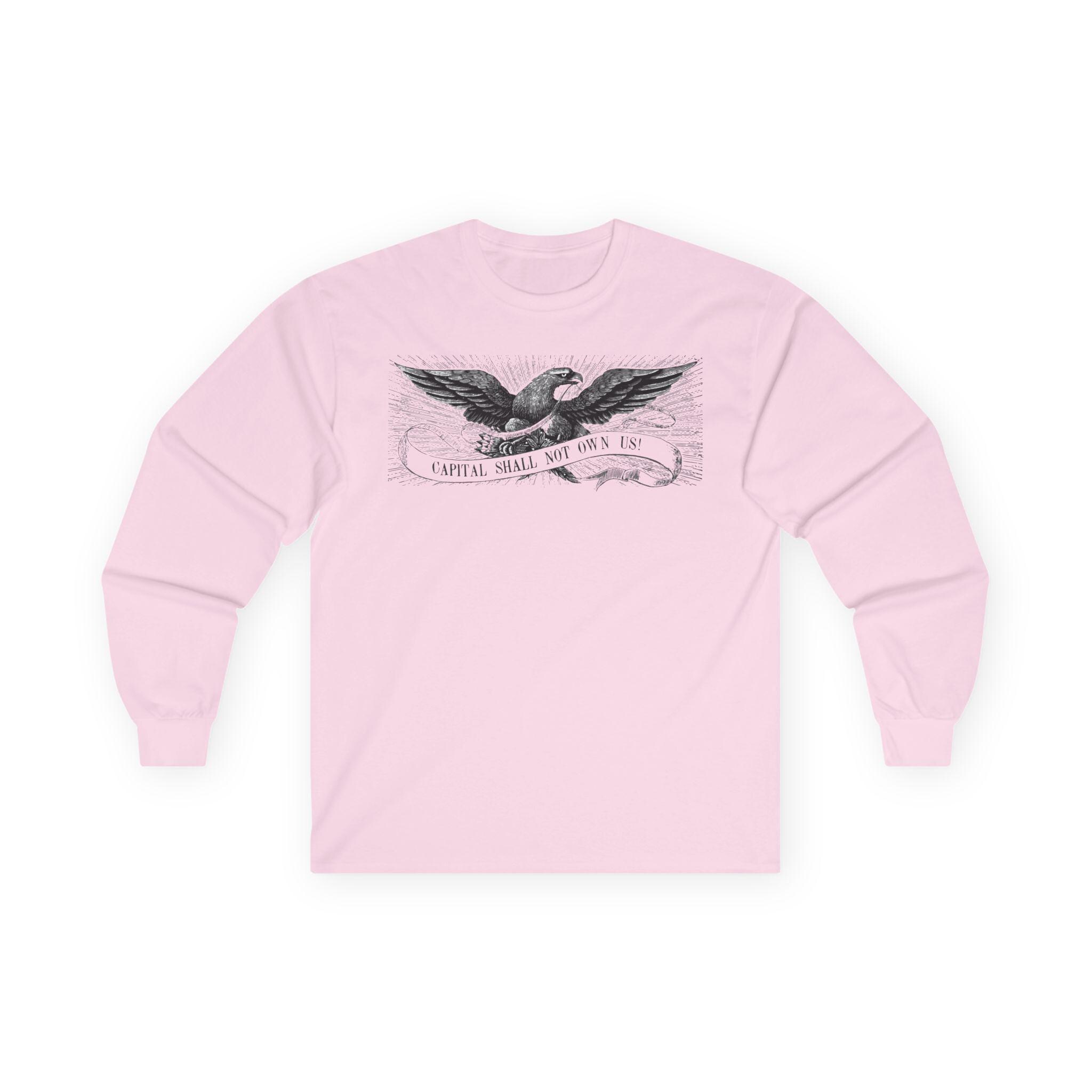 This comfortable longsleeve tee is the perfect layer for fall and a fantastic conversation starter. The design is a restored illustration from The Freeport Wide-Awake, an 1860 newspaper that supported Lincoln. It features a patriotic eagle with a shockingly modern and radical message: "CAPITAL SHALL NOT OWN US!" It’s a stylish and intelligent piece of apparel that connects the progressive spirit of the past with the political questions of today.