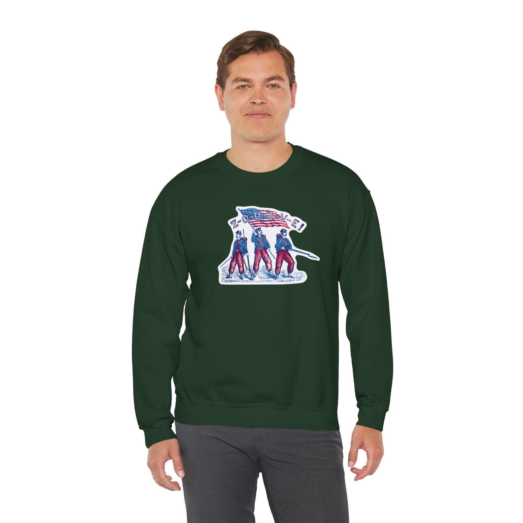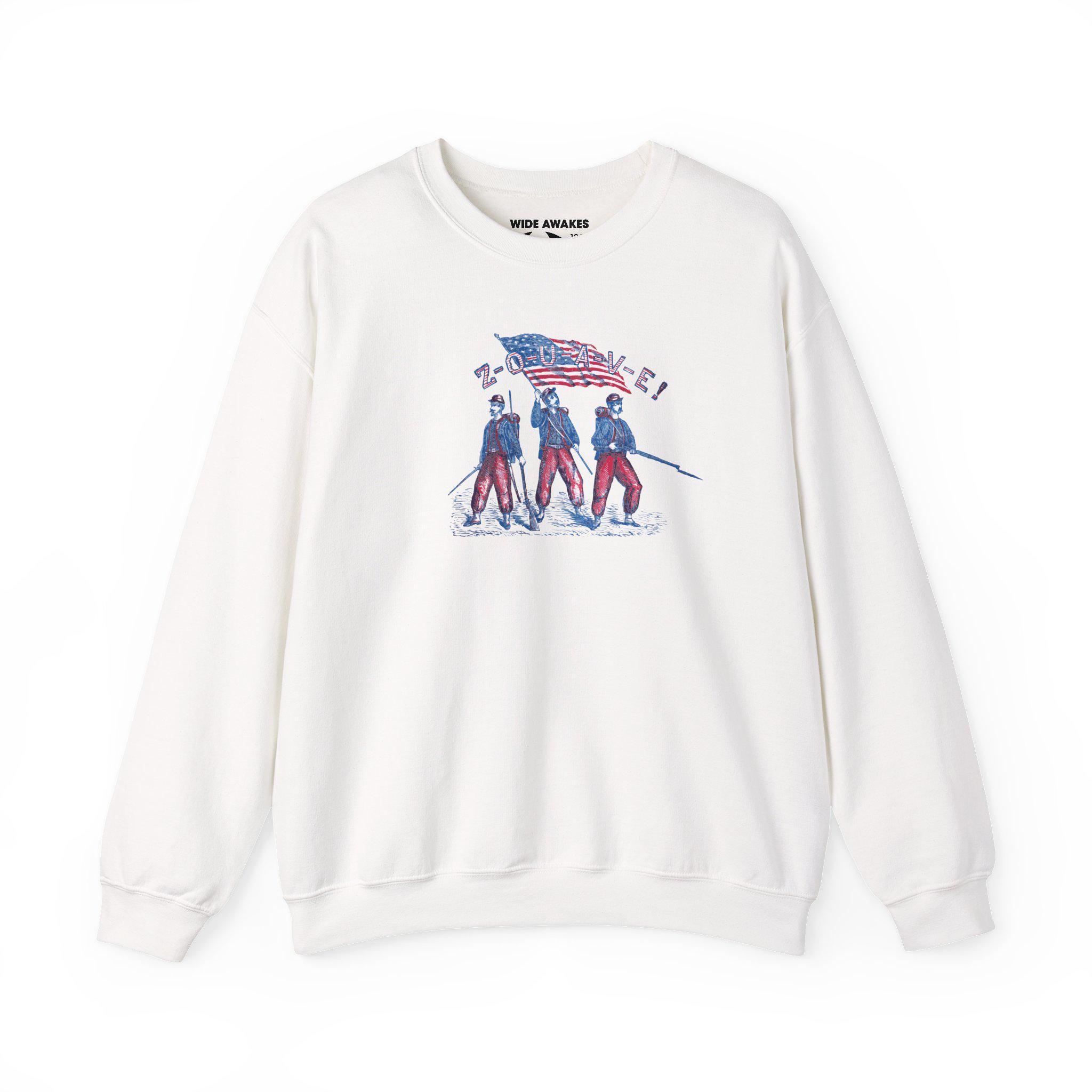 Stay warm this fall with a sweatshirt that captures the vibrant energy of the Civil War Zouaves. The design, restored from a 19th-century envelope stamp, is a dynamic and colorful tribute to these elite volunteer regiments. The illustration shows three Zouaves ready for action: one with a bayonet fixed, one with a saber drawn, and the color-bearer holding the American flag high. It's a stylish and historically authentic piece that celebrates the courage and panache of these legendary soldiers.