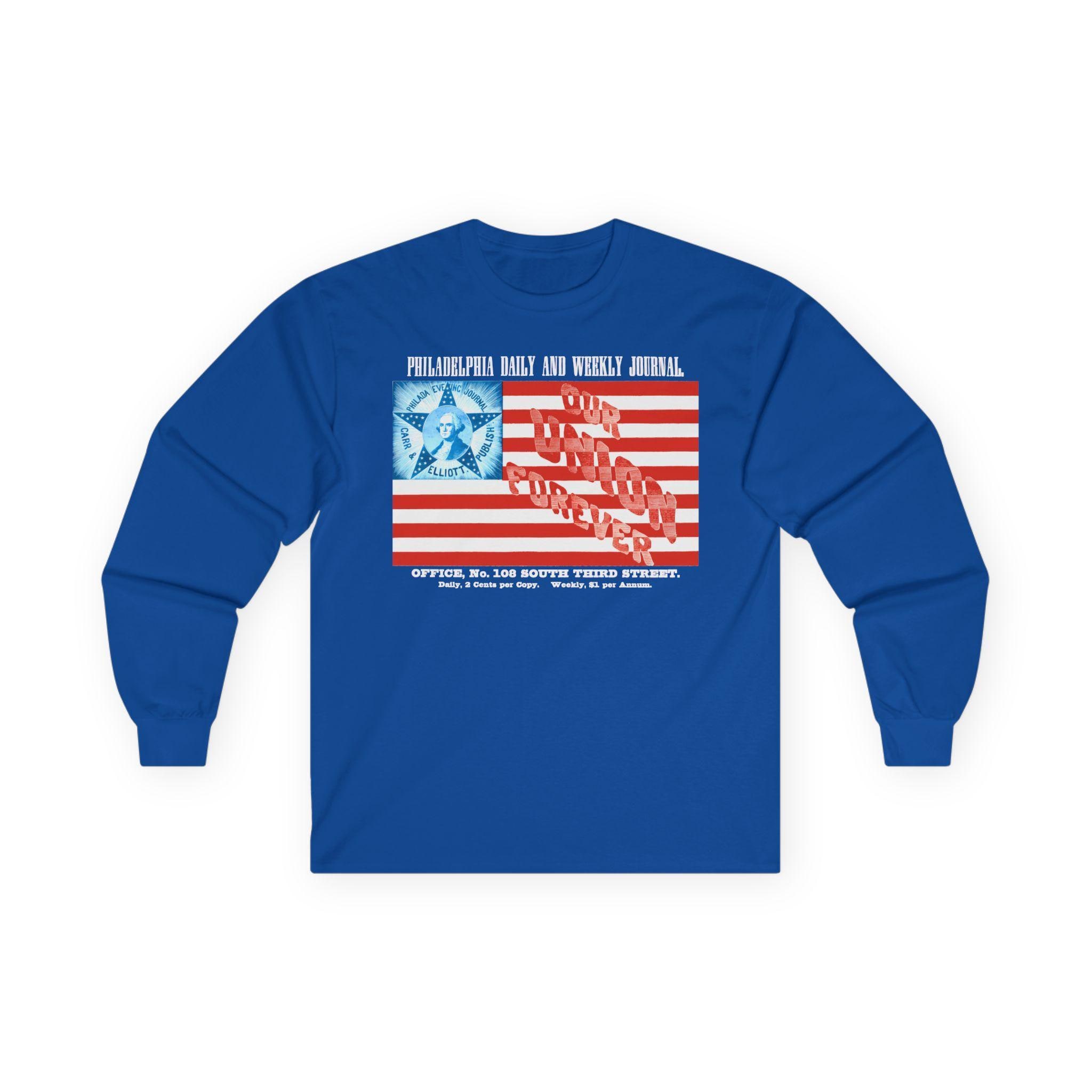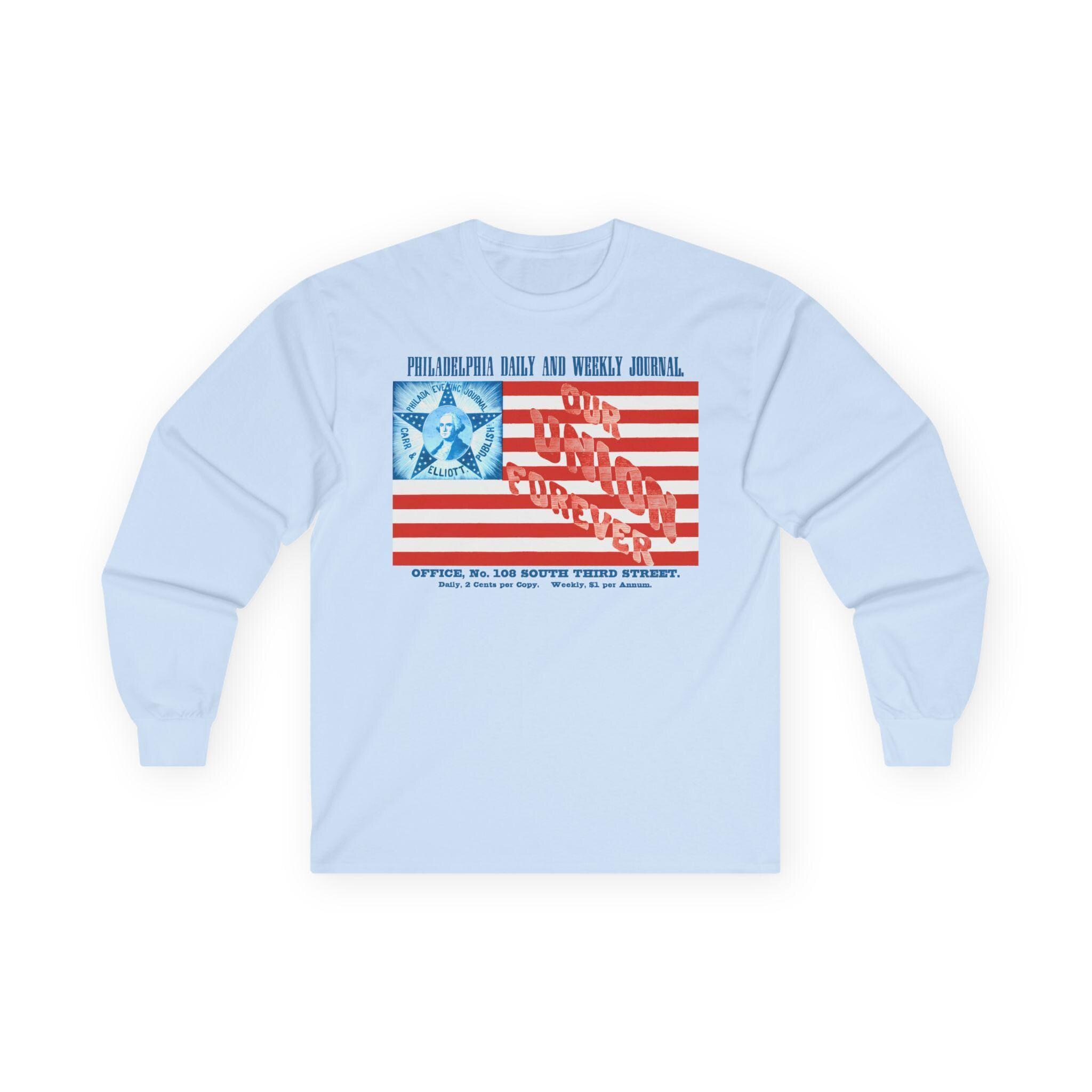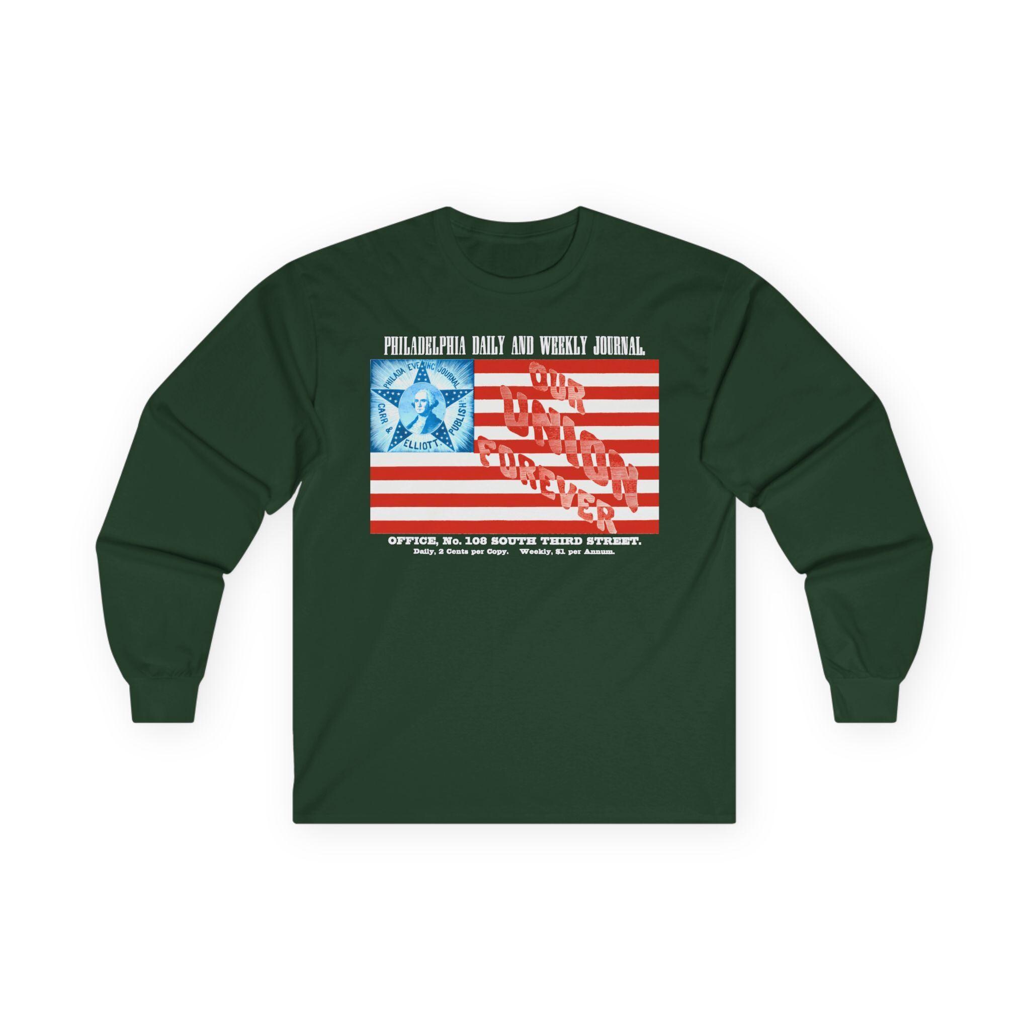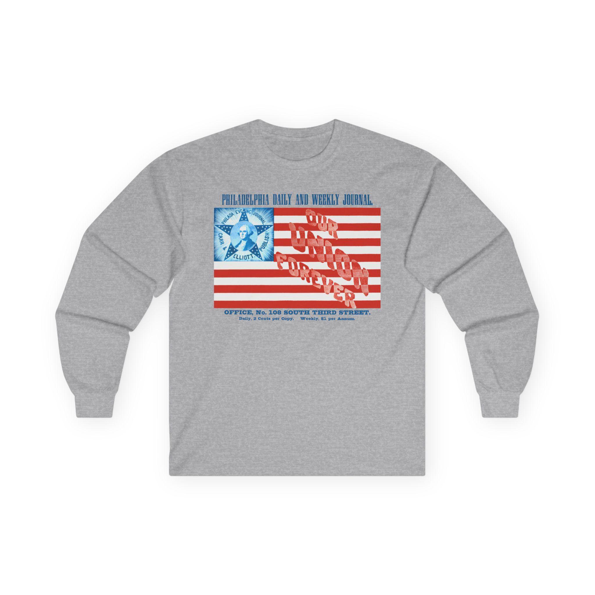 This comfortable longsleeve tee is the perfect layer for fall and a fantastic conversation starter. The design is a restored advertisement from a Civil War-era Philadelphia newspaper, and it's a stunning piece of patriotic marketing. The artwork features a unique American flag with a portrait of George Washington at its center and the powerful slogan "OUR UNION FOREVER" woven into its stripes. It’s a stylish and intricate piece of wearable history.