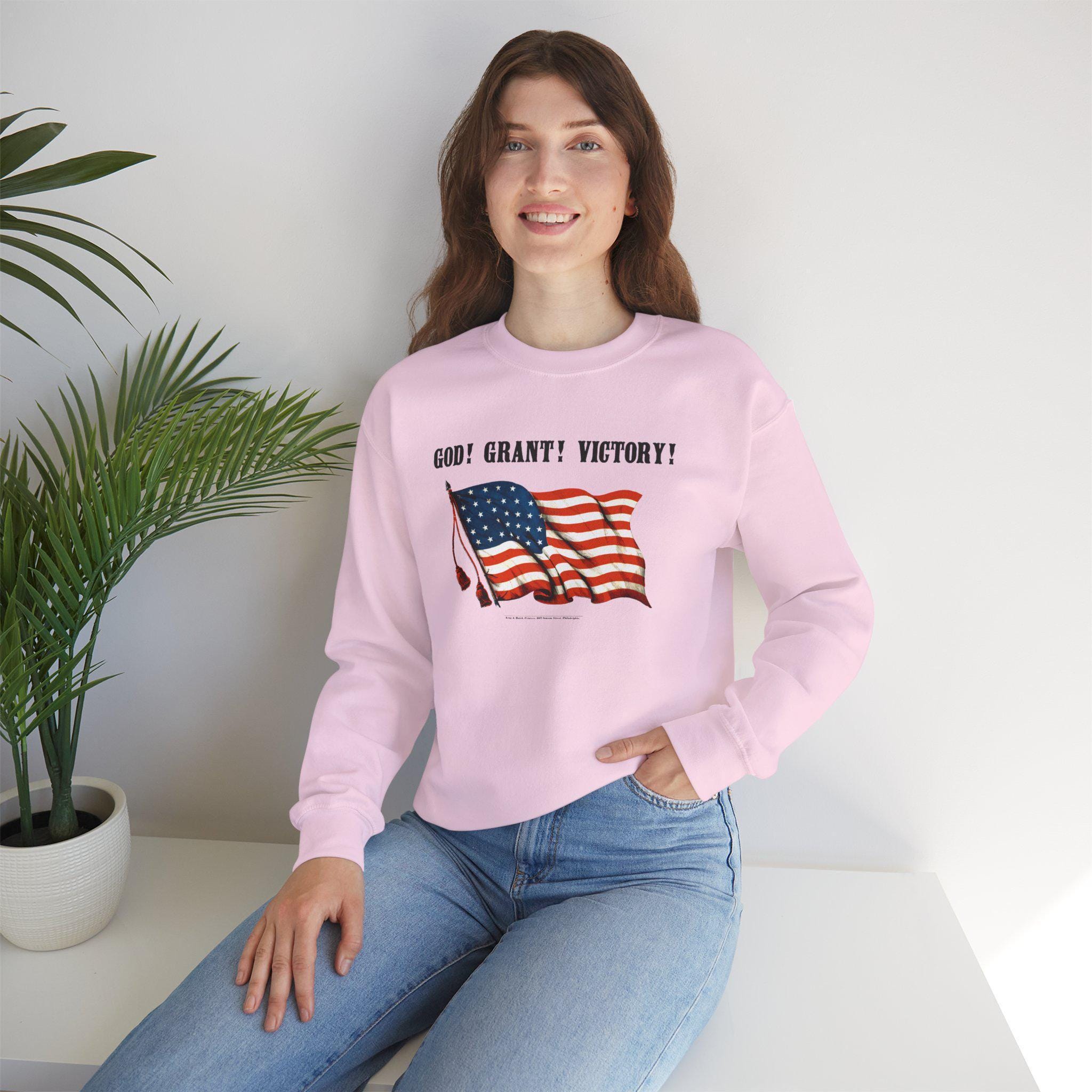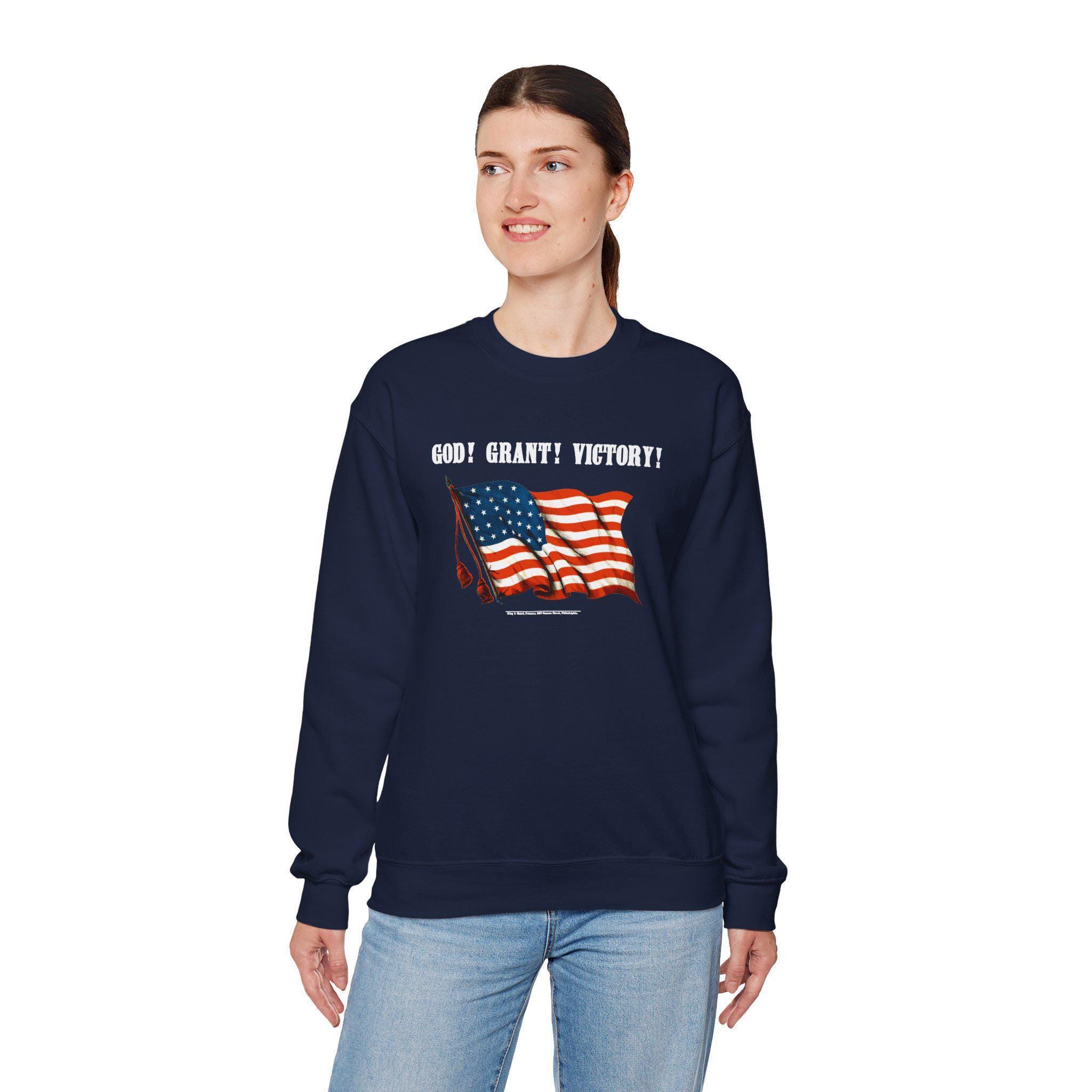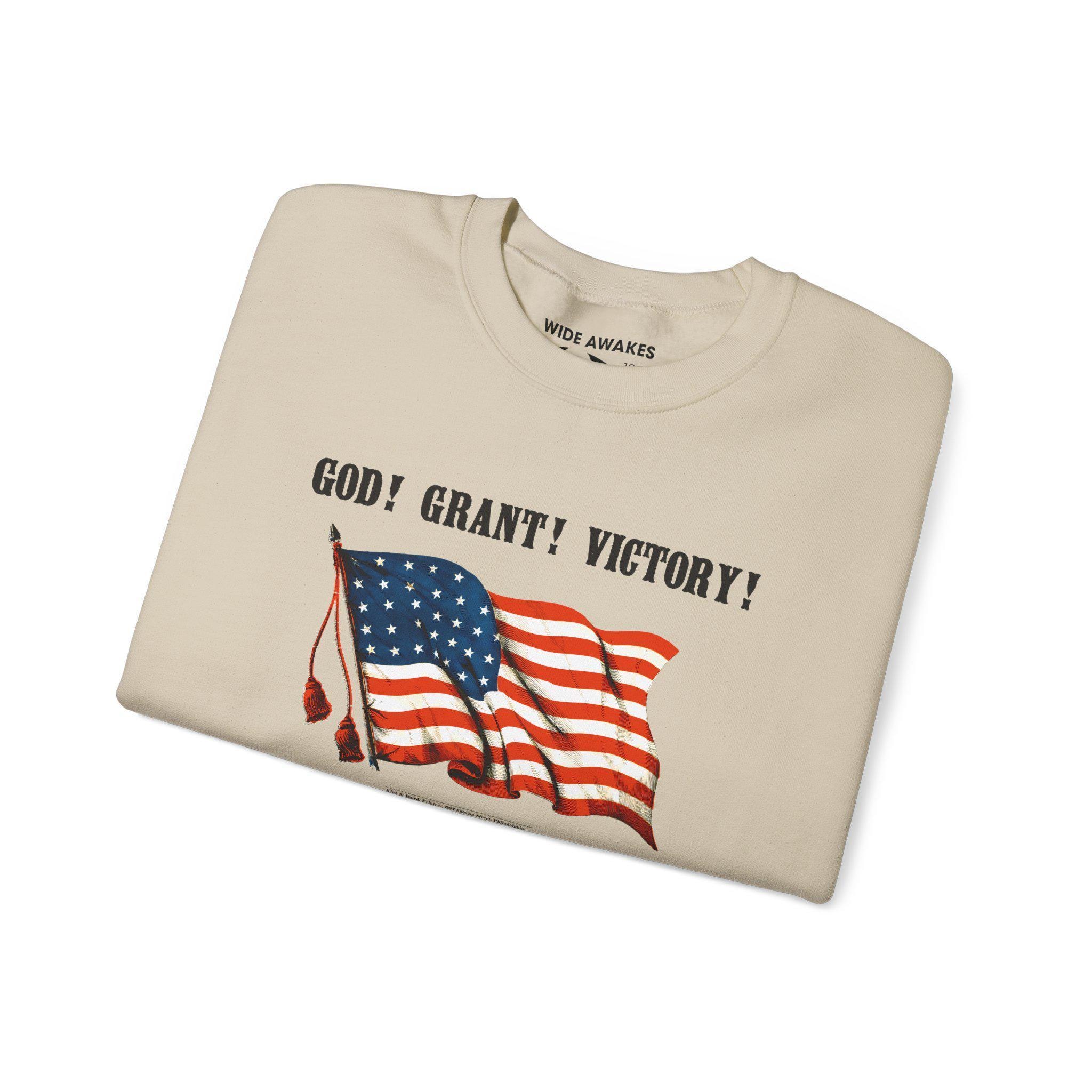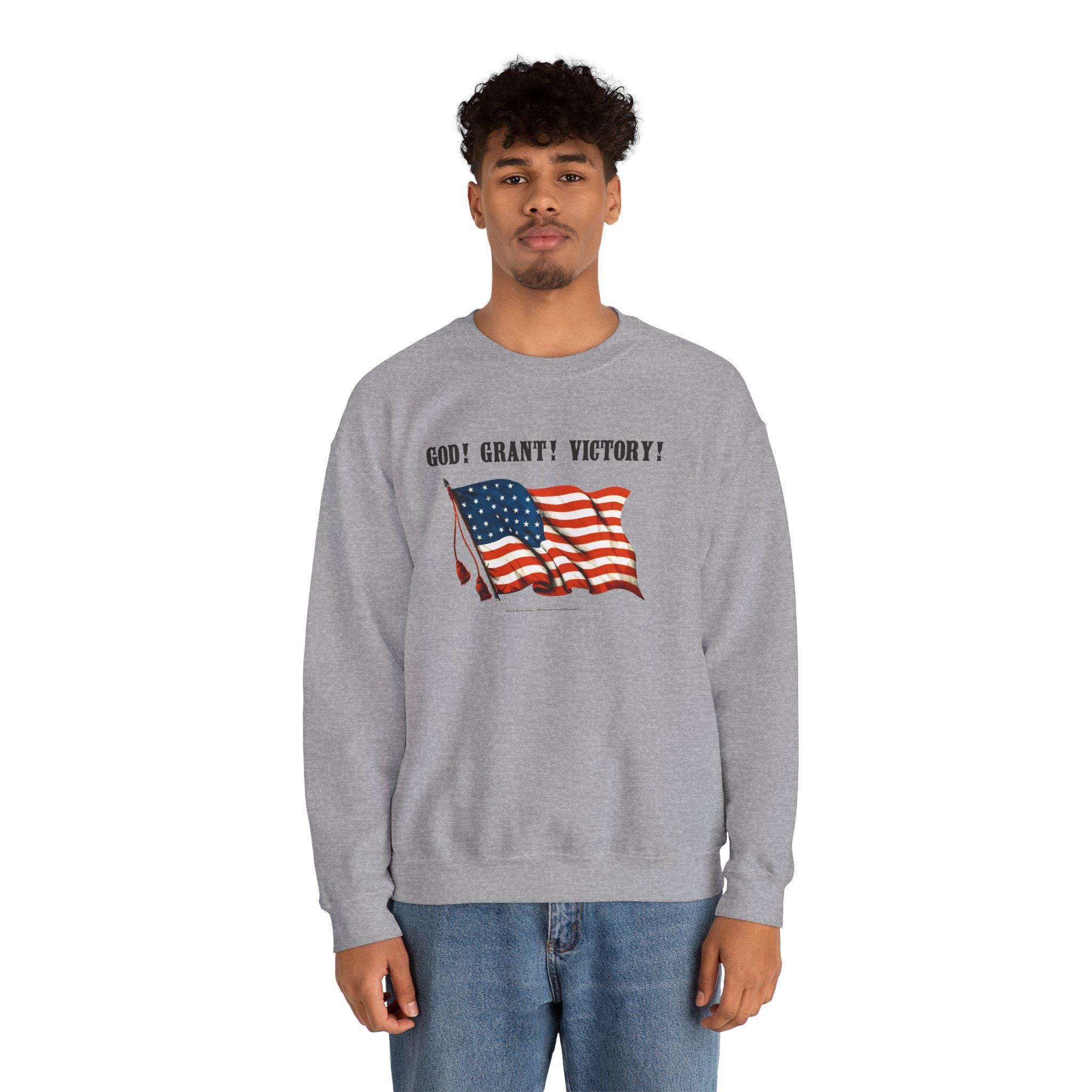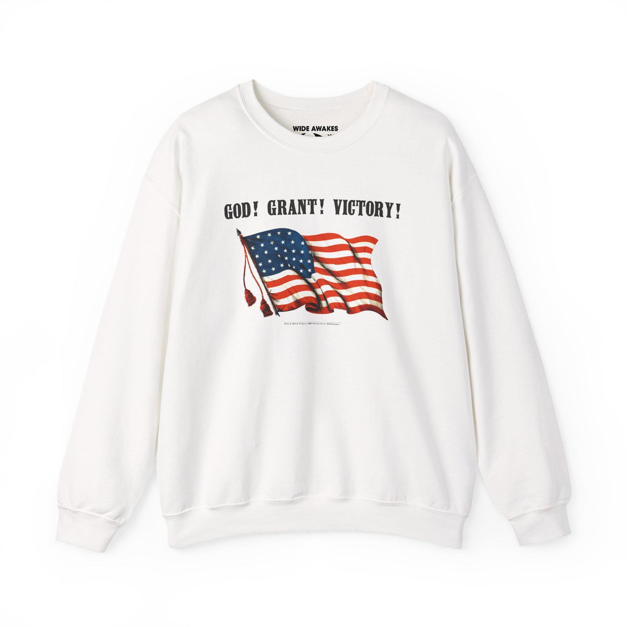 Stay warm this fall with a cozy crewneck sweatshirt that features a clever piece of Civil War history. The design, taken from a restored 19th-century poster, pairs a waving American flag with the phrase "GOD! GRANT! VICTORY!" This seemingly straightforward prayer for victory was also a brilliant double entendre, simultaneously serving as a patriotic endorsement of General Ulysses S. Grant. It's a comfortable and intelligent piece of wearable history, perfect for any history enthusiast with a sense of humor.