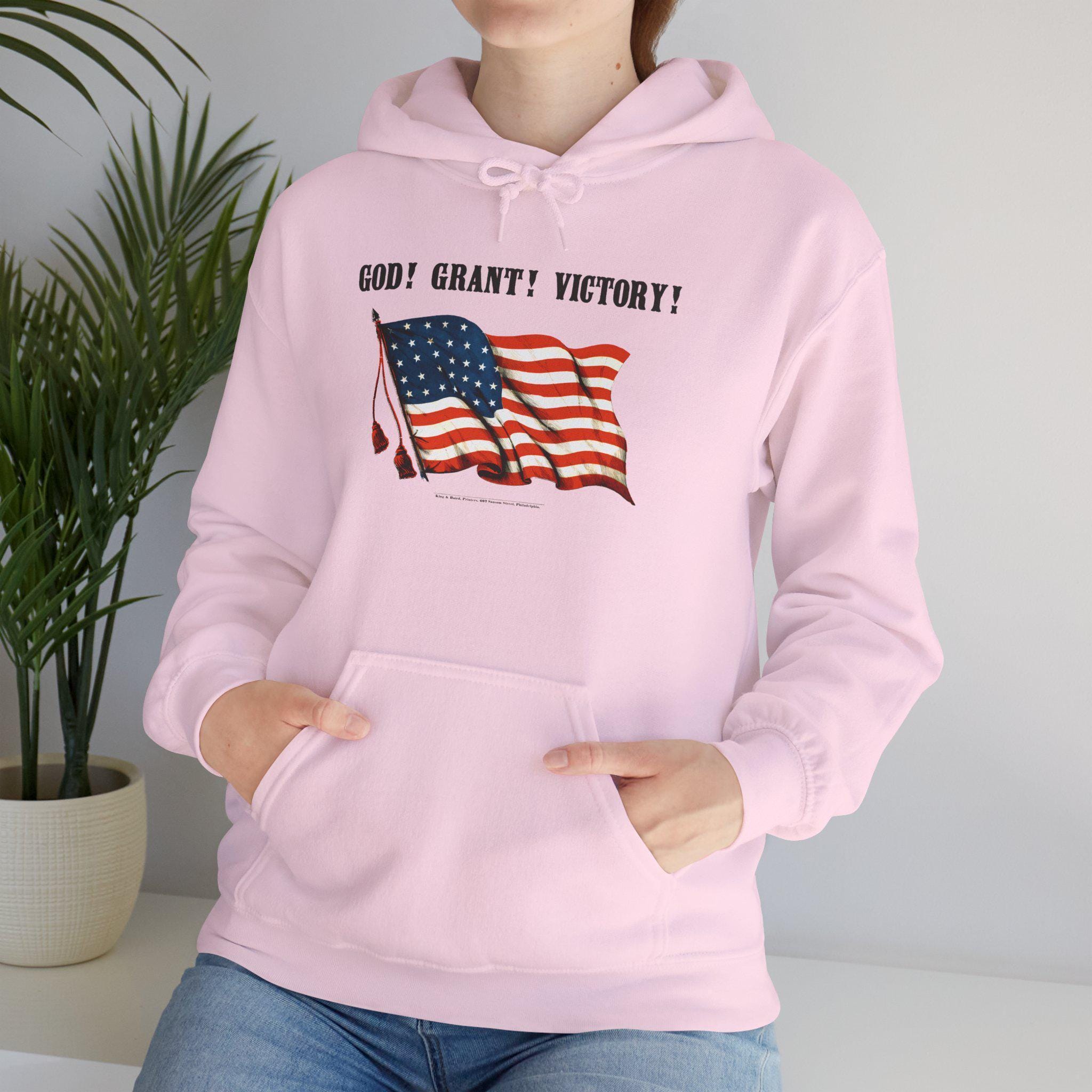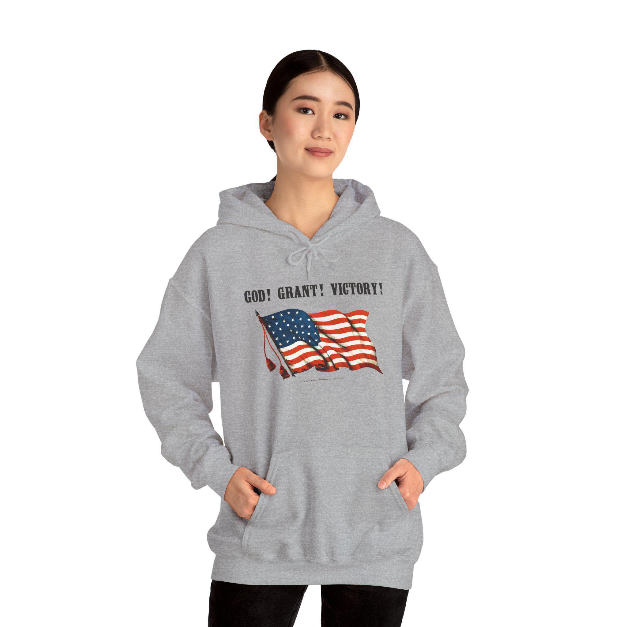 This comfortable and warm hoodie showcases the ingenuity of wartime messaging. The design is restored from a 19th-century patriotic poster that brilliantly played with words. Against the backdrop of a proudly waving American flag, the phrase "GOD! GRANT! VICTORY!" stands out. Was it a prayer for divine intervention, or a call to support General Ulysses S. Grant? It was both. With a soft fleece interior and a spacious front pocket, this hoodie is a wearable piece of 19th-century wit and a powerful symbol of the Union's determination.