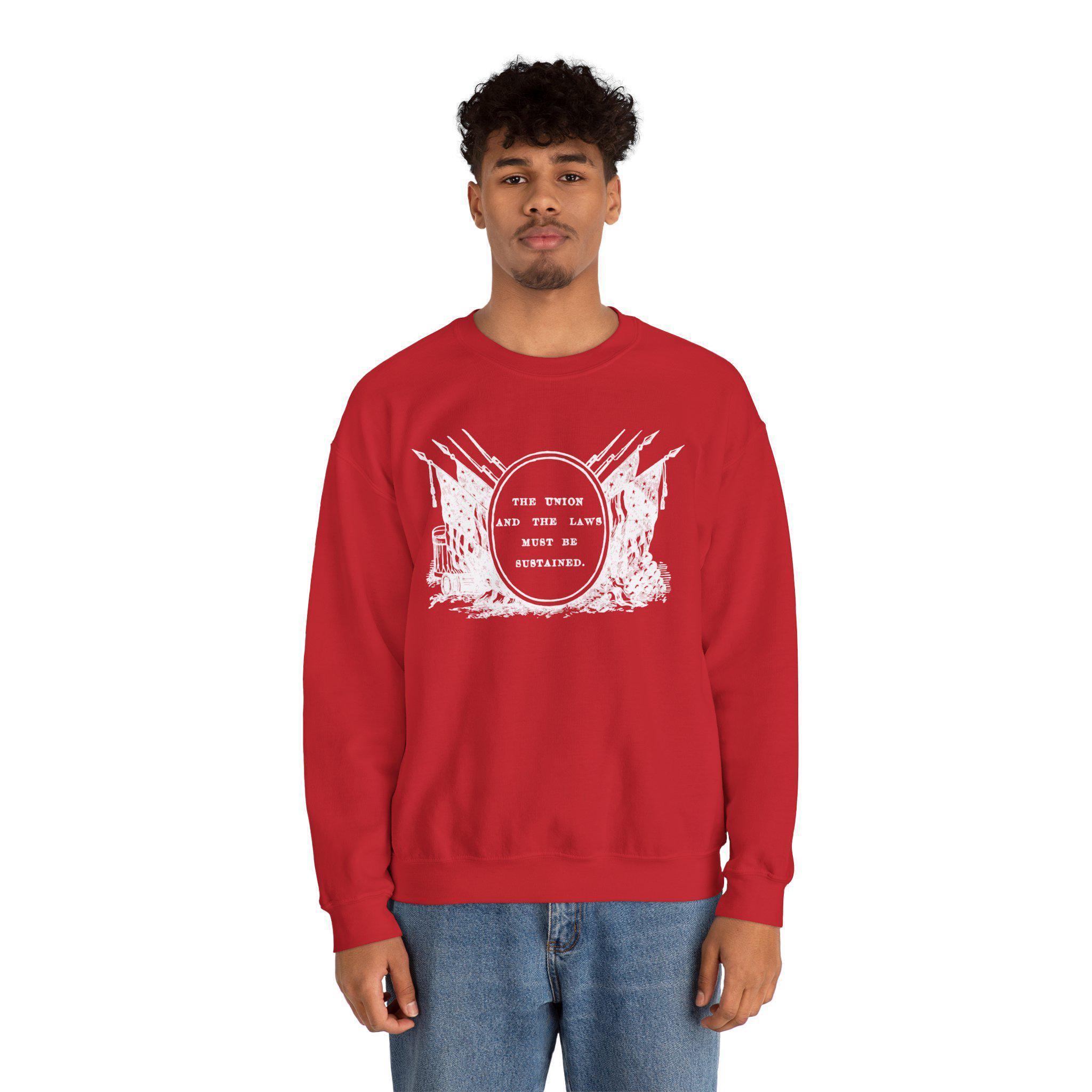 Stay warm this fall with a cozy crewneck sweatshirt that makes a profound historical statement. The design, restored from a 19th-century pro-Union stamp, features the powerful motto "THE UNION AND THE LAWS MUST BE SUSTAINED." This declaration is surrounded by a detailed engraving of military emblems—flags, rifles, and cannons—symbolizing the nation's readiness to defend its principles. It's a comfortable and meaningful piece of wearable history for any patriot or Civil War enthusiast.