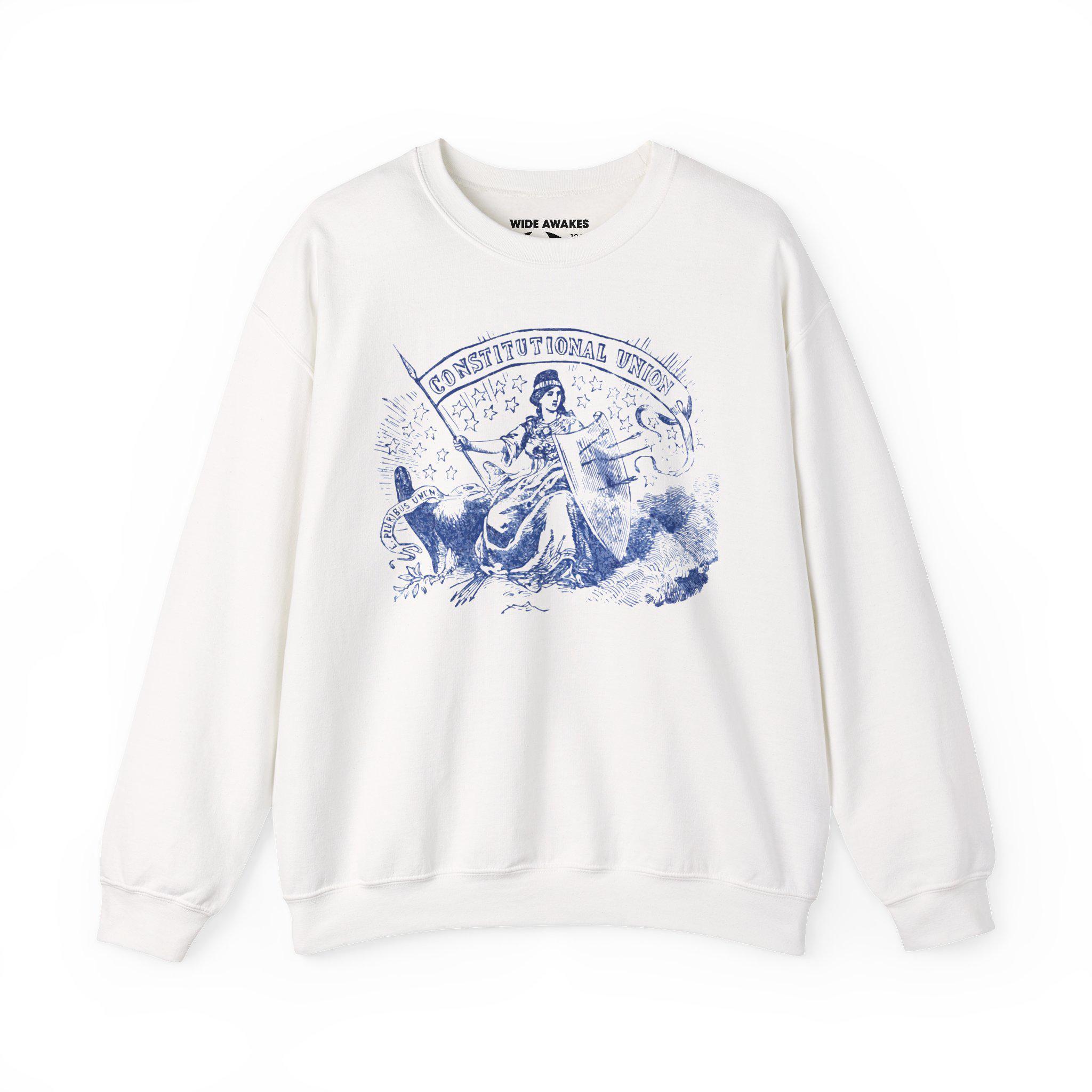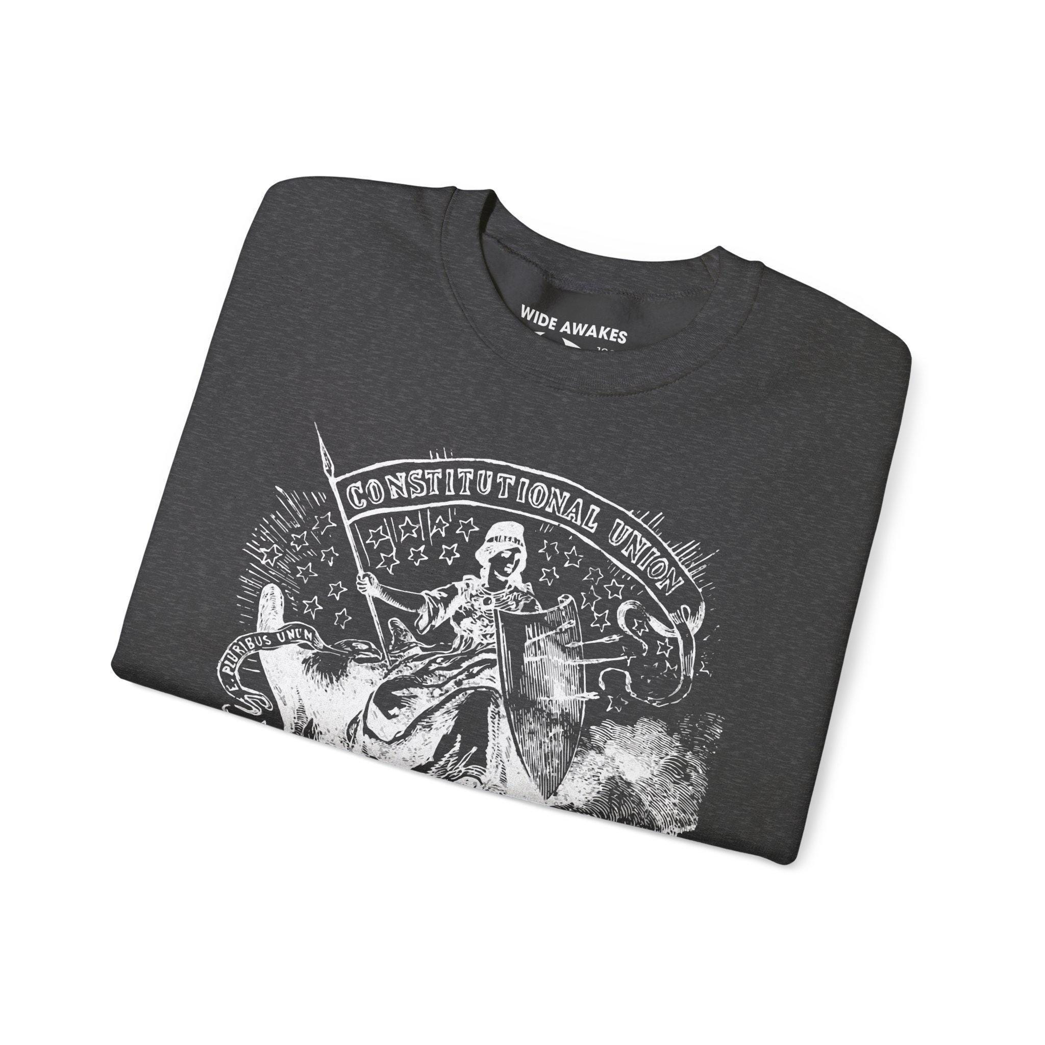 Stay warm this fall with a cozy crewneck sweatshirt that carries a deep, allegorical message from the Civil War. The design, restored from a 19th-century pro-Union stamp, depicts Freedom herself defending the American eagle. Her shield bears the wounds of battle (pierced arrows), but her standard is unwavering: the "CONSTITUTIONAL UNION." It's a profound statement about resilience, principle, and the enduring strength of a nation united under law, perfect for the thoughtful patriot.