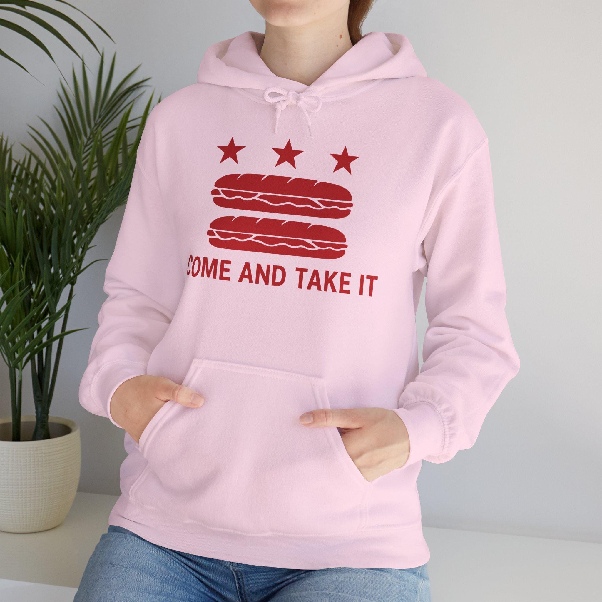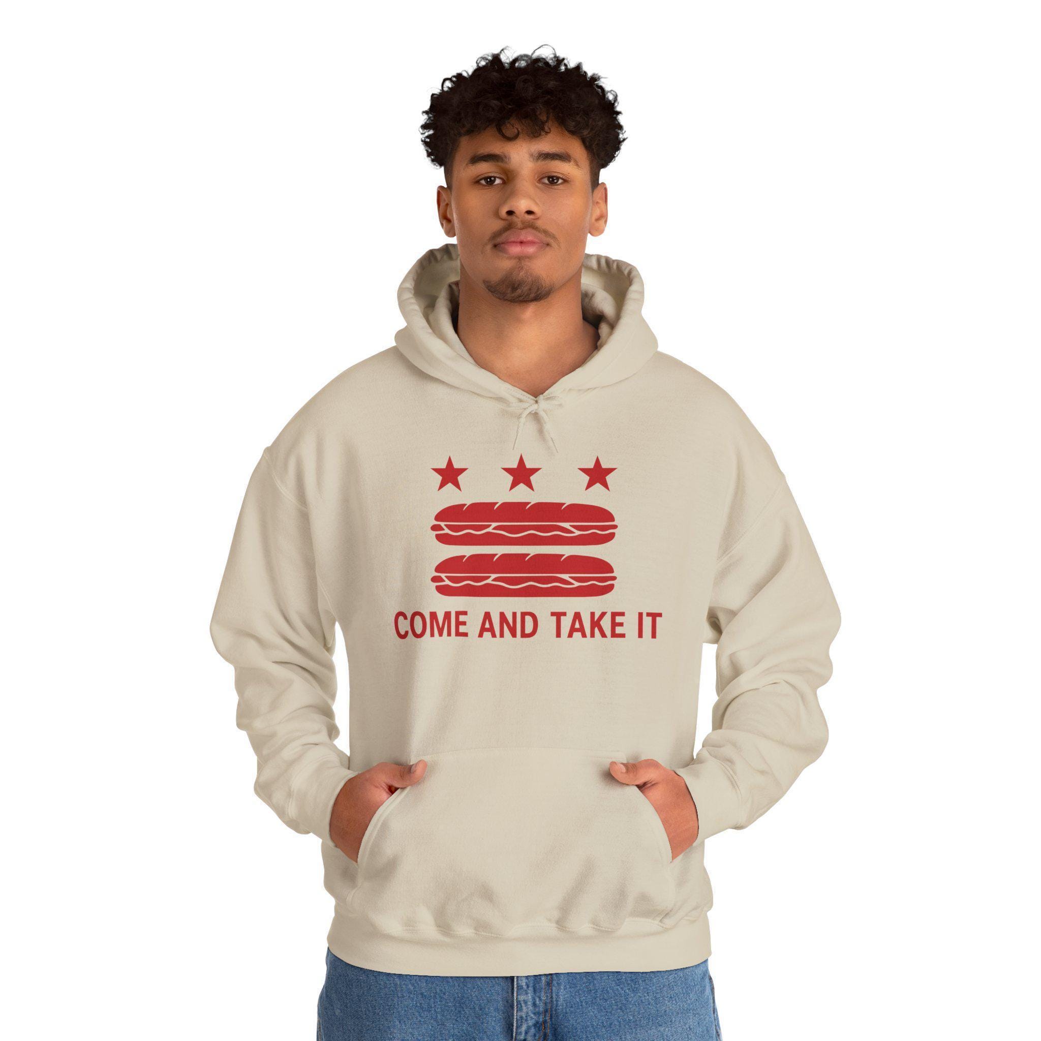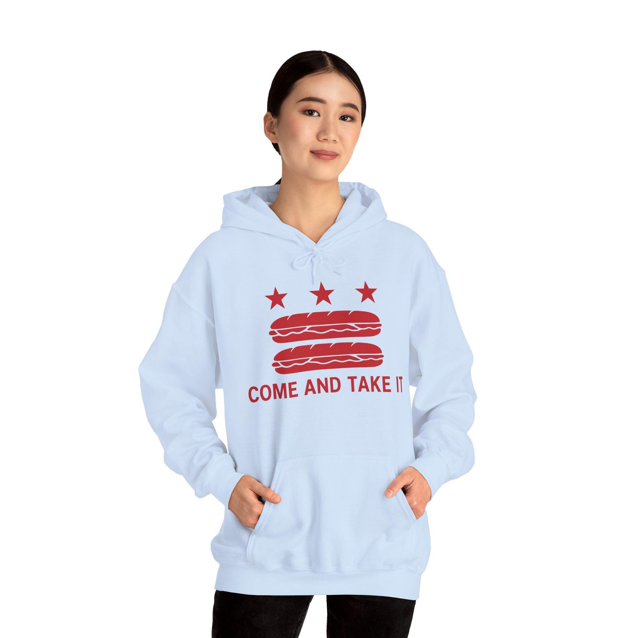This warm and comfortable hoodie mashes up multiple layers of American history to make a hilarious and powerful point. The design starts as a parody of the Washington D.C. flag, but replaces the red bars with two red sandwiches—a nod to a recent, legendary moment of civil disobedience. The addition of the classic defiant slogan, "COME AND TAKE IT," connects this absurd act to a long legacy of American resistance. With a soft fleece interior and a spacious front pocket, this is the perfect gear for anyone who appreciates a good joke and a just cause.