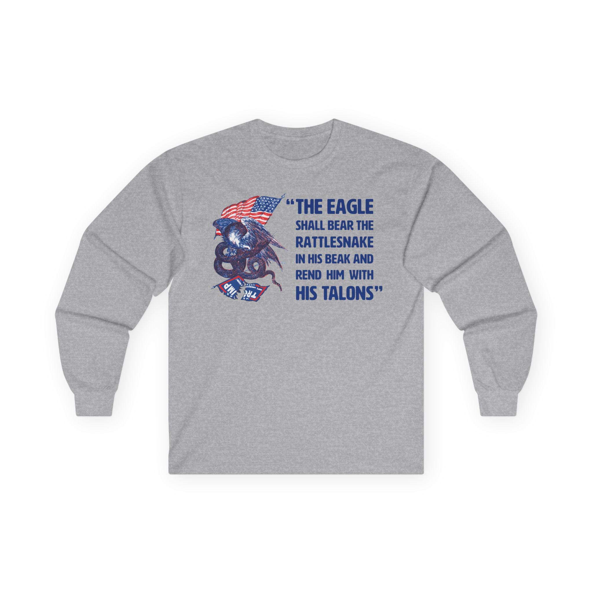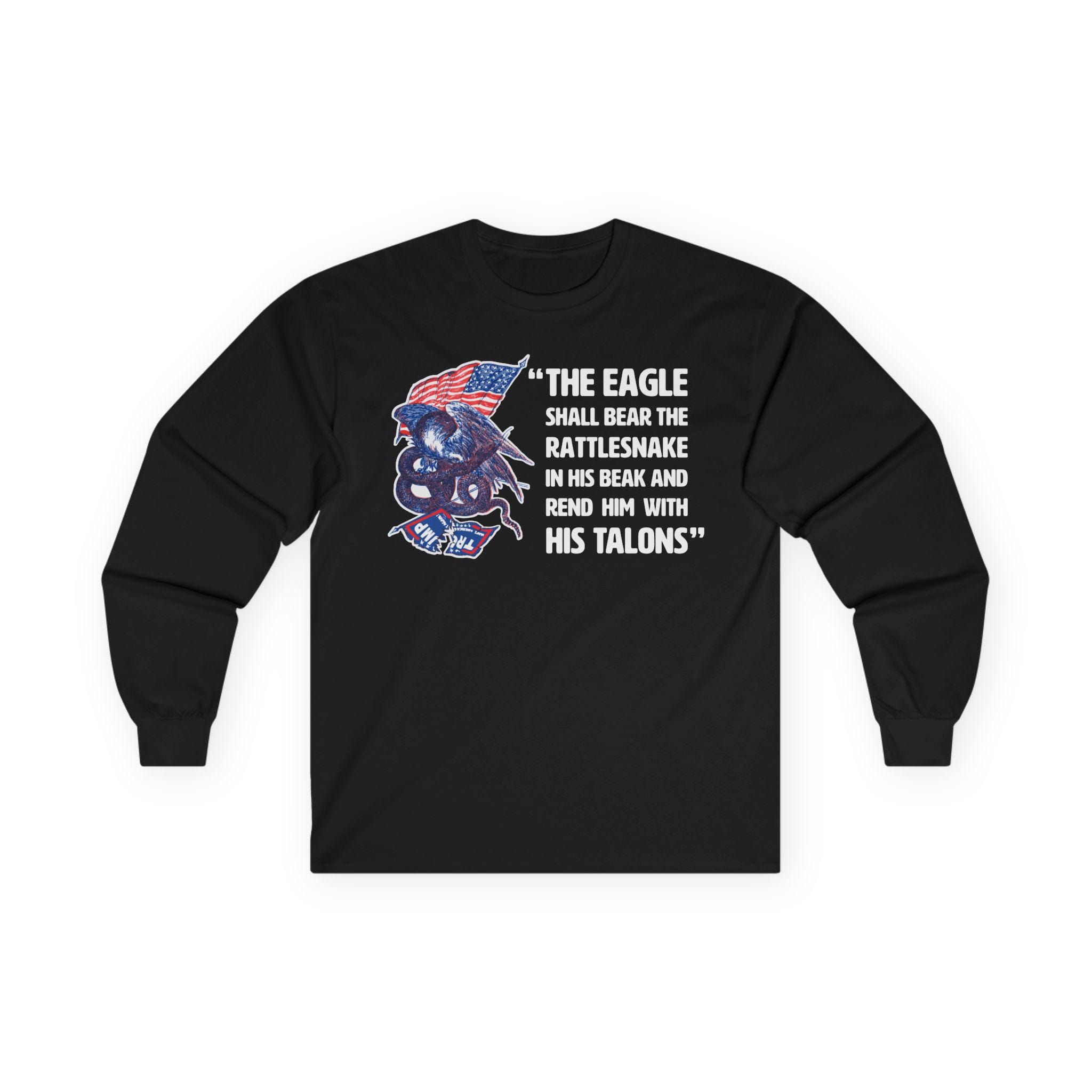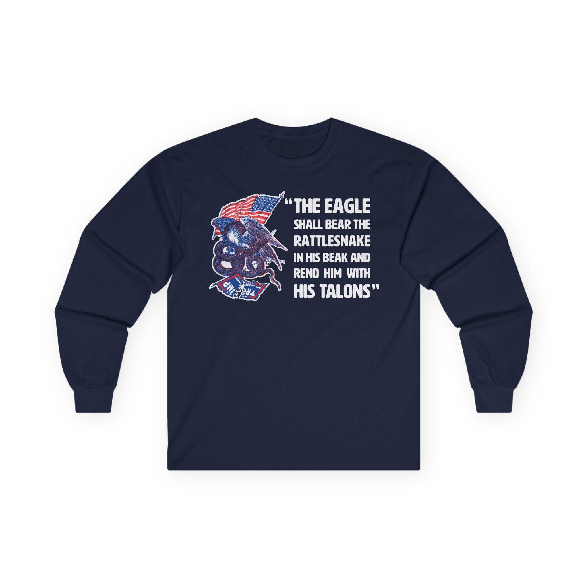This comfortable longsleeve tee is the perfect layer for fall and a powerful piece of political art. The design is a modern take on a fiery piece of Civil War propaganda, replacing the original's Confederate "serpent" with the modern MAGA flag, flying dishonored beneath a victorious American eagle. The bold caption, "The Eagle Shall... Rend Him With His Talons," leaves no doubt about the message. It's a bold, historically-grounded statement for any proud patriot.