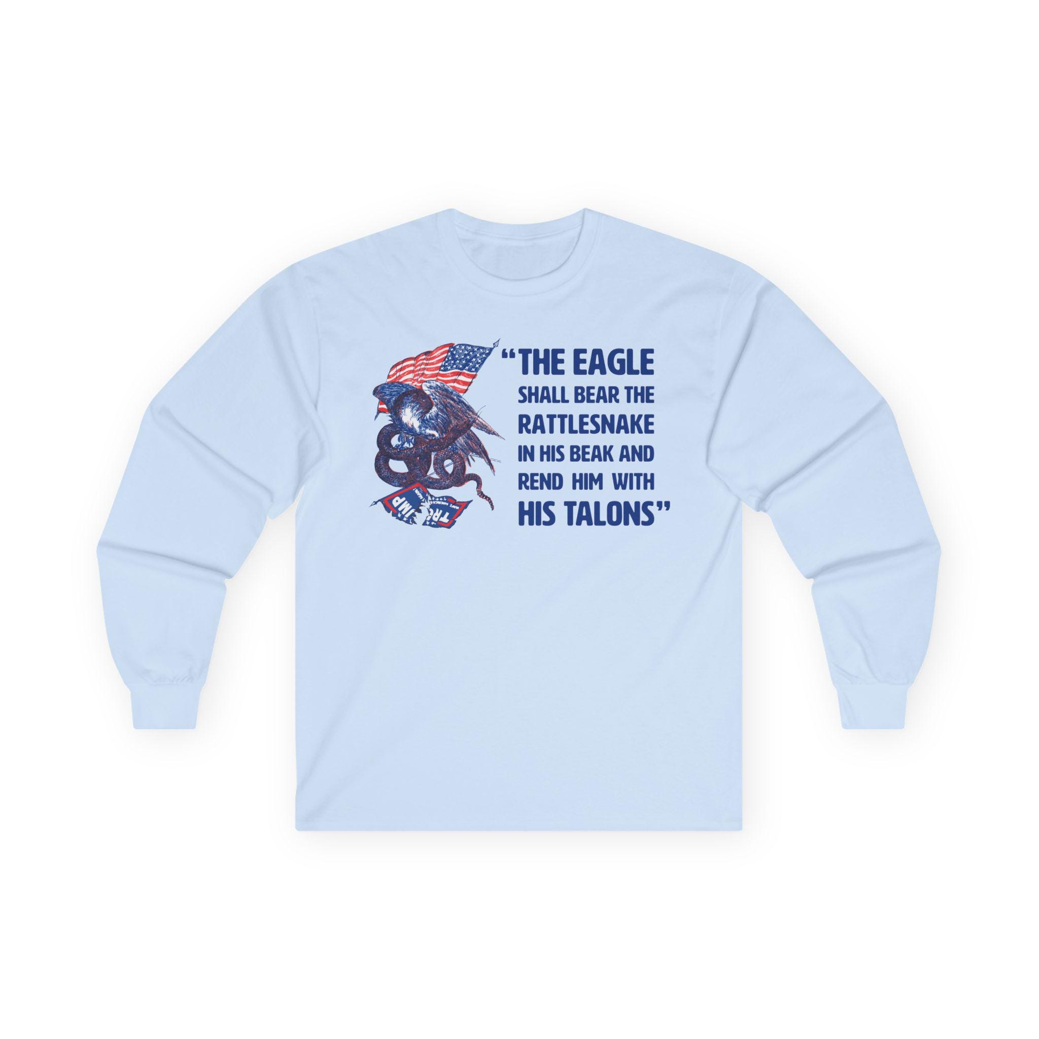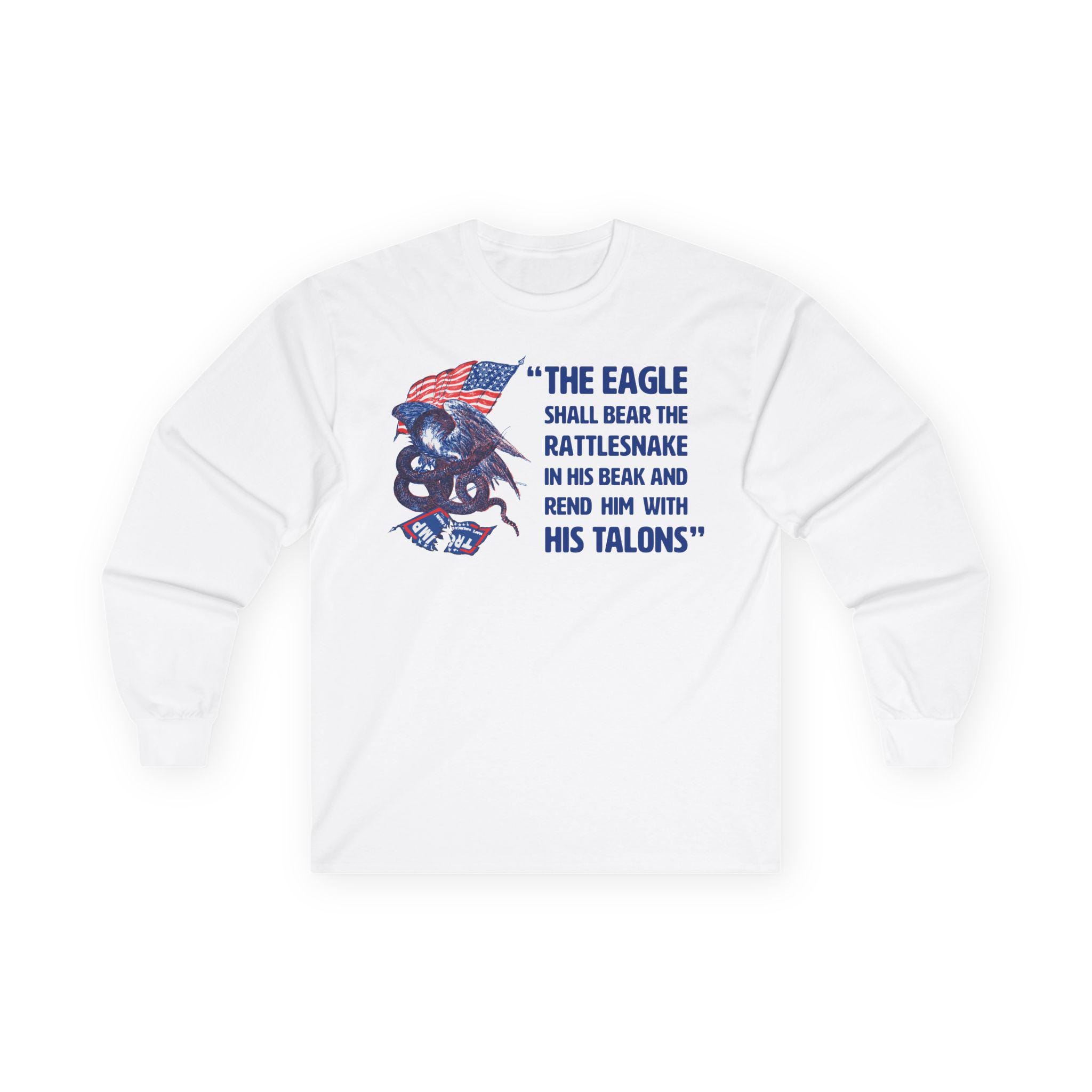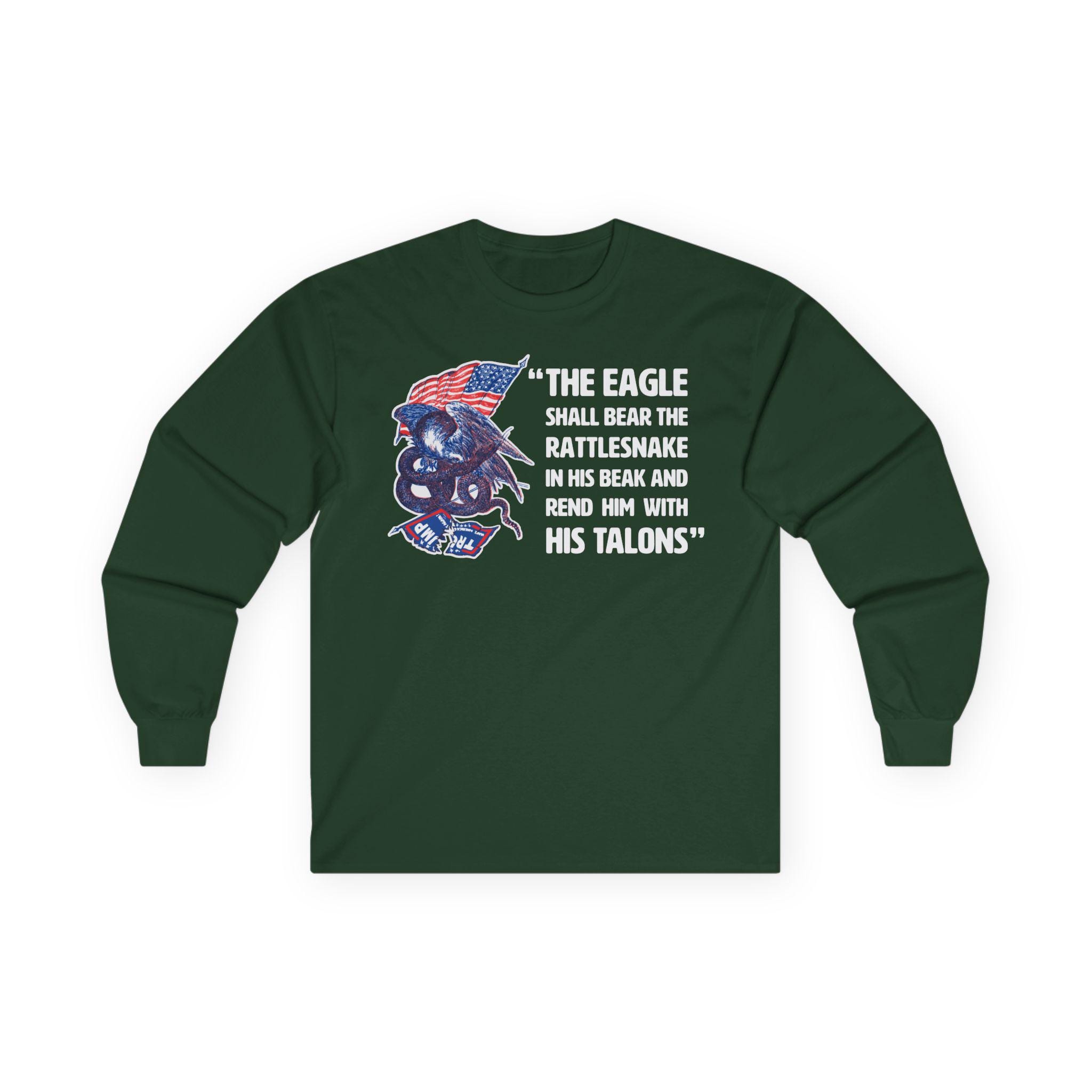 This comfortable longsleeve tee is the perfect layer for fall and a powerful piece of political art. The design is a modern take on a fiery piece of Civil War propaganda, replacing the original's Confederate "serpent" with the modern MAGA flag, flying dishonored beneath a victorious American eagle. The bold caption, "The Eagle Shall... Rend Him With His Talons," leaves no doubt about the message. It's a bold, historically-grounded statement for any proud patriot.