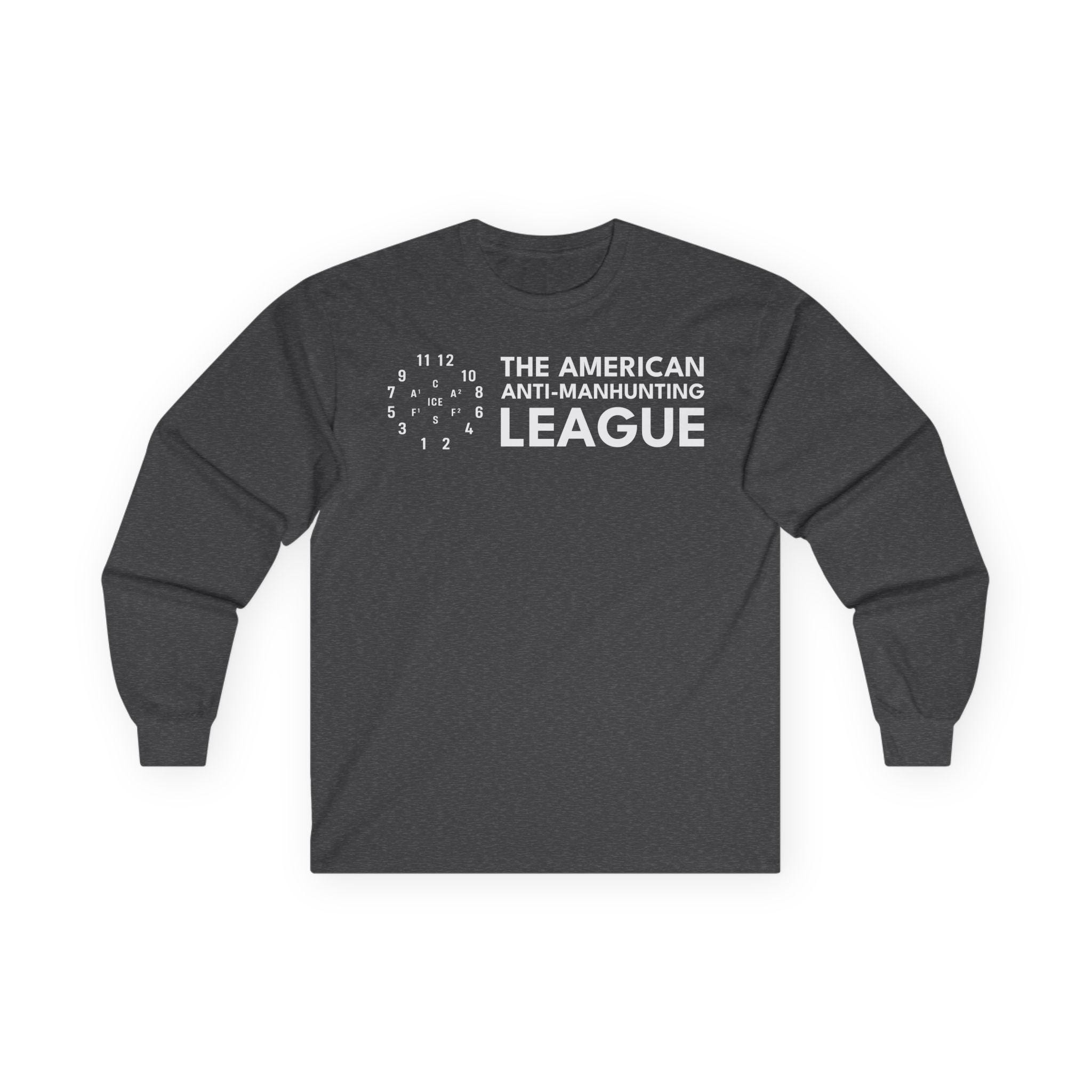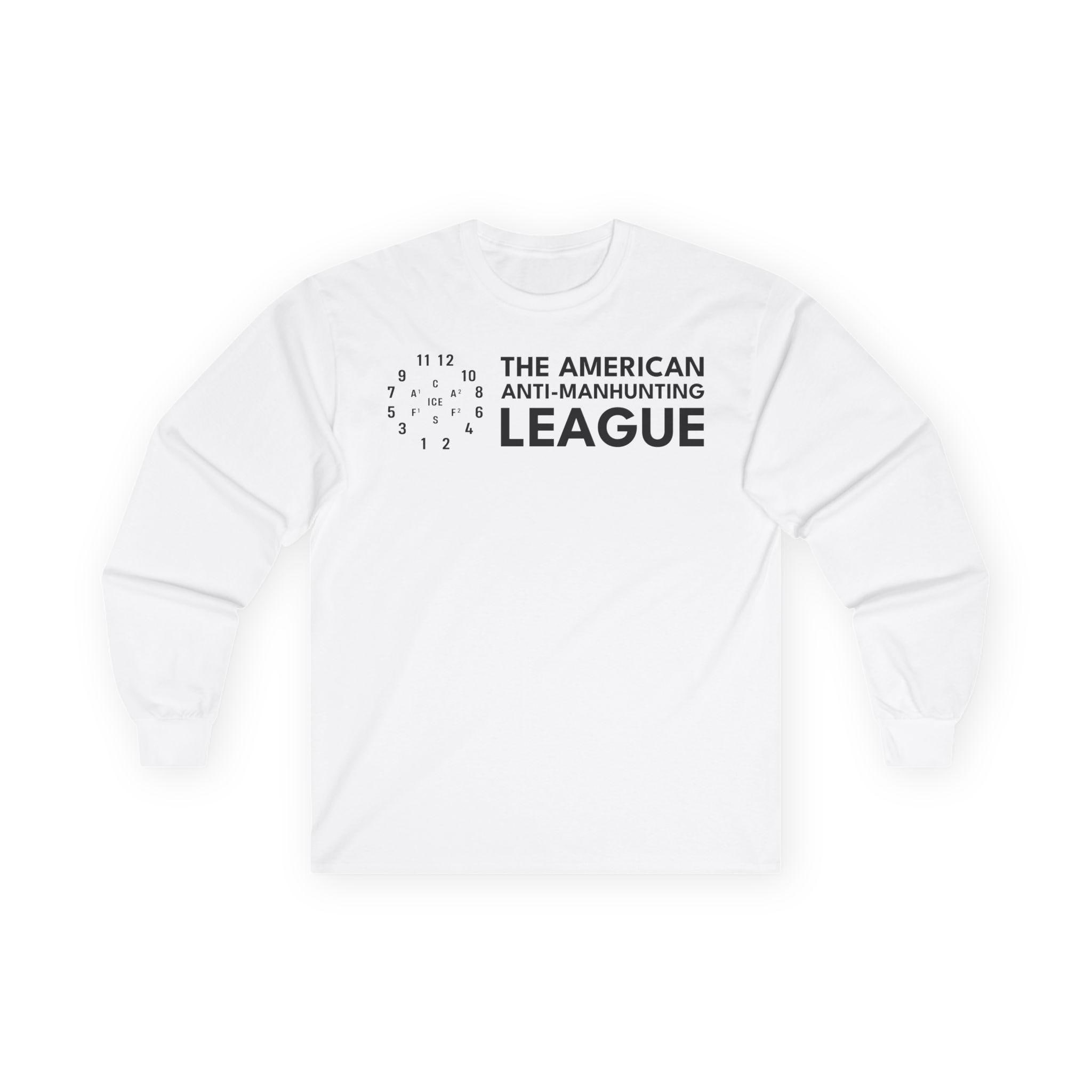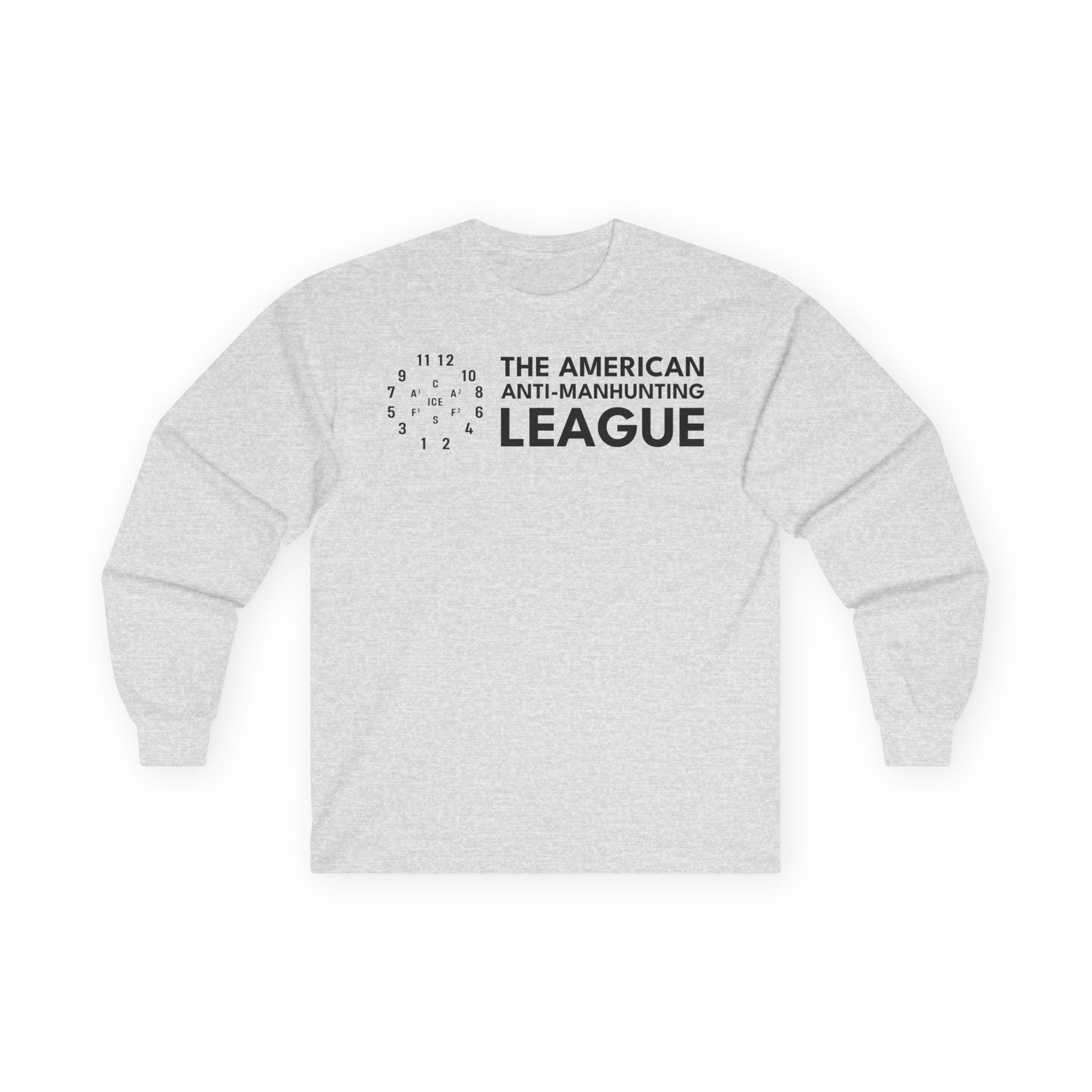 This comfortable longsleeve tee is the perfect layer for fall and a fantastic conversation starter. The design is the logo for The American Anti-Man-Hunting League, a revival of a real 19th-century abolitionist group. The emblem is a modernized version of the drill diagram the Boston league used to practice resisting federal slave catchers. In this version, the central target is updated to "ICE," making a powerful statement about today's fight for human rights. It's a stark, minimalist, and powerful piece of activist history.