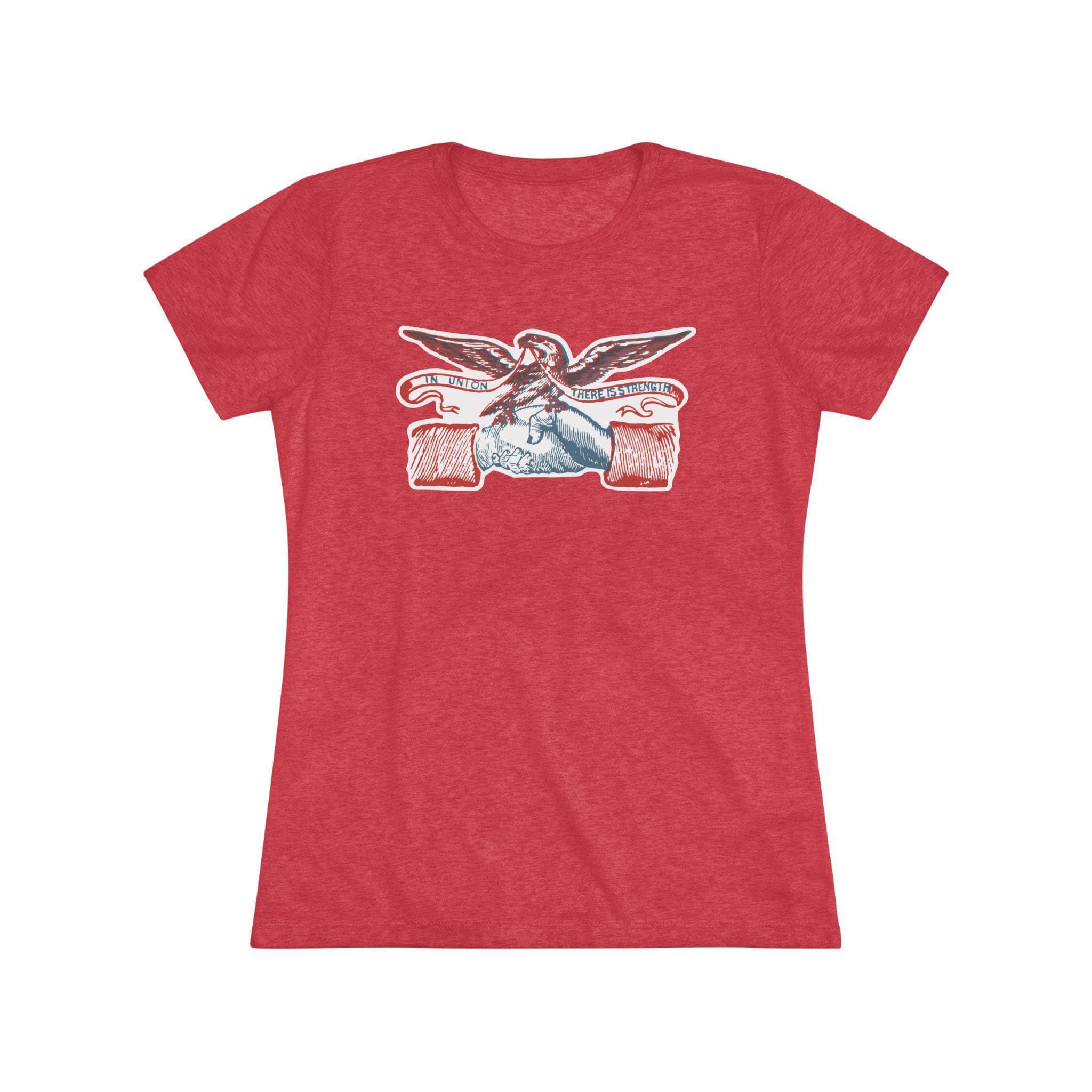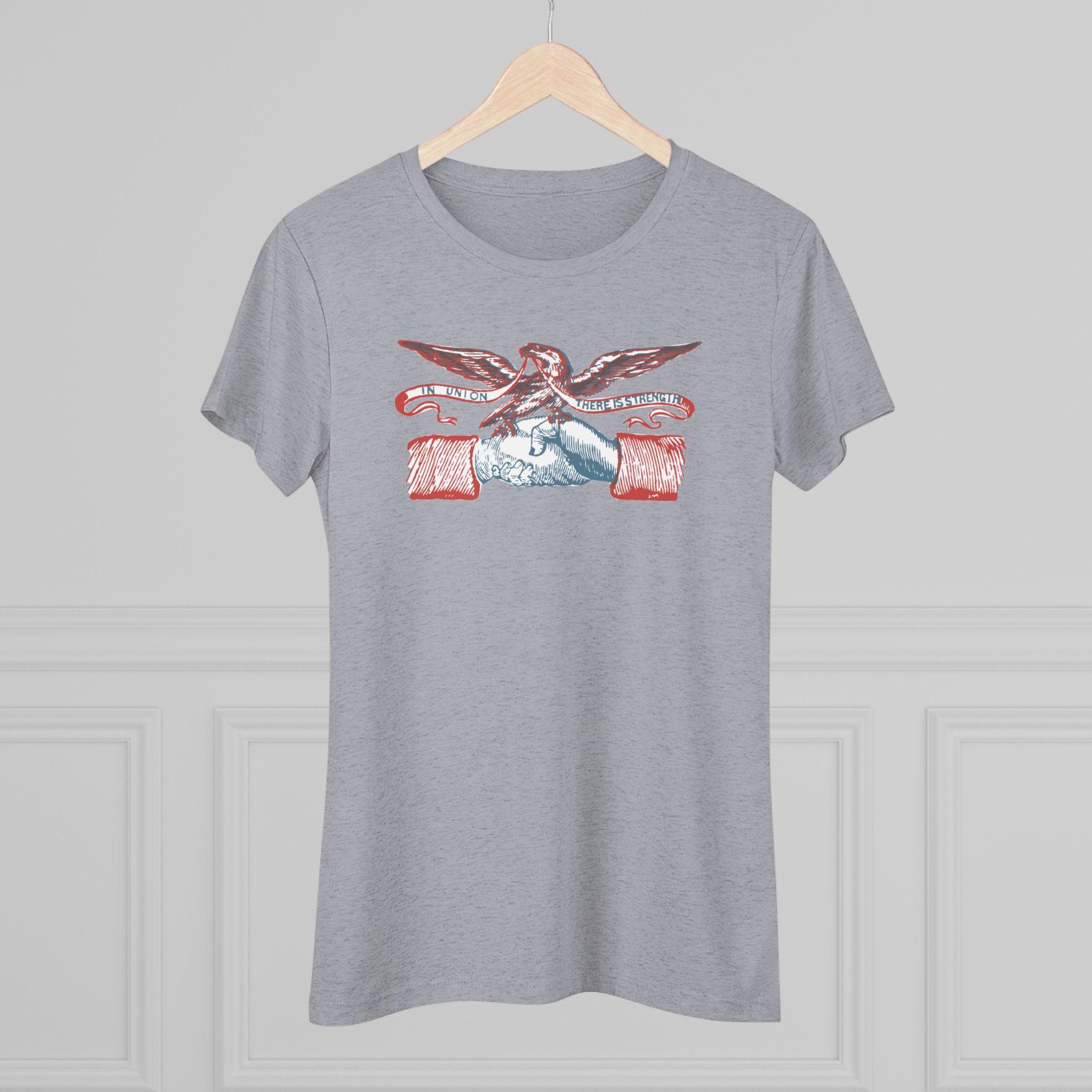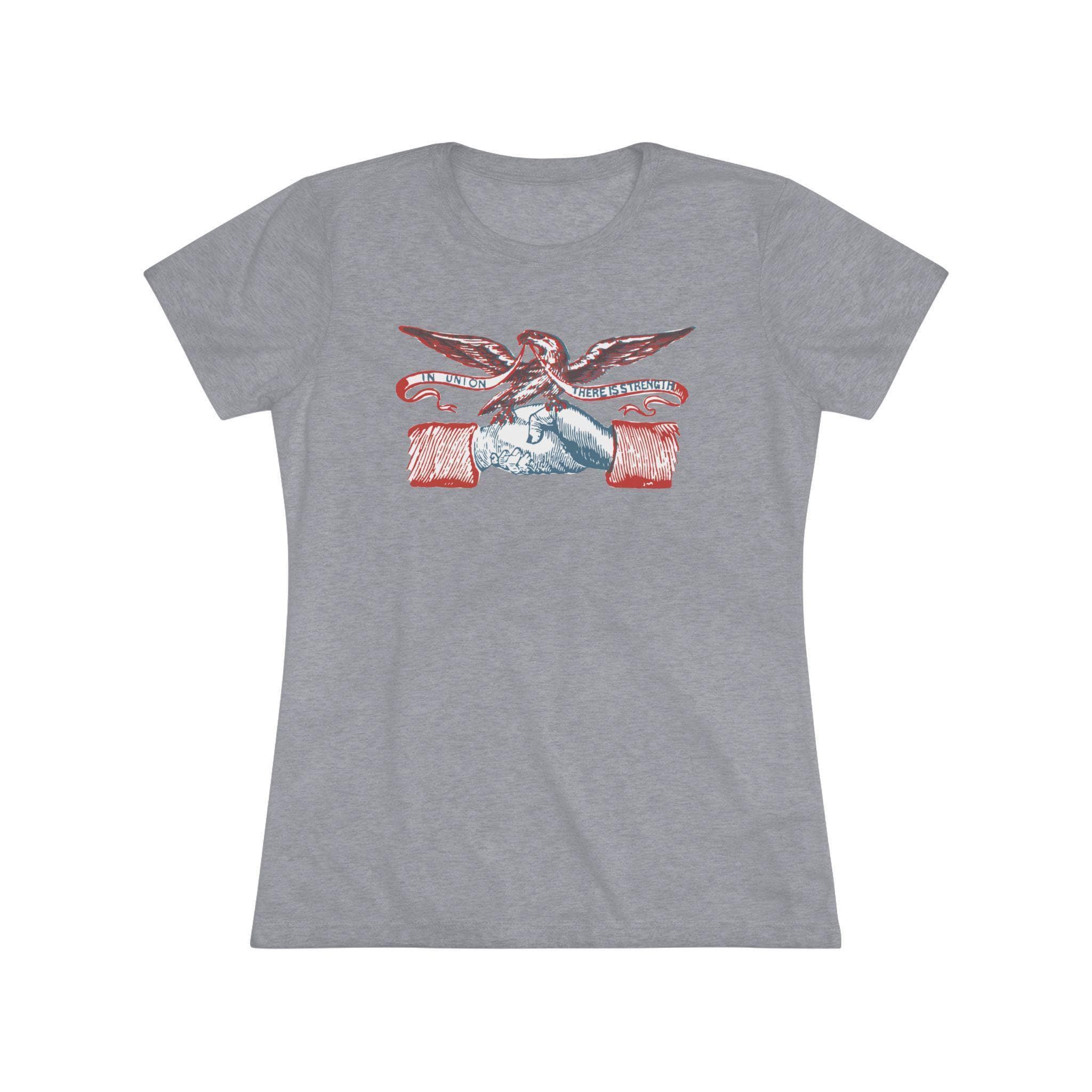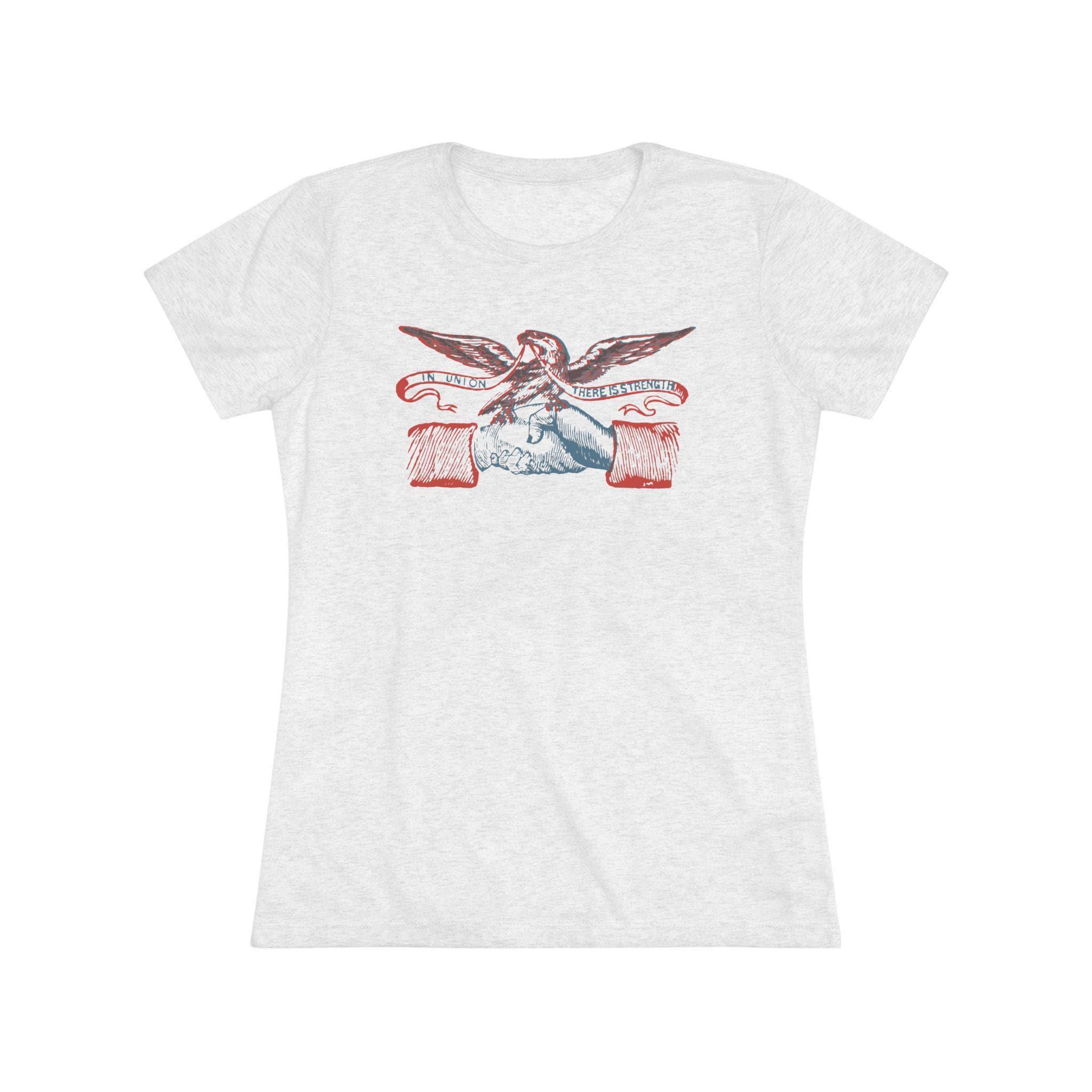 This women's t-shirt combines a powerful, positive message from American history with a comfortable and stylish fit. The design is restored from a pro-Union envelope stamp from the Civil War era, featuring two hands clasped in fellowship under a patriotic eagle. The banner's motto, "IN UNION THERE IS STRENGTH," is a timeless statement about the power of solidarity. This soft, contoured tee is a perfect way to wear a piece of classic Americana that celebrates one of the nation's most important ideals.