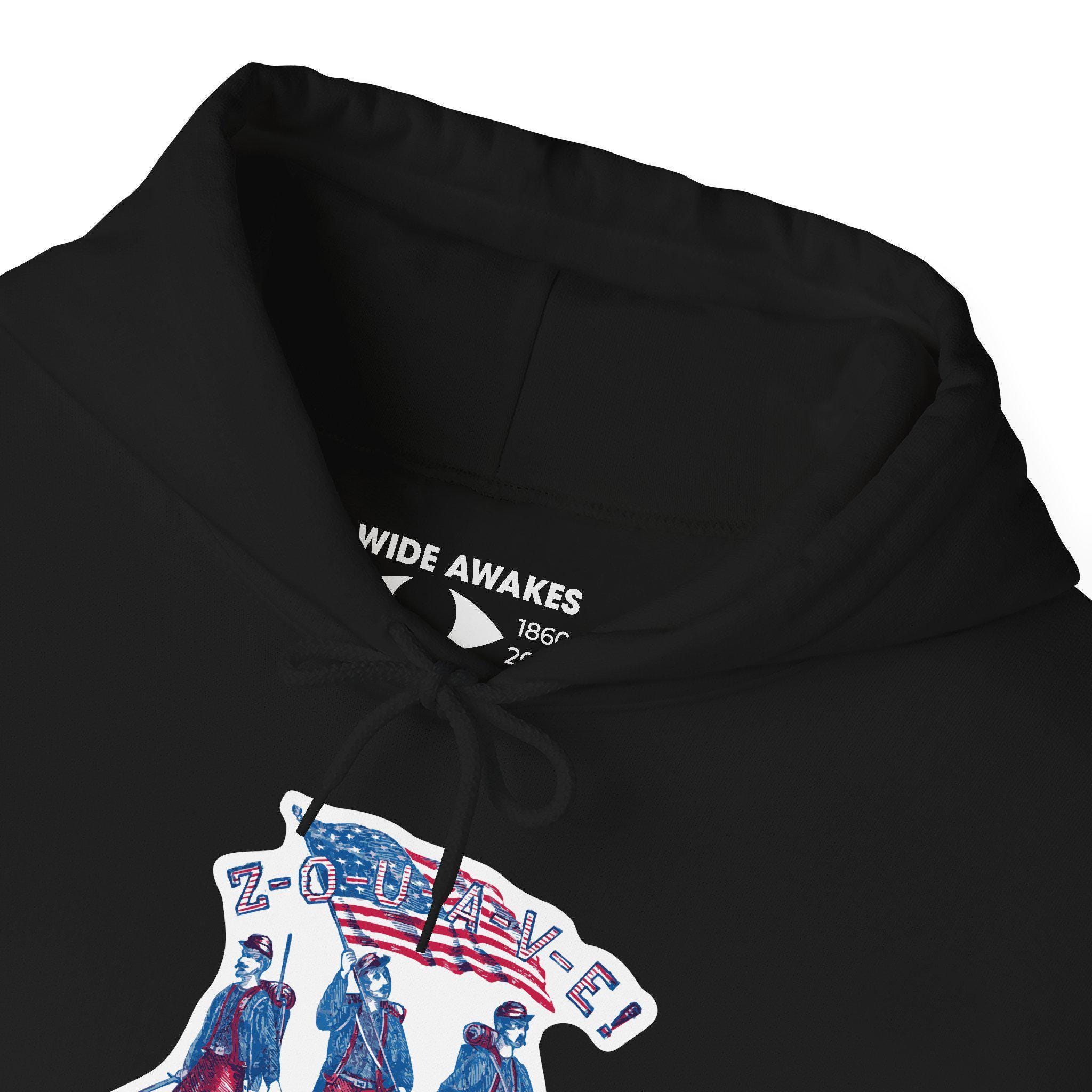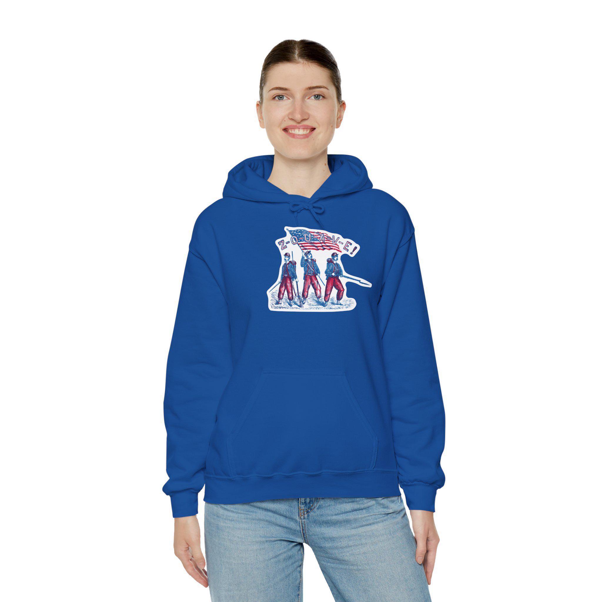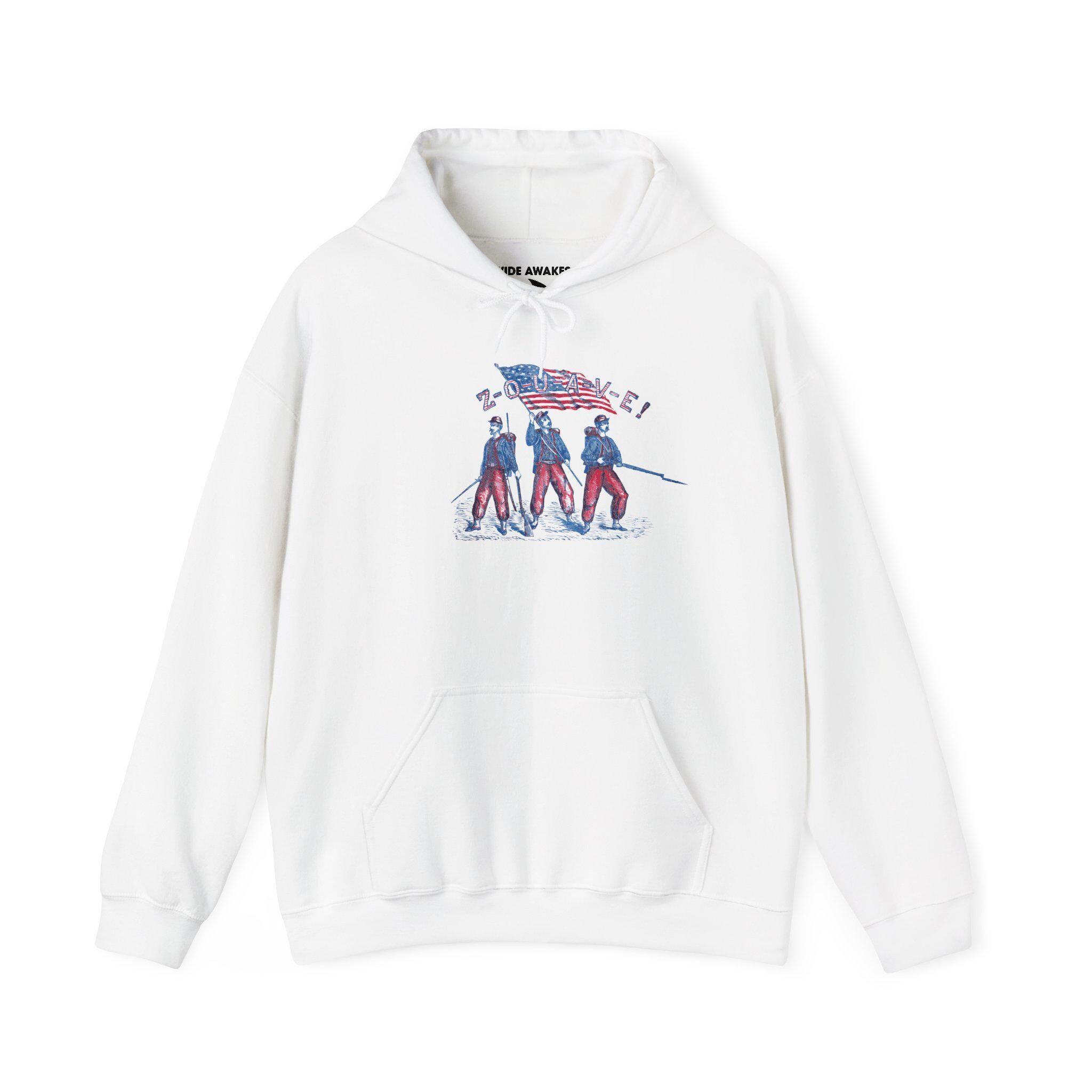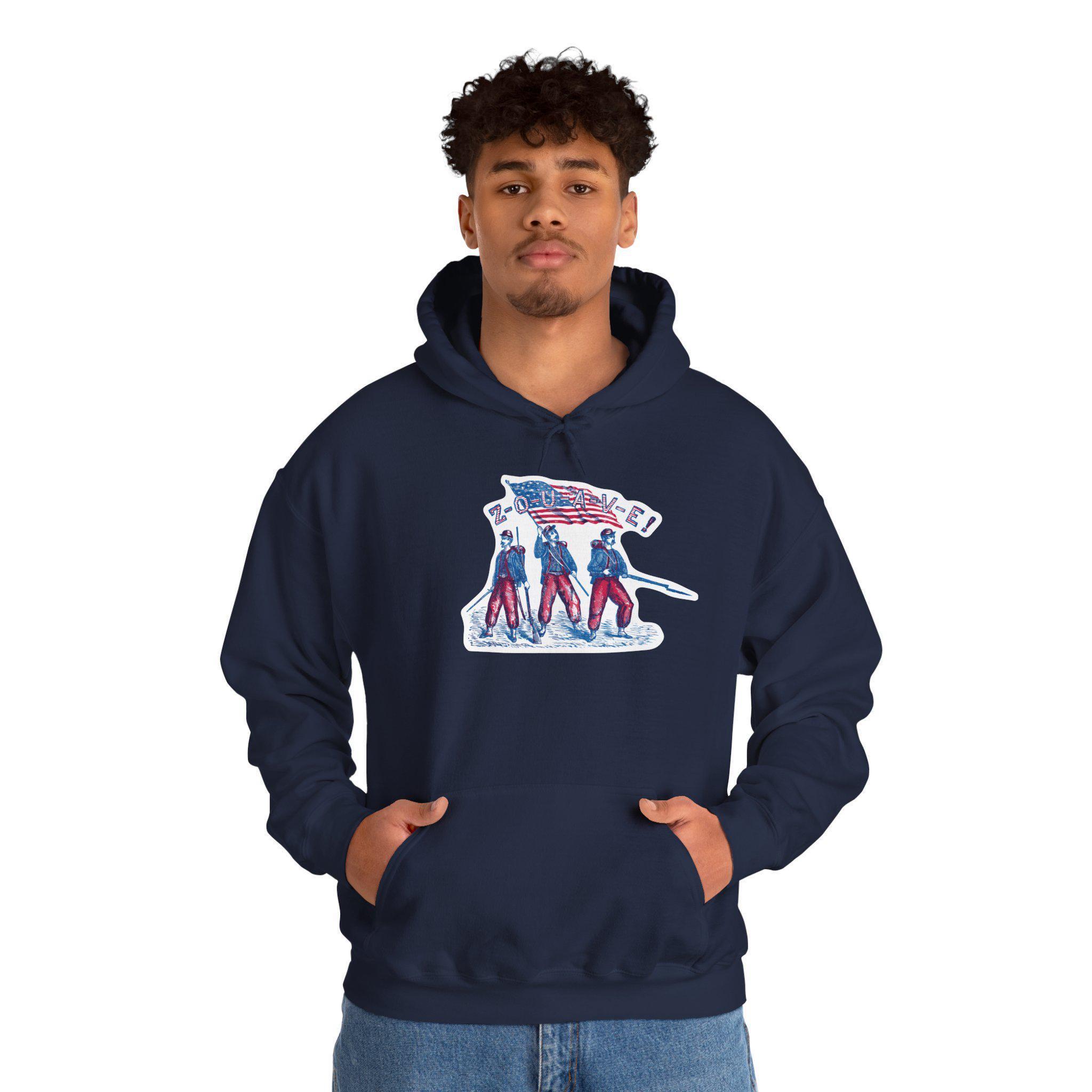This comfortable and warm hoodie features a restored design from a patriotic pro-Union stamp celebrating the Zouaves—volunteer soldiers famed for their bright uniforms and fierce fighting spirit. The artwork is packed with action, showing three soldiers ready for battle under the American flag, with their name spelled out in a bold, striped font. With a soft fleece interior and a spacious front pocket, this hoodie is a piece of wearable history that honors the Union's most colorful volunteers.