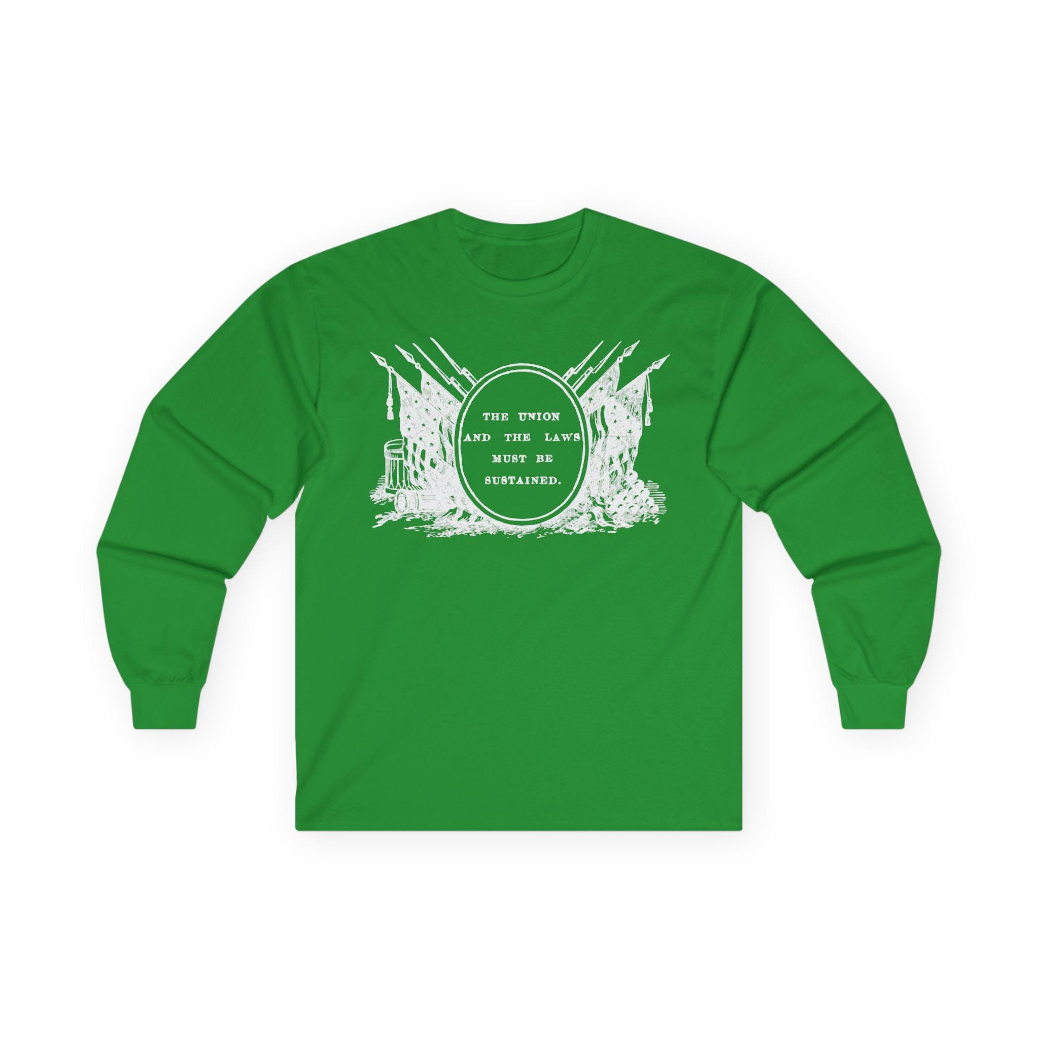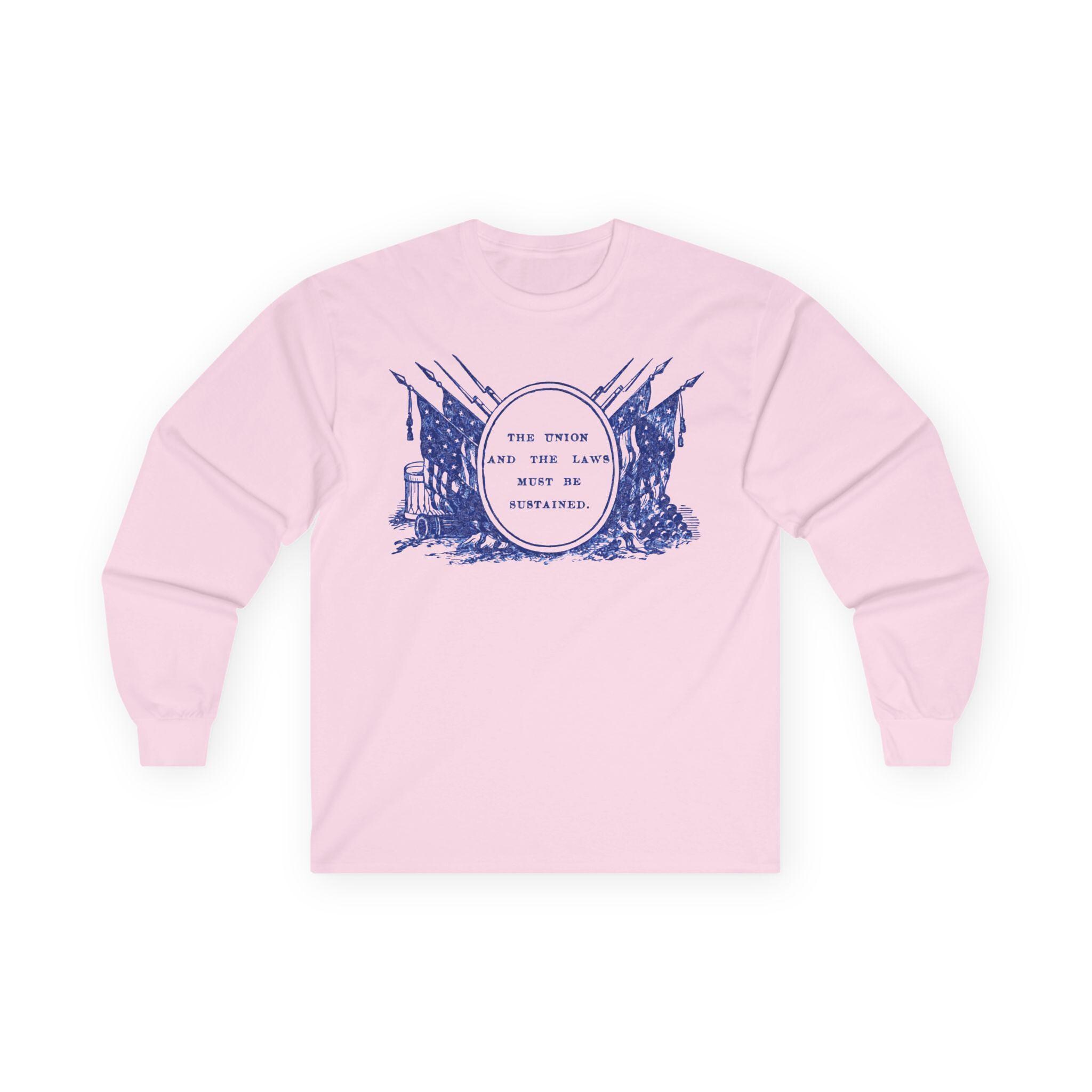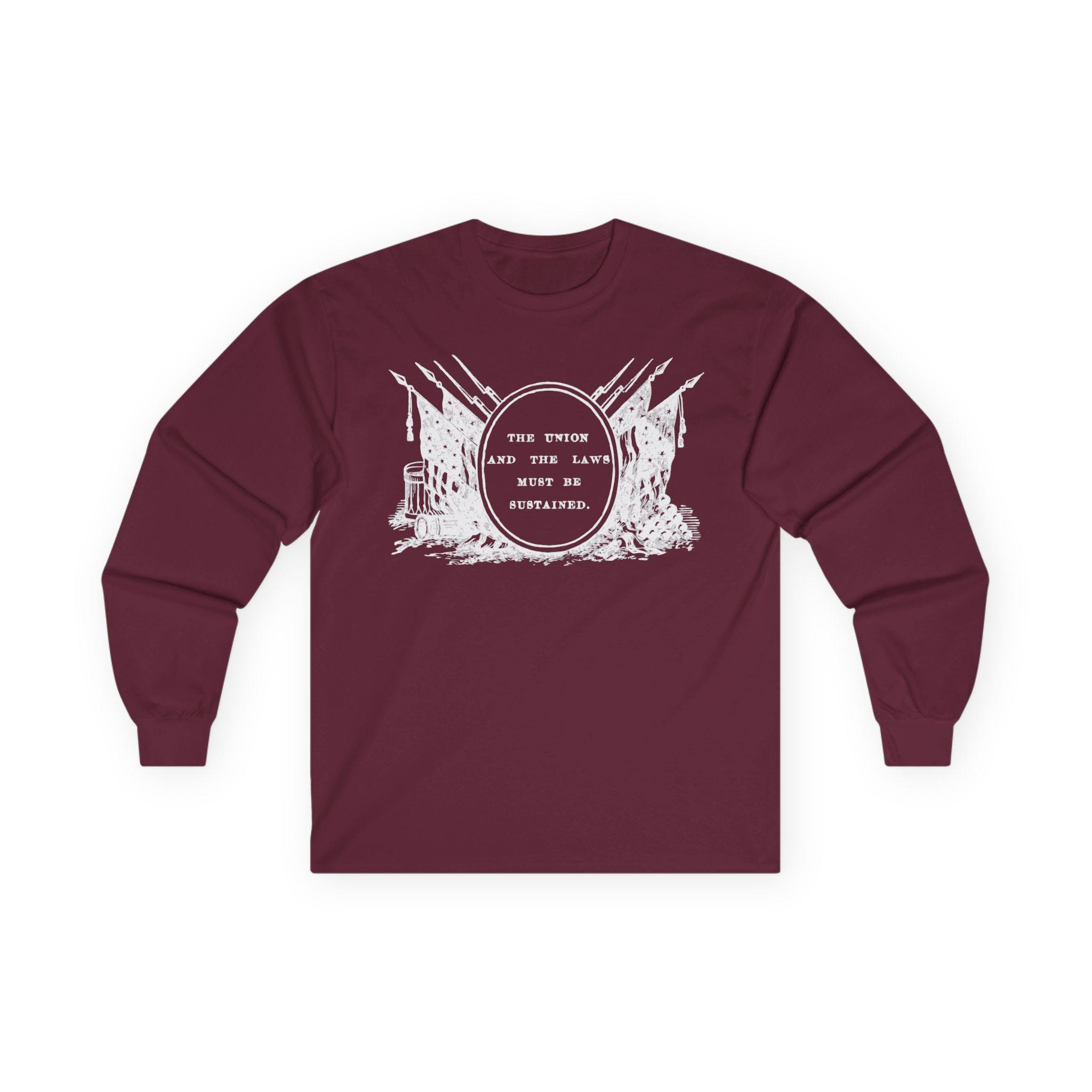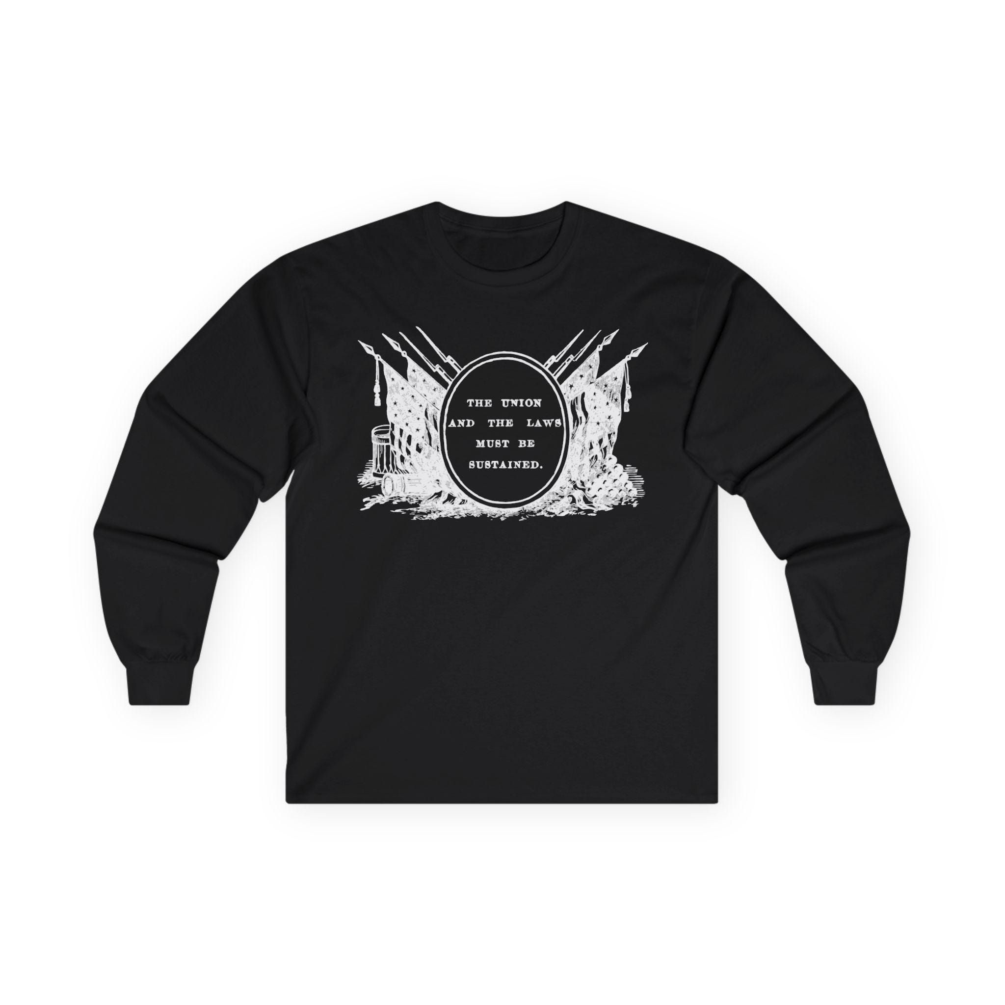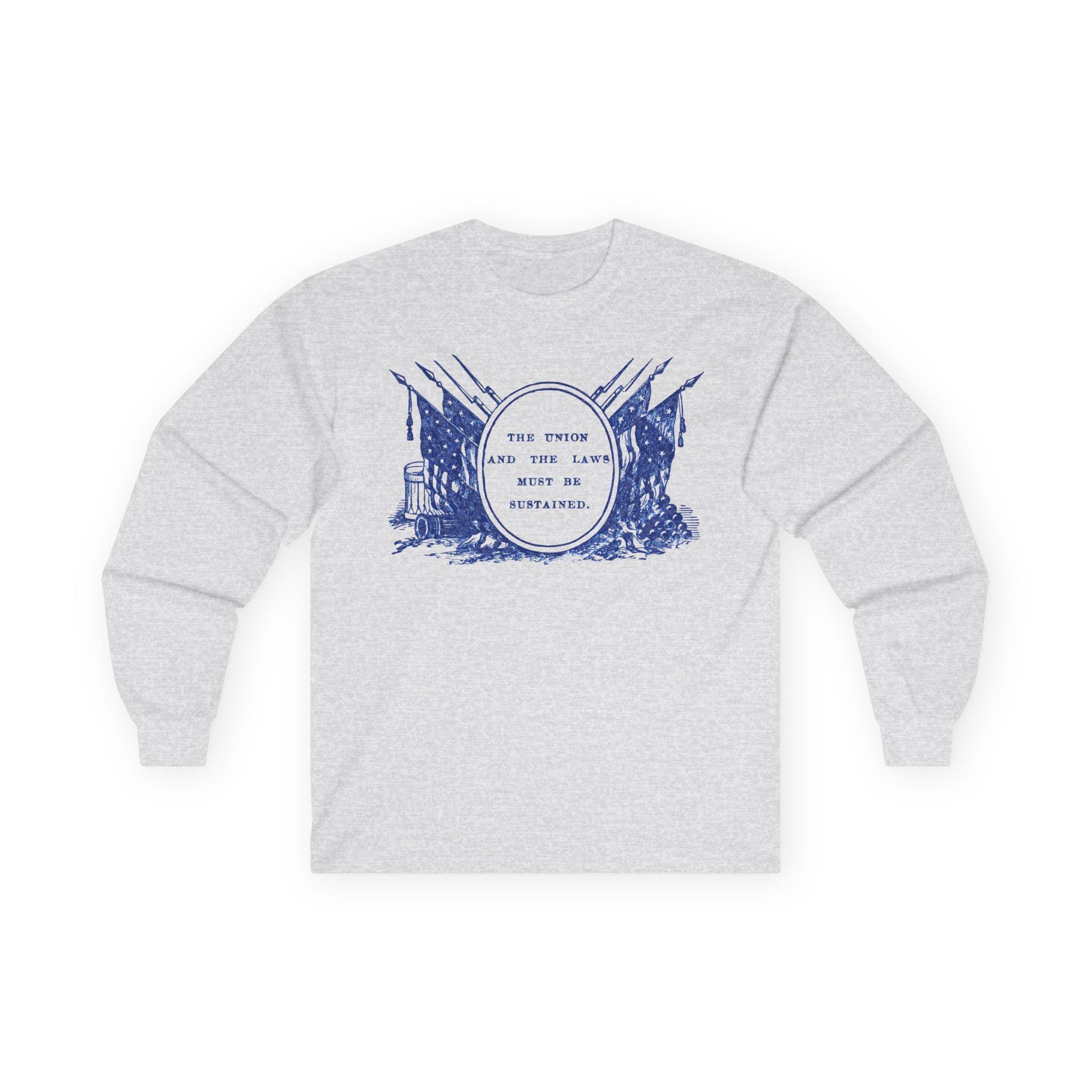 This comfortable longsleeve tee is the perfect layer for fall and a powerful piece of historical art. The design is a restored Civil War-era stamp featuring the resolute motto "THE UNION AND THE LAWS MUST BE SUSTAINED," surrounded by a tableau of flags, bayoneted rifles, and cannons. It’s a historically authentic statement about a nation's commitment to its founding principles, as relevant today as it was in the 1860s.