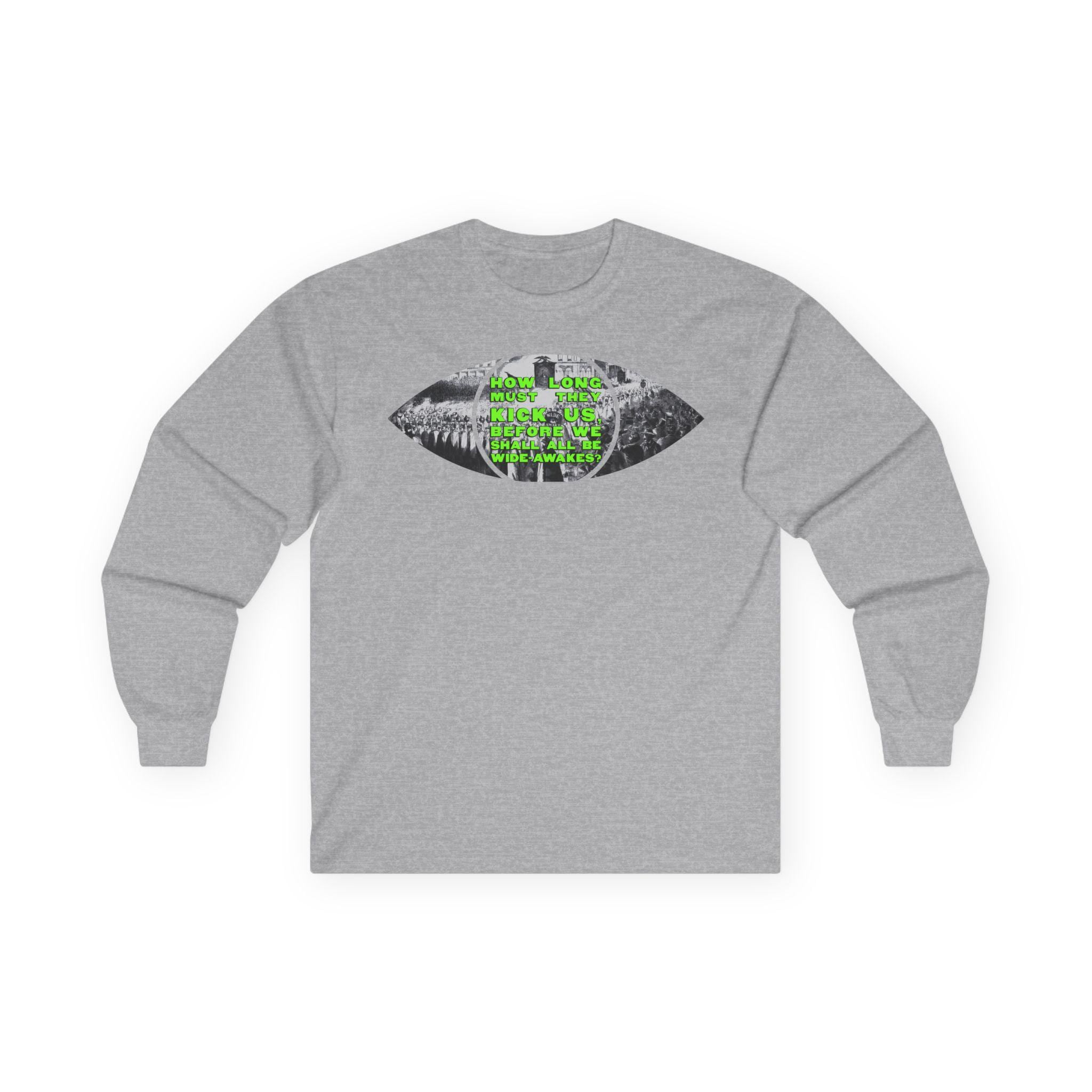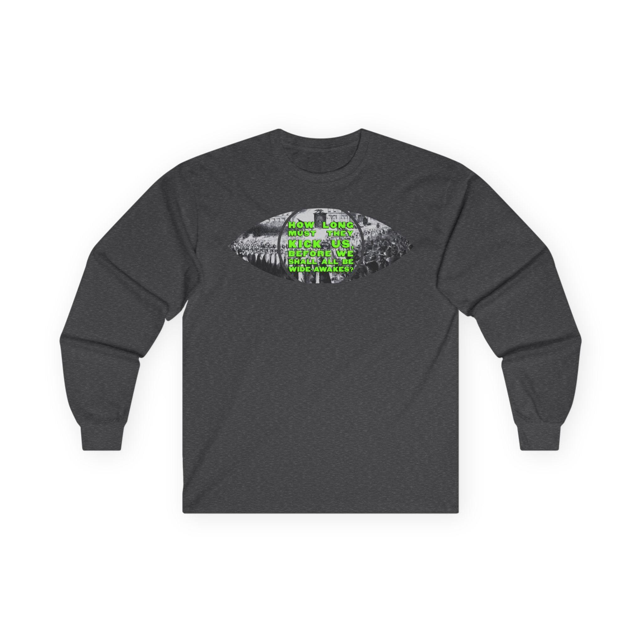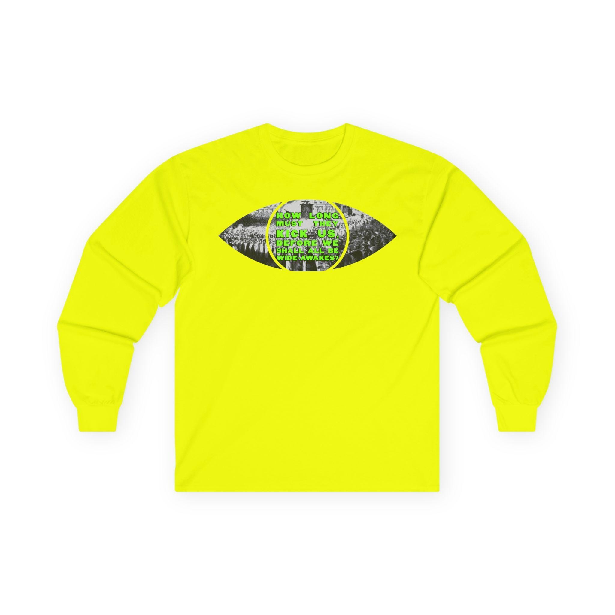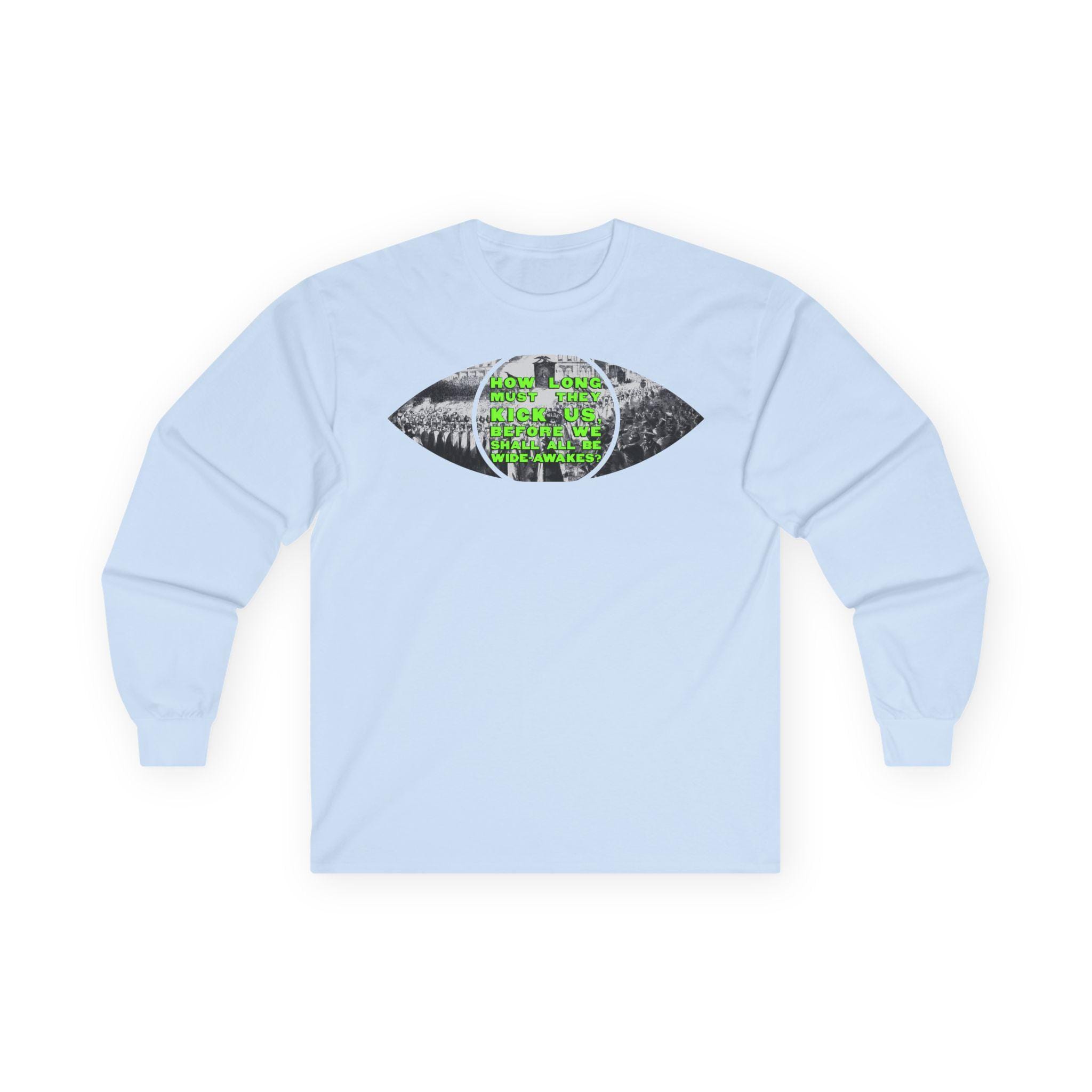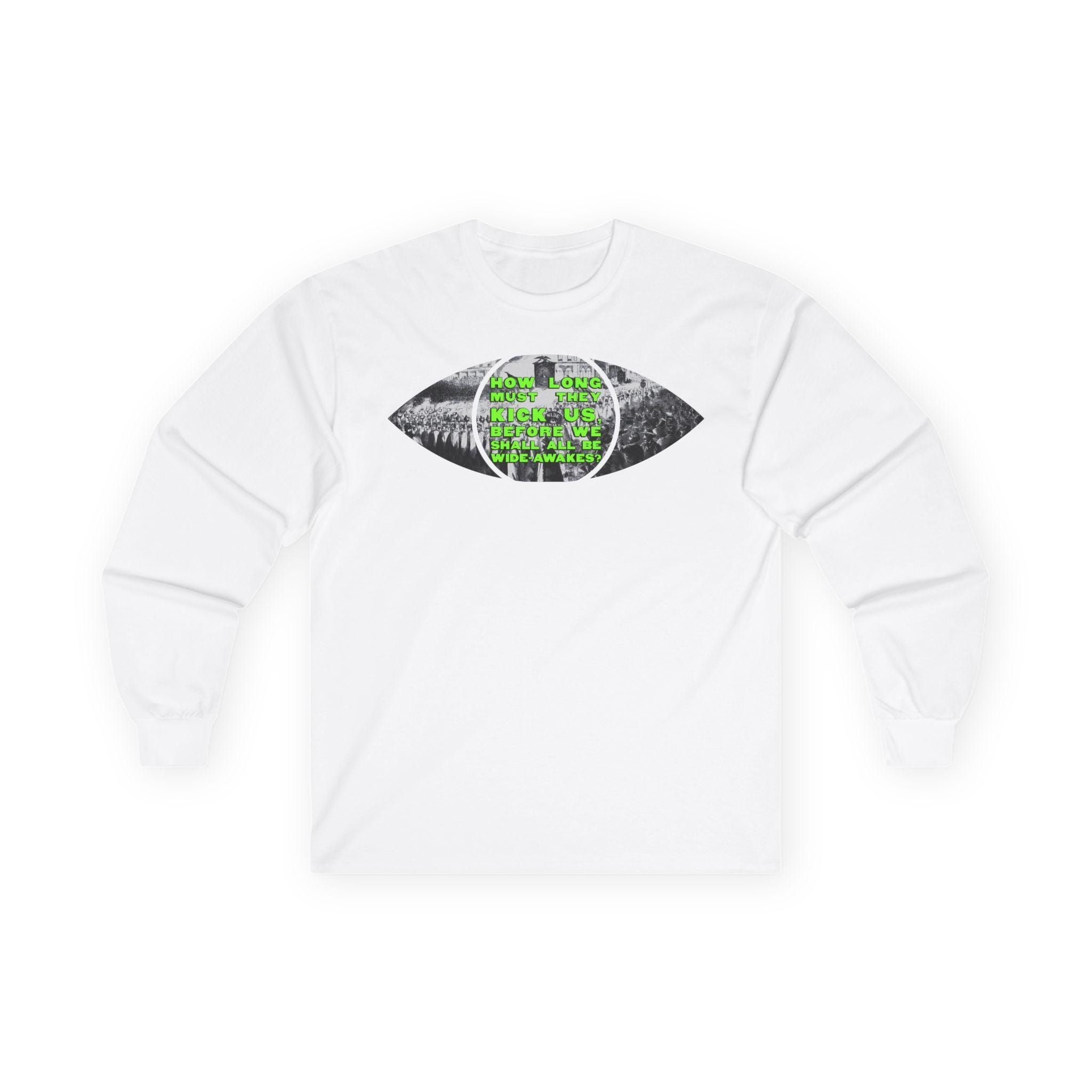 This comfortable longsleeve tee is the perfect layer for fall and a fantastic piece of wearable art. The design is a brilliant visual pun: a real 1860 etching of a Wide Awakes parade is cut into the shape of an eye, literally allowing you to see through a piece of history. In a striking pop art twist, the pupil is filled with a bold, solid chartreuse, creating a vibrant contrast against the black-and-white illustration. It’s a stylish and intelligent design that bridges centuries.
