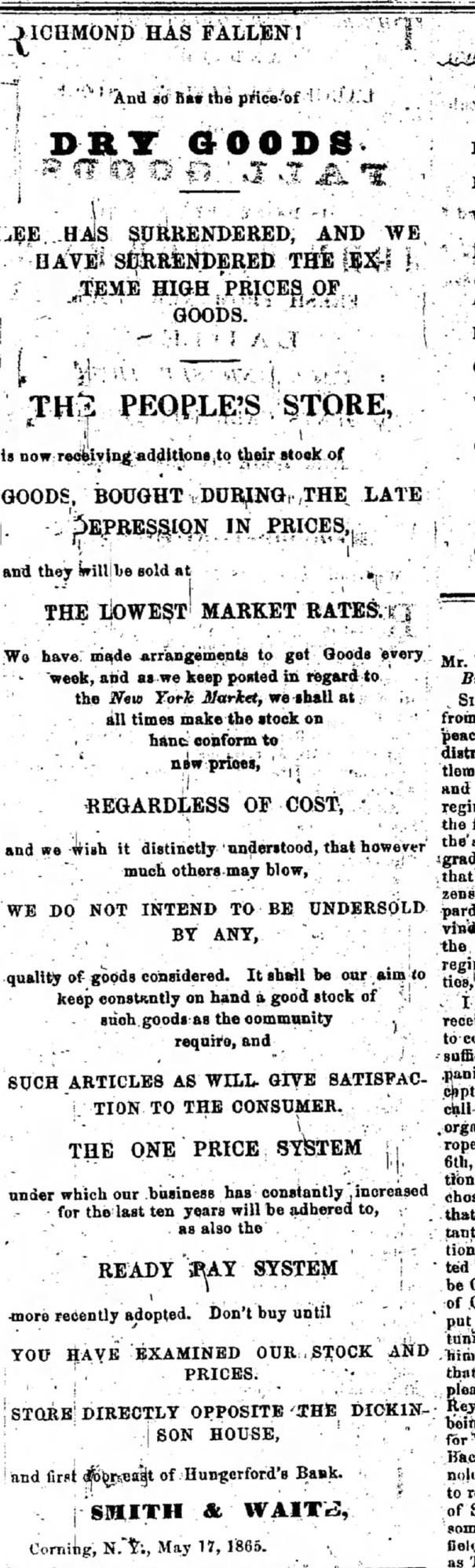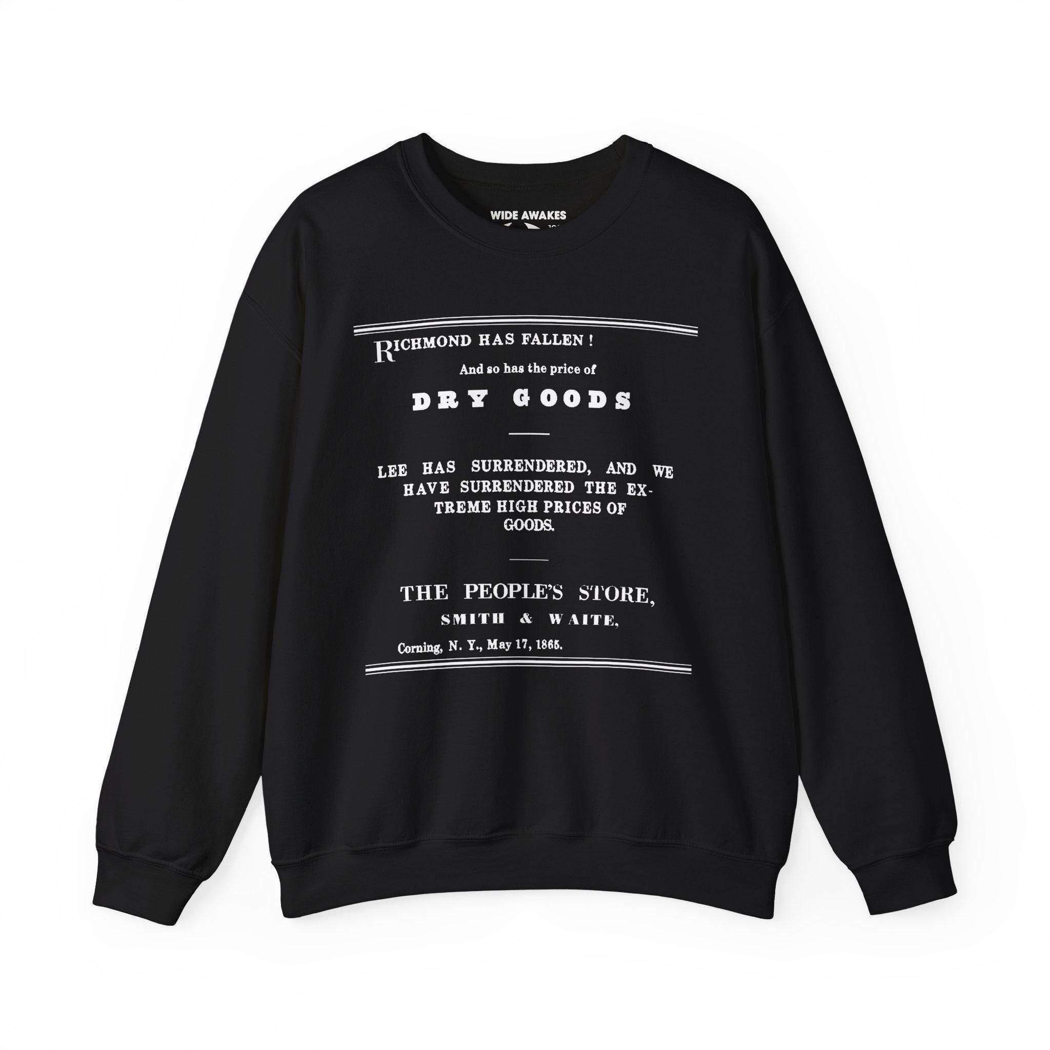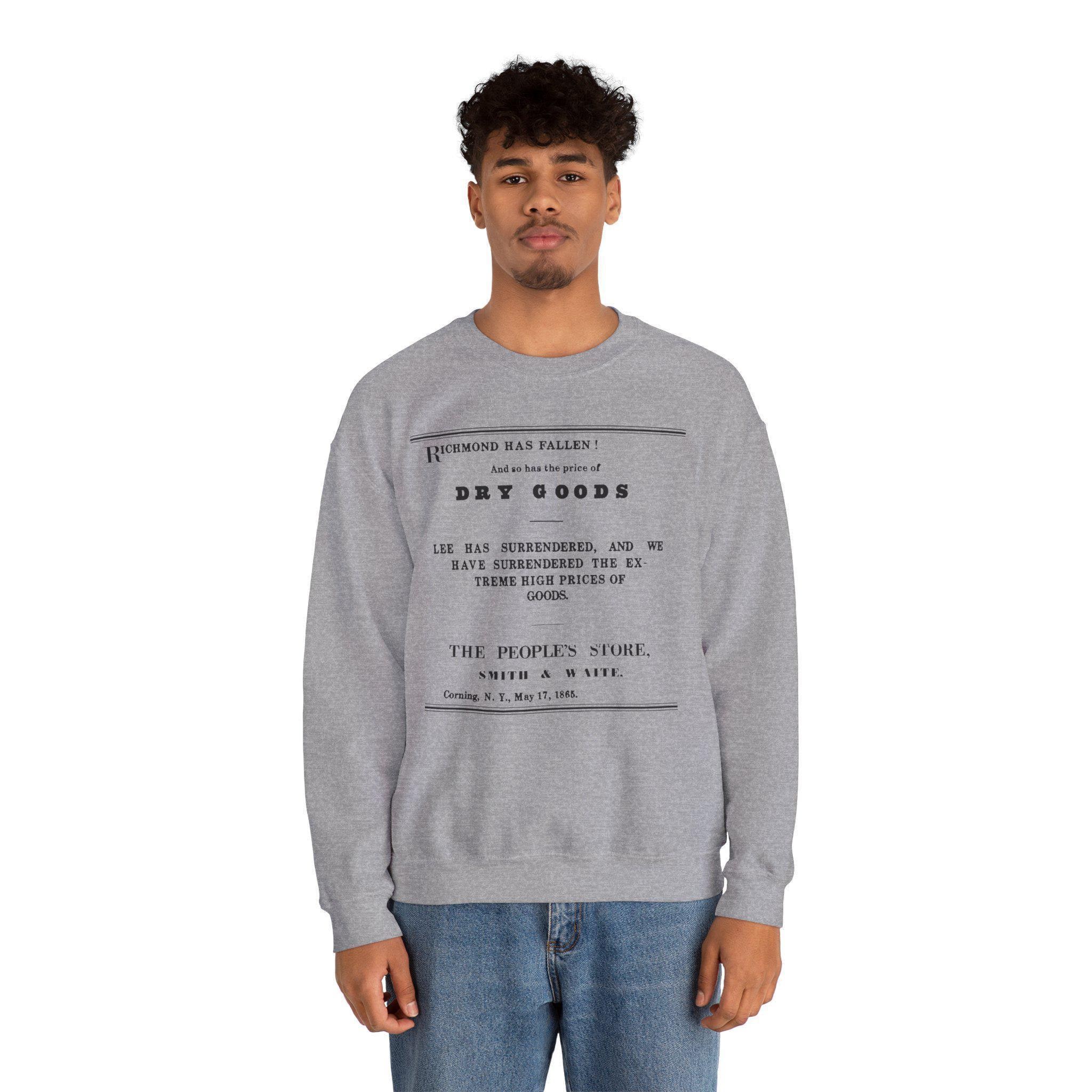 Stay cozy this fall with a crewneck sweatshirt that features one of the most charming examples of 19th-century advertising. The design is a restored ad from a Corning, NY store that used the news of Lee's surrender to announce that their high prices had surrendered, too. It's a brilliant and funny piece of history from a time of national celebration and commercial optimism. This comfortable sweatshirt, featuring all the original text from Smith & Waite's ad, is a perfect, witty piece for any history enthusiast.